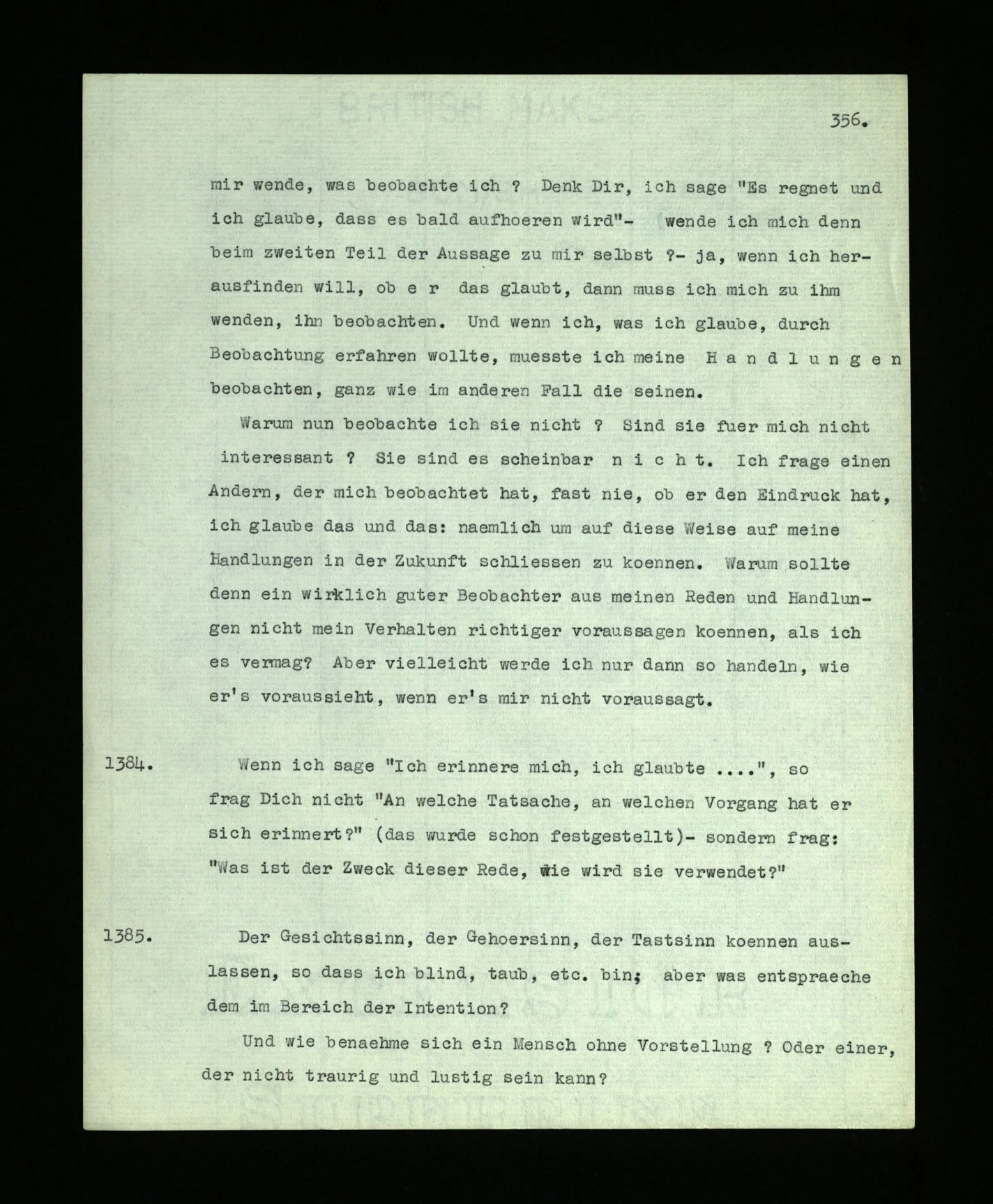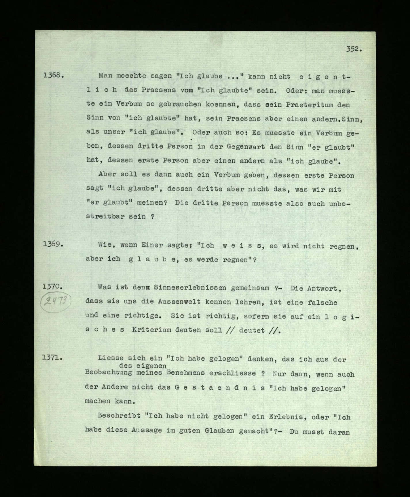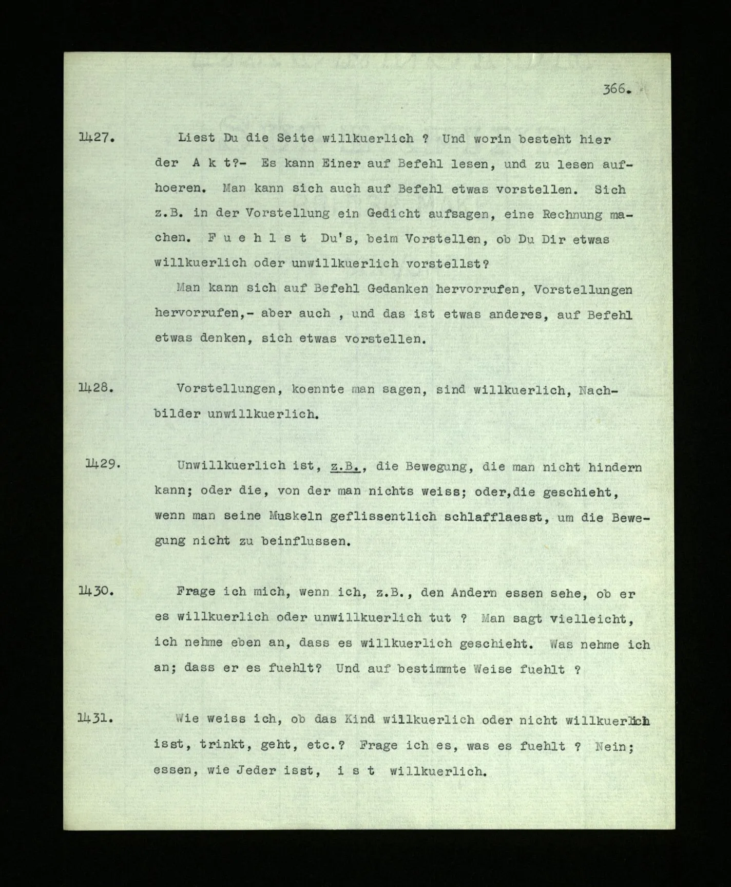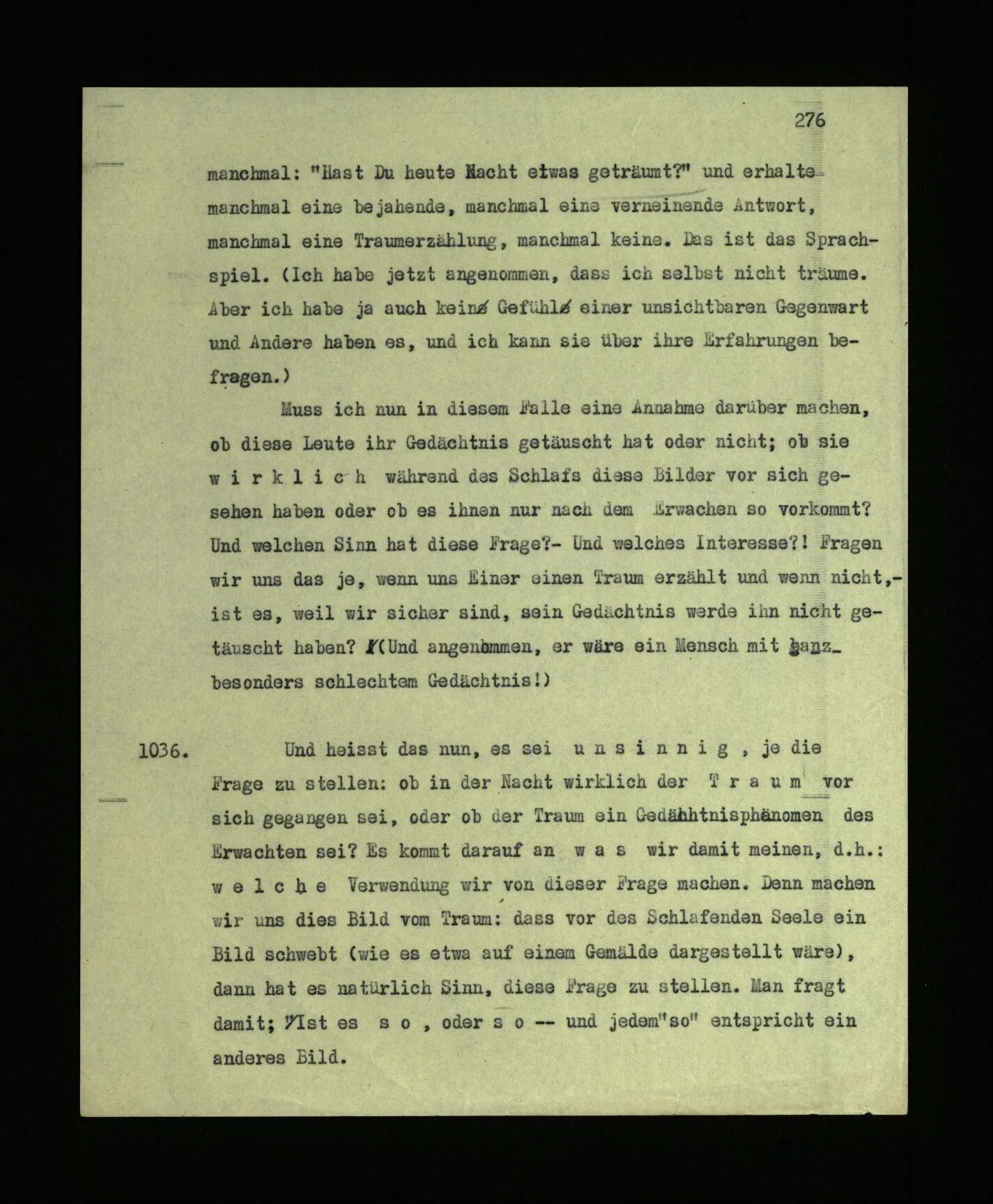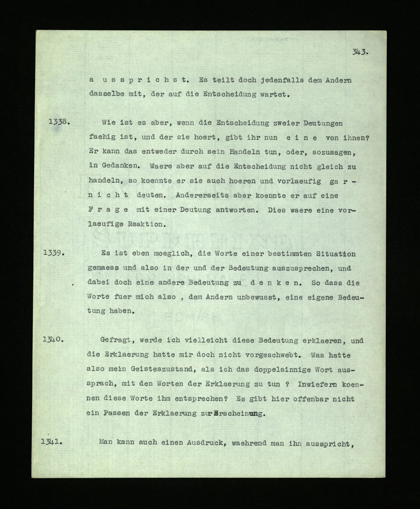 1801. Er fragt “Was hast Du mit dem Wort gemeint?” – Ich beantworte die Frage und setze hinzu: “Hättest Du mich früher gefragt, so hätte ich das gleiche geantwortet; meine Antwort war nicht eine Deutung, die mir jetzt eingefallen ist.” So war sie mir schon früher eingefallen? Nein. – Und wie konnte ich dann sagen: “Hättest Du mich früher gefragt, so hätte ich ‥‥ ”? Woraus schloß ich das? Aus garnichts. Was teile ich ihm mit, wenn ich diesen Konditional ausspreche? Etwas, was manchmal von Wichtigkeit sein kann.