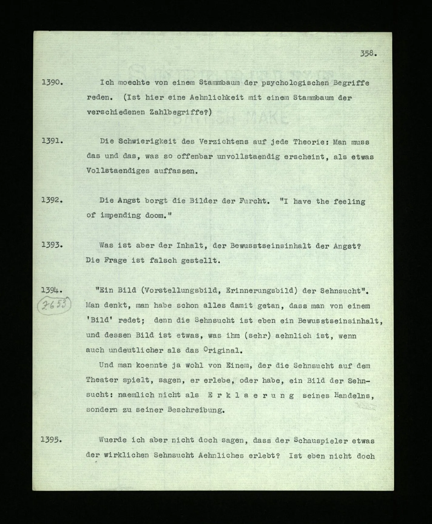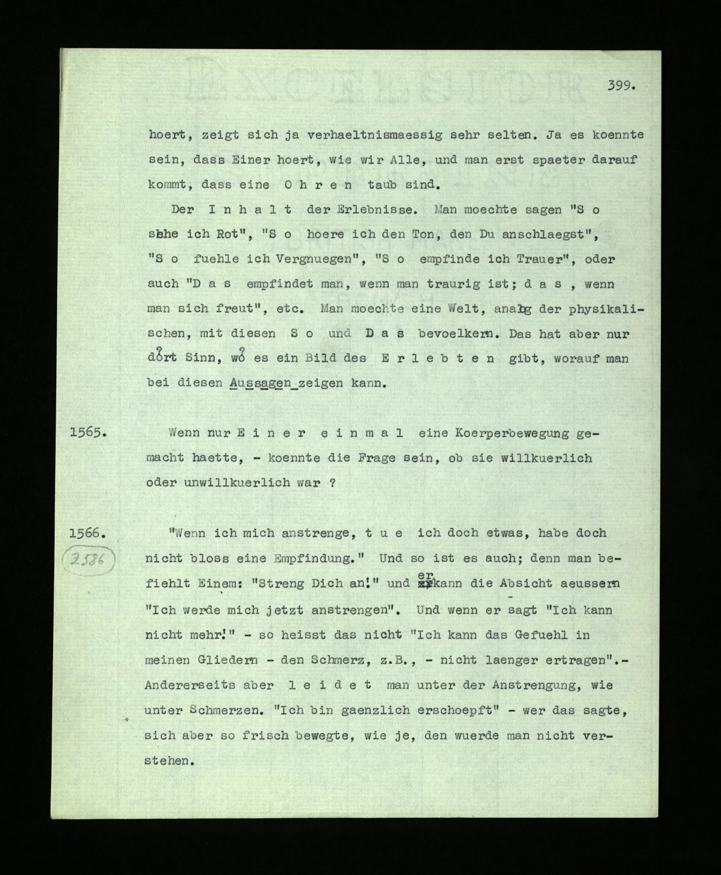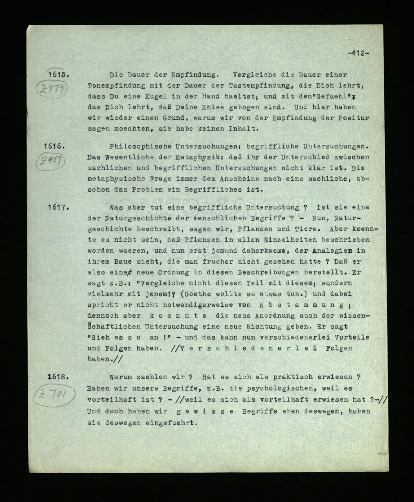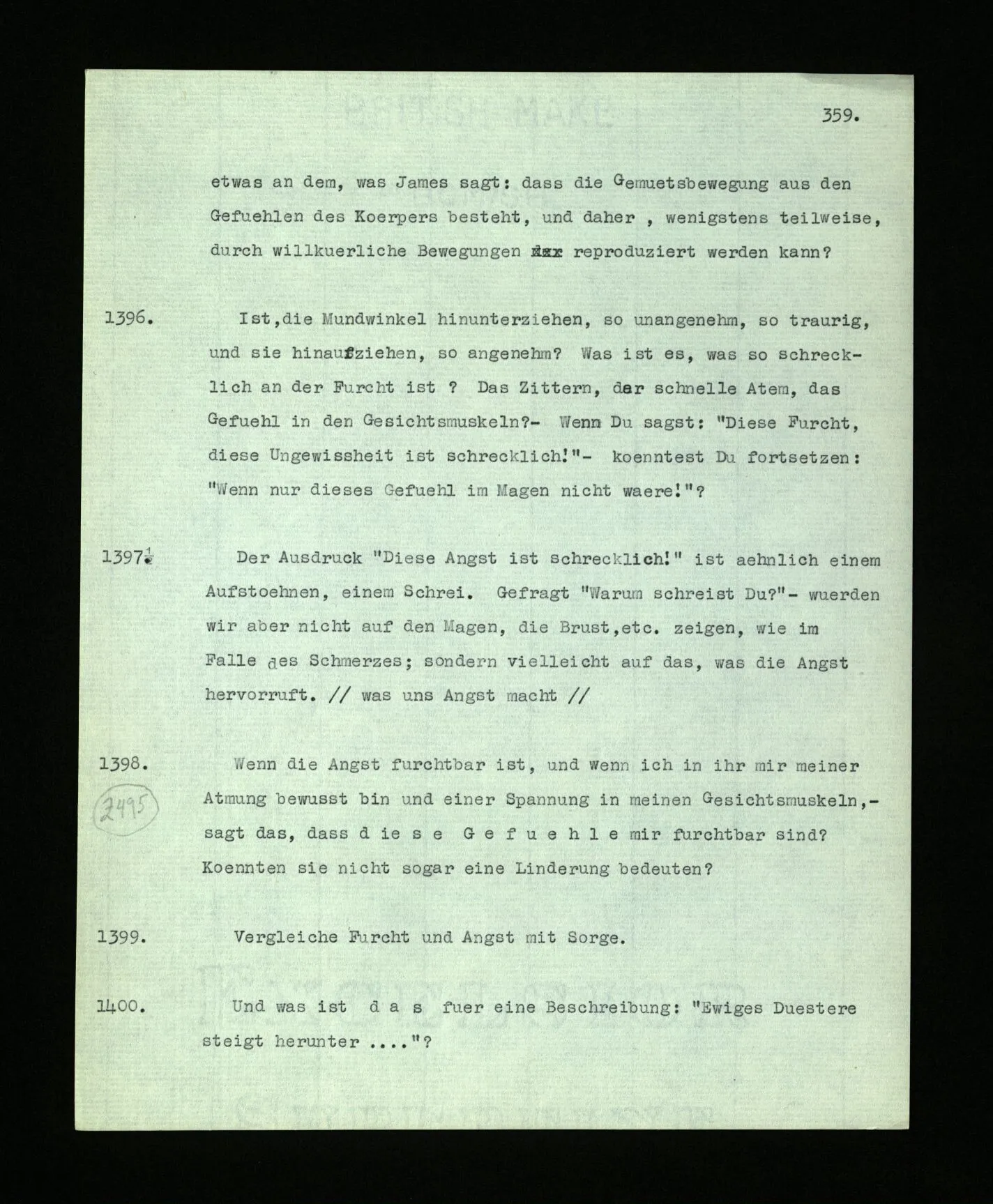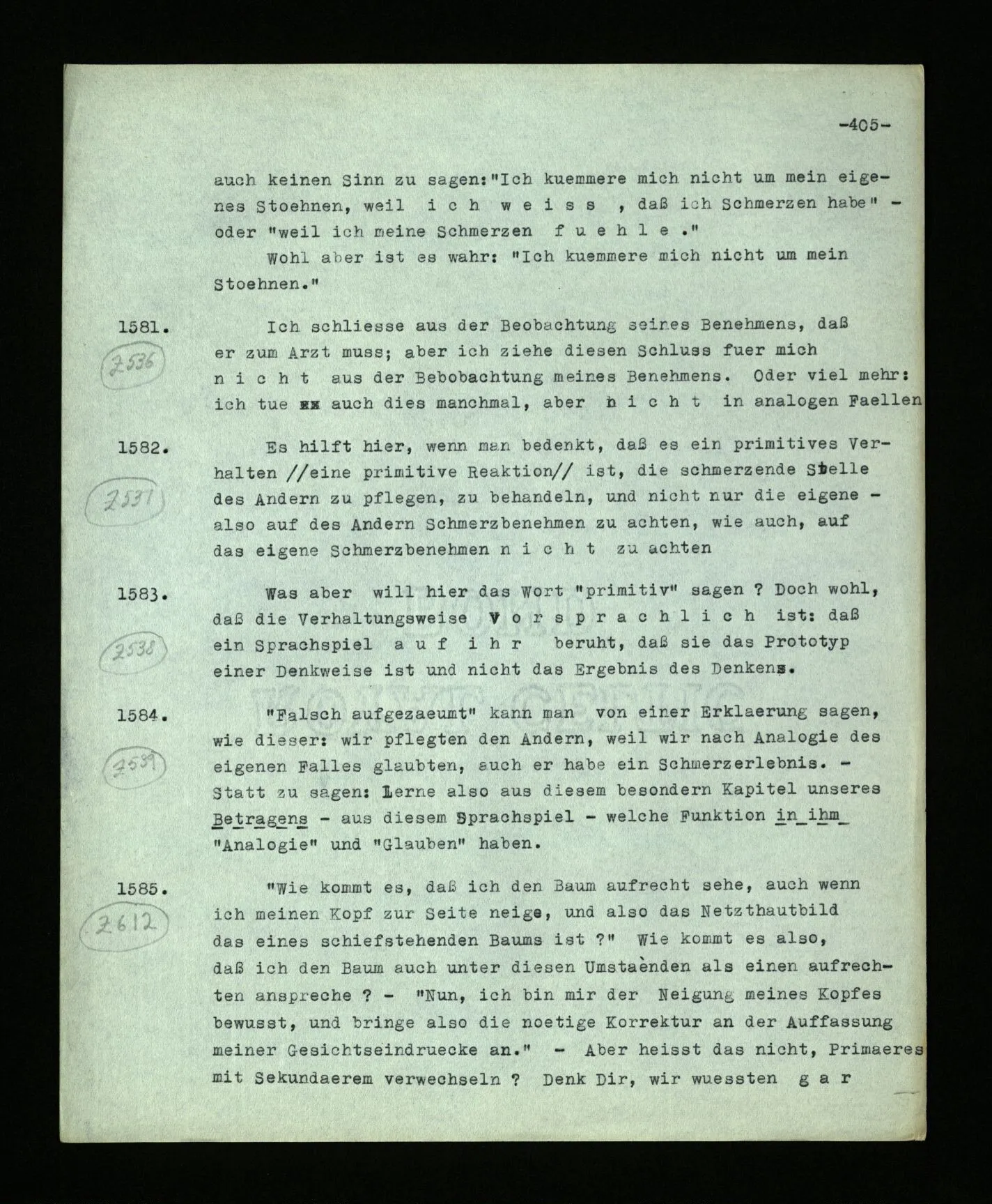 1801. Er fragt “Was hast Du mit dem Wort gemeint?” – Ich beantworte die Frage und setze hinzu: “Hättest Du mich früher gefragt, so hätte ich das gleiche geantwortet; meine Antwort war nicht eine Deutung, die mir jetzt eingefallen ist.” So war sie mir schon früher eingefallen? Nein. – Und wie konnte ich dann sagen: “Hättest Du mich früher gefragt, so hätte ich ‥‥ ”? Woraus schloß ich das? Aus garnichts. Was teile ich ihm mit, wenn ich diesen Konditional ausspreche? Etwas, was manchmal von Wichtigkeit sein kann.