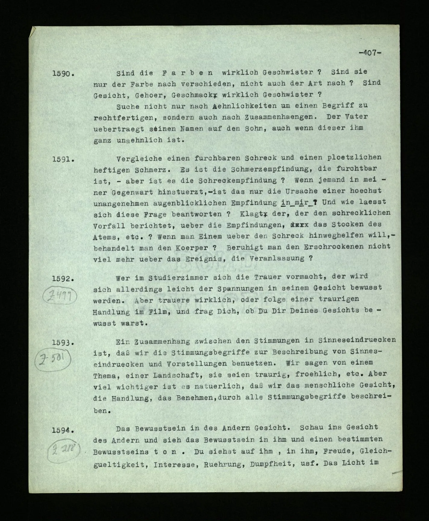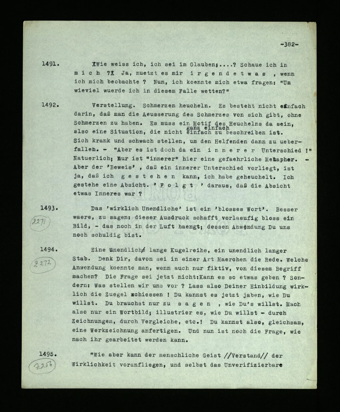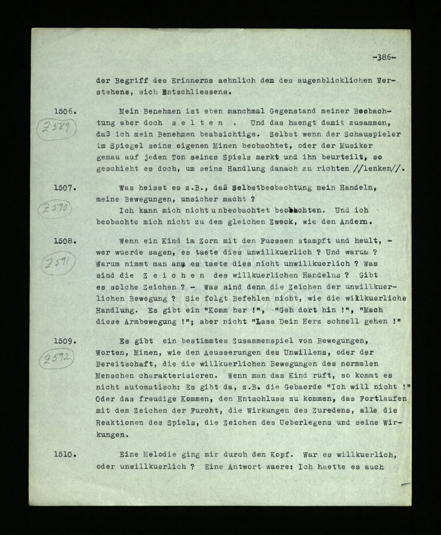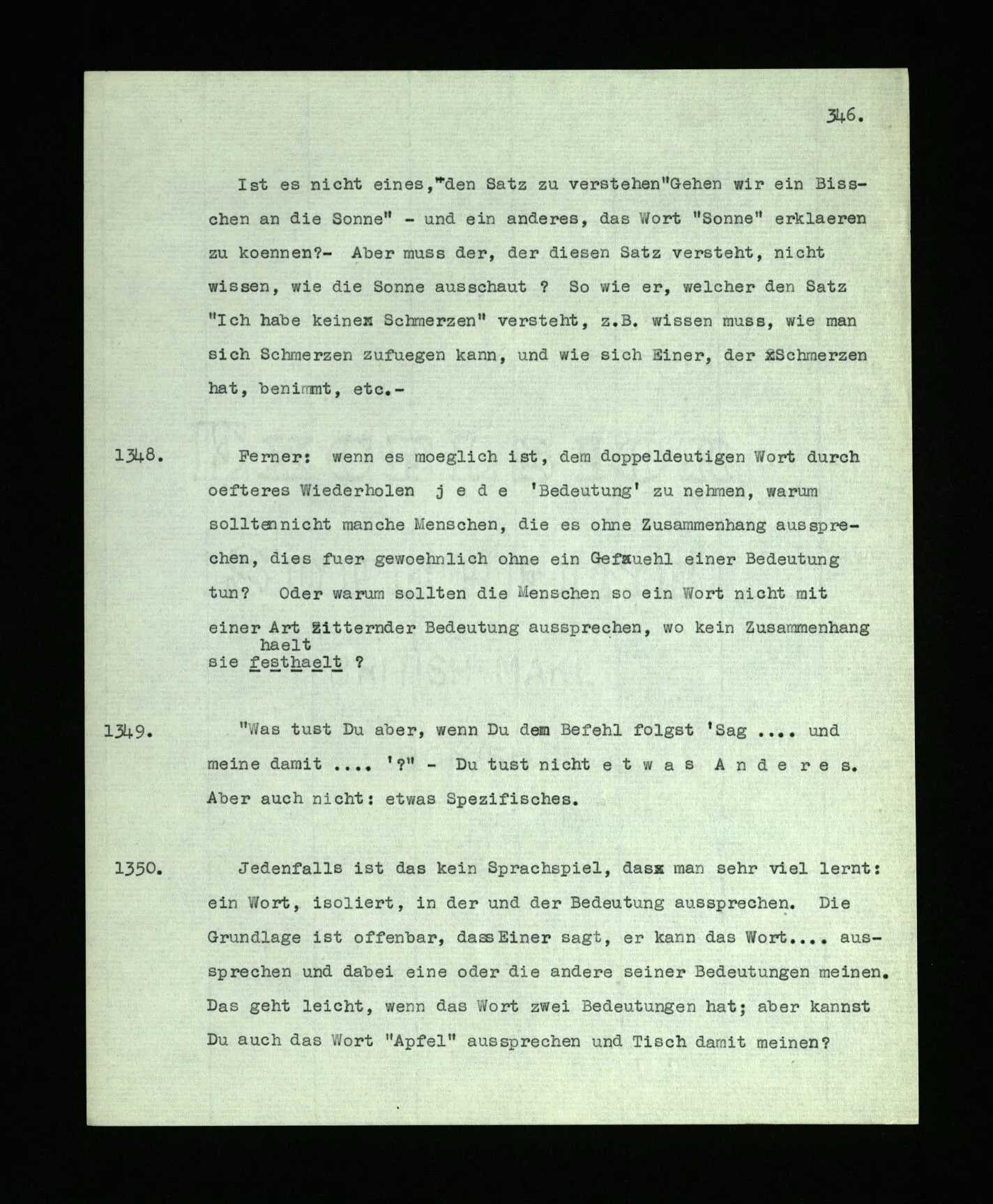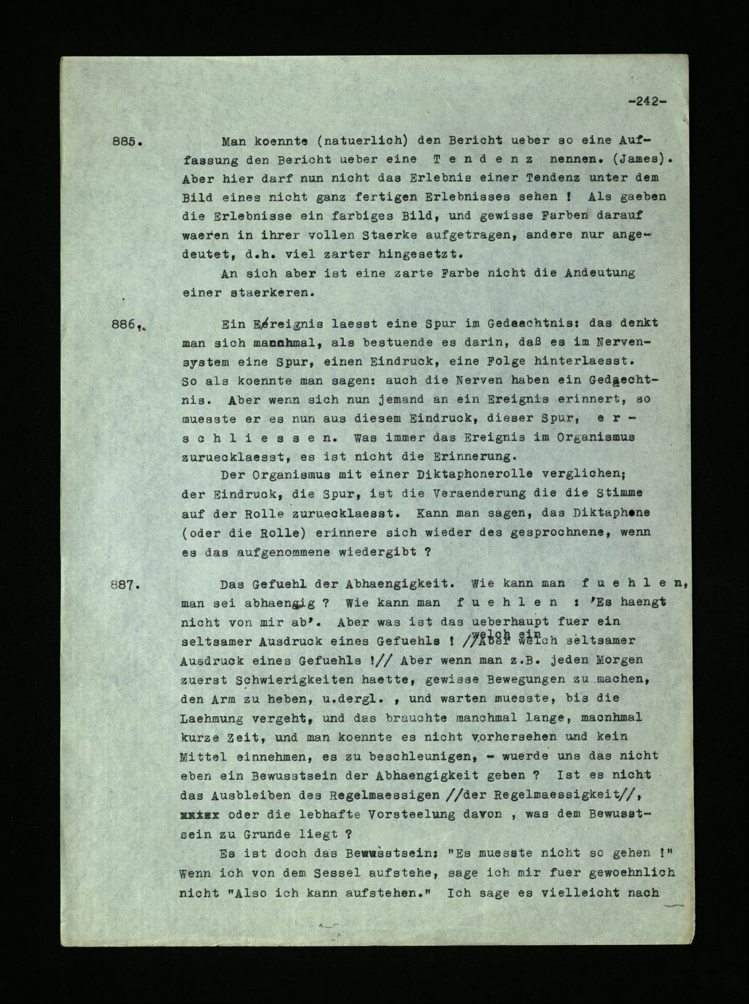 1801. Er fragt “Was hast Du mit dem Wort gemeint?” – Ich beantworte die Frage und setze hinzu: “Hättest Du mich früher gefragt, so hätte ich das gleiche geantwortet; meine Antwort war nicht eine Deutung, die mir jetzt eingefallen ist.” So war sie mir schon früher eingefallen? Nein. – Und wie konnte ich dann sagen: “Hättest Du mich früher gefragt, so hätte ich ‥‥ ”? Woraus schloß ich das? Aus garnichts. Was teile ich ihm mit, wenn ich diesen Konditional ausspreche? Etwas, was manchmal von Wichtigkeit sein kann.
