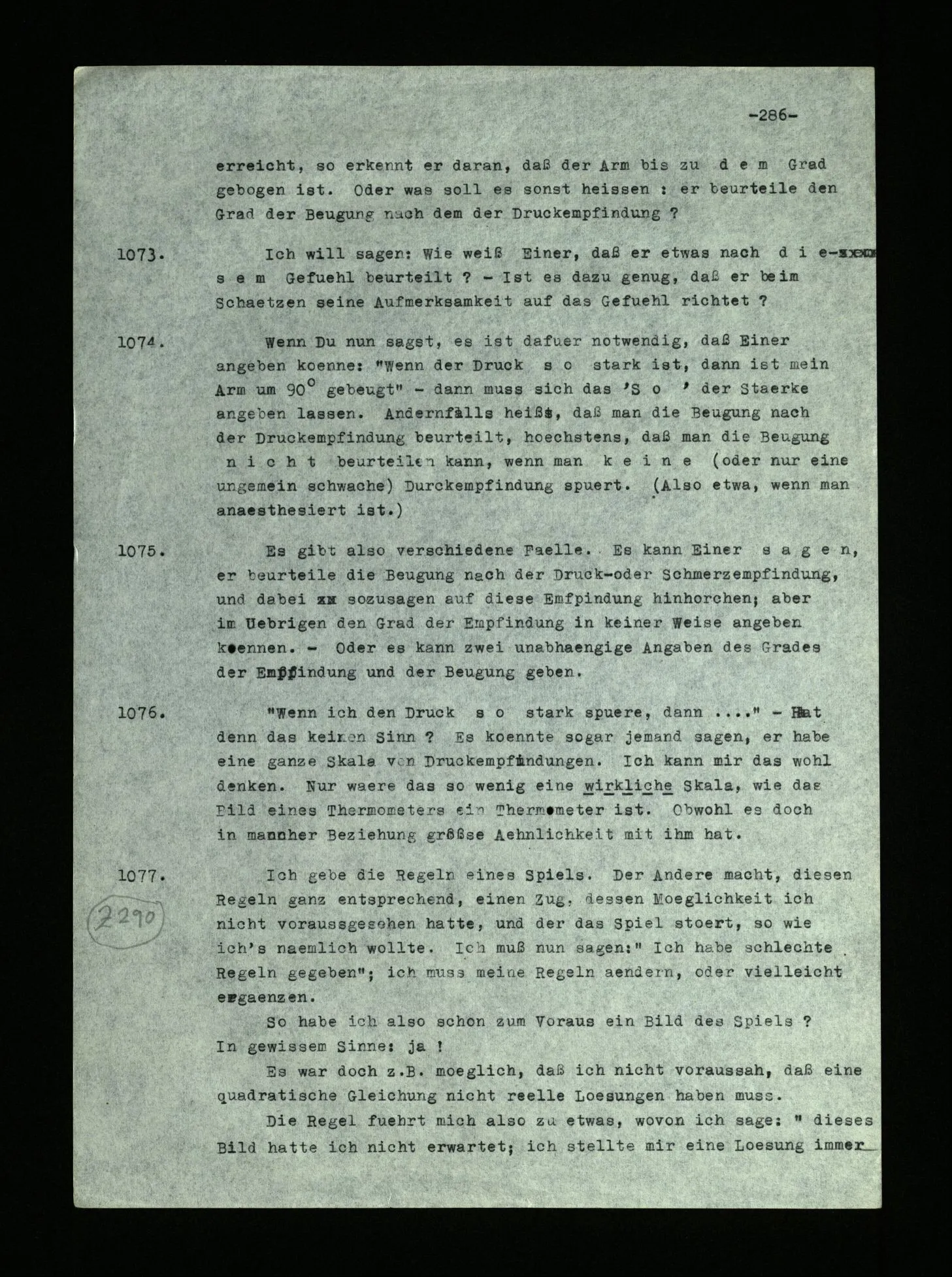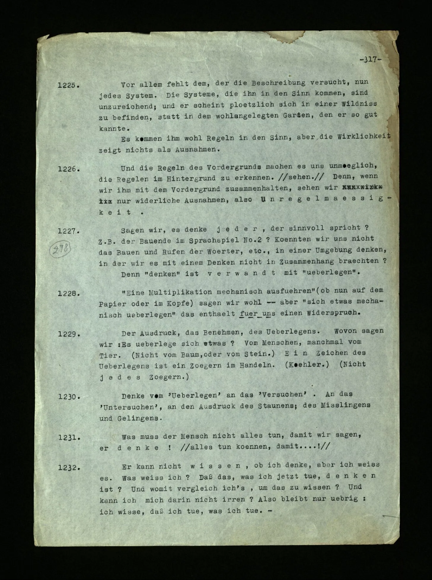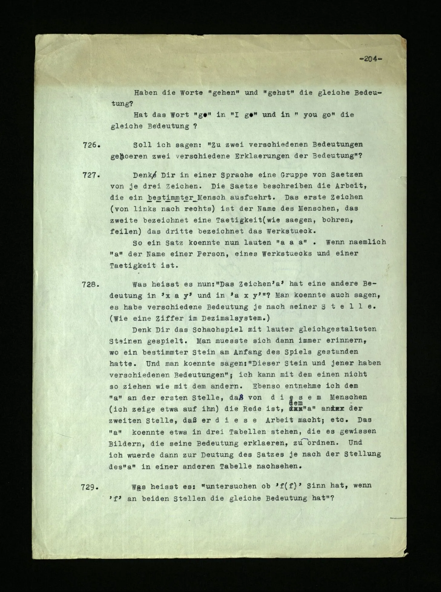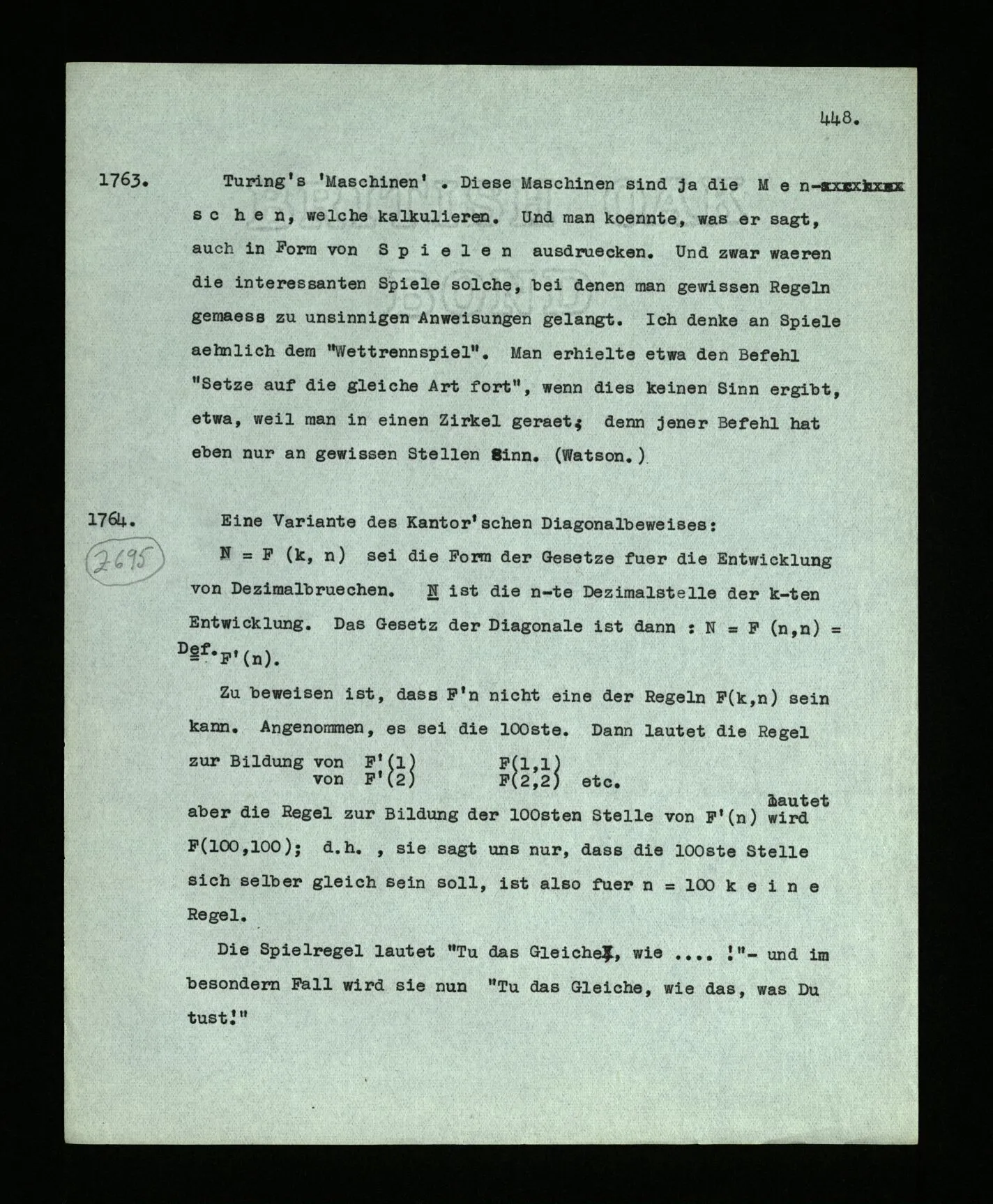 1763. Turing’s ‘Maschinen’. Diese Maschinen sind ja die Menschen, welche kalkulieren. Und man könnte, was er sagt, auch in Form von Spielen ausdrücken. Und zwar wären die interessanten Spiele solche, bei denen man gewissen Regeln gemäß zu unsinnigen Anweisungen gelangt. Ich denke an Spiele ähnlich dem “Wettrennspiel”. Man erhielte etwa den Befehl “Setze auf die gleiche Art fort”, wenn dies keinen Sinn ergibt, etwa, weil man in einen Zirkel gerät; denn jener Befehl hat eben nur an gewissen Stellen Sinn. (Watson.)