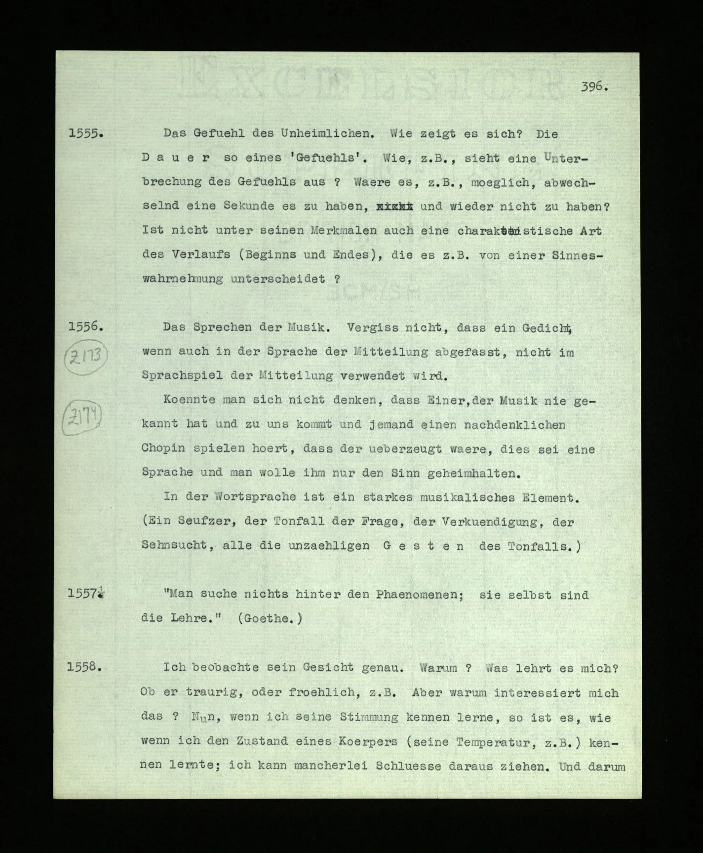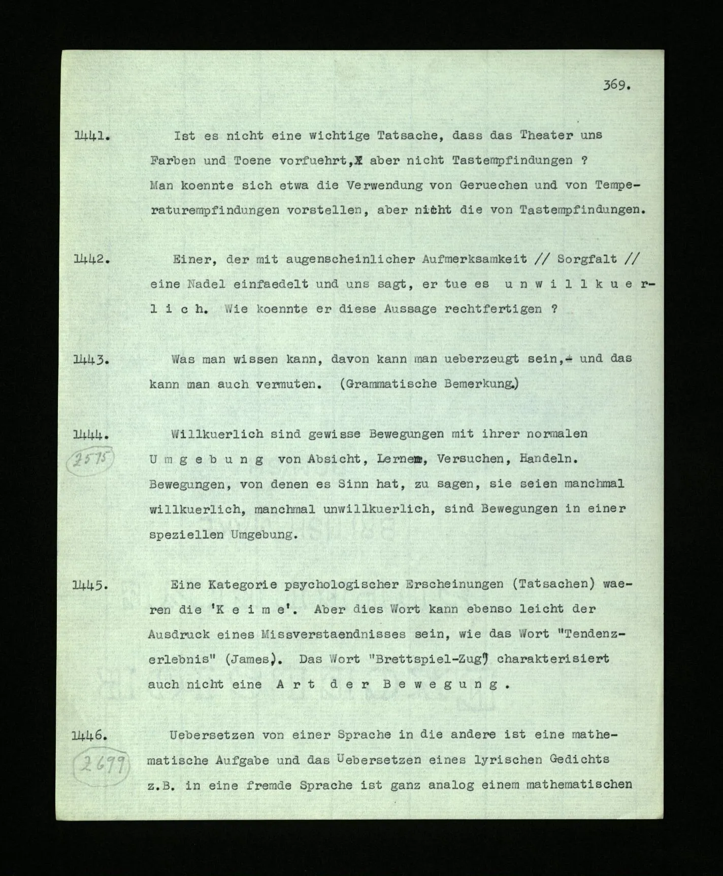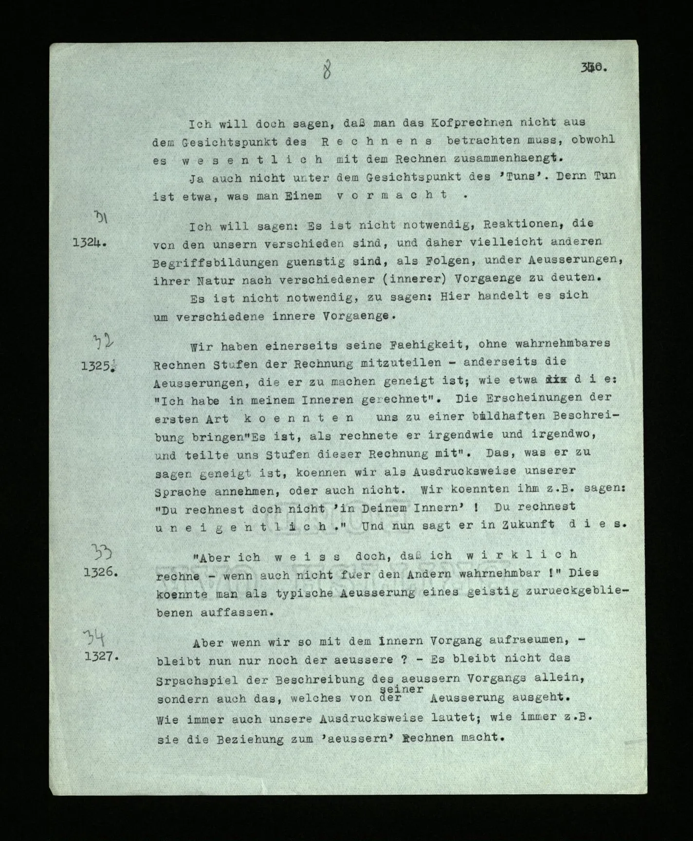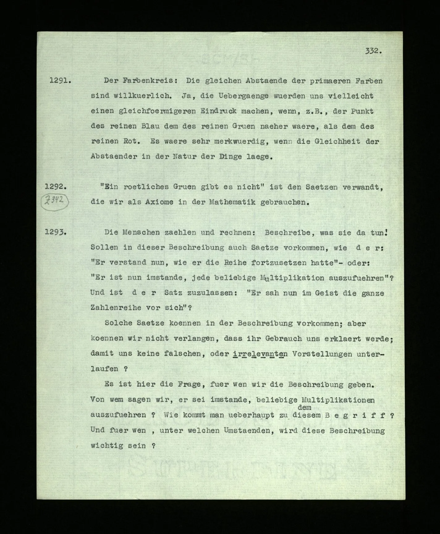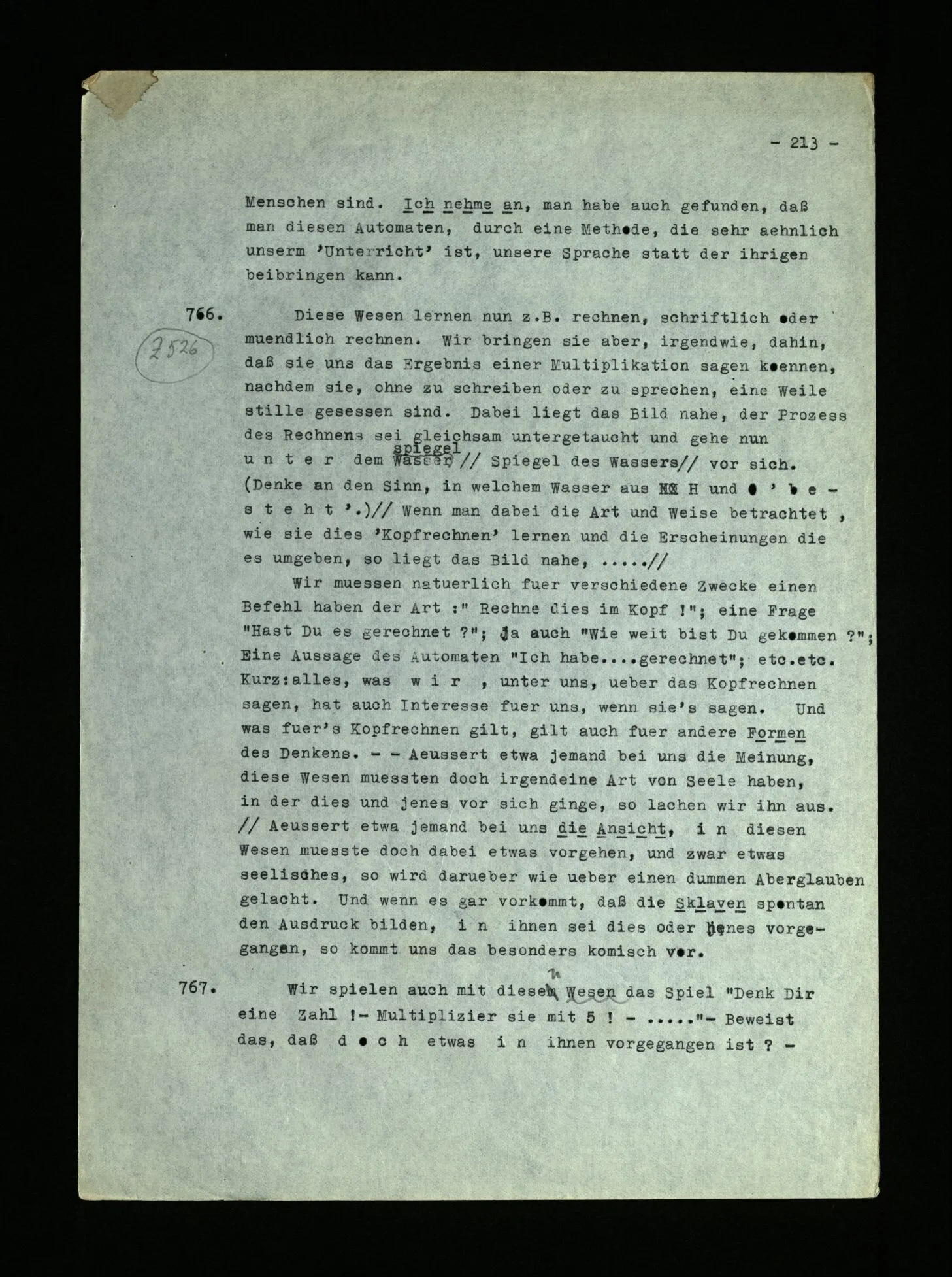 1763. Turing’s ‘Maschinen’. Diese Maschinen sind ja die Menschen, welche kalkulieren. Und man könnte, was er sagt, auch in Form von Spielen ausdrücken. Und zwar wären die interessanten Spiele solche, bei denen man gewissen Regeln gemäß zu unsinnigen Anweisungen gelangt. Ich denke an Spiele ähnlich dem “Wettrennspiel”. Man erhielte etwa den Befehl “Setze auf die gleiche Art fort”, wenn dies keinen Sinn ergibt, etwa, weil man in einen Zirkel gerät; denn jener Befehl hat eben nur an gewissen Stellen Sinn. (Watson.)