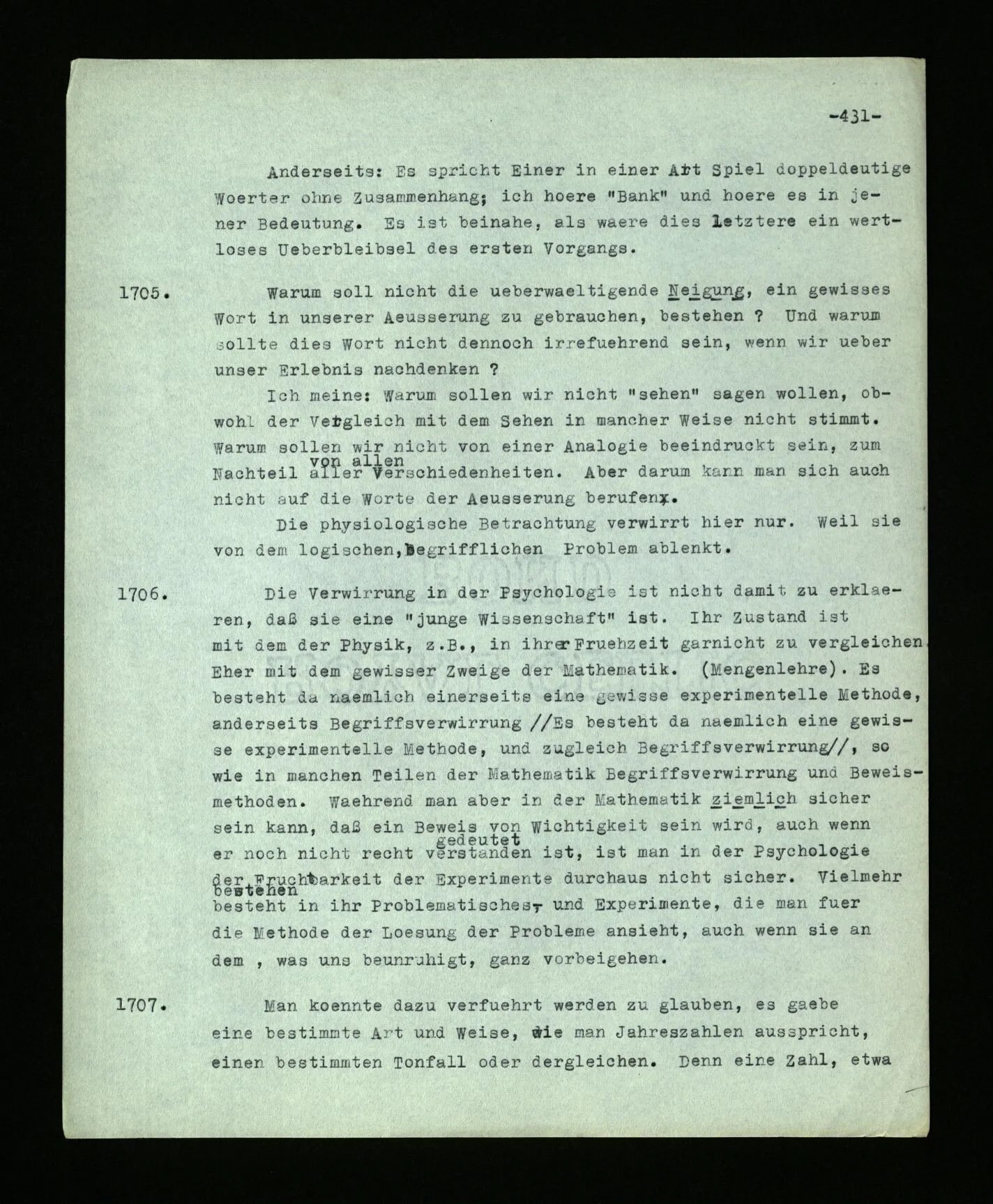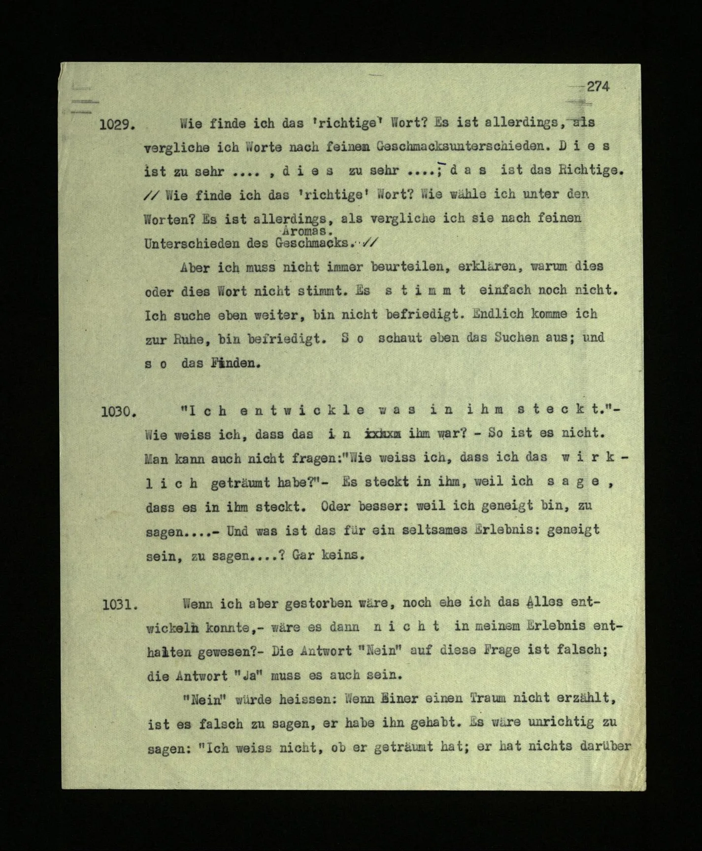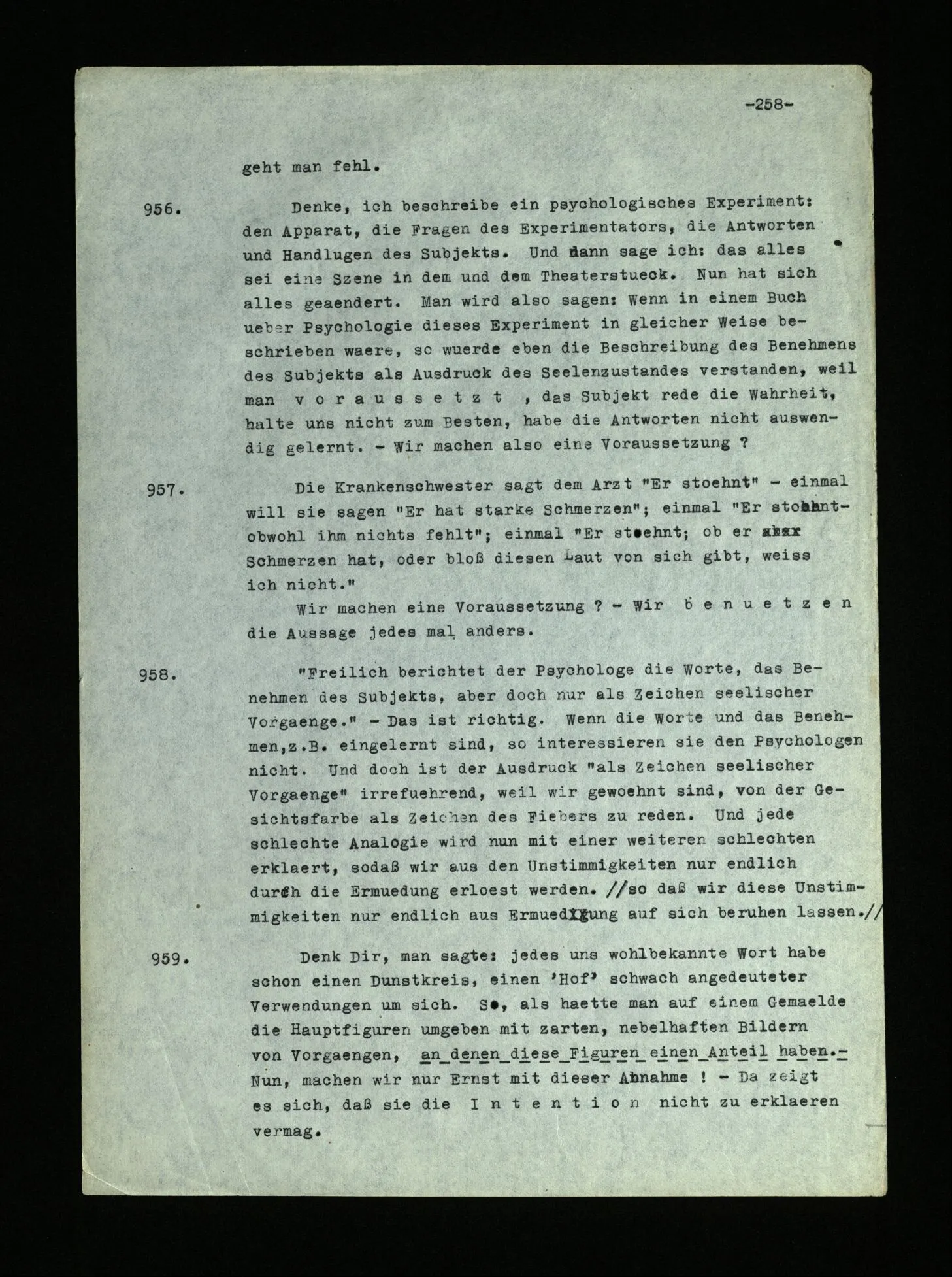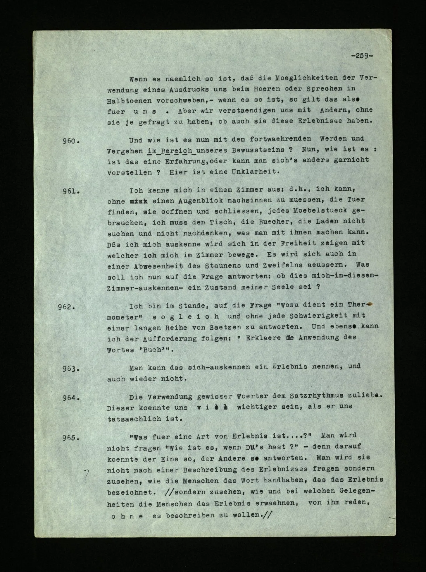 1760. “Das Denken ist ein rätselhafter Vorgang, von dessen vollem Verständnis wir noch weit entfernt sind.” Und nun stellt man Experimente an. Offenbar, ohne sich bewußt zu sein, worin das Rätselhafte des Denkens für uns liegt. Die experimentelle Methode tut etwas; daß sie das Problem nicht löst, schiebt man darauf, daß sie noch in ihren Anfängen liegt. Es ist, als wollte man durch chemische Experimente feststellen, was Materie, und was Geist ist.