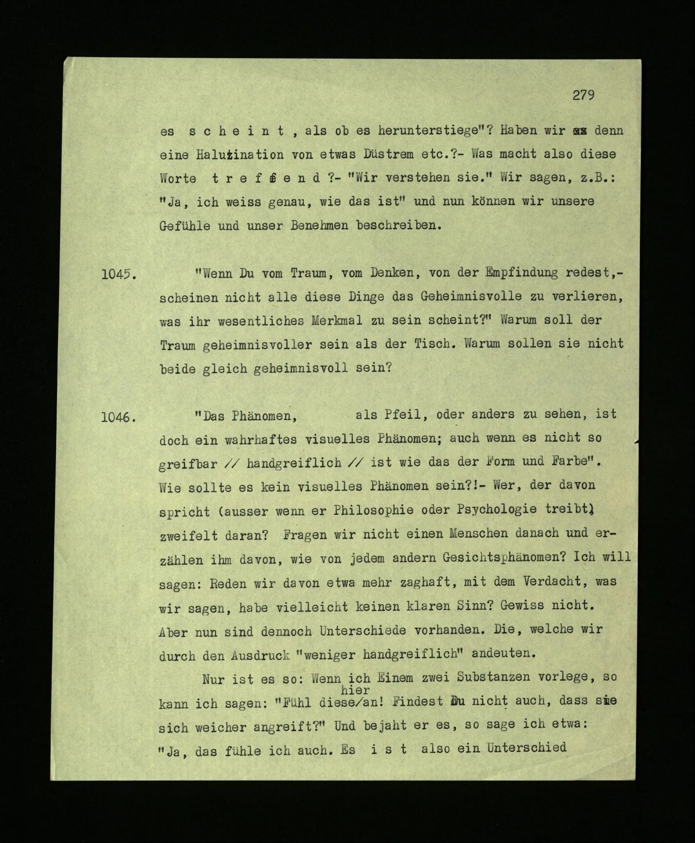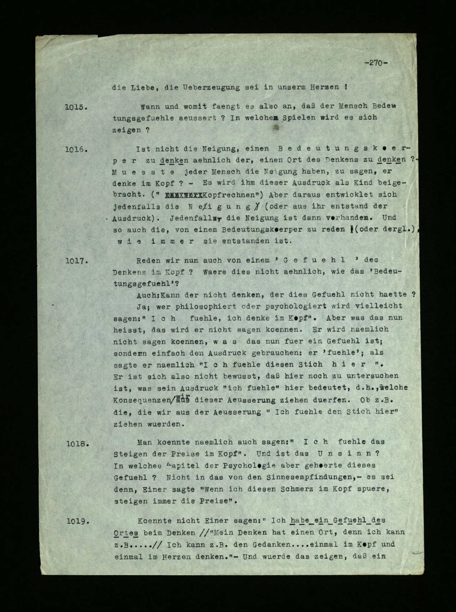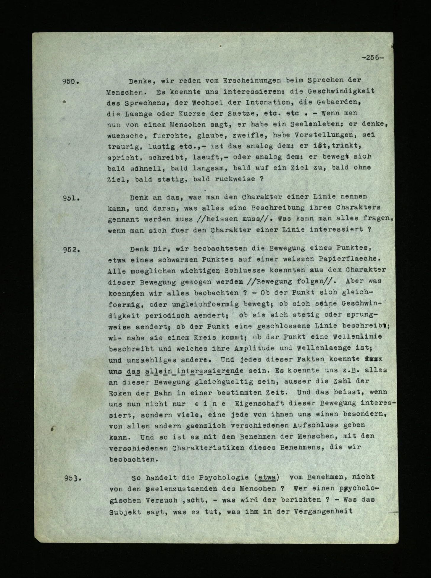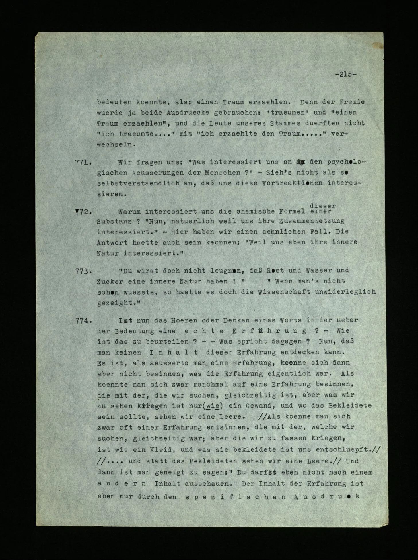 1760. “Das Denken ist ein rätselhafter Vorgang, von dessen vollem Verständnis wir noch weit entfernt sind.” Und nun stellt man Experimente an. Offenbar, ohne sich bewußt zu sein, worin das Rätselhafte des Denkens für uns liegt. Die experimentelle Methode tut etwas; daß sie das Problem nicht löst, schiebt man darauf, daß sie noch in ihren Anfängen liegt. Es ist, als wollte man durch chemische Experimente feststellen, was Materie, und was Geist ist.