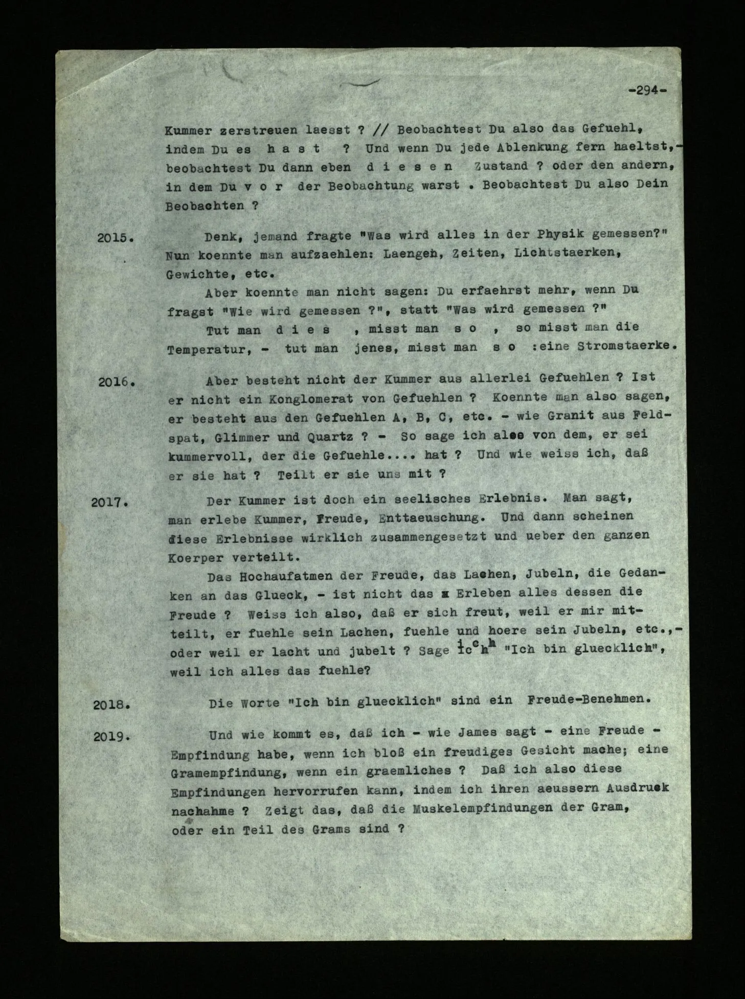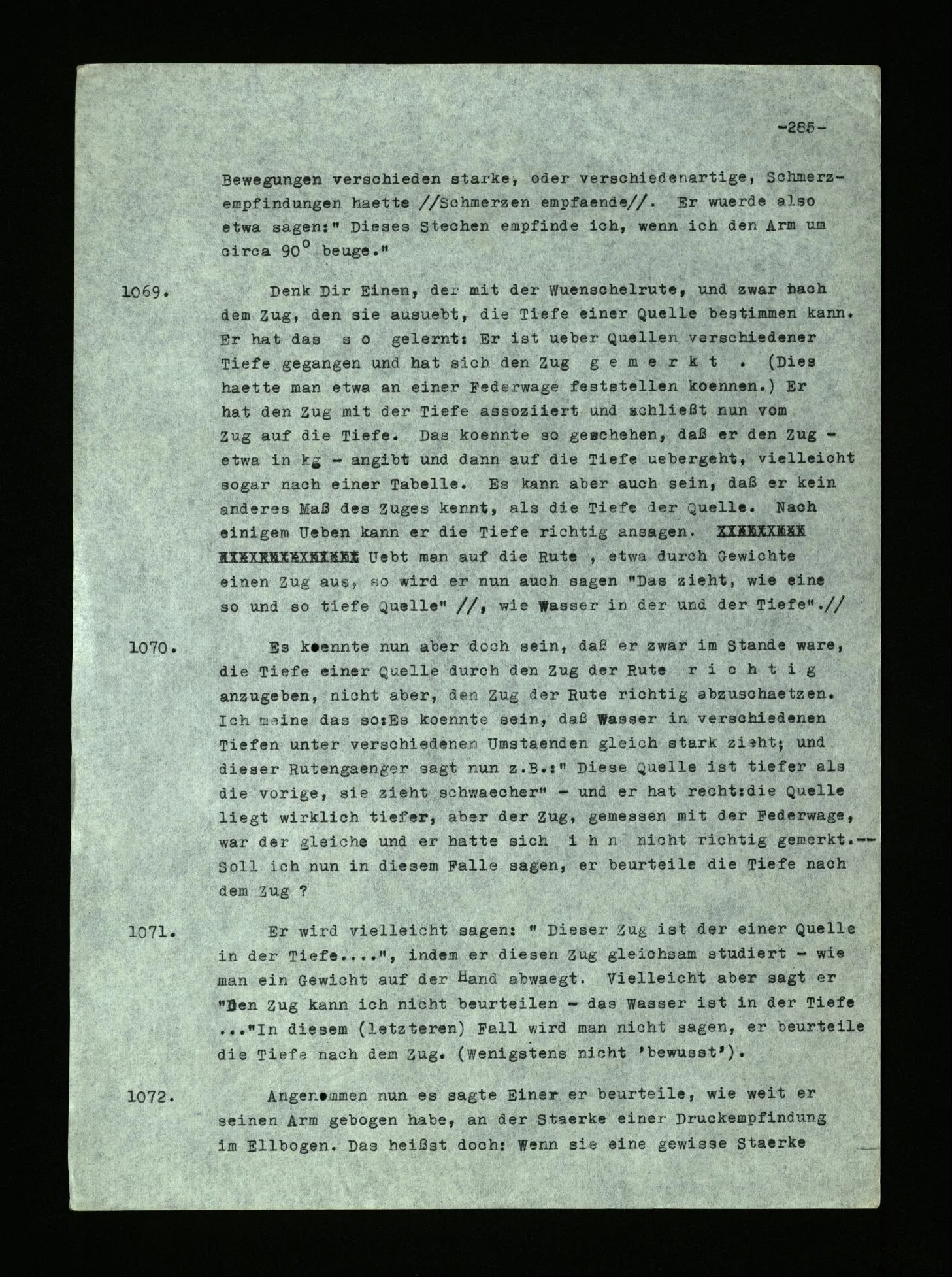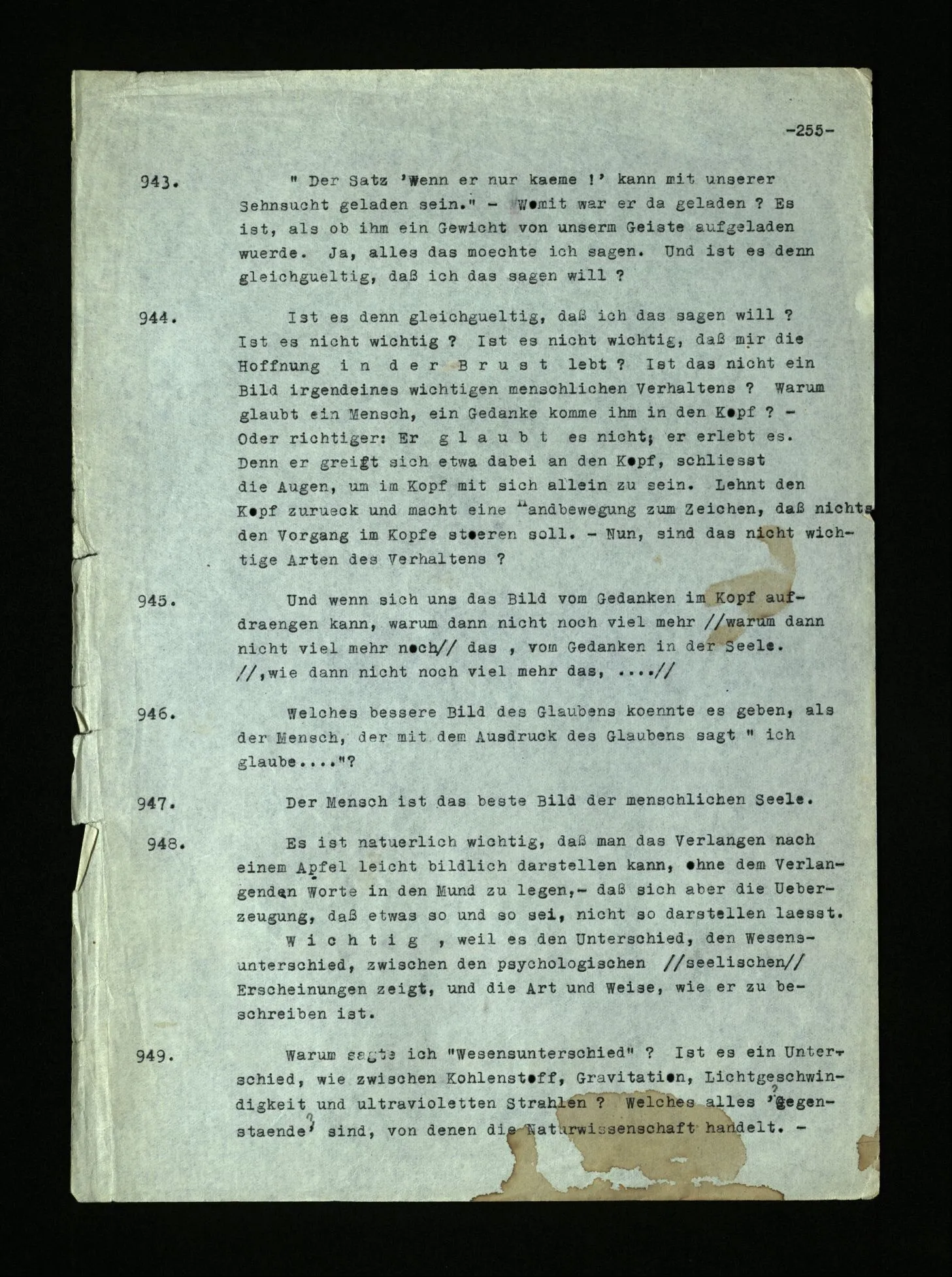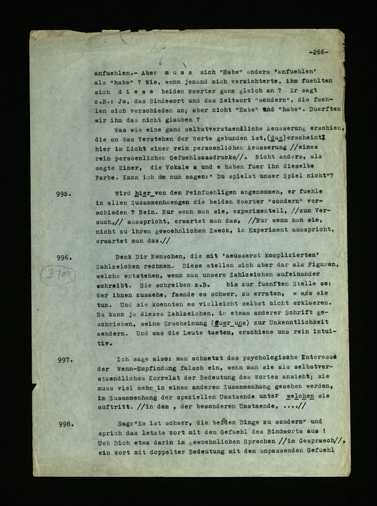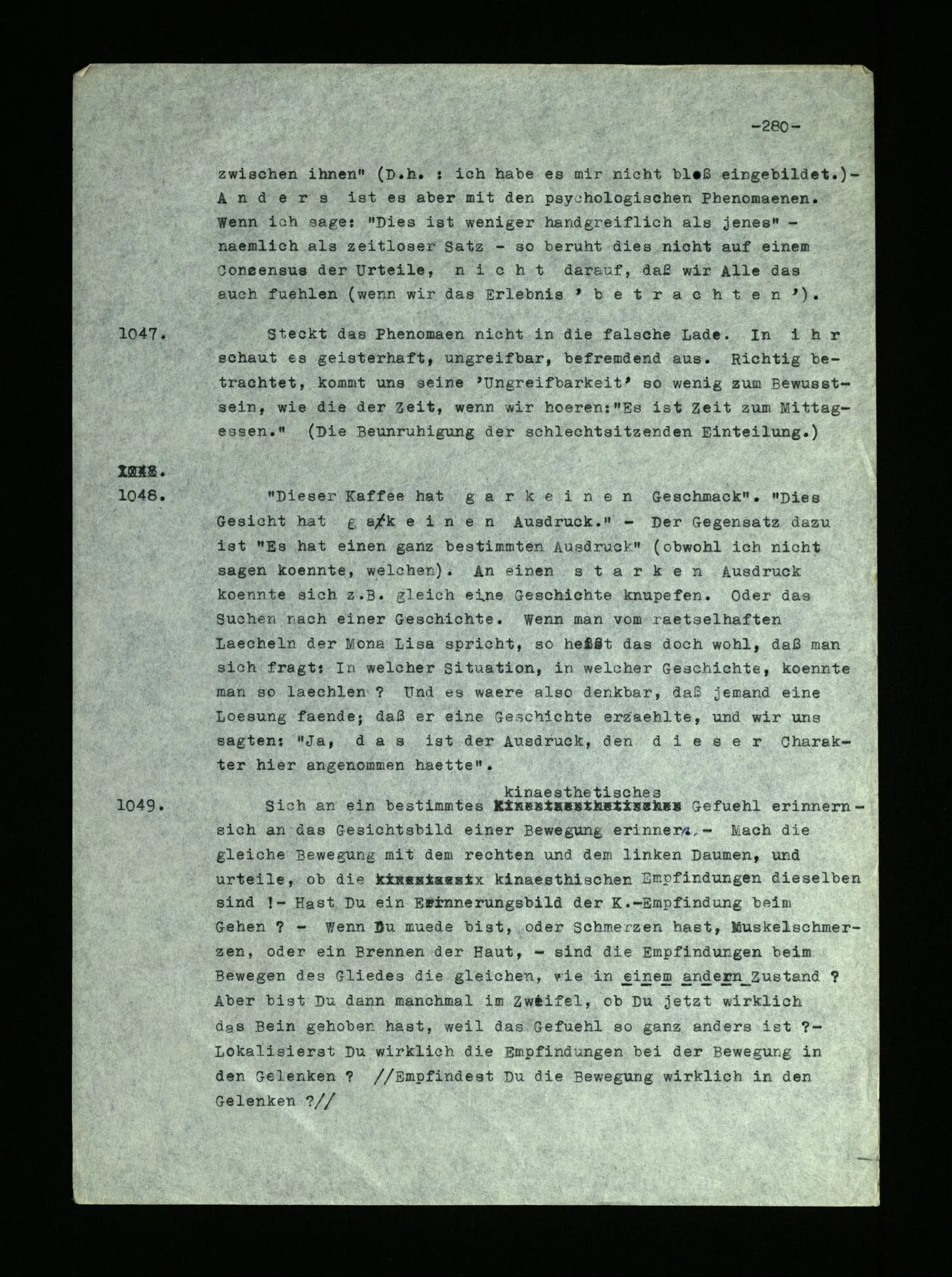 1760. “Das Denken ist ein rätselhafter Vorgang, von dessen vollem Verständnis wir noch weit entfernt sind.” Und nun stellt man Experimente an. Offenbar, ohne sich bewußt zu sein, worin das Rätselhafte des Denkens für uns liegt. Die experimentelle Methode tut etwas; daß sie das Problem nicht löst, schiebt man darauf, daß sie noch in ihren Anfängen liegt. Es ist, als wollte man durch chemische Experimente feststellen, was Materie, und was Geist ist.