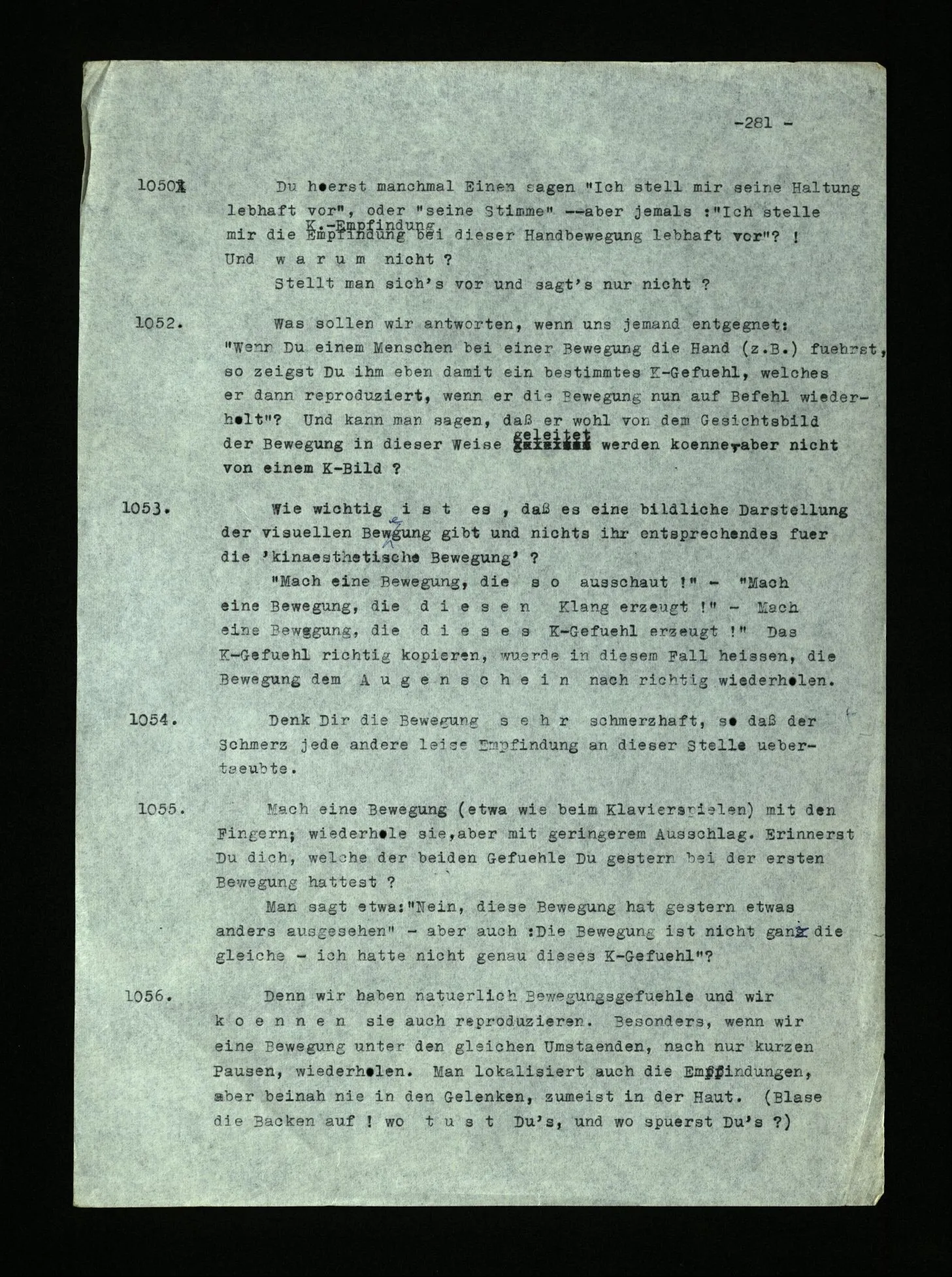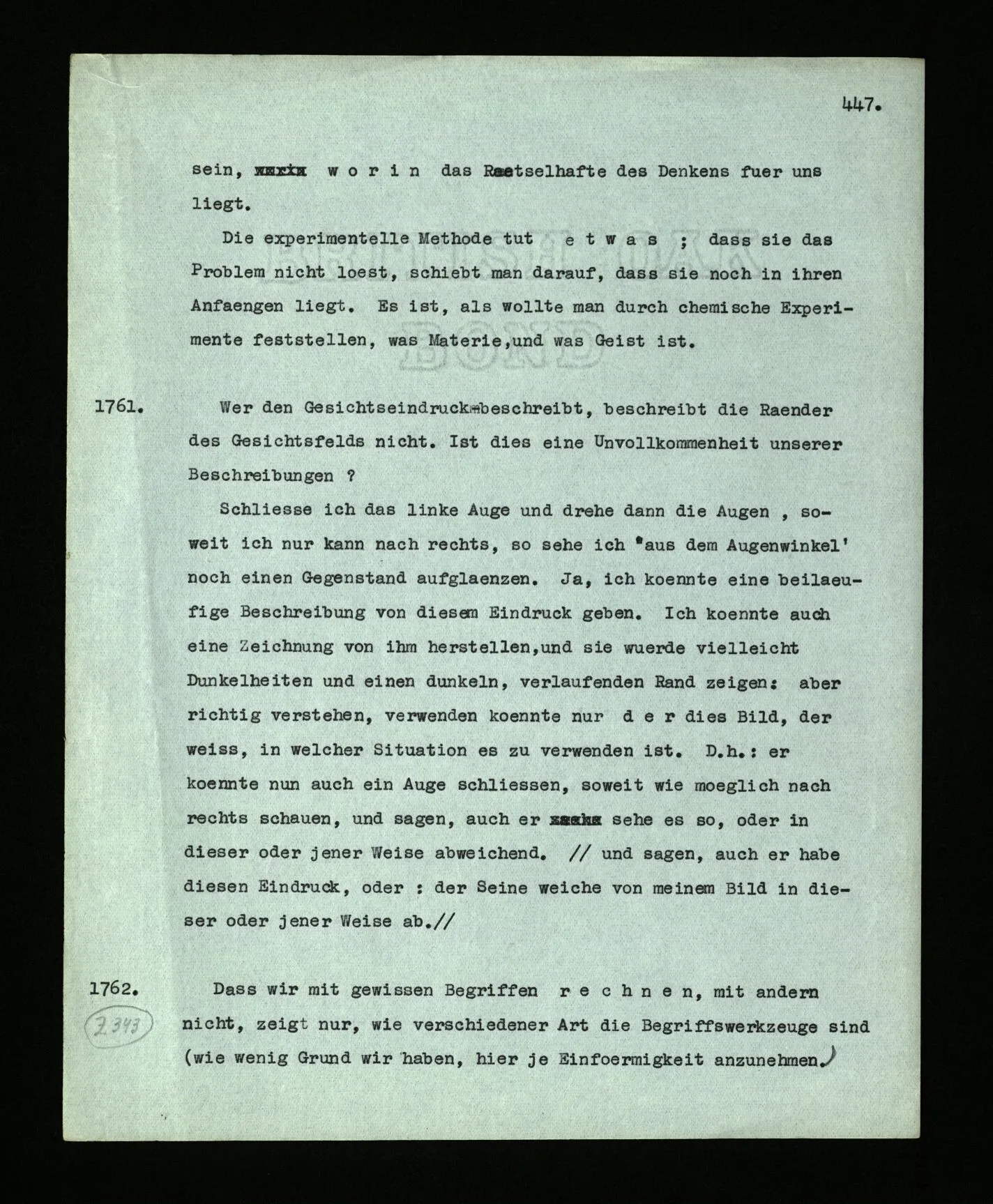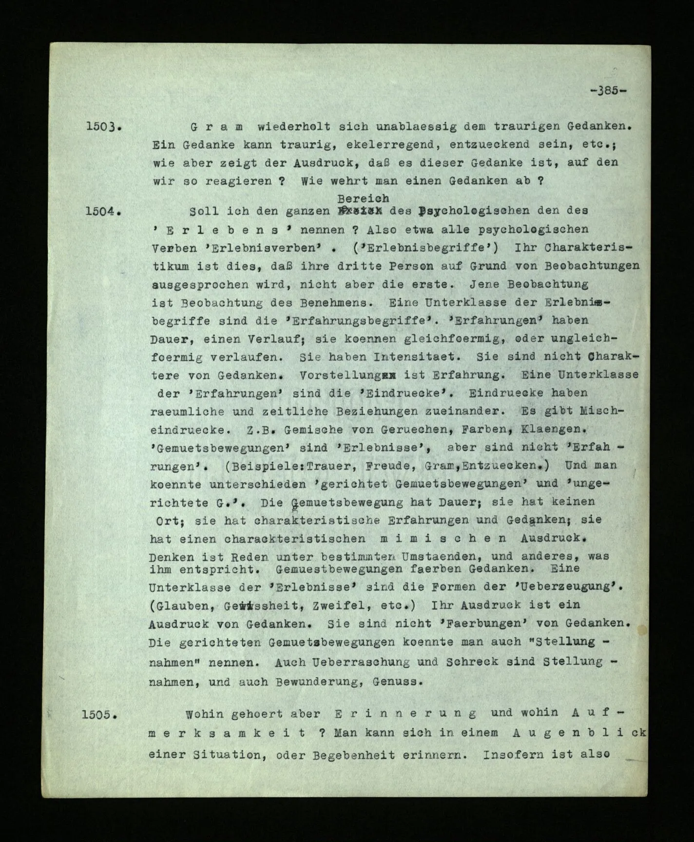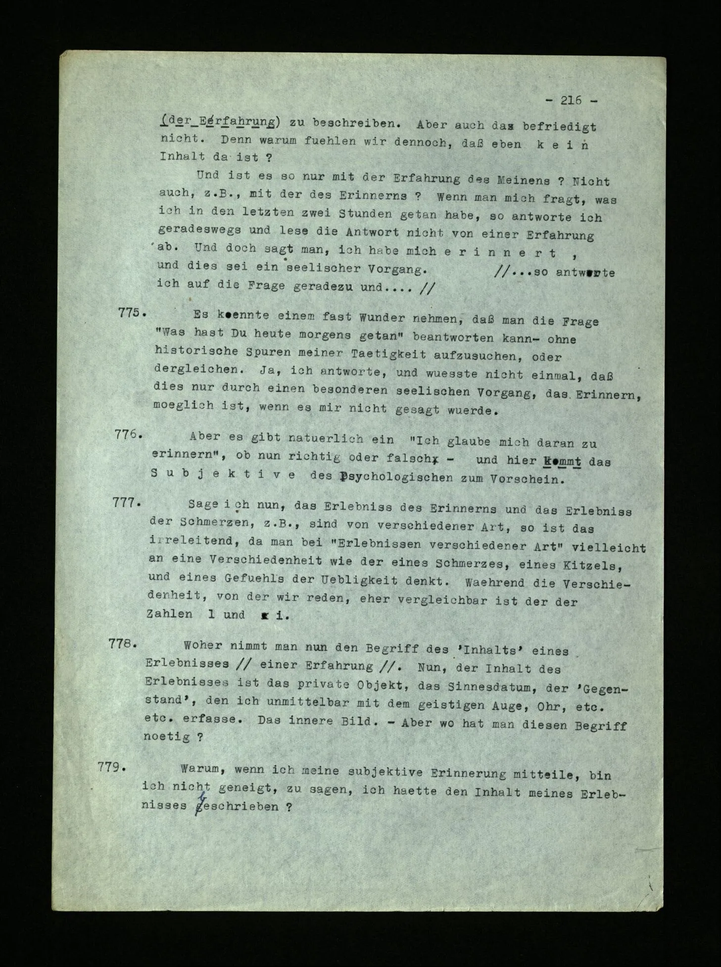 1760. “Das Denken ist ein rätselhafter Vorgang, von dessen vollem Verständnis wir noch weit entfernt sind.” Und nun stellt man Experimente an. Offenbar, ohne sich bewußt zu sein, worin das Rätselhafte des Denkens für uns liegt. Die experimentelle Methode tut etwas; daß sie das Problem nicht löst, schiebt man darauf, daß sie noch in ihren Anfängen liegt. Es ist, als wollte man durch chemische Experimente feststellen, was Materie, und was Geist ist.