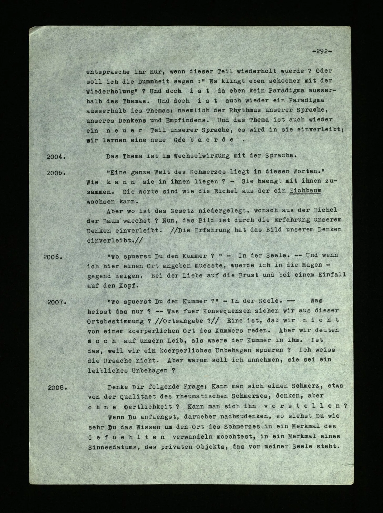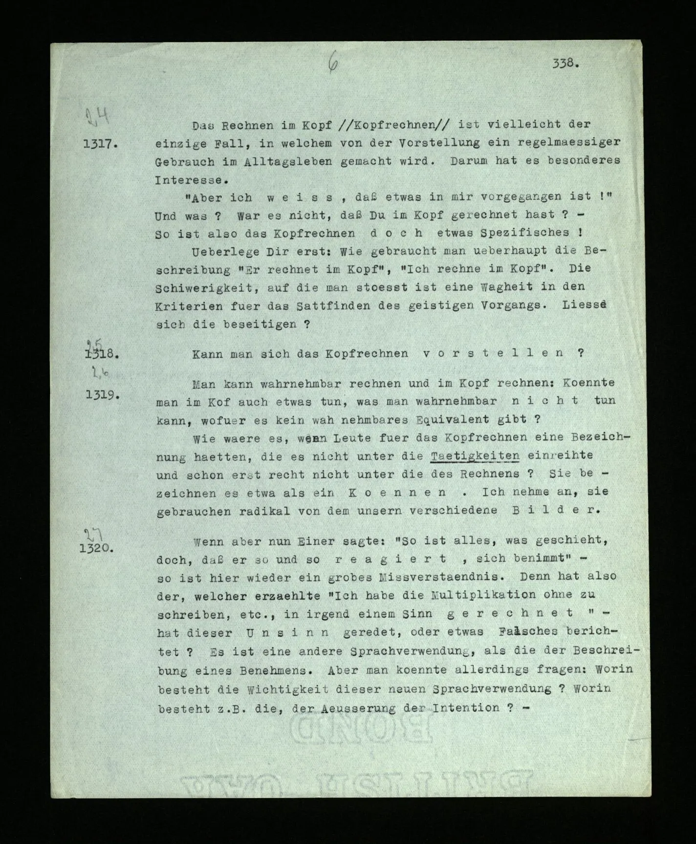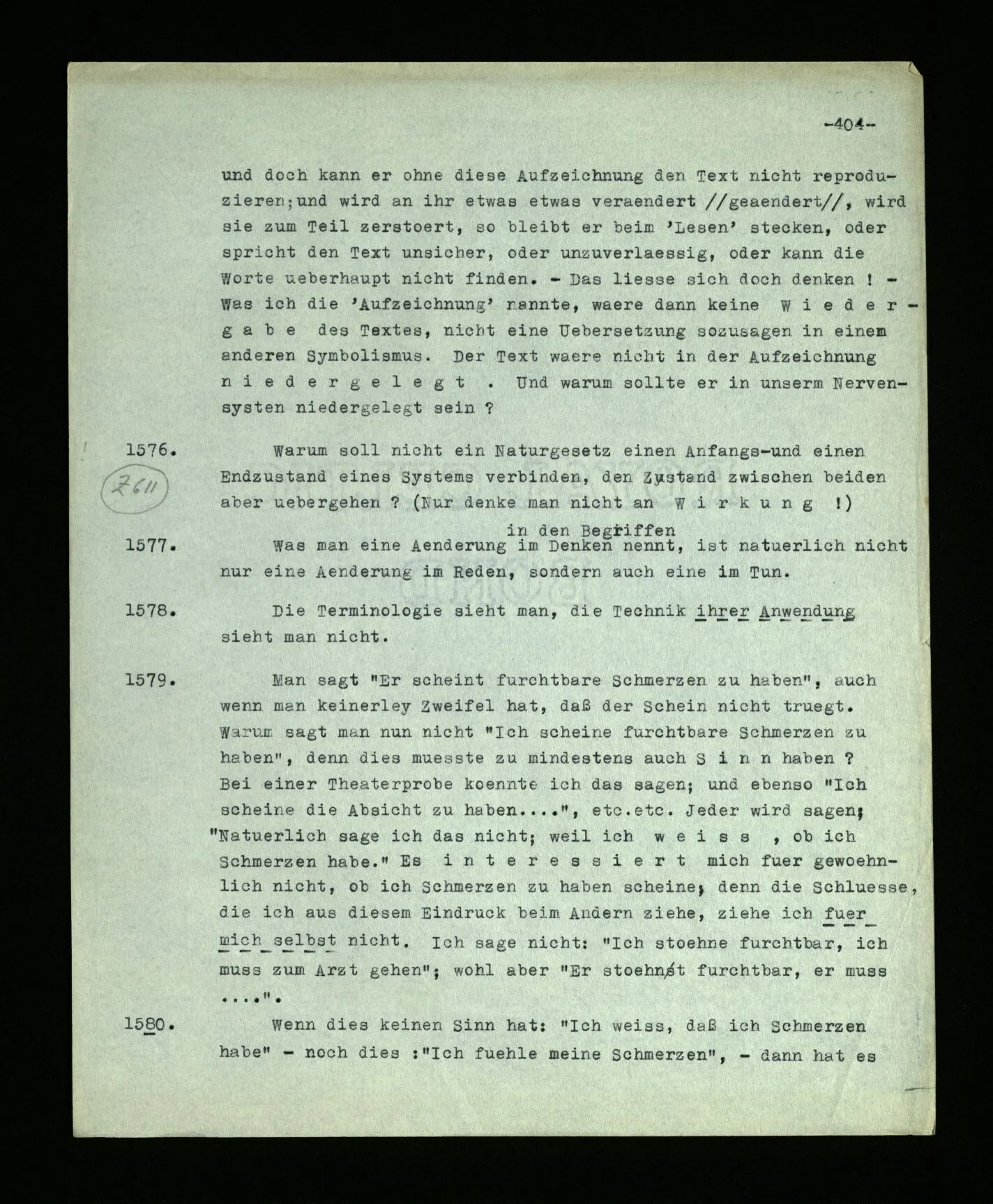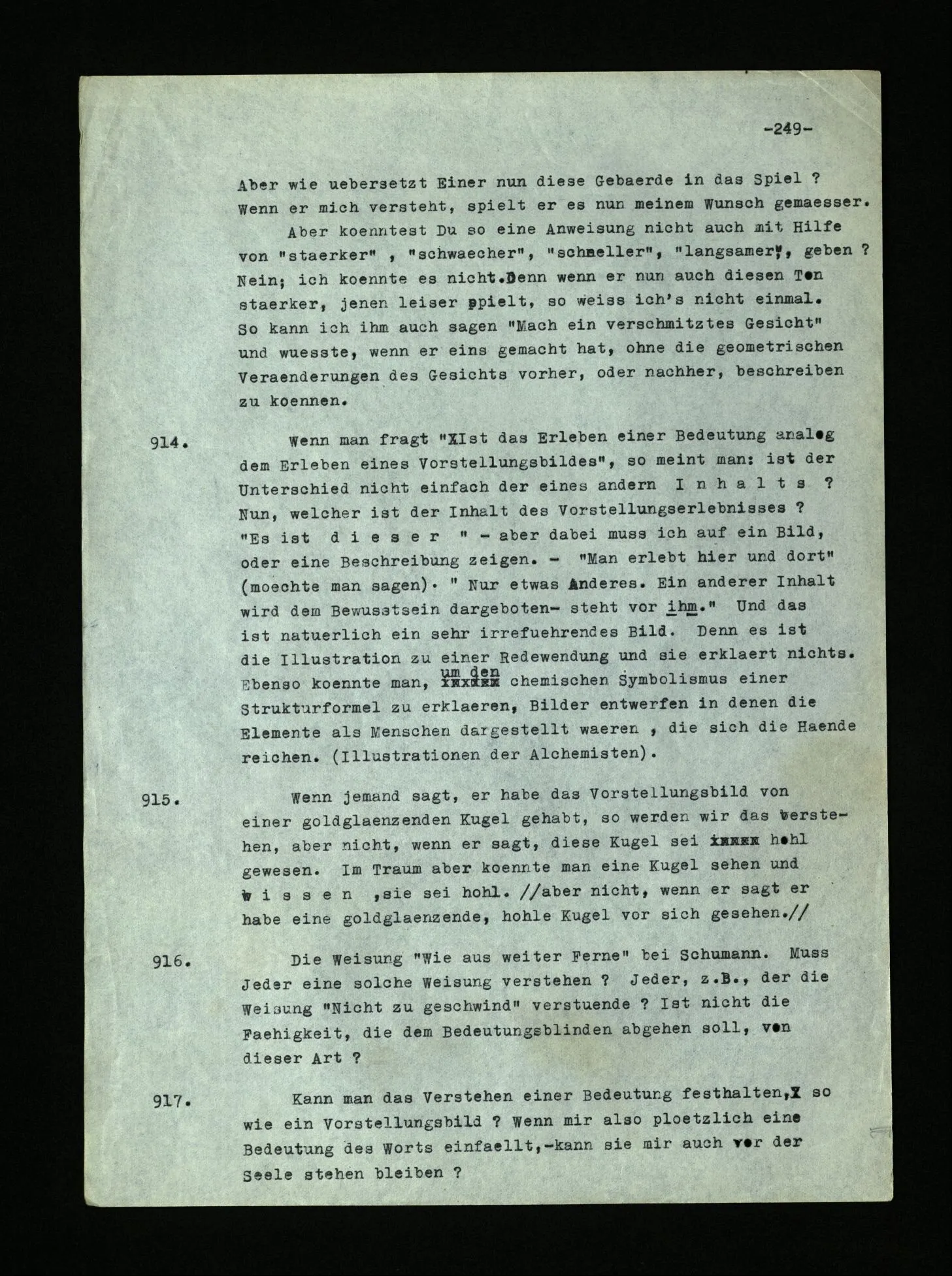 1760. “Das Denken ist ein rätselhafter Vorgang, von dessen vollem Verständnis wir noch weit entfernt sind.” Und nun stellt man Experimente an. Offenbar, ohne sich bewußt zu sein, worin das Rätselhafte des Denkens für uns liegt. Die experimentelle Methode tut etwas; daß sie das Problem nicht löst, schiebt man darauf, daß sie noch in ihren Anfängen liegt. Es ist, als wollte man durch chemische Experimente feststellen, was Materie, und was Geist ist.