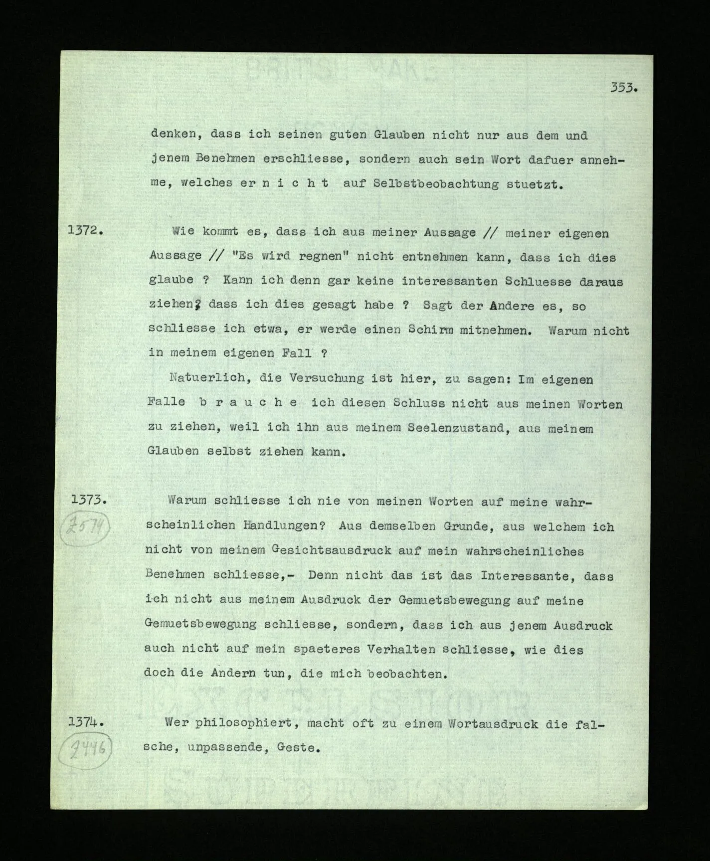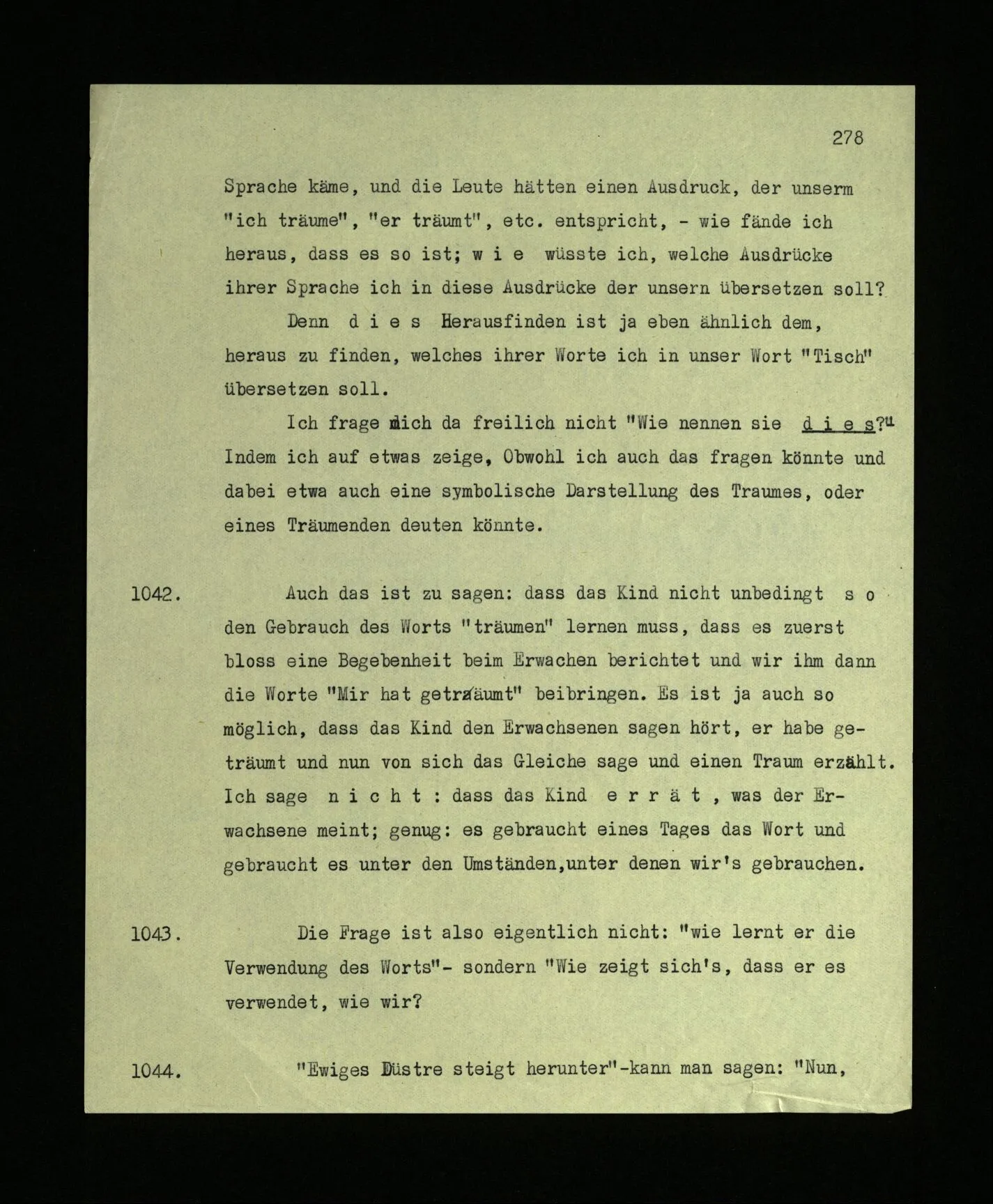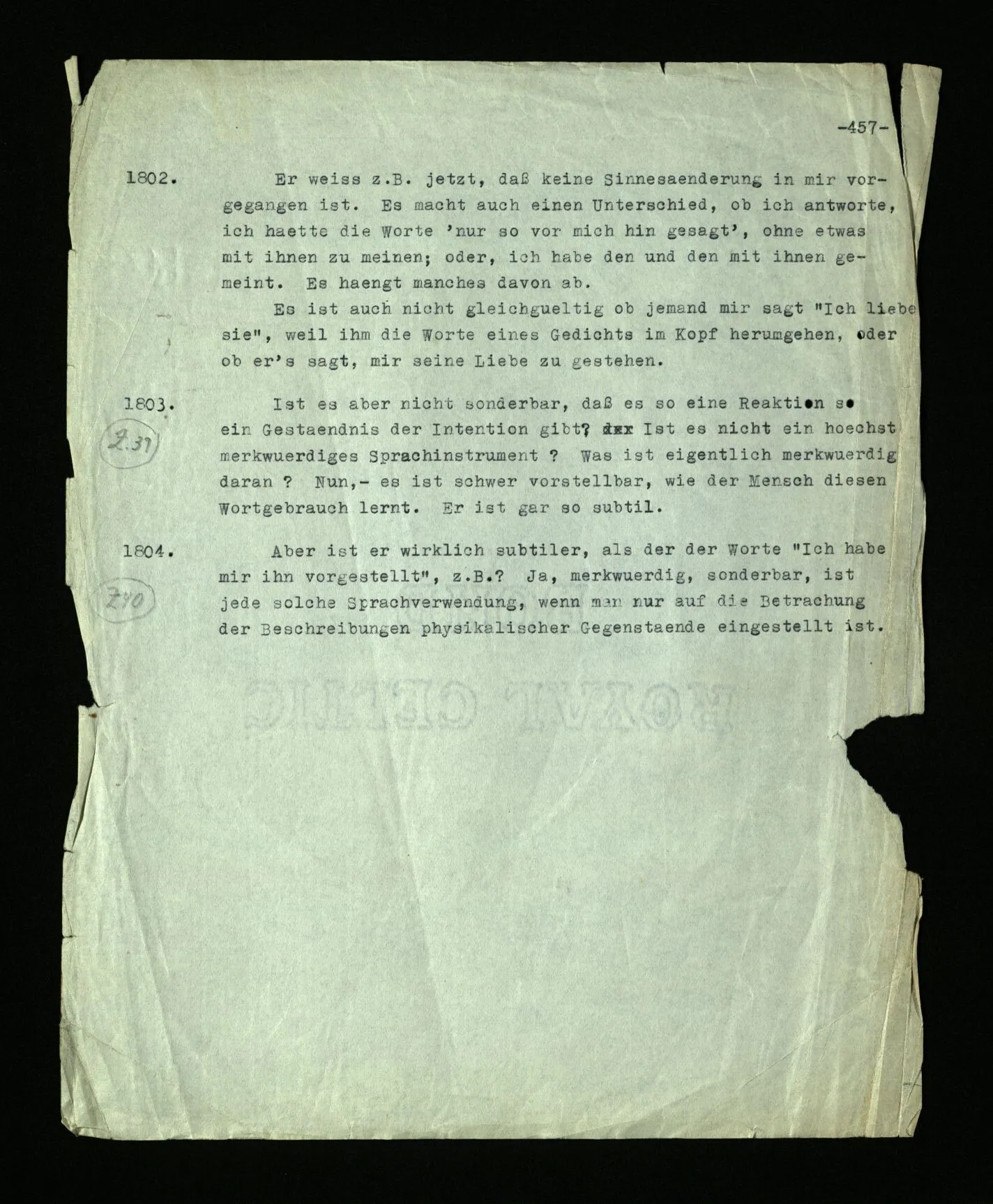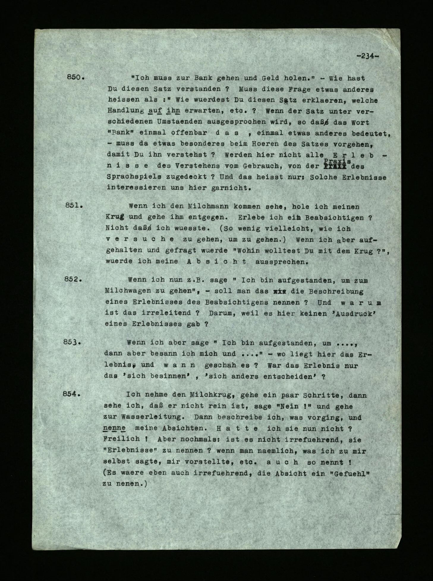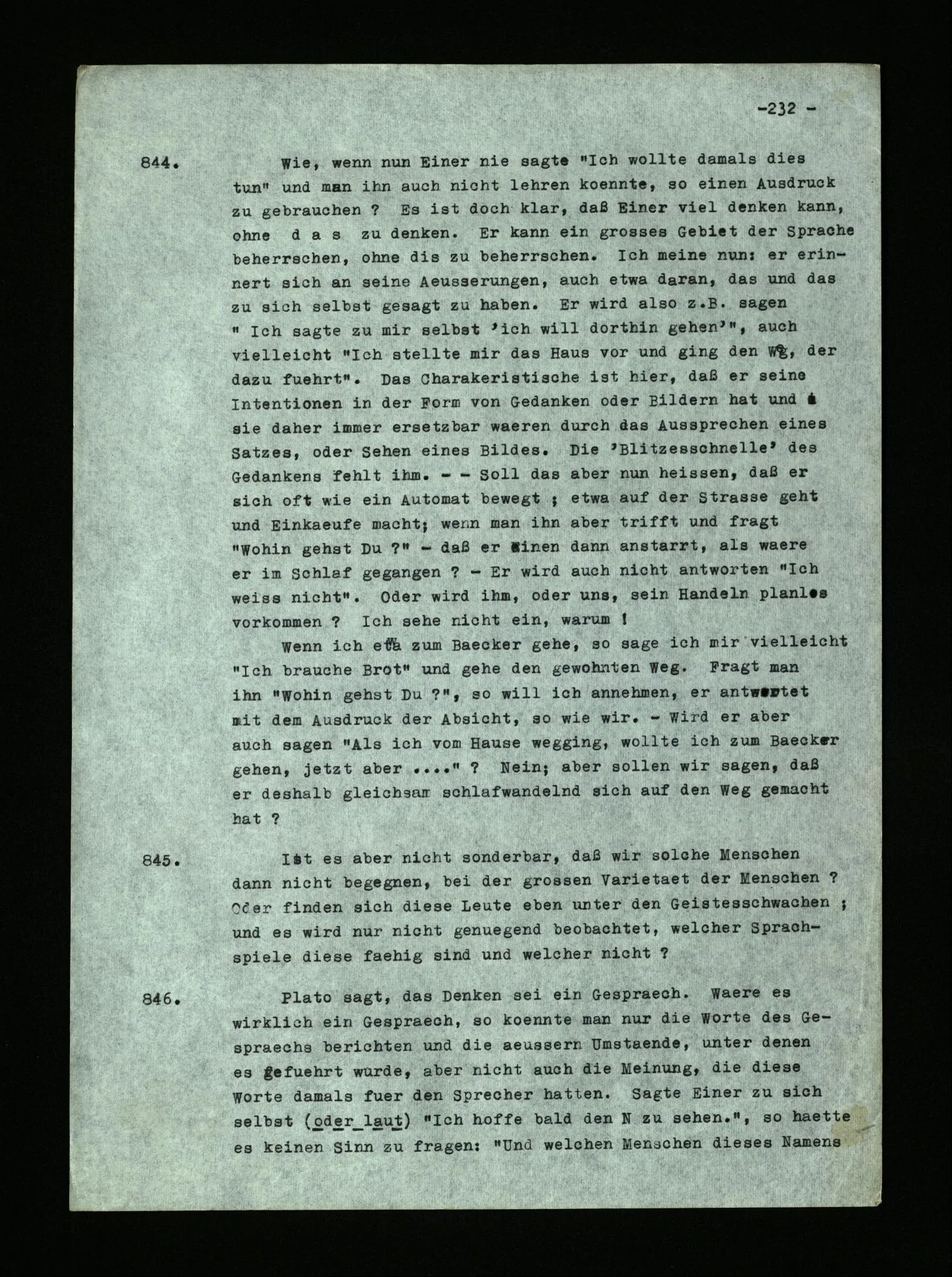 1803. Ist es aber nicht sonderbar, daß es so eine Reaktion so ein Geständnis der Intention gibt? Ist es nicht ein höchst merkwürdiges Sprachinstrument? Was ist eigentlich merkwürdig daran? Nun, – es ist schwer vorstellbar, wie der Mensch diesen Wortgebrauch lernt. Er ist gar so subtil.