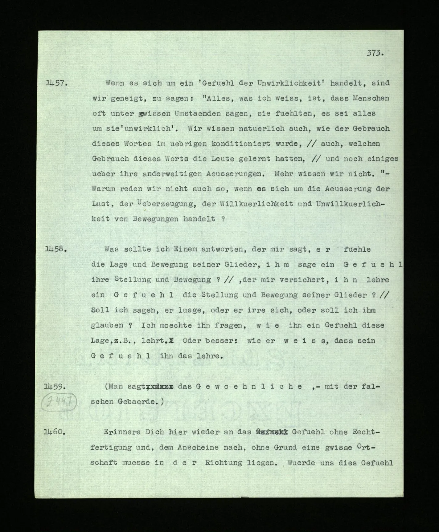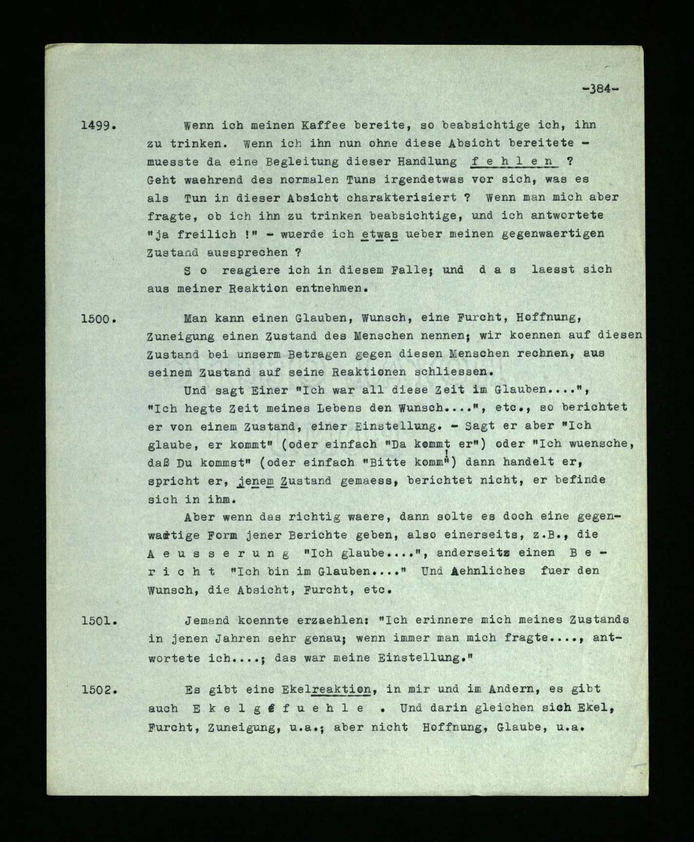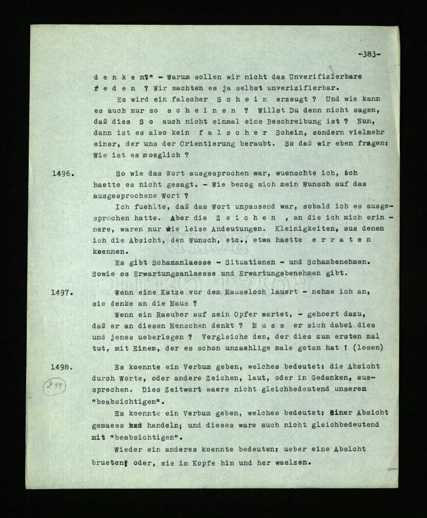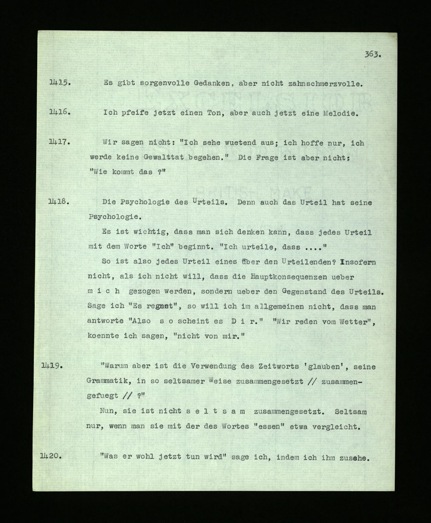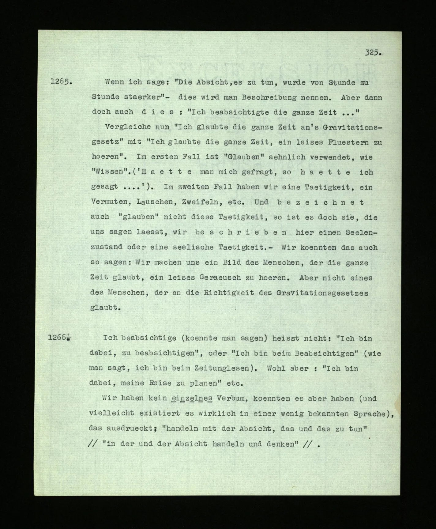 1803. Ist es aber nicht sonderbar, daß es so eine Reaktion so ein Geständnis der Intention gibt? Ist es nicht ein höchst merkwürdiges Sprachinstrument? Was ist eigentlich merkwürdig daran? Nun, – es ist schwer vorstellbar, wie der Mensch diesen Wortgebrauch lernt. Er ist gar so subtil.