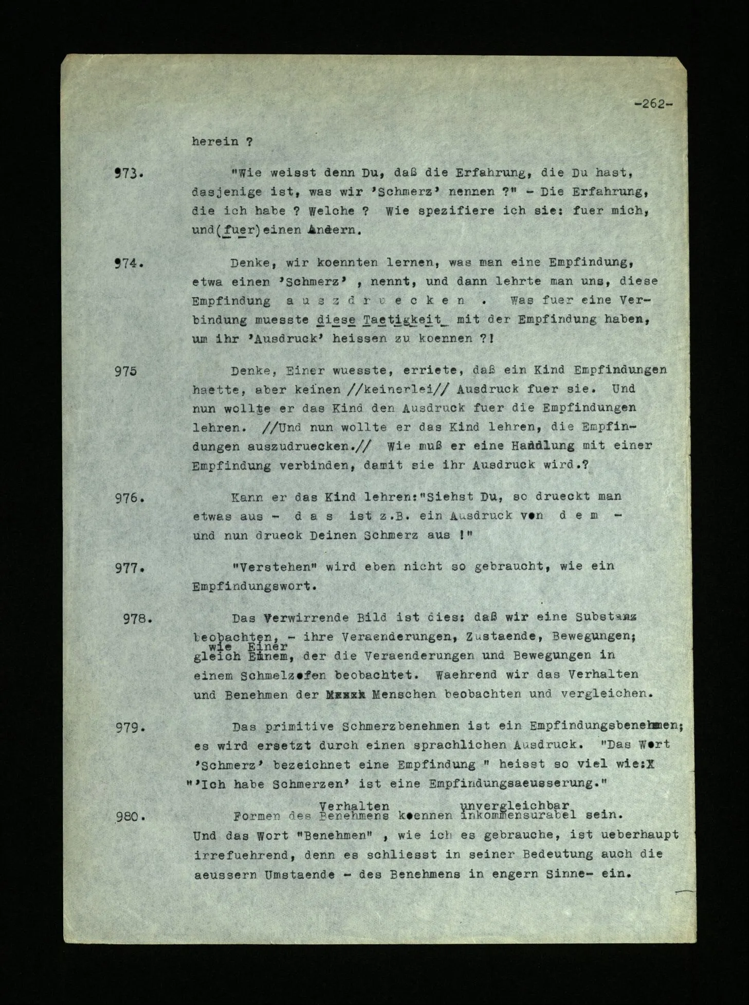 1800. Du mußt mit der Vorstellung Ernst machen, daß es ja wirklich in einer Sprache ein Wort geben könnte, welches Schmerzbenehmen, und nicht Schmerz, bezeichnet.