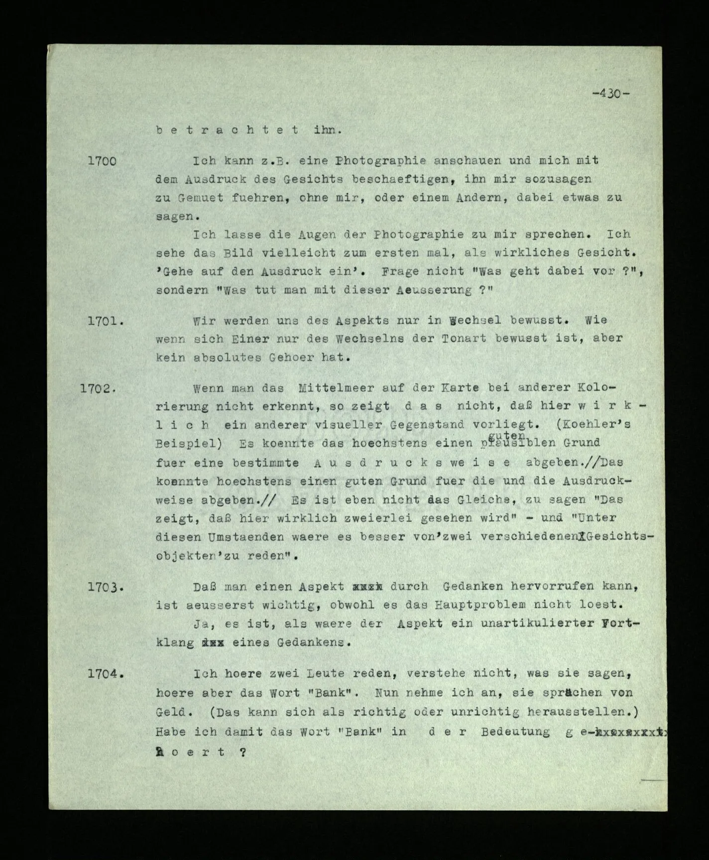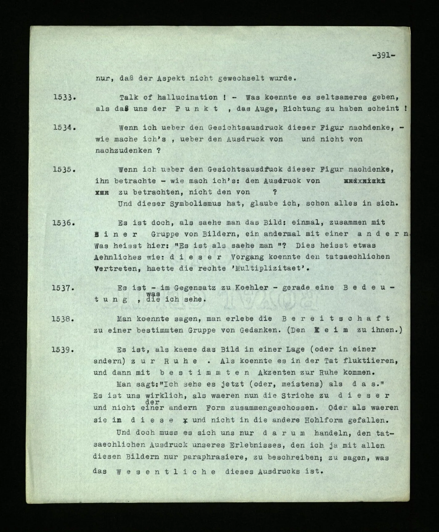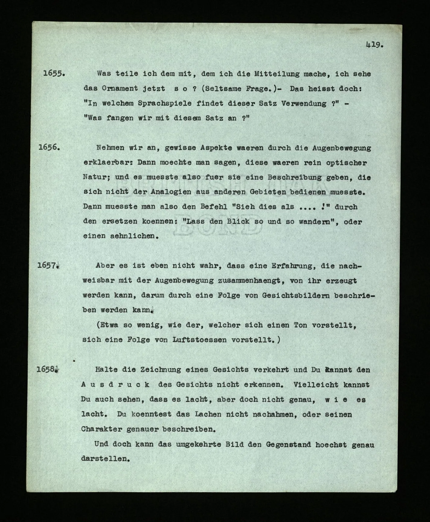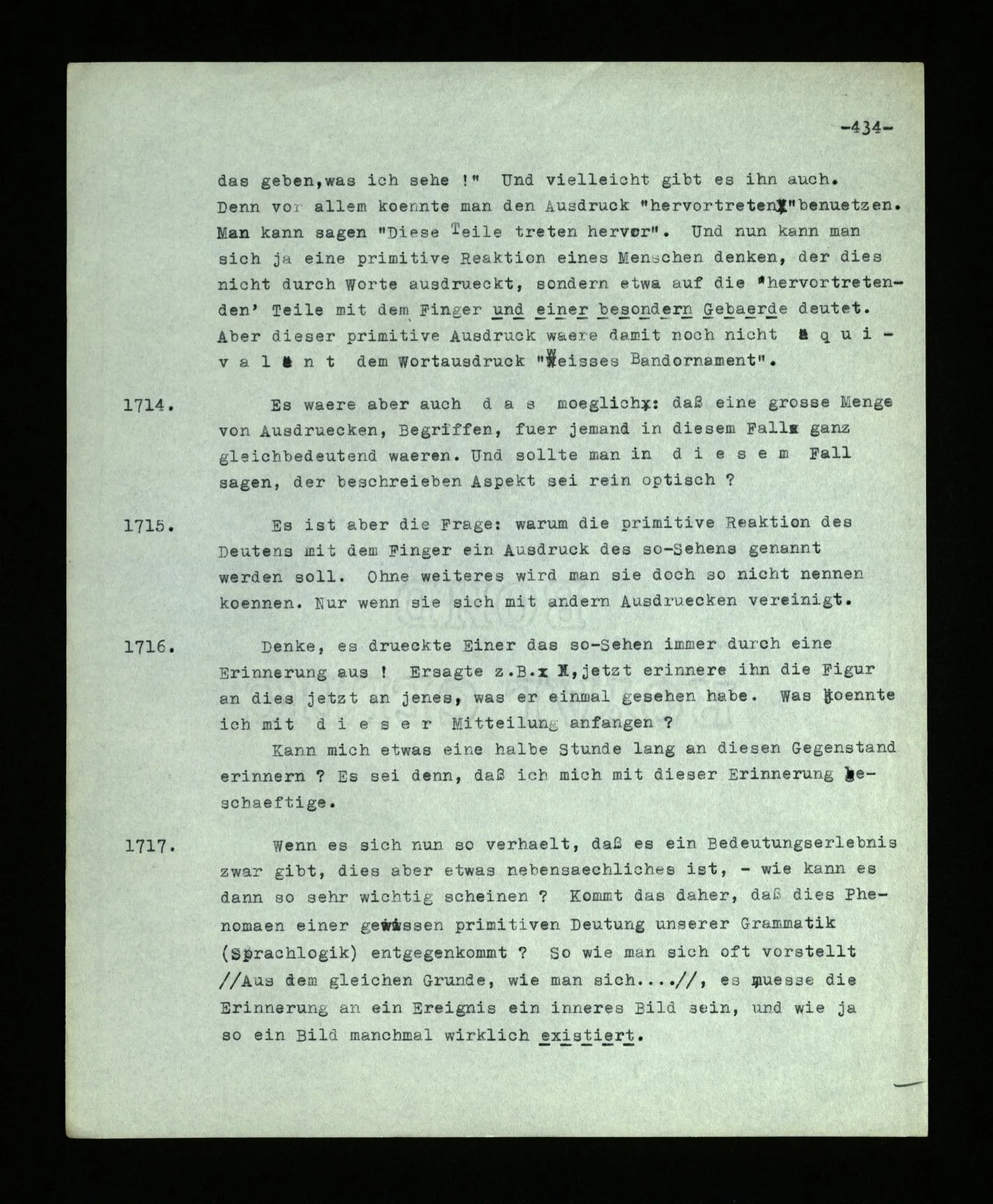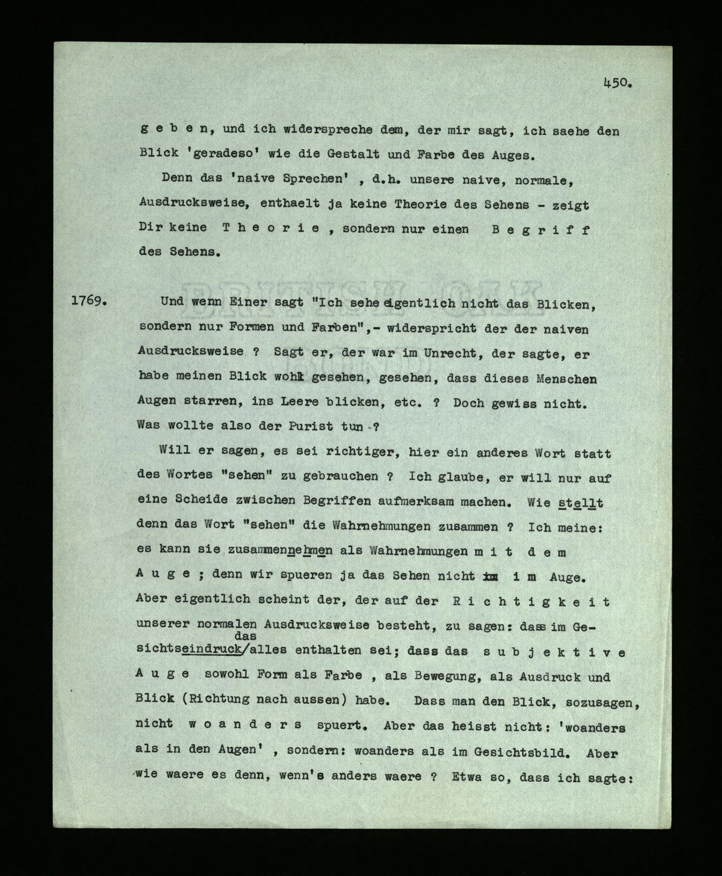 1769. Und wenn Einer sagt “Ich sehe eigentlich nicht das Blicken, sondern nur Formen und Farben”, – widerspricht der der naiven Ausdrucksweise? Sagt er, der war im Unrecht, der sagte, er habe meinen Blick wohl gesehen, gesehen, daß dieses Menschen Augen starren, ins Leere blicken, etc.? Doch gewiß nicht. Was wollte also der Purist tun? Will er sagen, es sei richtiger, hier ein anderes Wort statt des Wortes “sehen” zu gebrauchen? Ich glaube, er will nur auf eine Scheide zwischen Begriffen aufmerksam machen. Wie stellt denn das Wort “sehen” die Wahrnehmungen zusammen? Ich meine: es kann sie zusammennehmen als Wahrnehmungen mit dem Auge; denn wir spüren ja das Sehen nicht im Auge. Aber eigentlich scheint der, der auf der Richtigkeit unserer normalen Ausdrucksweise besteht, zu sagen: daß im Gesichtseindruck das alles enthalten sei; daß das subjektive Auge sowohl Form als Farbe, als Bewegung, als Ausdruck und Blick (Richtung nach außen) habe. Daß man den Blick, sozusagen, nicht woanders spürt. Aber das heißt nicht: ‘woanders als in den Augen’, sondern: woanders als im Gesichtsbild. Aber wie wäre es denn, wenn’s anders wäre? Etwa so, daß ich sagte: “Ich sehe in diesem Auge die und die Formen, Farben, Bewegungen, – das heißt, es blickt jetzt freundlich”, als zöge ich also einen Schluß. – Man könnte also sagen: Der Ort des wahrgenommenen Blickes ist das subjektive Auge, das Gesichtsbild des Auges, selber.