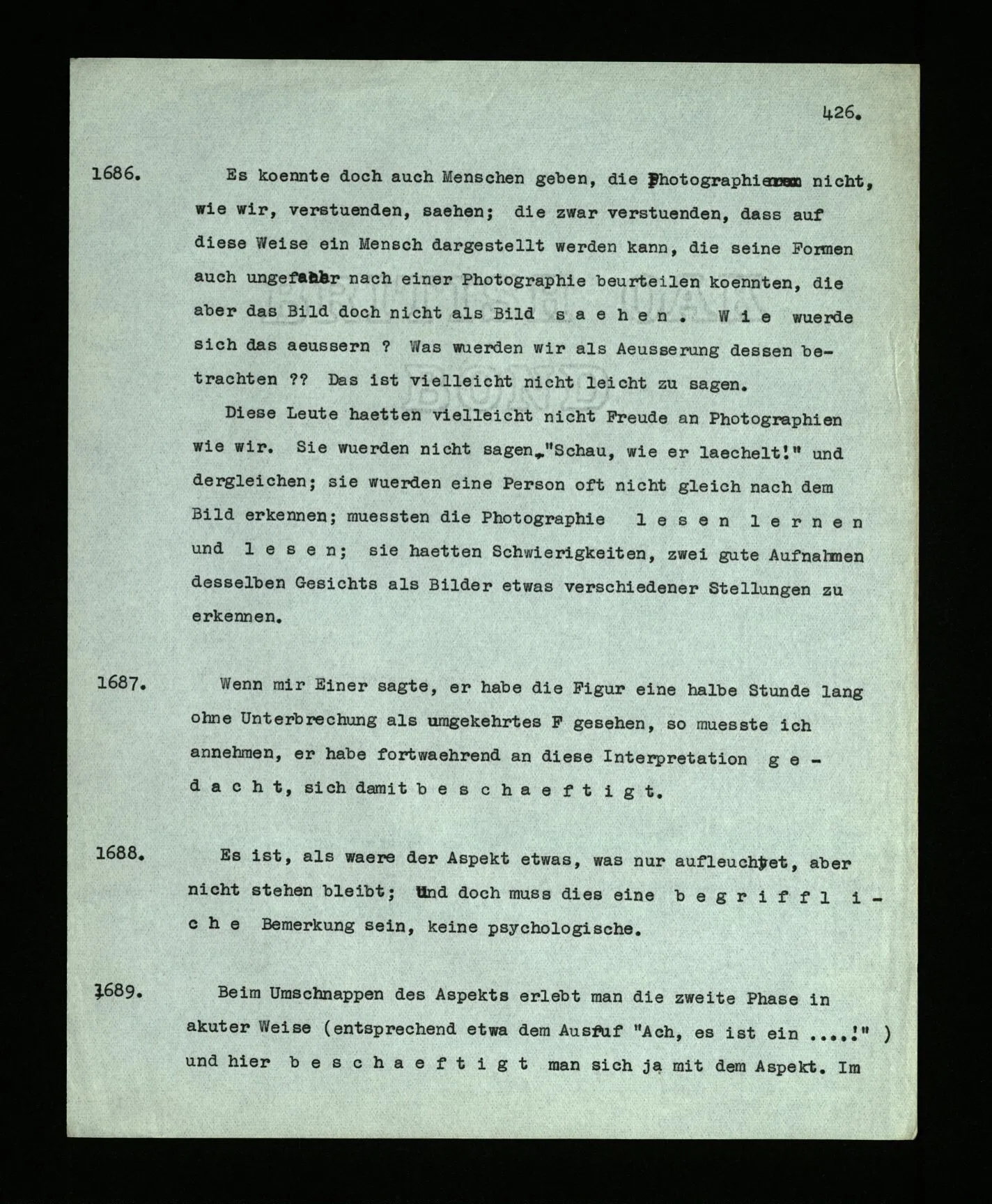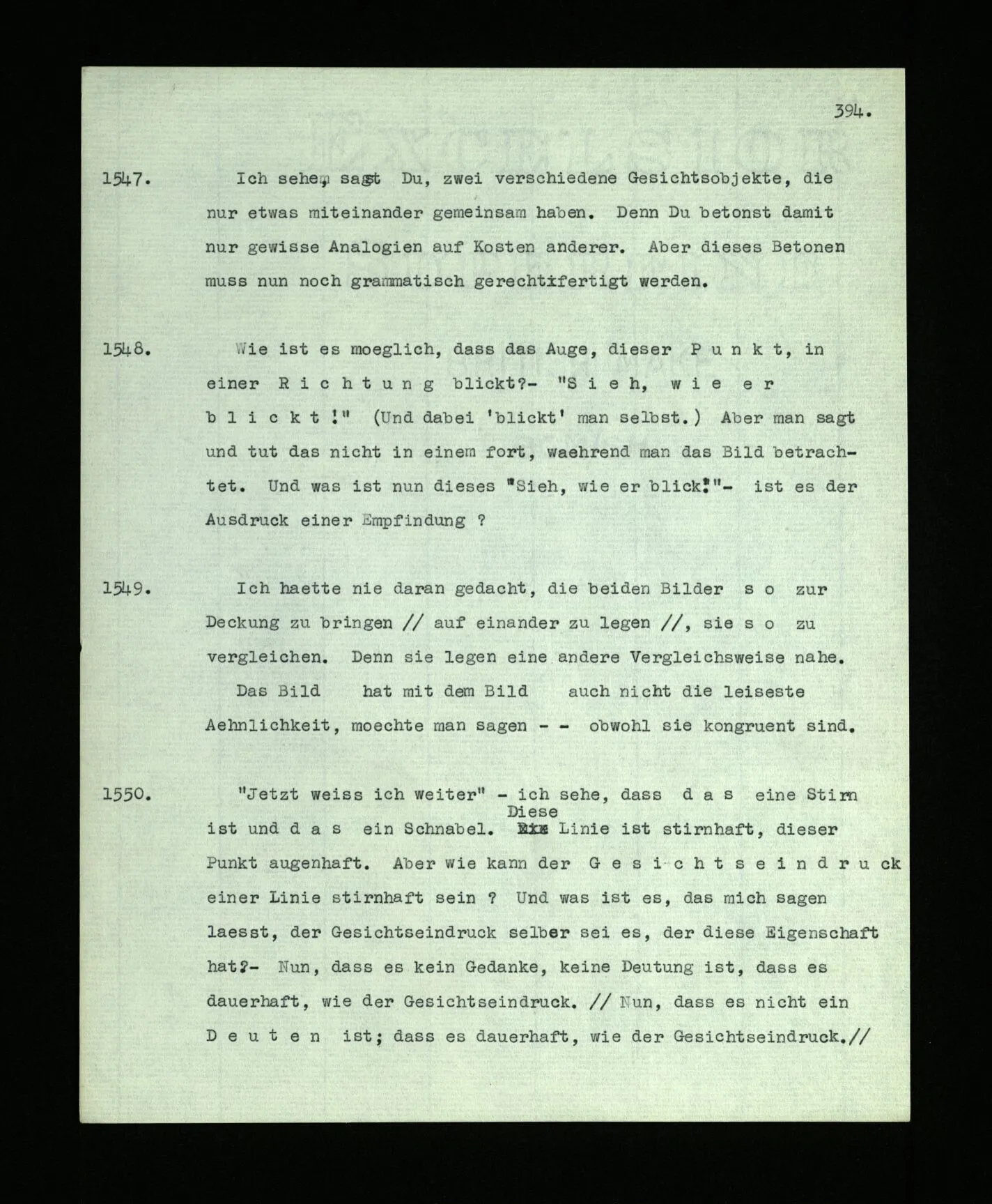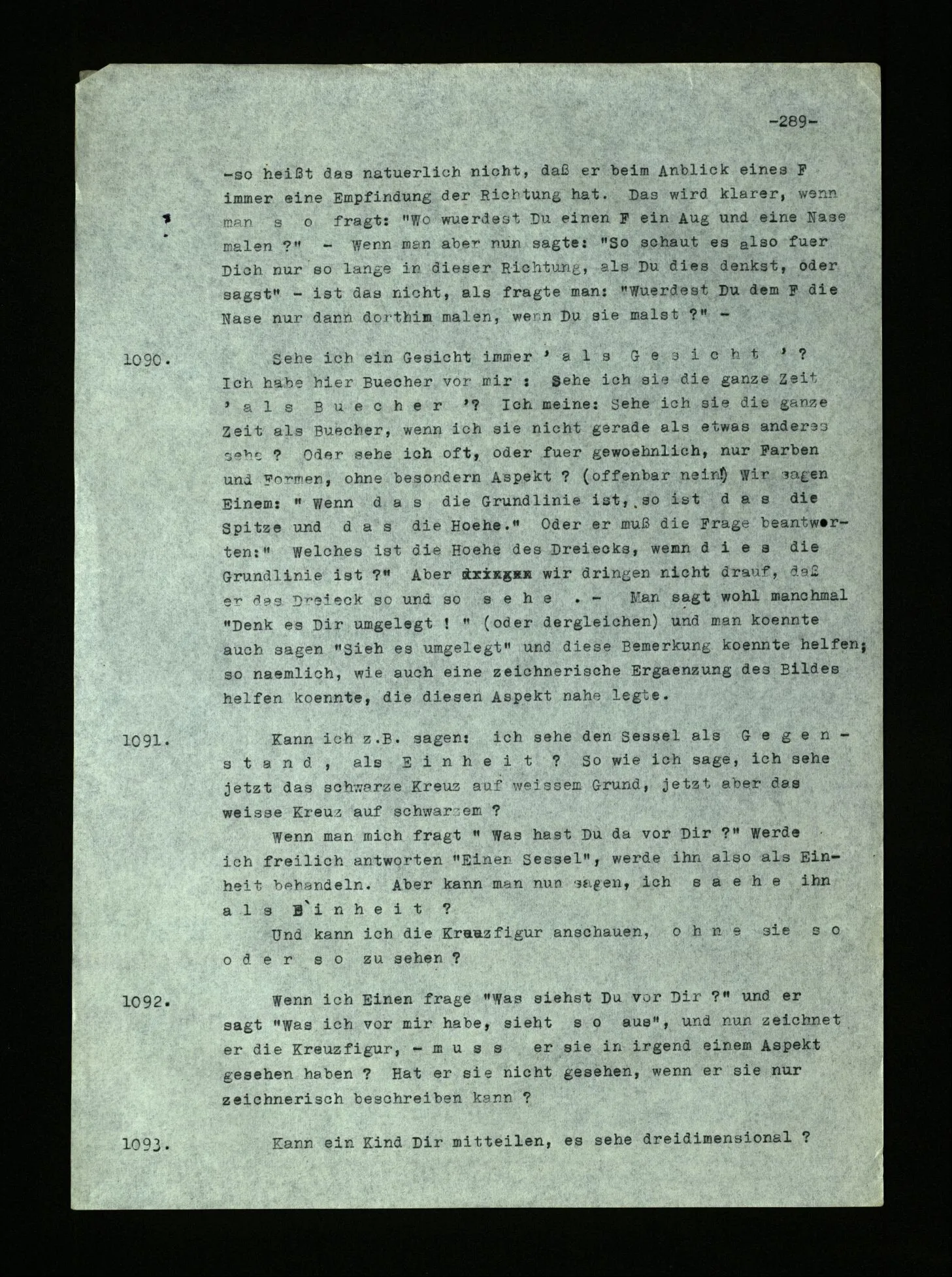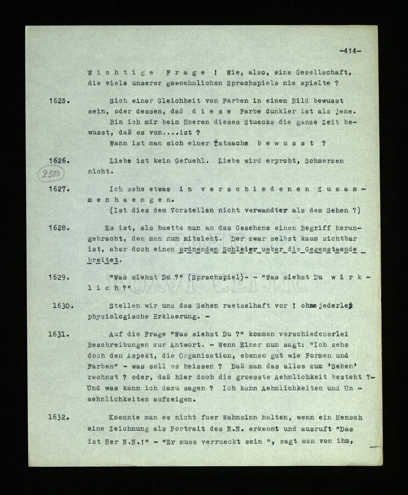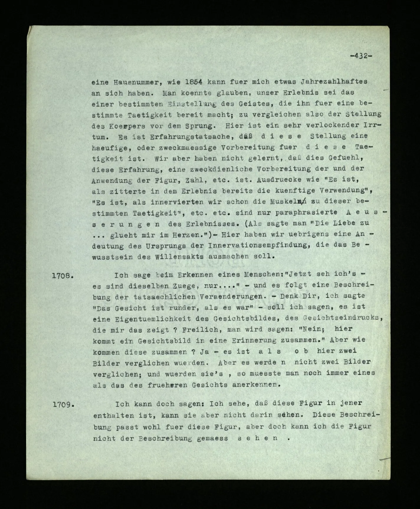 1769. Und wenn Einer sagt “Ich sehe eigentlich nicht das Blicken, sondern nur Formen und Farben”, – widerspricht der der naiven Ausdrucksweise? Sagt er, der war im Unrecht, der sagte, er habe meinen Blick wohl gesehen, gesehen, daß dieses Menschen Augen starren, ins Leere blicken, etc.? Doch gewiß nicht. Was wollte also der Purist tun? Will er sagen, es sei richtiger, hier ein anderes Wort statt des Wortes “sehen” zu gebrauchen? Ich glaube, er will nur auf eine Scheide zwischen Begriffen aufmerksam machen. Wie stellt denn das Wort “sehen” die Wahrnehmungen zusammen? Ich meine: es kann sie zusammennehmen als Wahrnehmungen mit dem Auge; denn wir spüren ja das Sehen nicht im Auge. Aber eigentlich scheint der, der auf der Richtigkeit unserer normalen Ausdrucksweise besteht, zu sagen: daß im Gesichtseindruck das alles enthalten sei; daß das subjektive Auge sowohl Form als Farbe, als Bewegung, als Ausdruck und Blick (Richtung nach außen) habe. Daß man den Blick, sozusagen, nicht woanders spürt. Aber das heißt nicht: ‘woanders als in den Augen’, sondern: woanders als im Gesichtsbild. Aber wie wäre es denn, wenn’s anders wäre? Etwa so, daß ich sagte: “Ich sehe in diesem Auge die und die Formen, Farben, Bewegungen, – das heißt, es blickt jetzt freundlich”, als zöge ich also einen Schluß. – Man könnte also sagen: Der Ort des wahrgenommenen Blickes ist das subjektive Auge, das Gesichtsbild des Auges, selber.