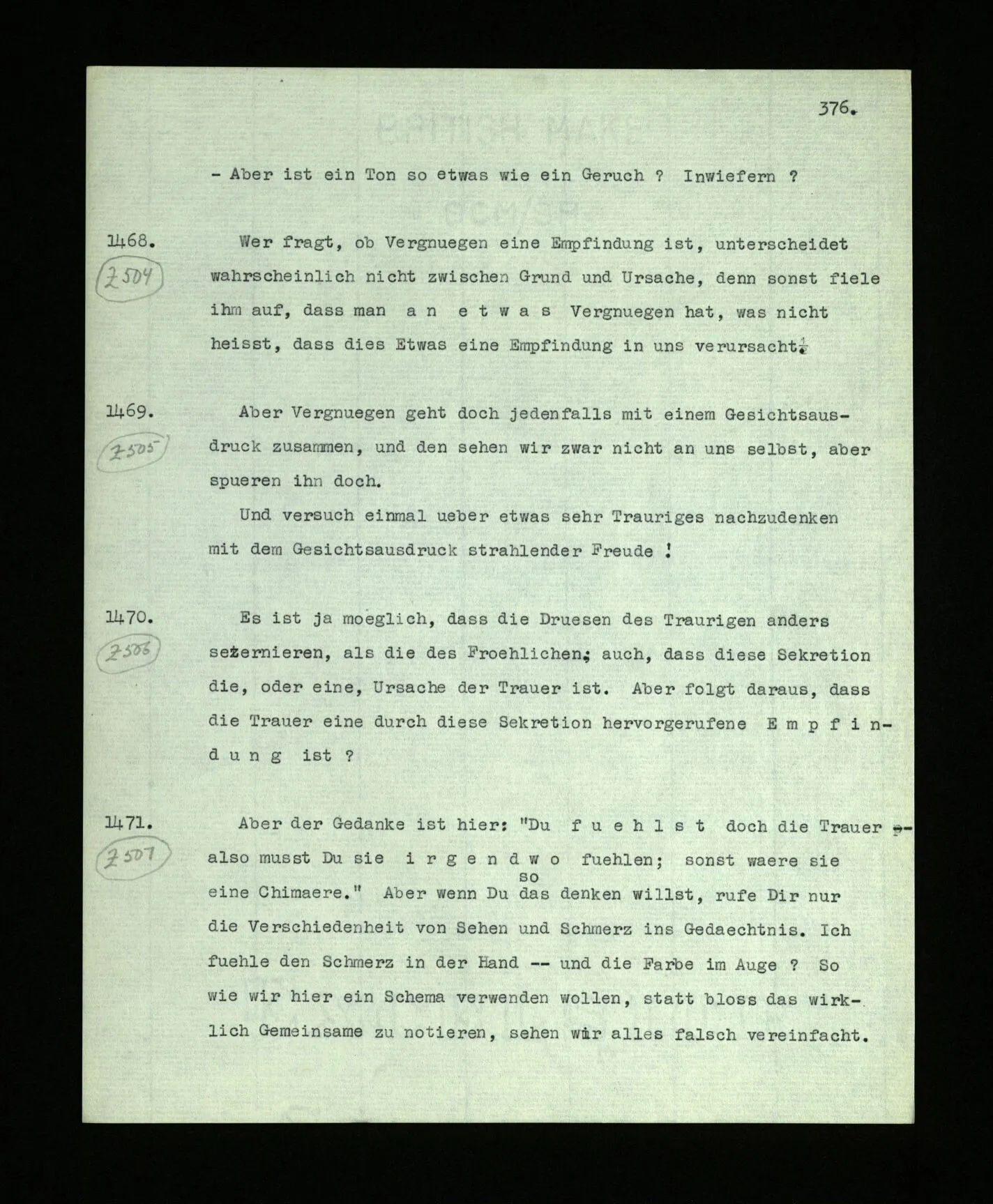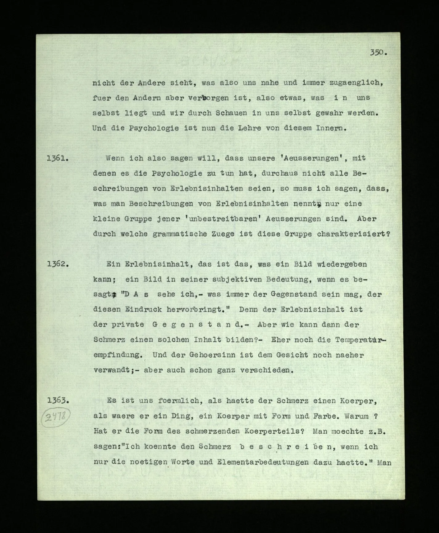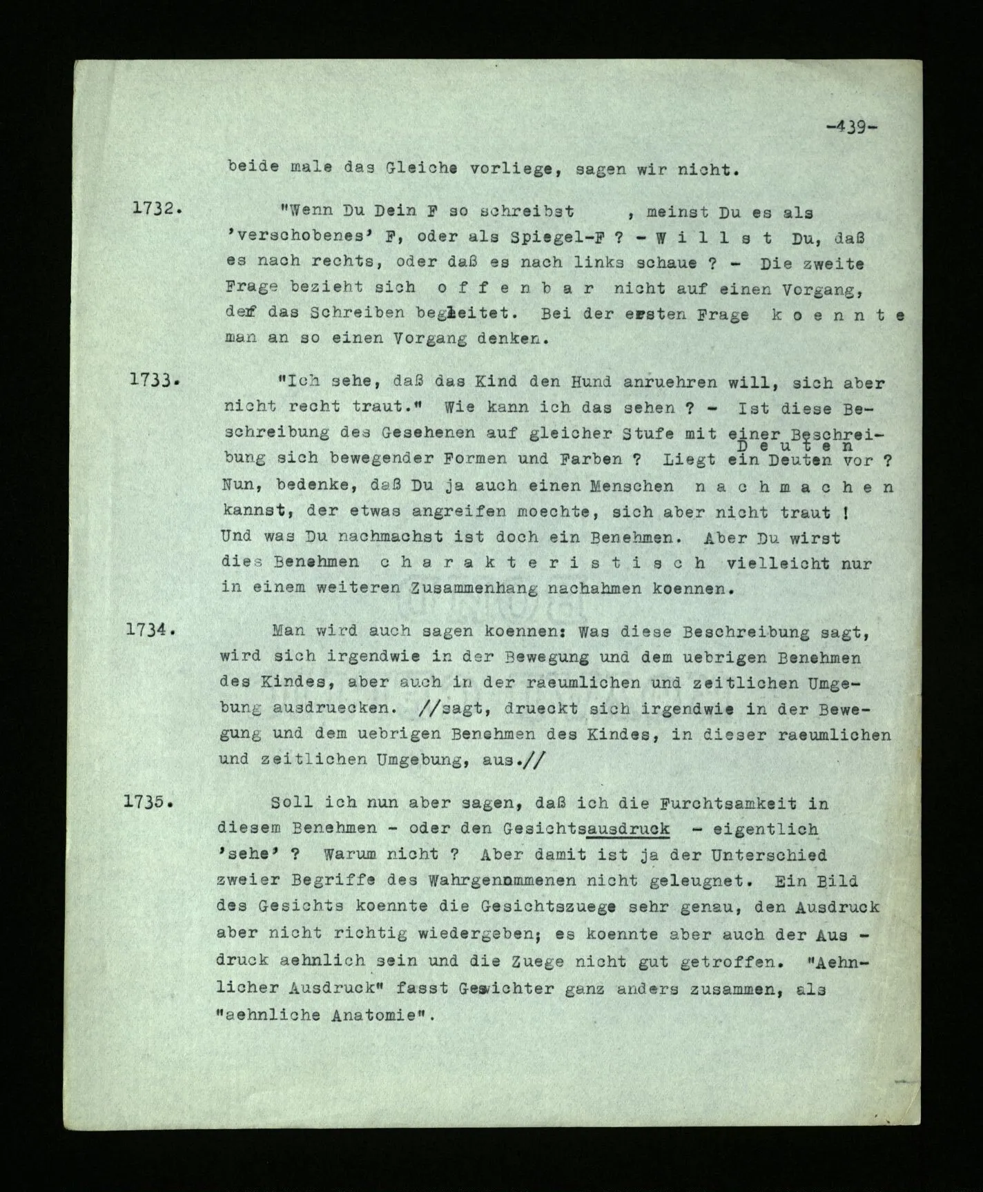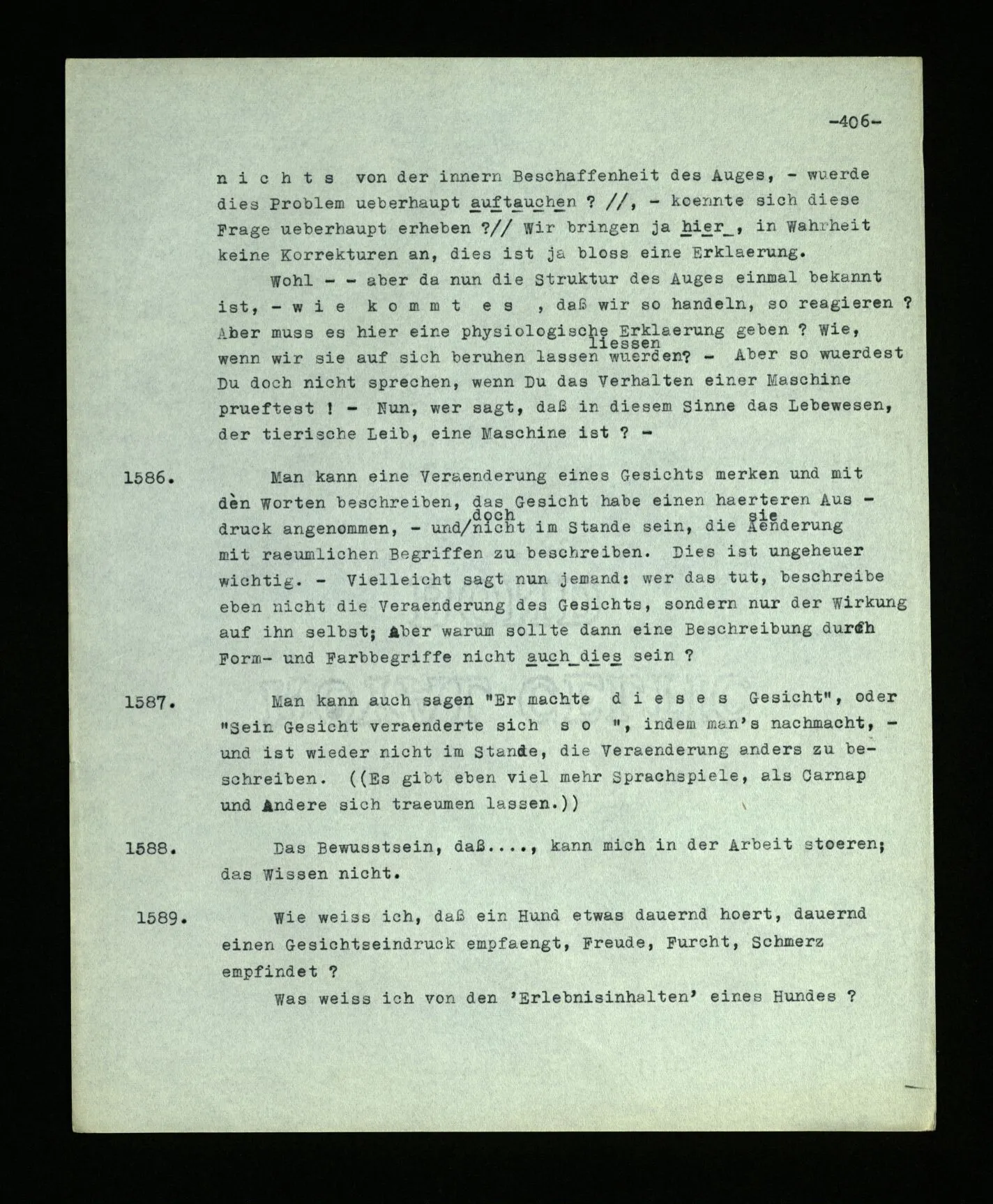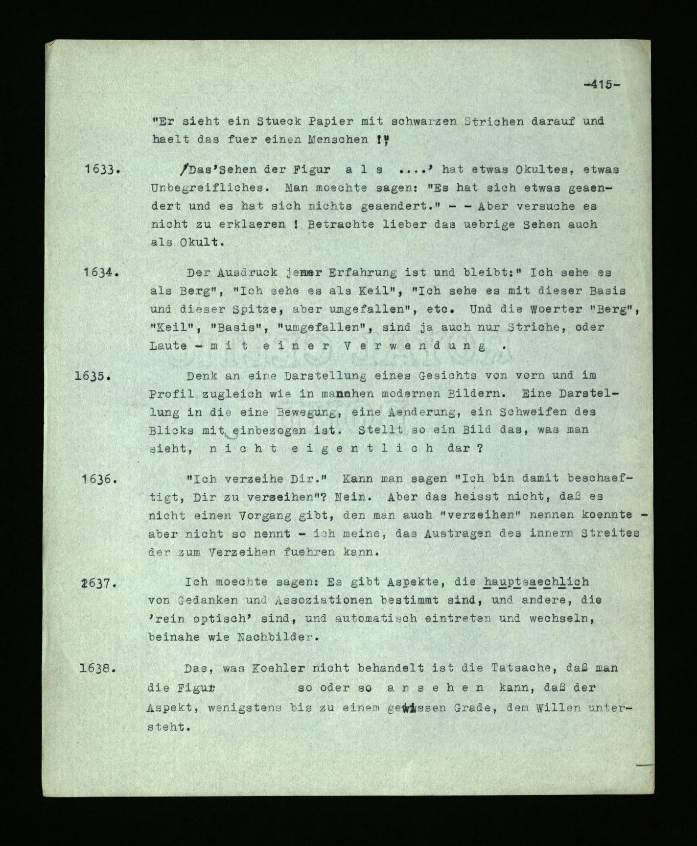1769. Und wenn Einer sagt “Ich sehe eigentlich nicht das Blicken, sondern nur Formen und Farben”, – widerspricht der der naiven Ausdrucksweise? Sagt er, der war im Unrecht, der sagte, er habe meinen Blick wohl gesehen, gesehen, daß dieses Menschen Augen starren, ins Leere blicken, etc.? Doch gewiß nicht. Was wollte also der Purist tun? Will er sagen, es sei richtiger, hier ein anderes Wort statt des Wortes “sehen” zu gebrauchen? Ich glaube, er will nur auf eine Scheide zwischen Begriffen aufmerksam machen. Wie stellt denn das Wort “sehen” die Wahrnehmungen zusammen? Ich meine: es kann sie zusammennehmen als Wahrnehmungen mit dem Auge; denn wir spüren ja das Sehen nicht im Auge. Aber eigentlich scheint der, der auf der Richtigkeit unserer normalen Ausdrucksweise besteht, zu sagen: daß im Gesichtseindruck das alles enthalten sei; daß das subjektive Auge sowohl Form als Farbe, als Bewegung, als Ausdruck und Blick (Richtung nach außen) habe. Daß man den Blick, sozusagen, nicht woanders spürt. Aber das heißt nicht: ‘woanders als in den Augen’, sondern: woanders als im Gesichtsbild. Aber wie wäre es denn, wenn’s anders wäre? Etwa so, daß ich sagte: “Ich sehe in diesem Auge die und die Formen, Farben, Bewegungen, – das heißt, es blickt jetzt freundlich”, als zöge ich also einen Schluß. – Man könnte also sagen: Der Ort des wahrgenommenen Blickes ist das subjektive Auge, das Gesichtsbild des Auges, selber.