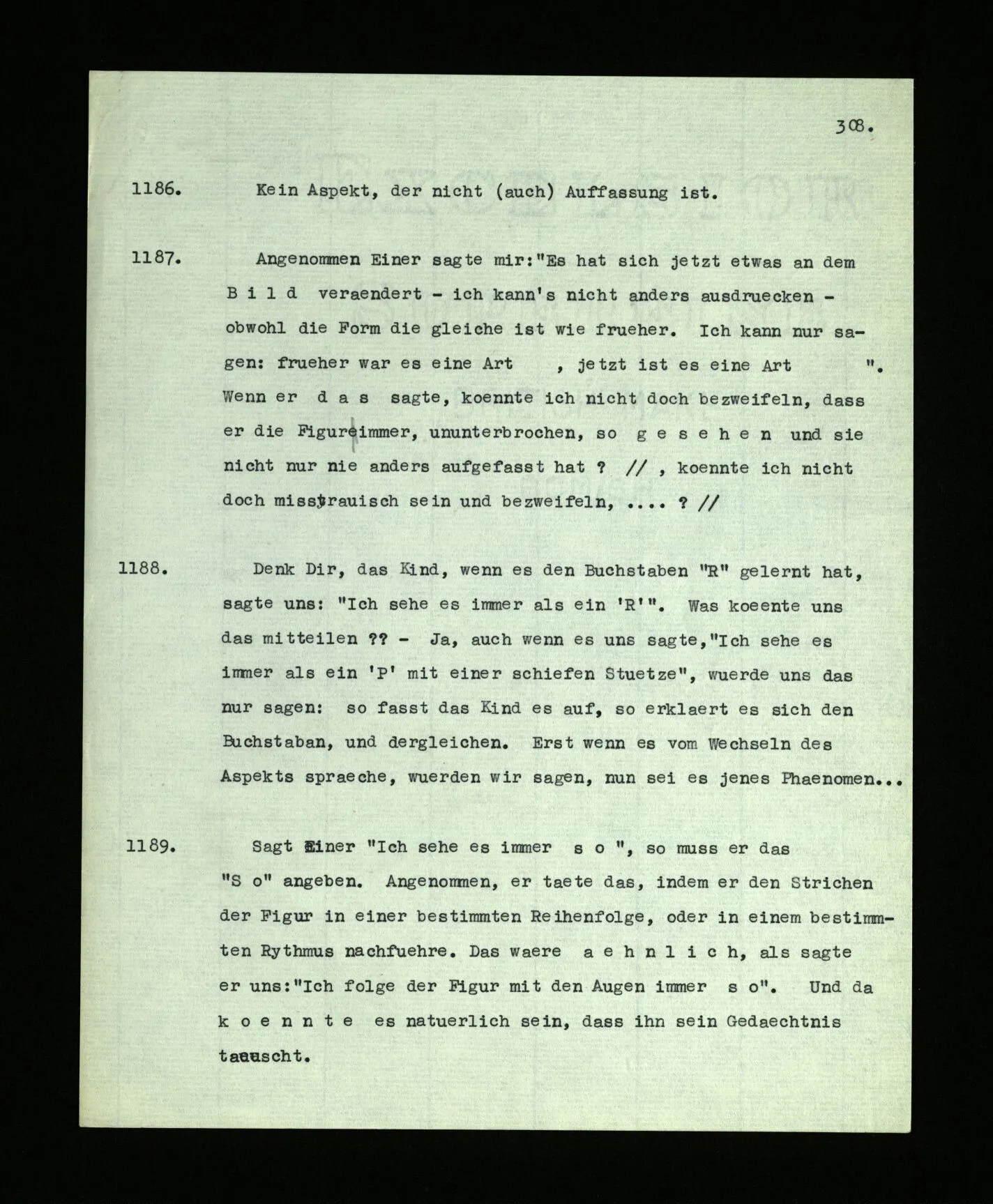 1793. Es ist vielleicht wichtig, zu bedenken, daß ich eine Figur heute so sehen, auffassen, kann, morgen anders, und kein ‘Umschnappen’ stattgefunden haben muß. Ich könnte z.B. eine Illustration in einem Buch heute so auffassen und gebrauchen, morgen der gleichen Illustration auf einer späteren Seite begegnen wo sie anders aufzufassen ist, ohne daß ich merke, daß es wieder die gleiche Figur ist.
