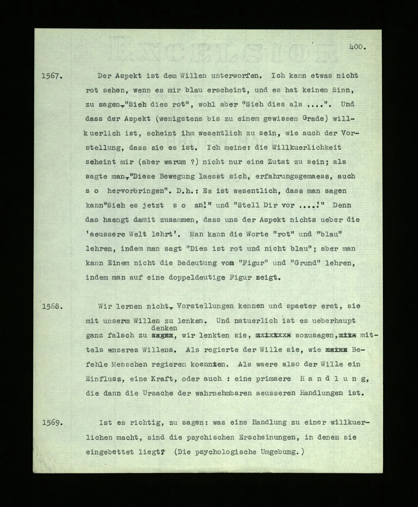 1778. Wie sieht die Beschreibung einer ‘Einstellung’ aus? Man sagt z.B.: “Sieh von diesen Flecken ab und auch von dieser kleinen Unregelmäßigkeit, und schau es als Bild eines ‥‥ an!” “Denk Dir das weg! Wär’s Dir auch ohne dieses ‥‥ unangenehm?” Man wird doch sagen, ich ändere mein Gesichtsbild – wie durch Blinzeln, oder Weghalten eines Details. Dieses “Absehen von …” spielt doch eine ganz ähnliche Rolle, wie etwa die Anfertigung eines neuen Bildes.