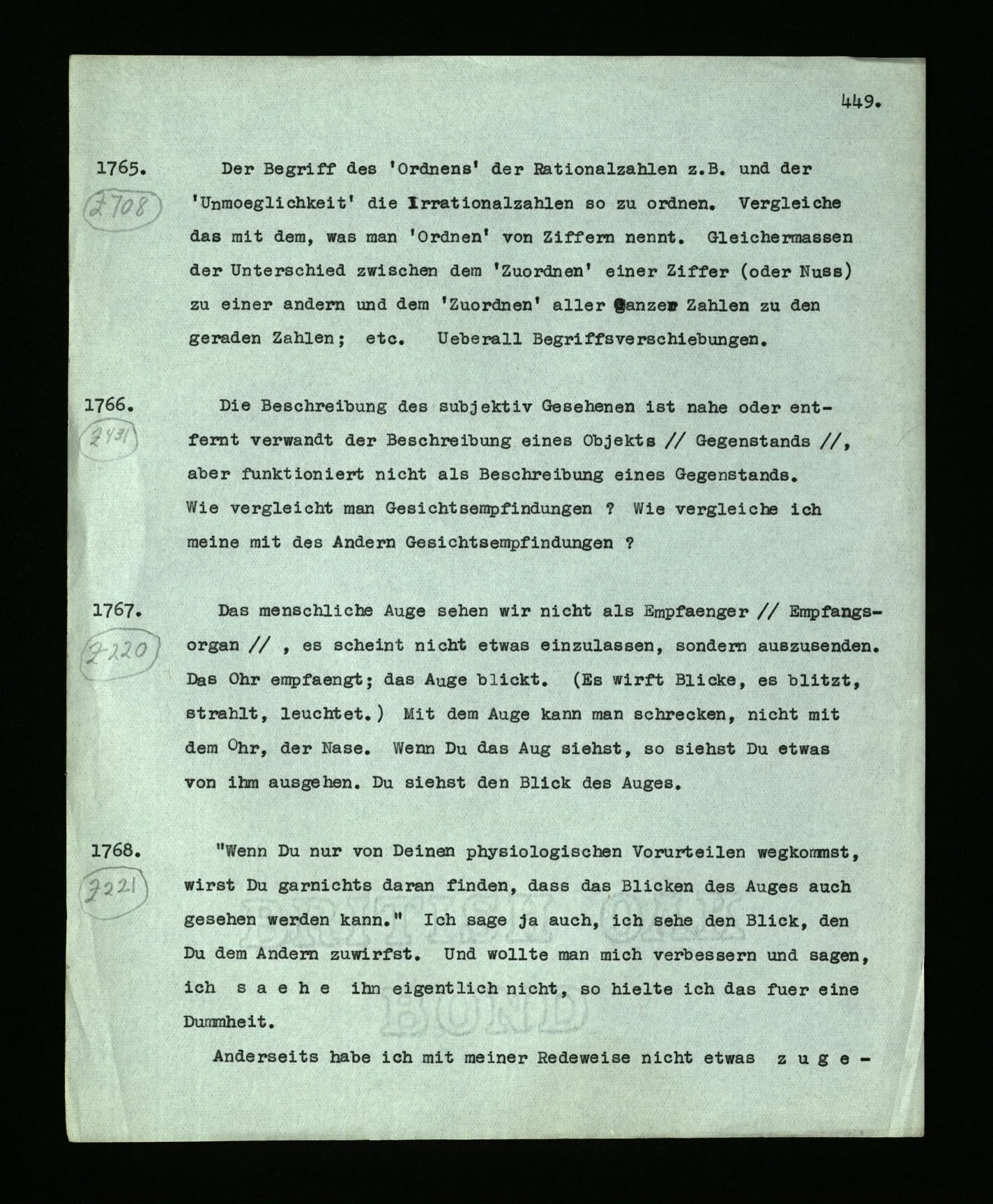 1765. Der Begriff des ‘Ordnens’ der Rationalzahlen z.B. und der ‘Unmöglichkeit’ die Irrationalzahlen so zu ordnen. Vergleiche das mit dem, was man ‘Ordnen’ von Ziffern nennt. Gleichermaßen der Unterschied zwischen dem ‘Zuordnen’ einer Ziffer (oder Nuss) zu einer andern und dem ‘Zuordnen’ aller ganzer Zahlen zu den geraden Zahlen; etc. Überall Begriffsverschiebungen.