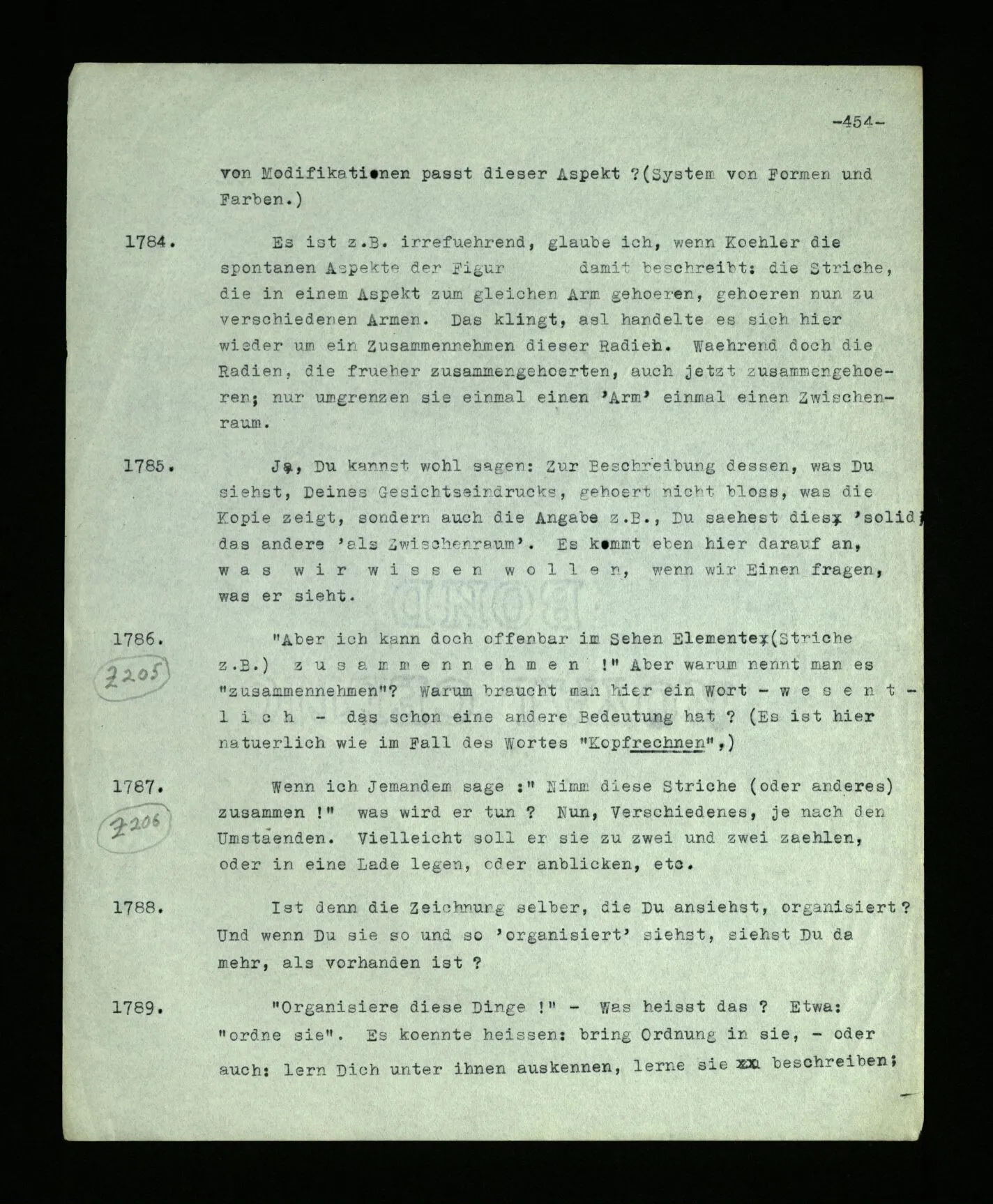 1786. “Aber ich kann doch offenbar im Sehen Elemente (Striche z.B.) zusammennehmen!” Aber warum nennt man es “zusammennehmen”? Warum braucht man hier ein Wort – wesentlich – das schon eine andere Bedeutung hat? (Es ist hier natürlich wie im Fall des Wortes “Kopfrechnen”.)