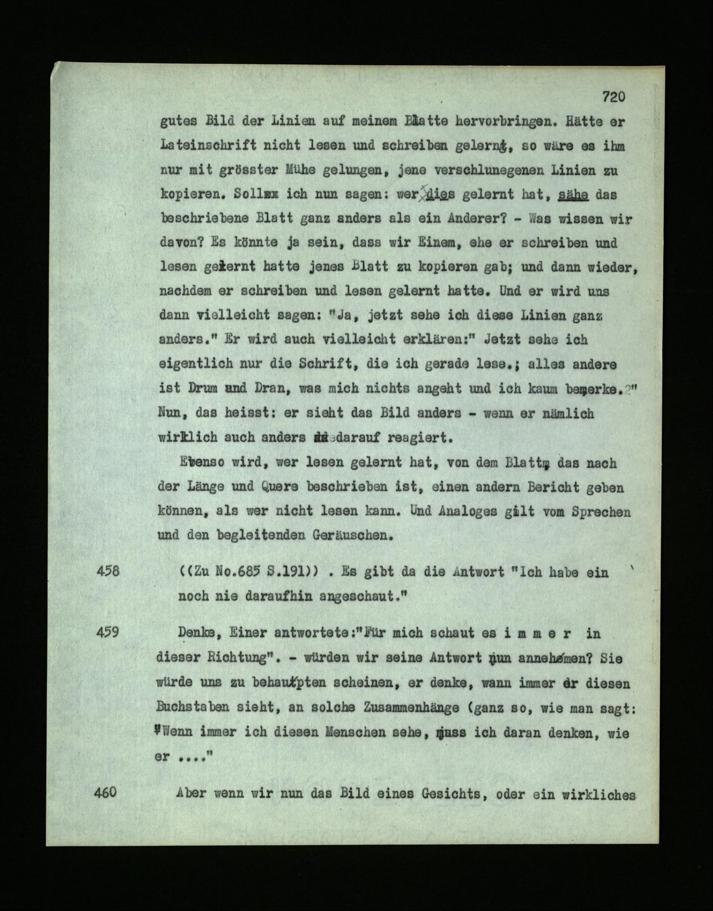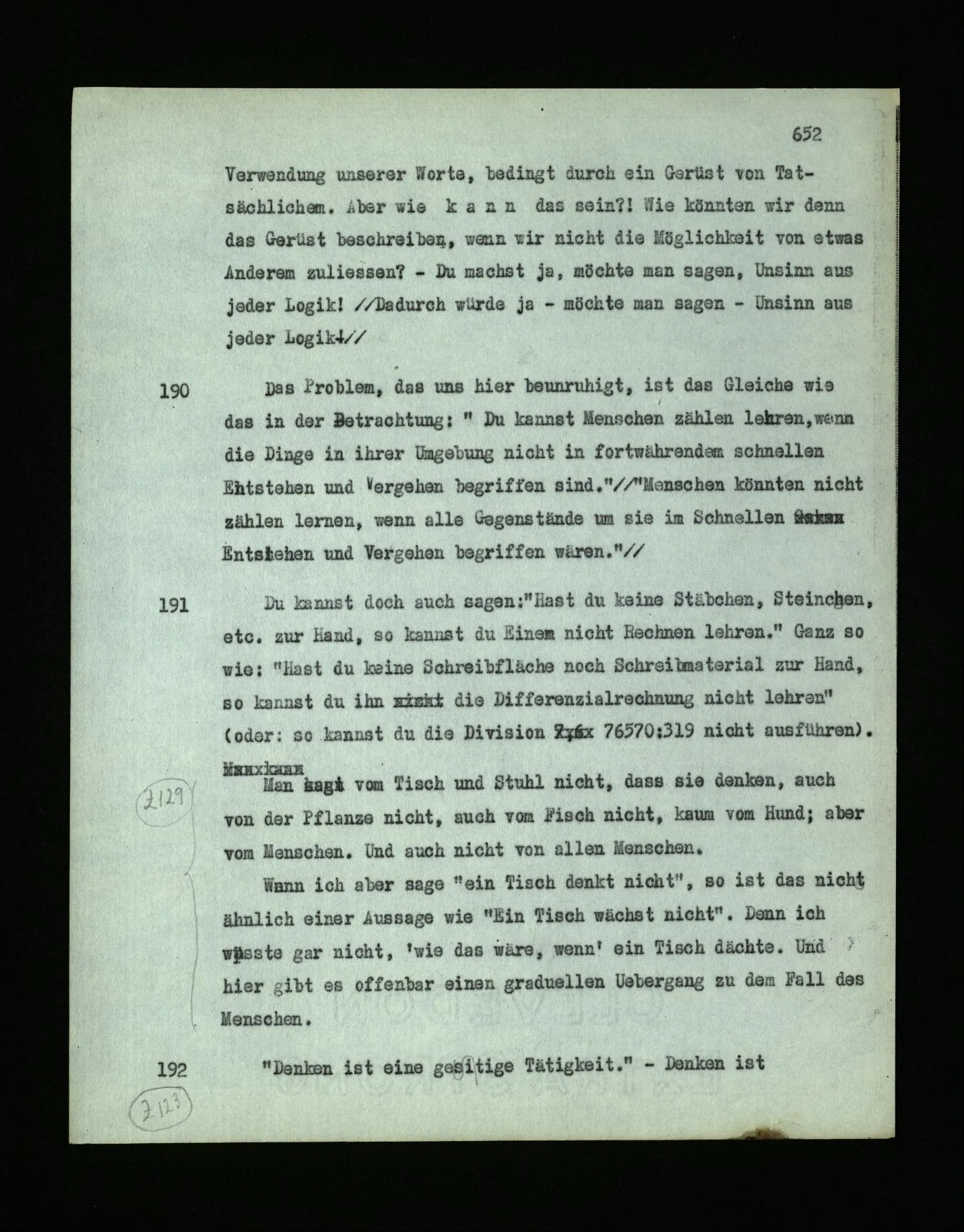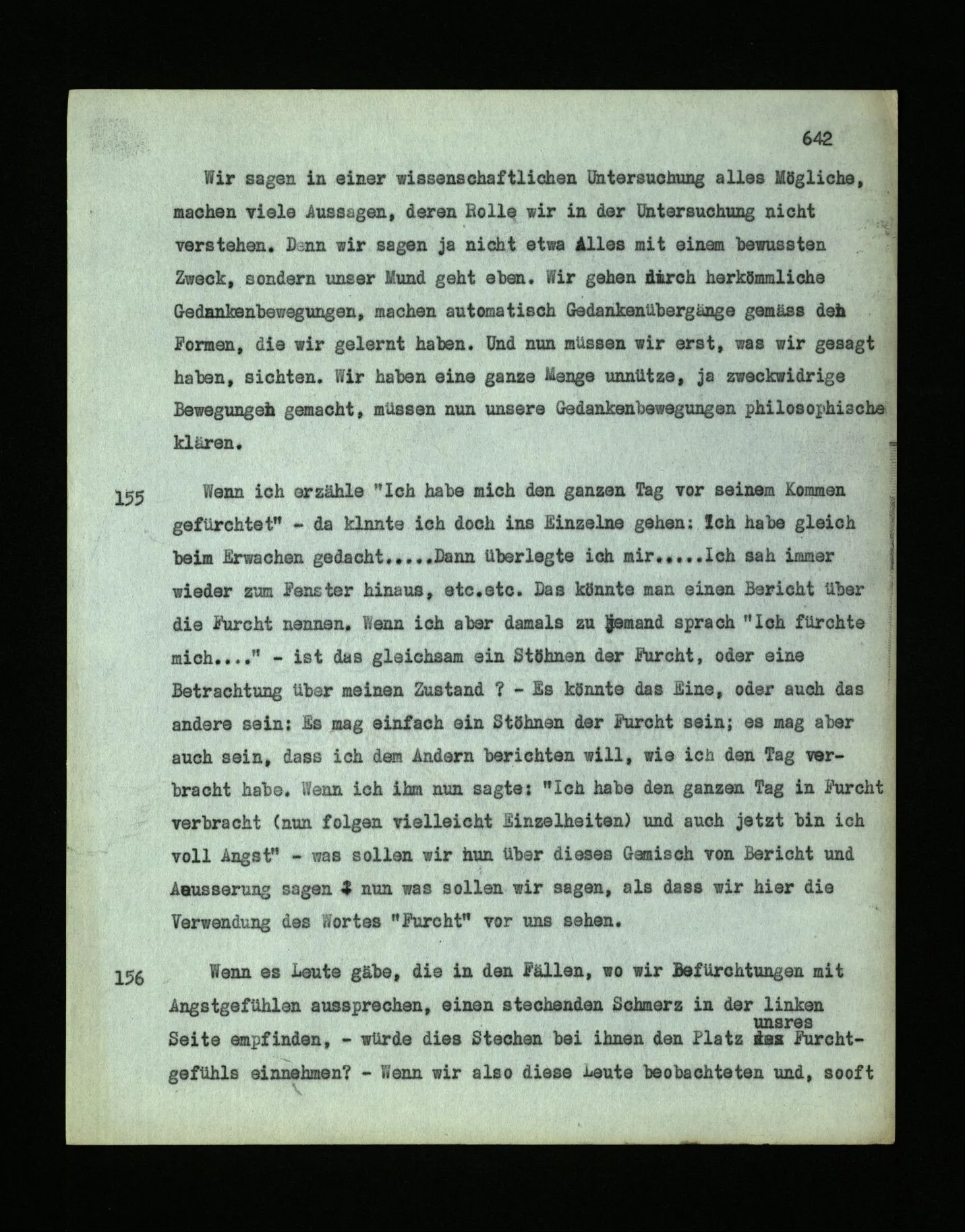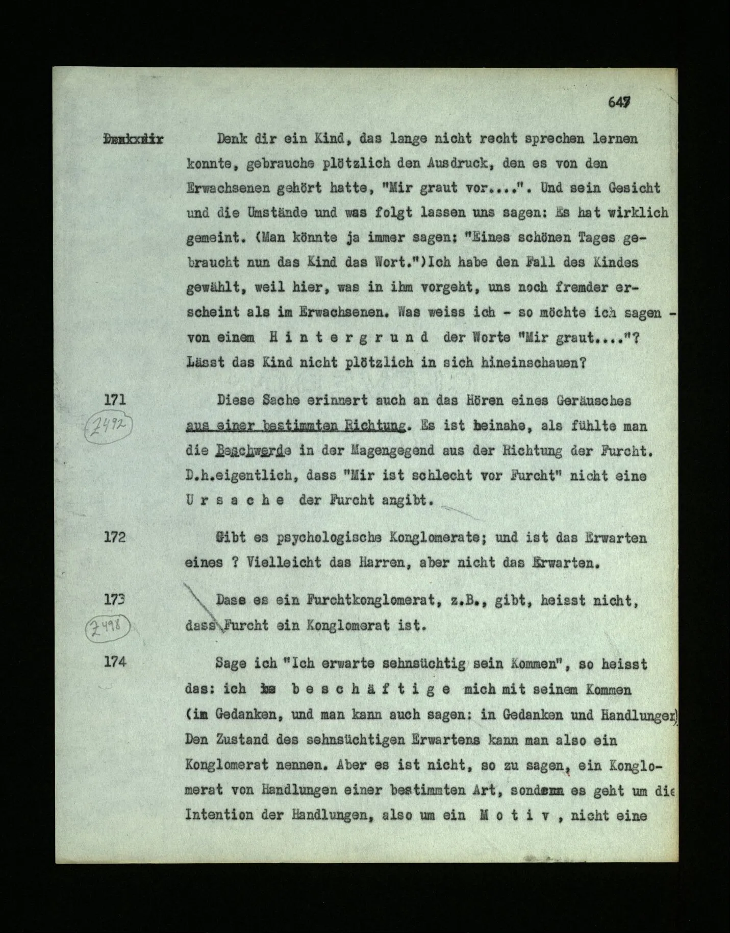 033 Sieh es einmal rein behaviouristisch an: Jemand sagt: Der Mensch denkt, wünscht, freut sich, ist zornig, etc. Denk, es sei hier nur von gewissen Formen des Verhaltens bei gewiß Anlässen die Rede. Man könnte sich vorstellen, wer so vom Menschen redet, habe diese Verhaltungsweisen zuerst bei andern Wesen beobachtet und sage nun, beim Menschen ließen sich diese Erscheinungen auch beobachten. Das wäre also, wie wenn wir dies von einer Tierart sagten. – – –