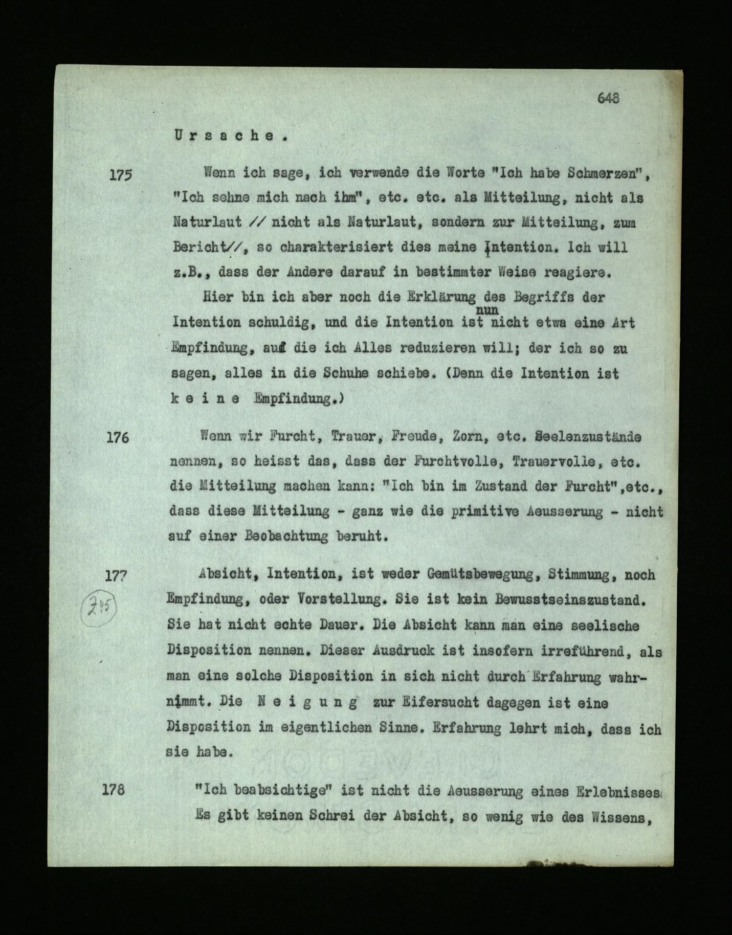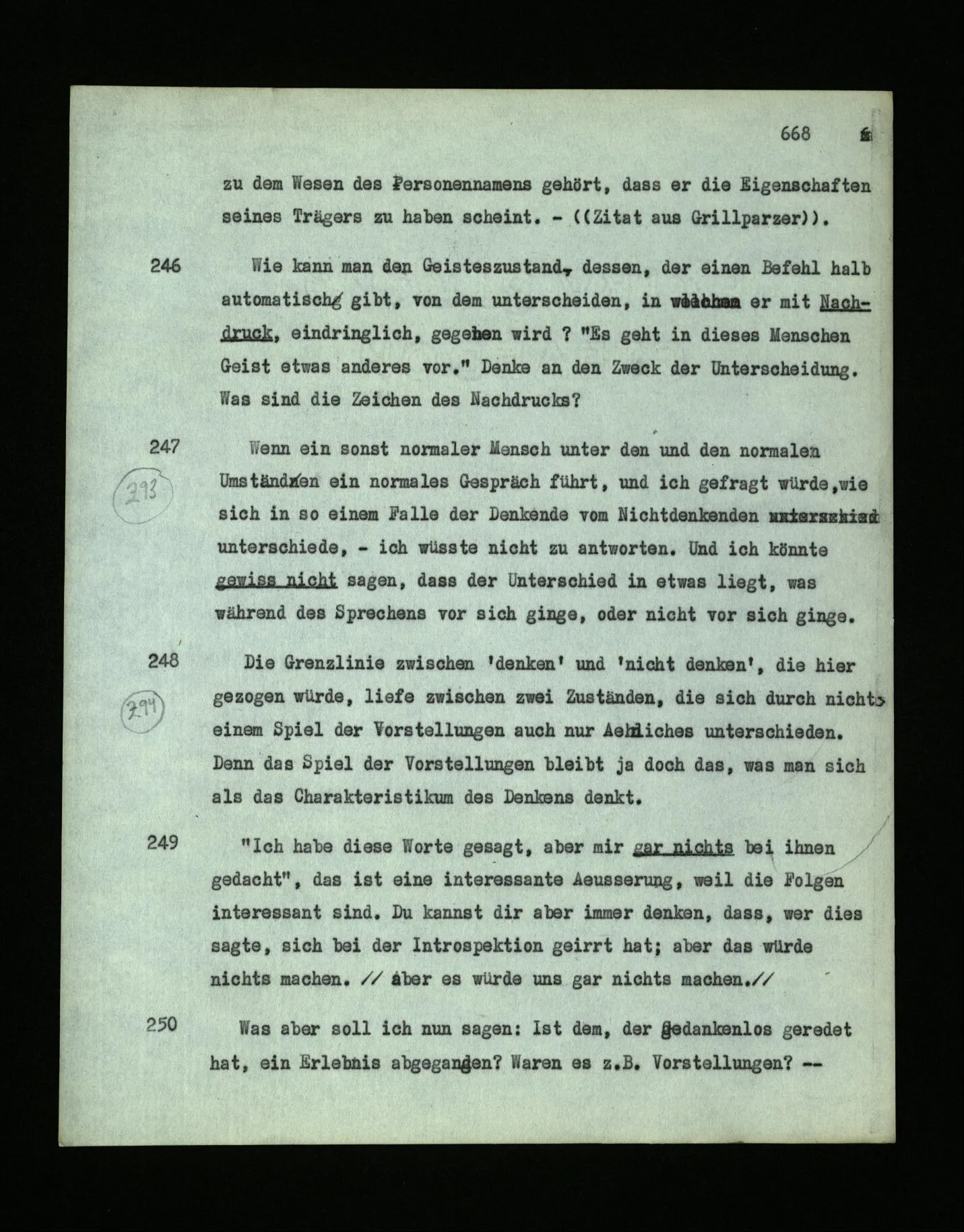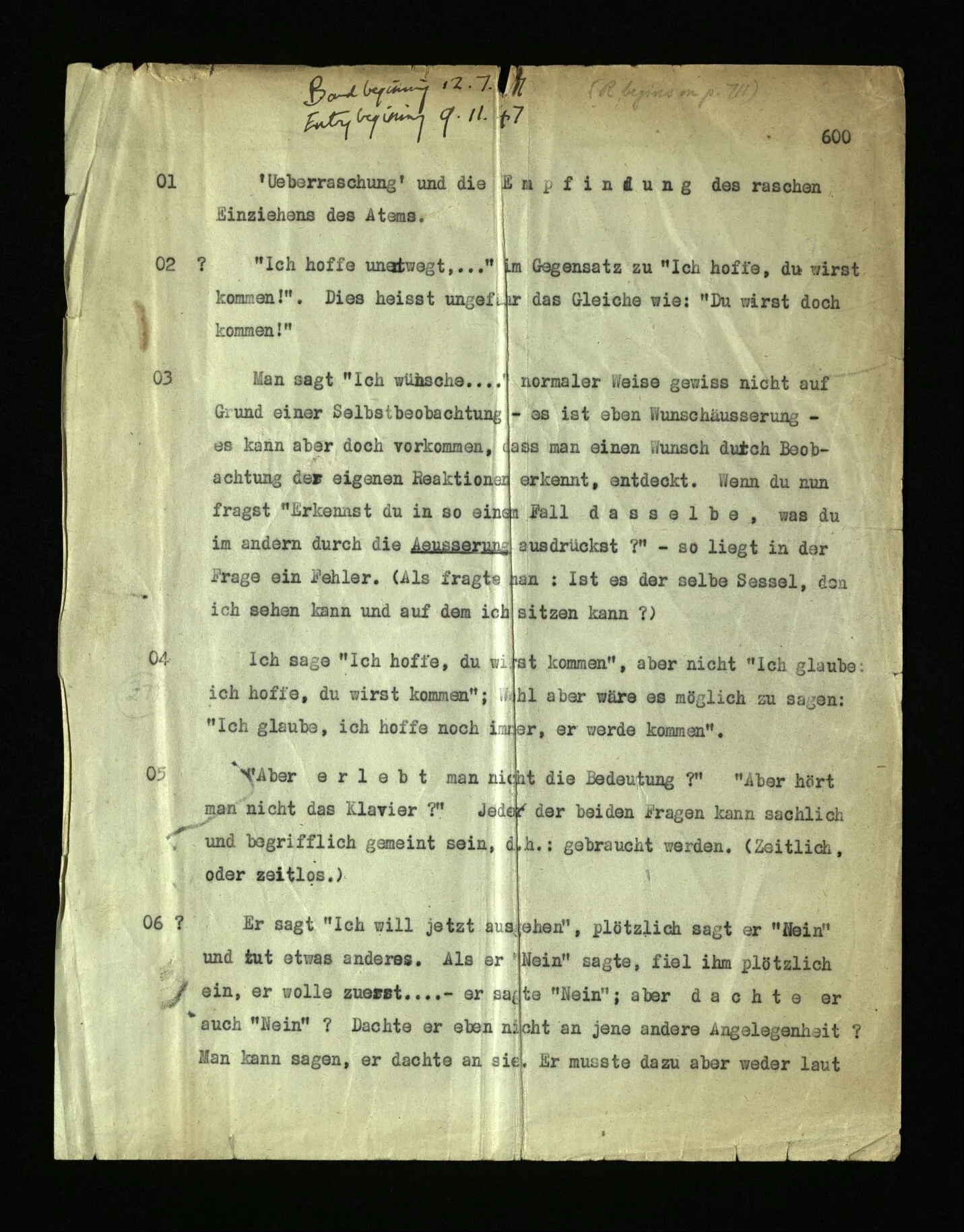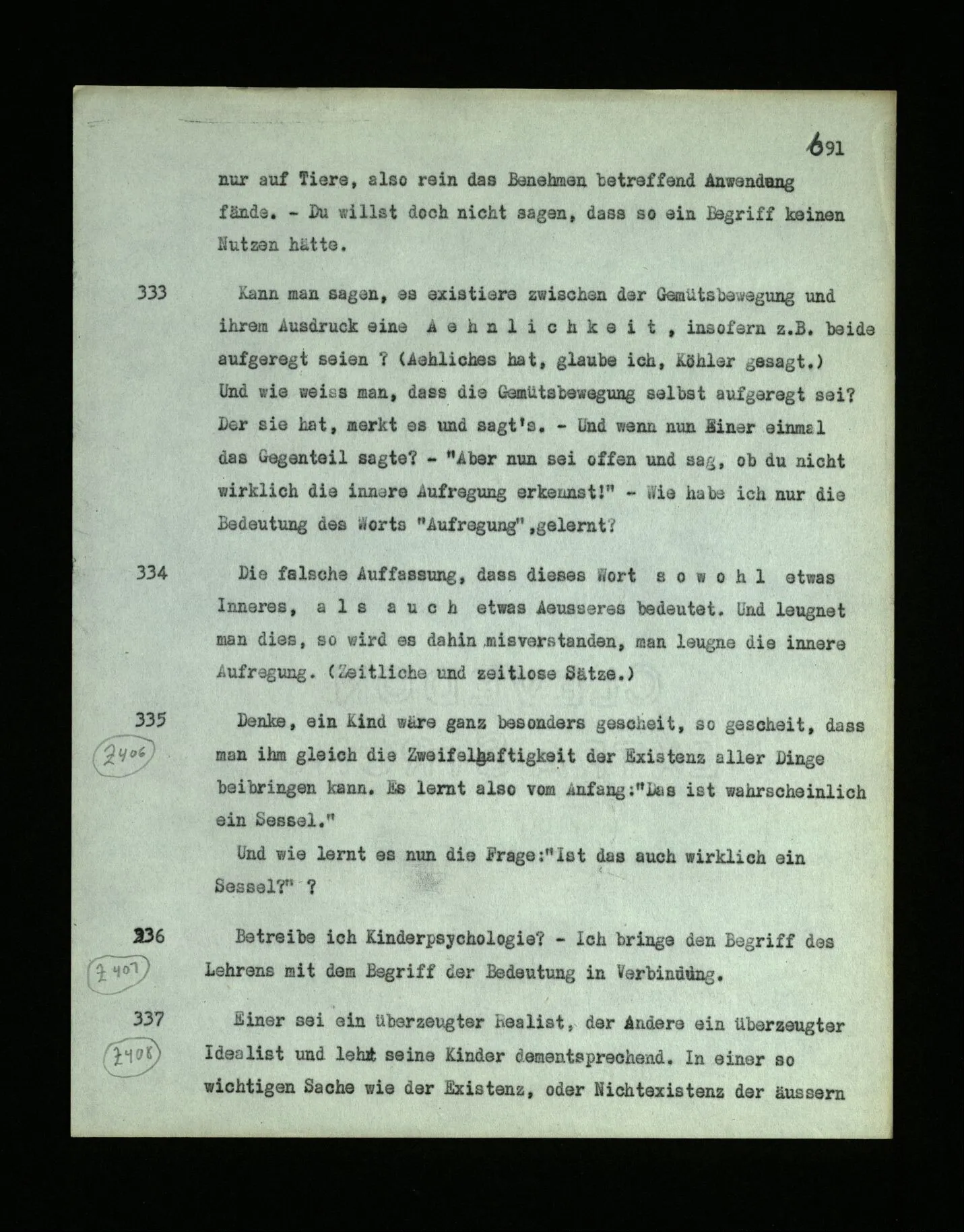 033 Sieh es einmal rein behaviouristisch an: Jemand sagt: Der Mensch denkt, wünscht, freut sich, ist zornig, etc. Denk, es sei hier nur von gewissen Formen des Verhaltens bei gewiß Anlässen die Rede. Man könnte sich vorstellen, wer so vom Menschen redet, habe diese Verhaltungsweisen zuerst bei andern Wesen beobachtet und sage nun, beim Menschen ließen sich diese Erscheinungen auch beobachten. Das wäre also, wie wenn wir dies von einer Tierart sagten. – – –