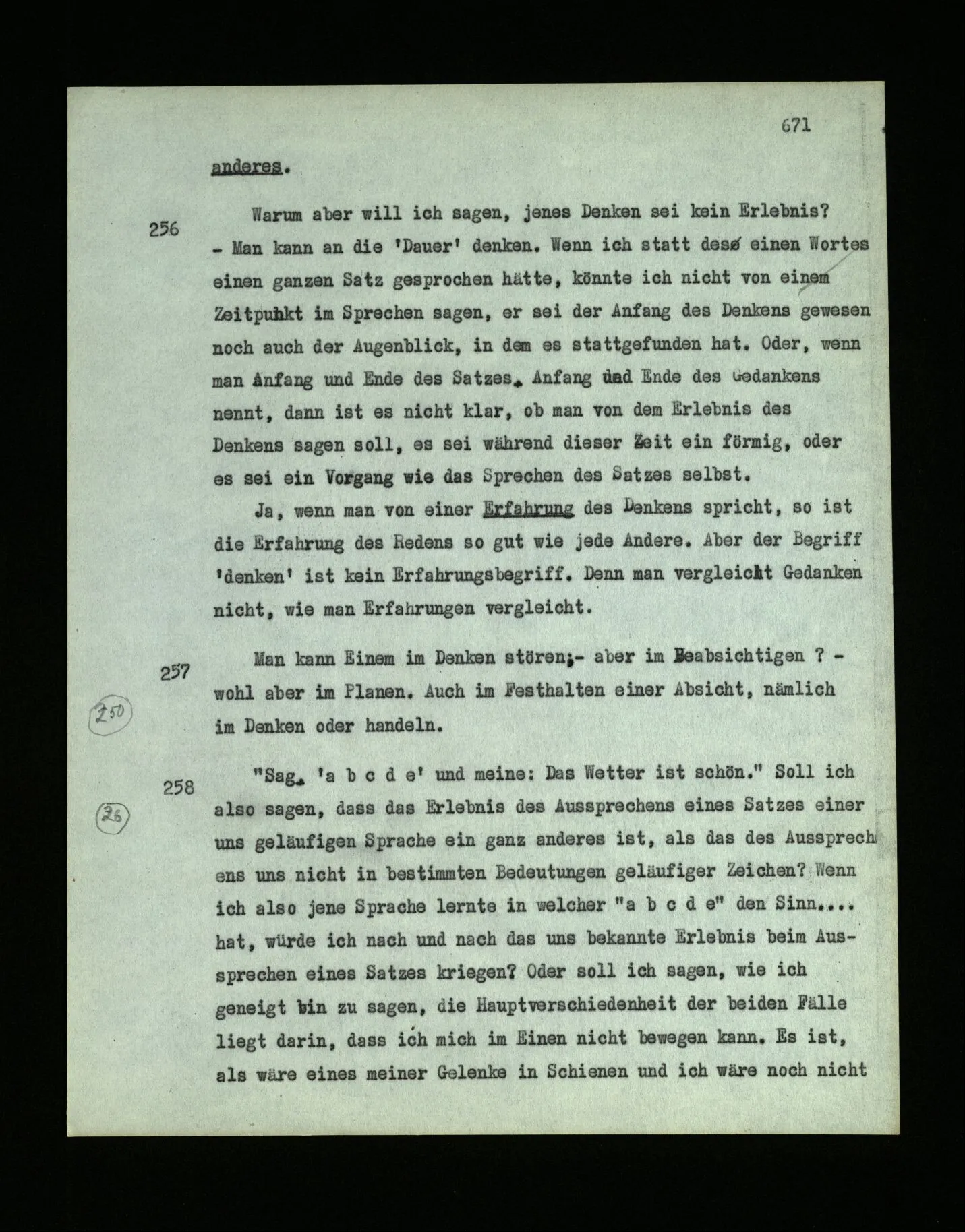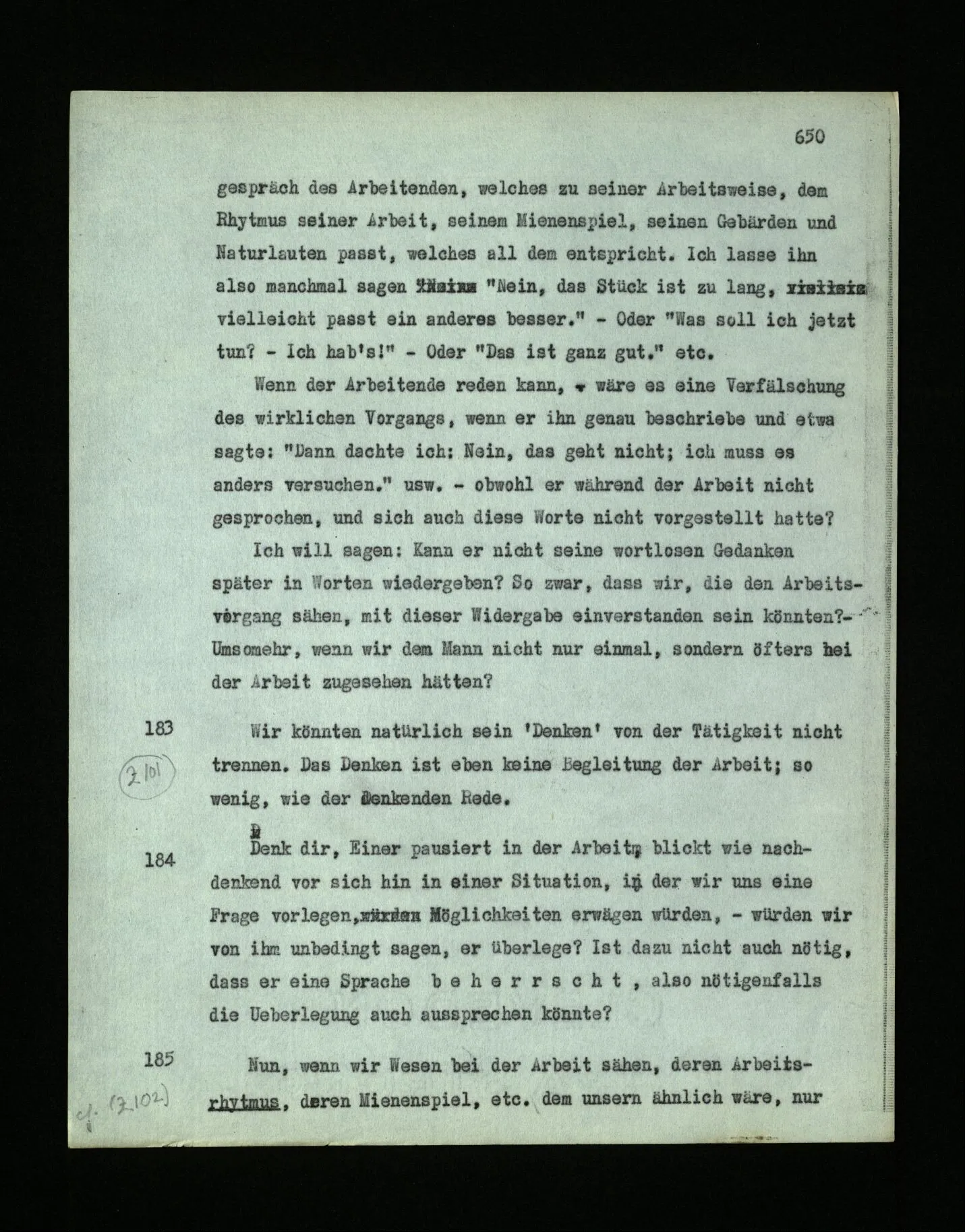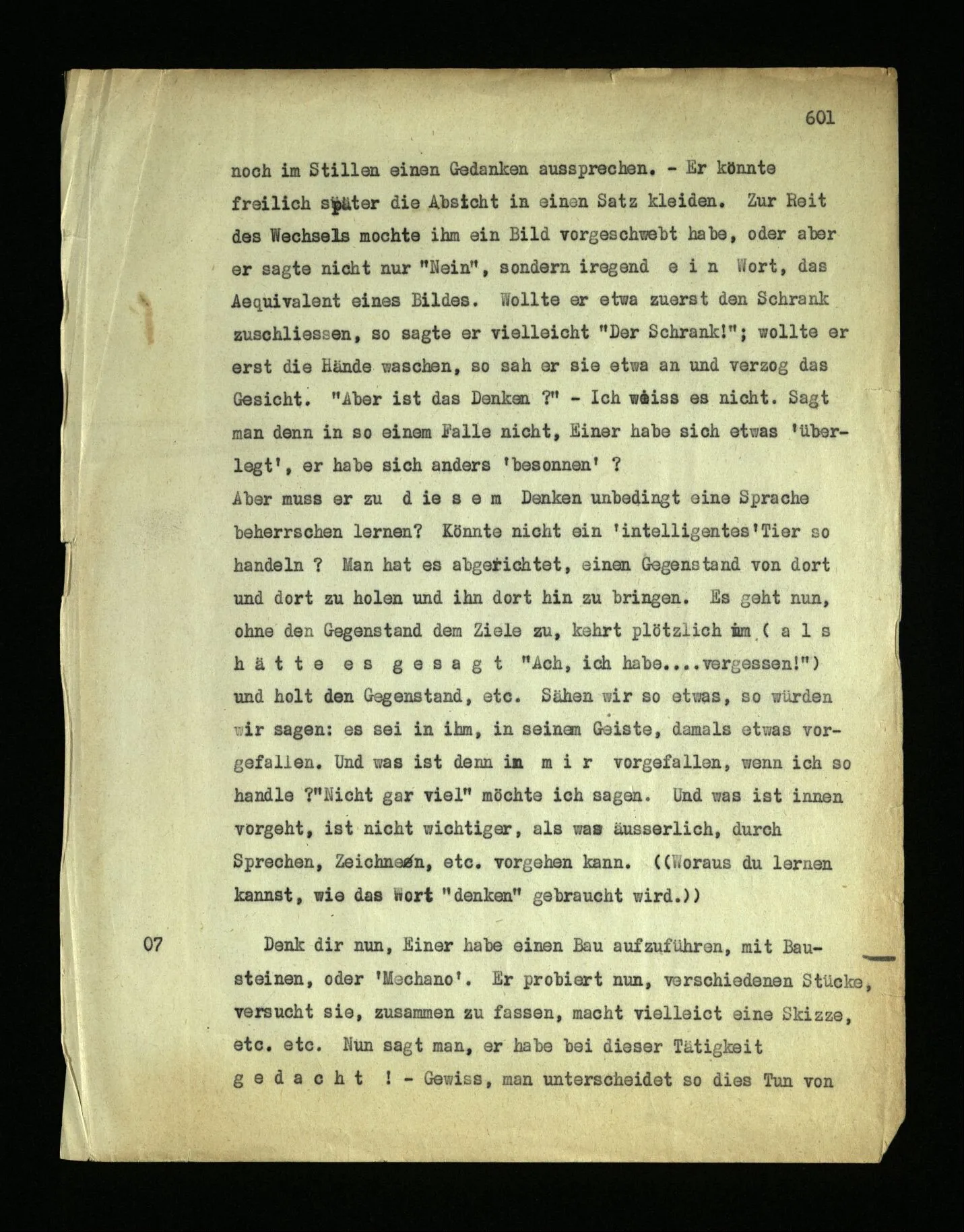 07 Denk dir nun, Einer habe einen Bau aufzuführen, mit Bausteinen, oder ‘Mechano’. Er probiert nun, verschiedene Stücke, versucht sie, zusammen zu fassen, macht vielleicht eine Skizze, etc. etc. Nun sagt man, er habe bei dieser Tätigkeit gedacht! – Gewiß, man unterscheidet so dies Tun von einem sehr anders gearteten. Aber ist es eine gute Beschreibung dieses Unterschieds: in einem Falle gehe mit dem manuellen Tun noch etwas anderes einher? Könnte man etwa dieses Andere isolieren, und es geschehen lassen, ohne die übrige Tätigkeit? Es ist nicht wahr, daß Denken eine Art Sprechen ist, wie ich einmal sagte. Der Begriff ‘denken’ ist vom Begriff ‘sprechen’ kategorisch verschieden. Aber natürlich ist das Denken keine Begleitung des Sprechens, noch sonst irgend eines Vorgangs. Das heißt: man kann z.B. den ‘Denkvorgang’ nicht unbegleitet vor sich gehen lassen. Er hat auch nicht Abschnitte, die den Abschnitten der andern Tätigkeit (des Redens z.B.) entsprechen. D.h.: wenn man von einem ‘Denkvorgang’ redet, so ist er so etwas wie das Operieren (schriftlich oder mündlich) mit Zeichen. Das Schließen und Rechnen könnte man einen ‘Denkvorgang nennen.