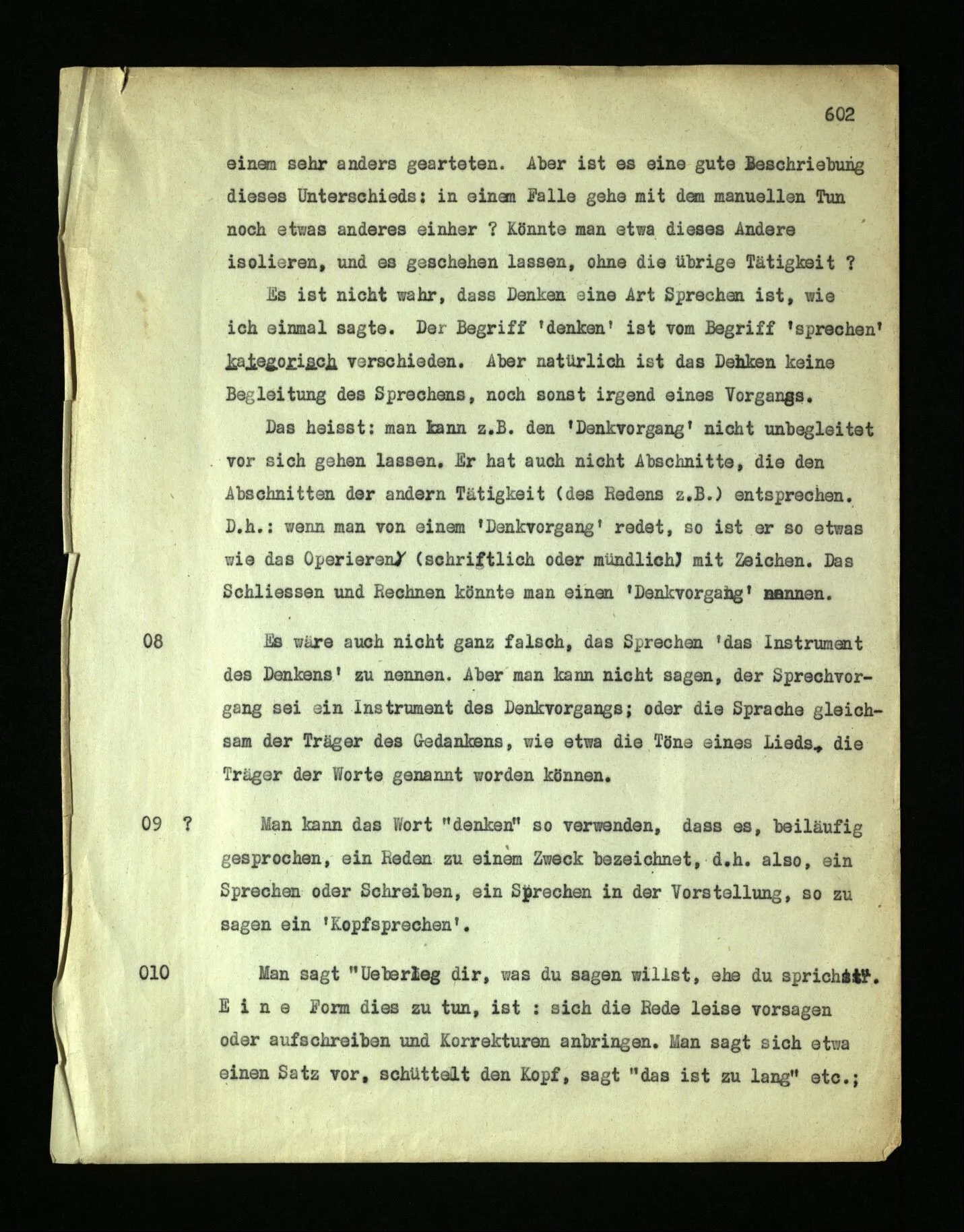 08 Es wäre auch nicht ganz falsch, das Sprechen ‘das Instrument des Denkens’ zu nennen. Aber man kann nicht sagen, der Sprechvorgang sei ein Instrument des Denkvorgangs; oder die Sprache gleichsam der Träger des Gedankens, wie etwa die Töne eines Lieds die Träger der Worte genannt werden können.