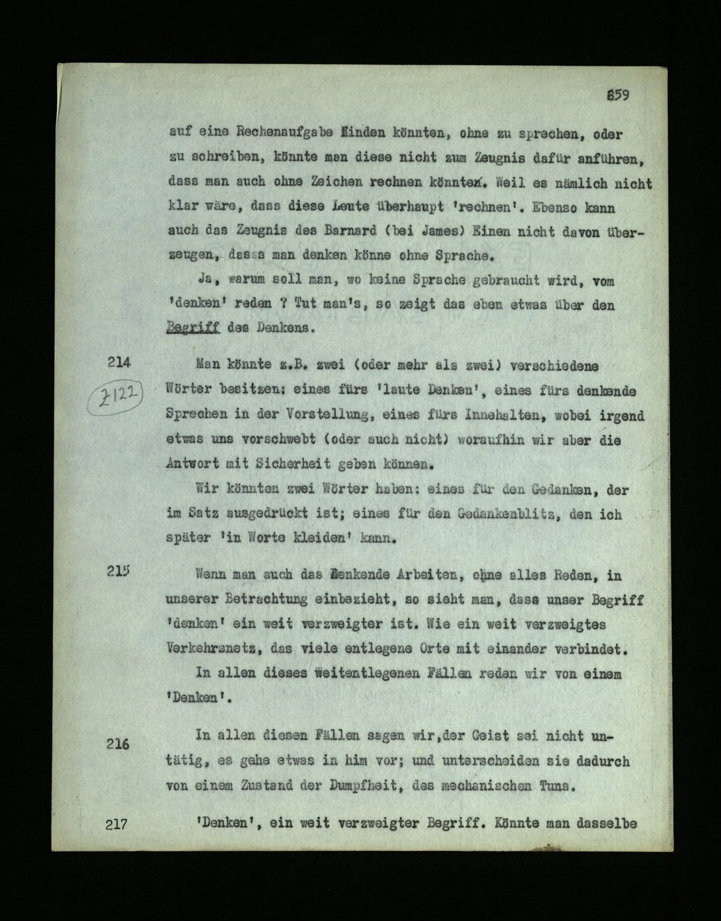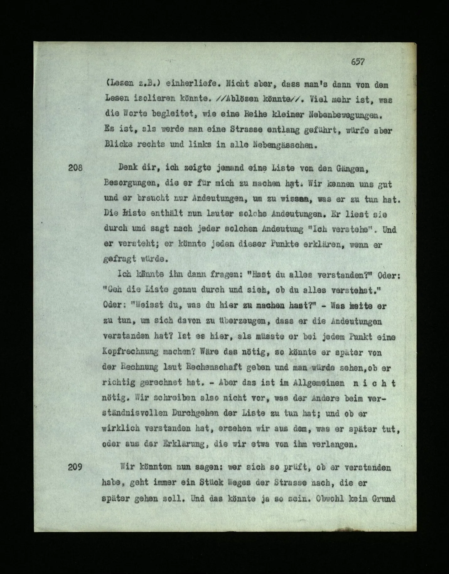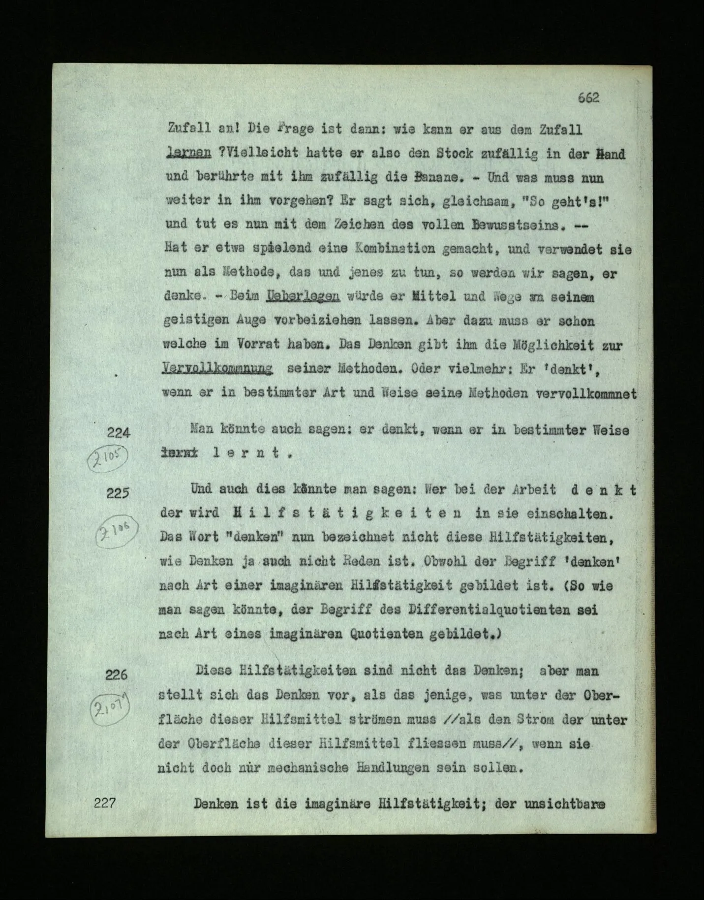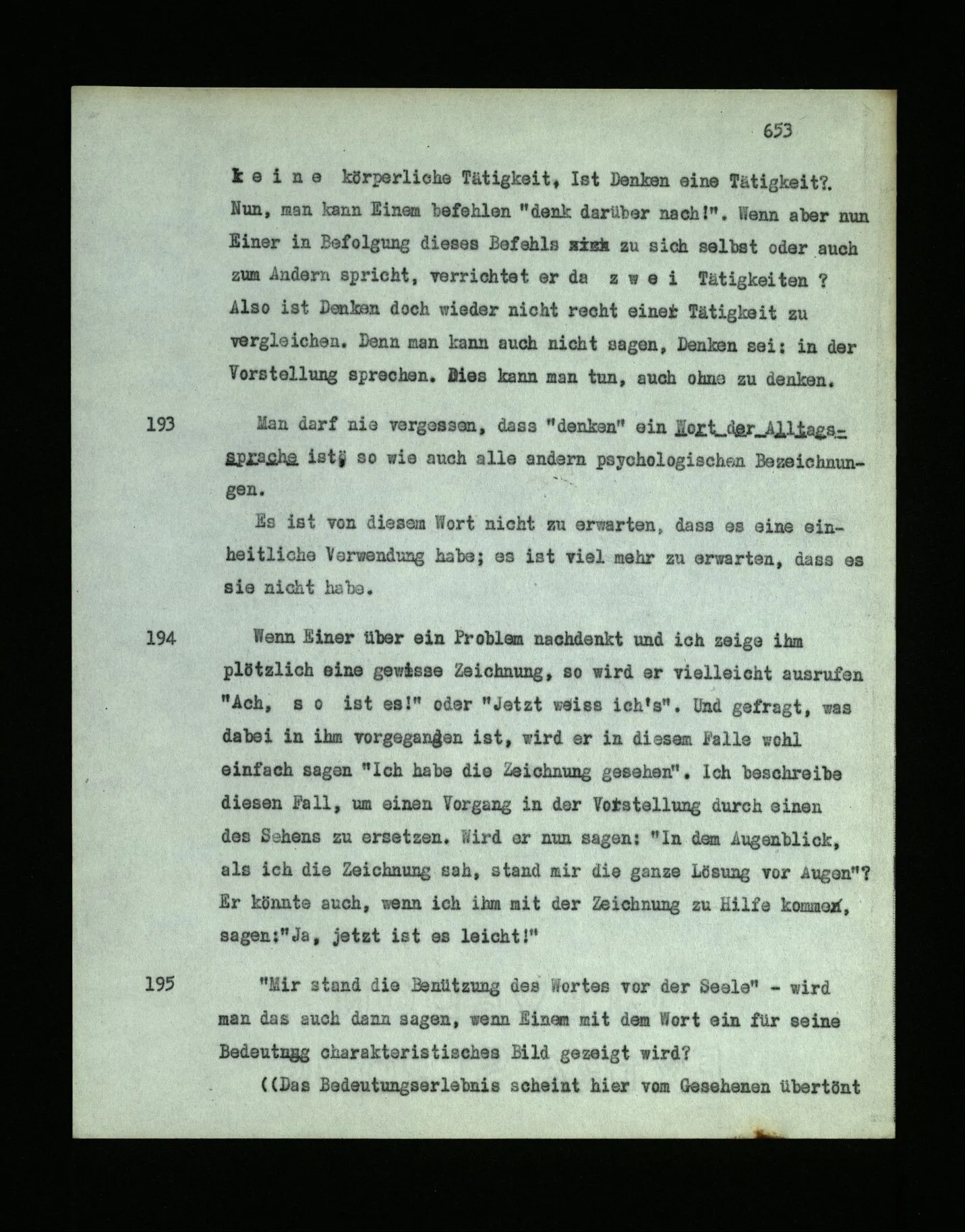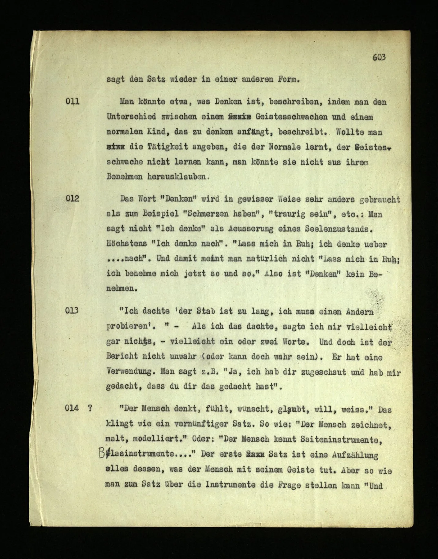 011 Man könnte etwa, was Denken ist, beschreiben, indem man den Unterschied zwischen einem Geistesschwachen und einem normalen Kind, das zu denken anfängt, beschreibt. Wollte man die Tätigkeit angeben, die der Normale lernt, der Geistesschwache nicht lernen kann, man könnte sie nicht aus ihrem Benehmen herausklauben.