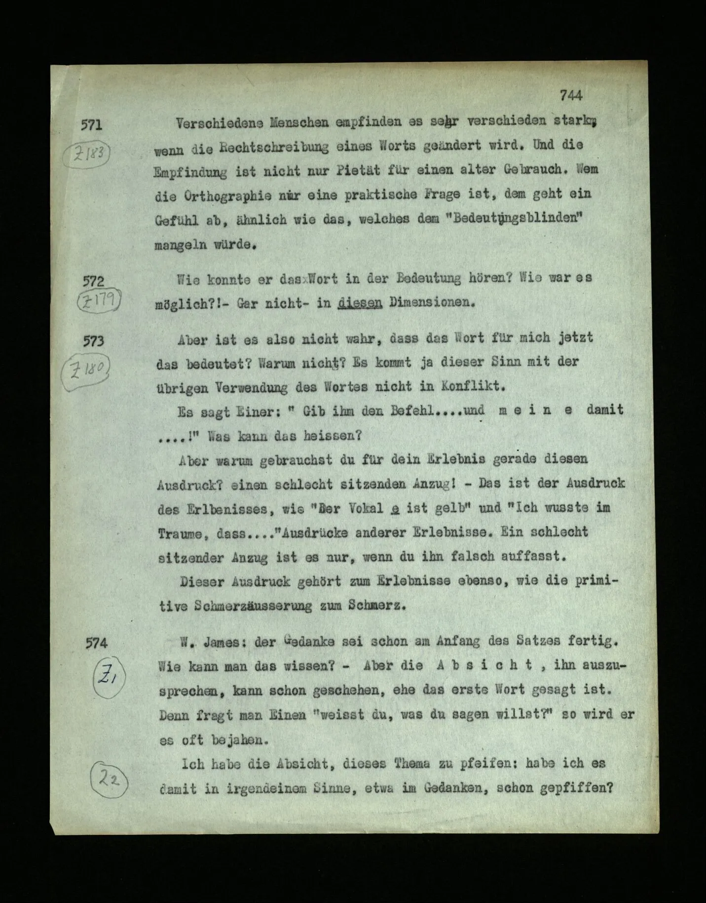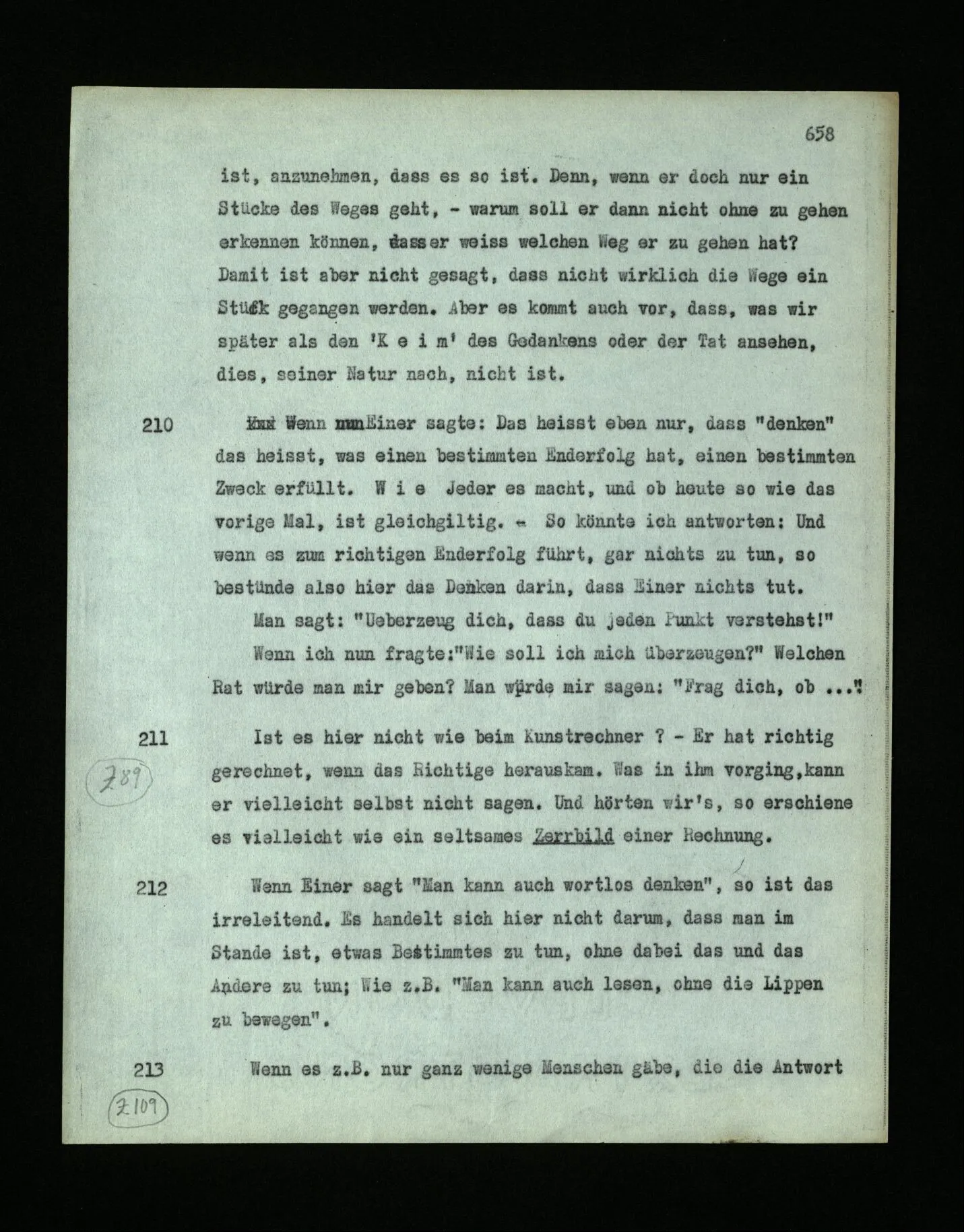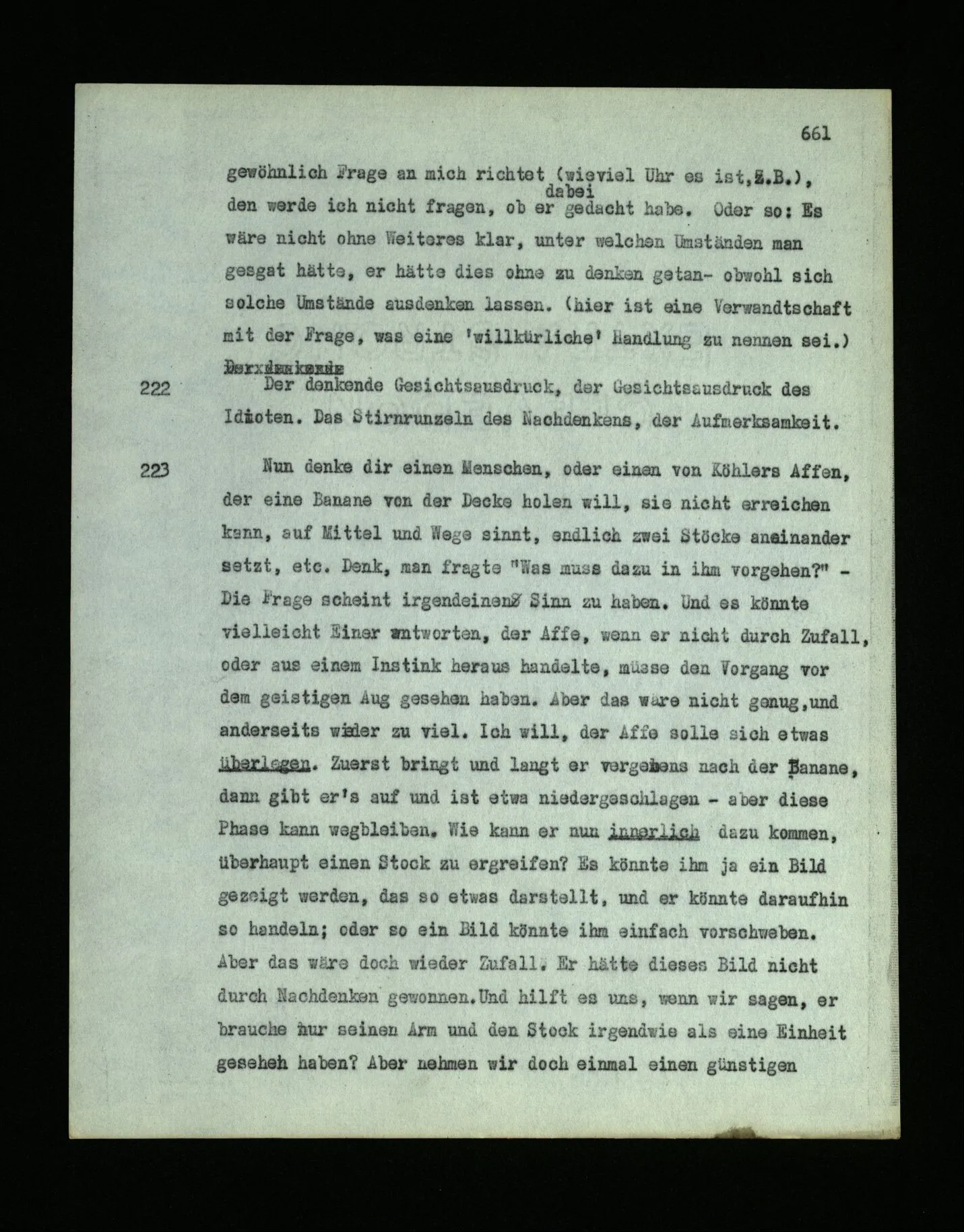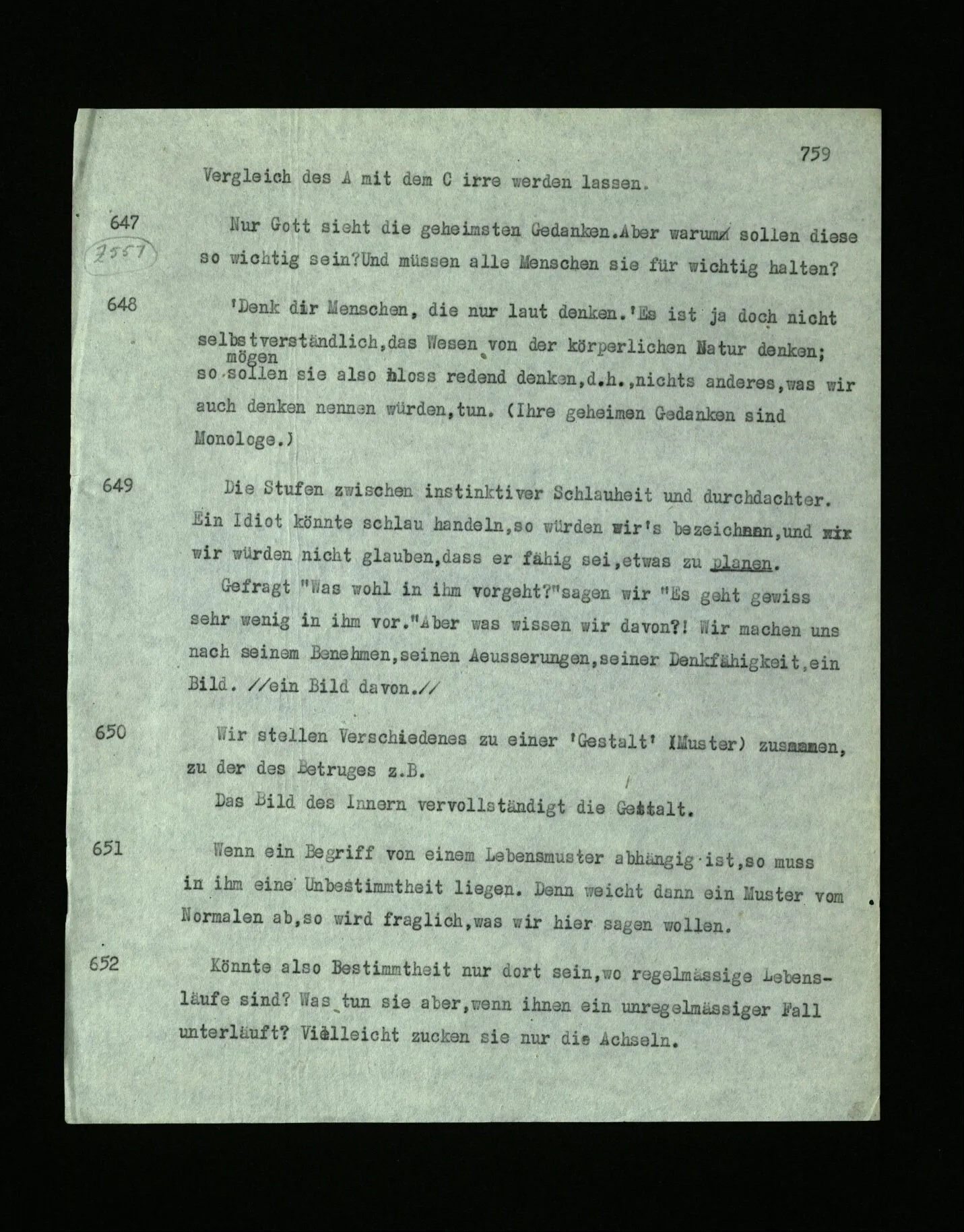 011 Man könnte etwa, was Denken ist, beschreiben, indem man den Unterschied zwischen einem Geistesschwachen und einem normalen Kind, das zu denken anfängt, beschreibt. Wollte man die Tätigkeit angeben, die der Normale lernt, der Geistesschwache nicht lernen kann, man könnte sie nicht aus ihrem Benehmen herausklauben.