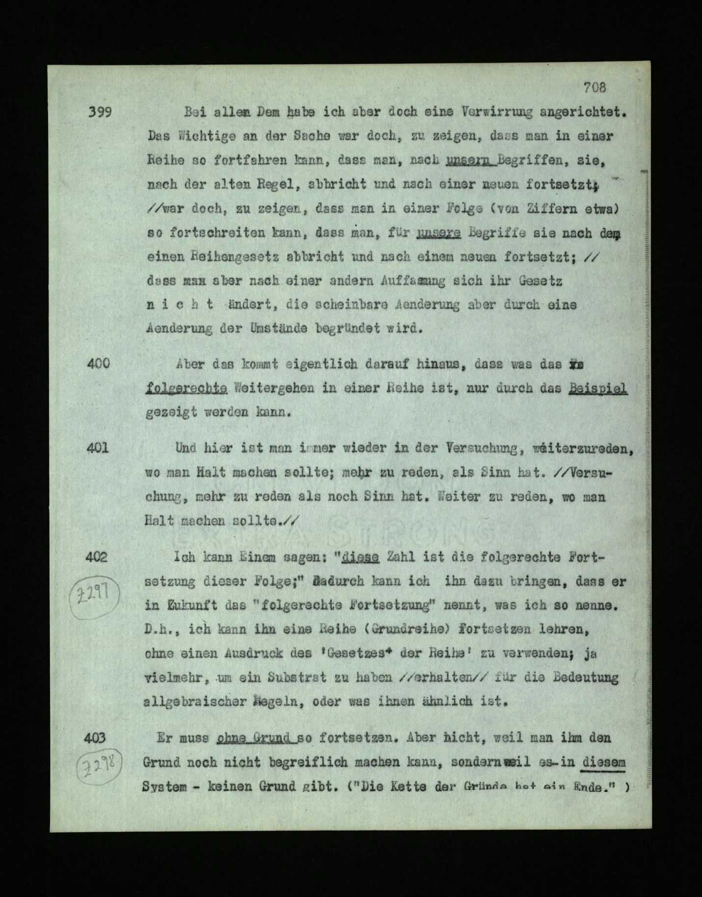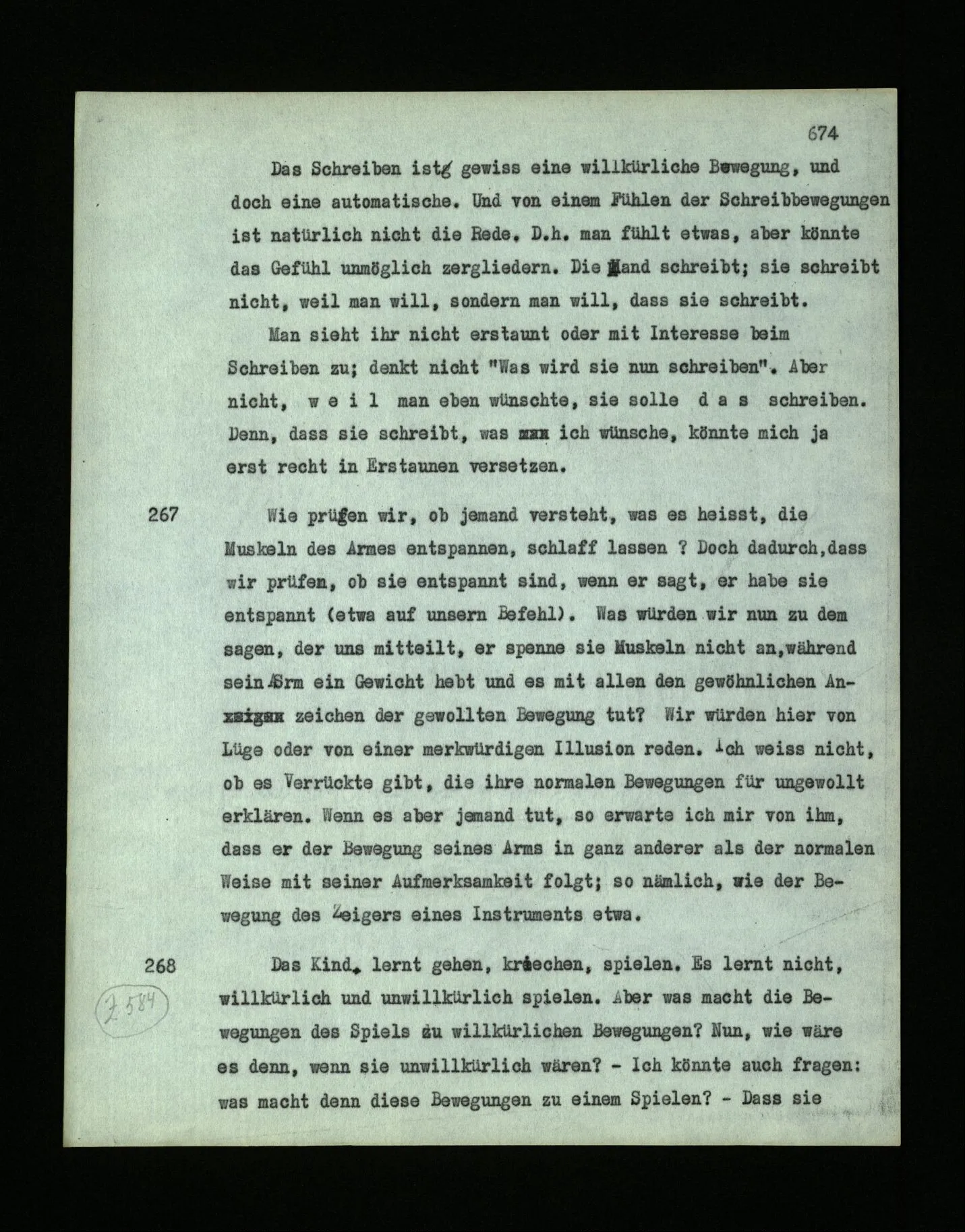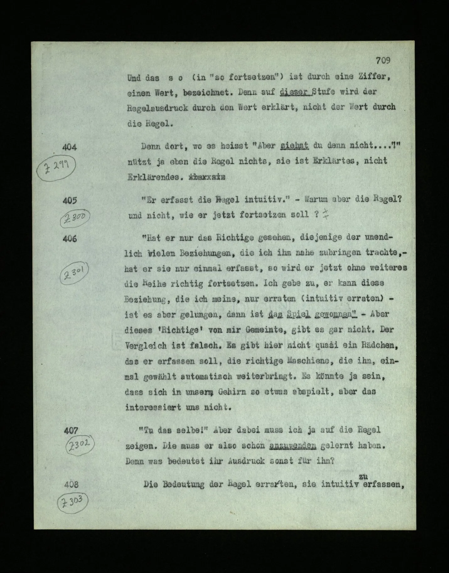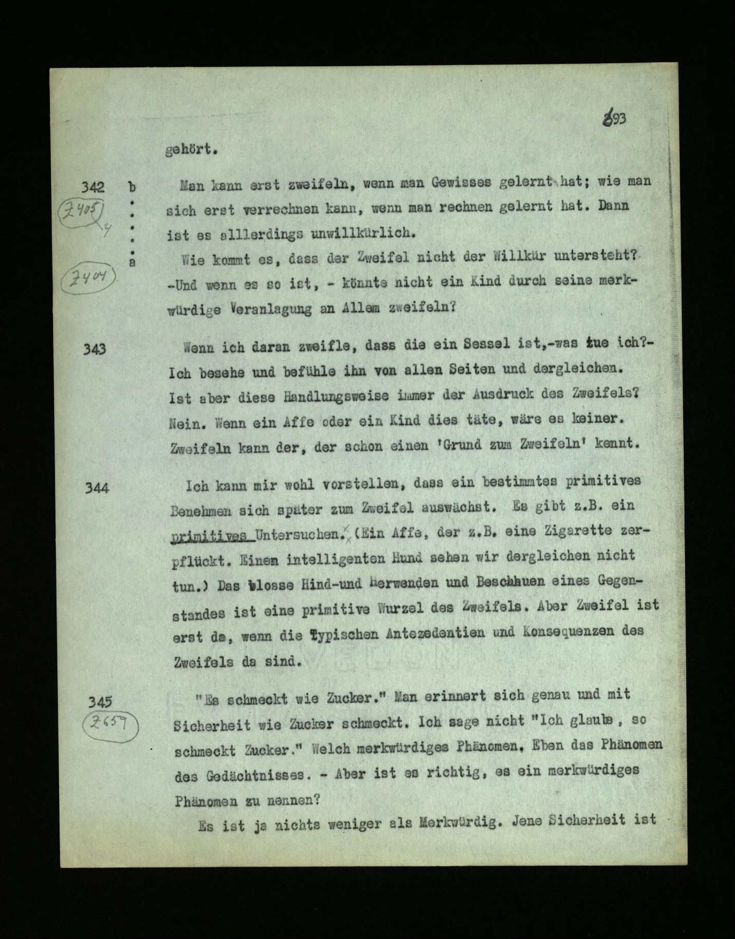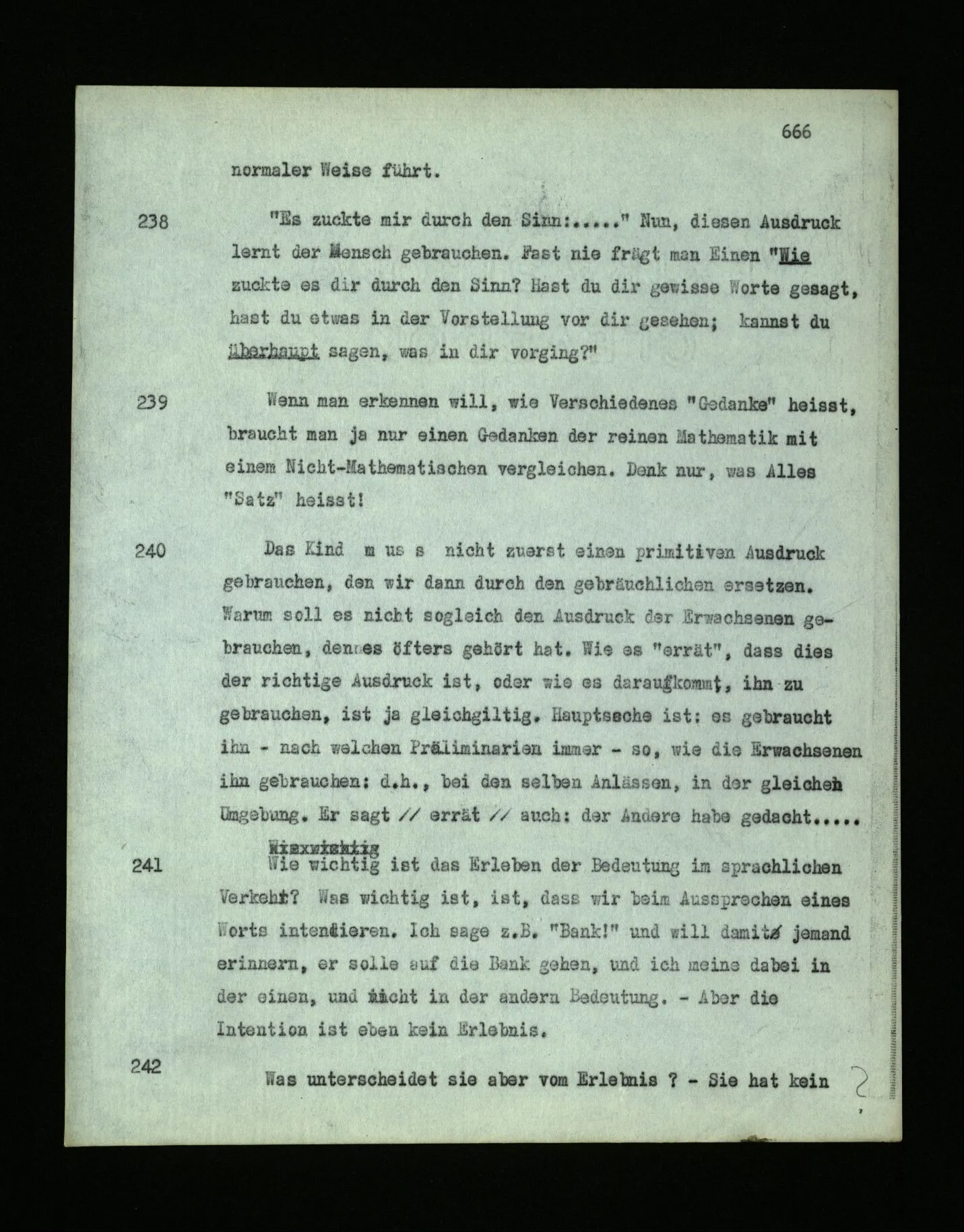 011 Man könnte etwa, was Denken ist, beschreiben, indem man den Unterschied zwischen einem Geistesschwachen und einem normalen Kind, das zu denken anfängt, beschreibt. Wollte man die Tätigkeit angeben, die der Normale lernt, der Geistesschwache nicht lernen kann, man könnte sie nicht aus ihrem Benehmen herausklauben.
