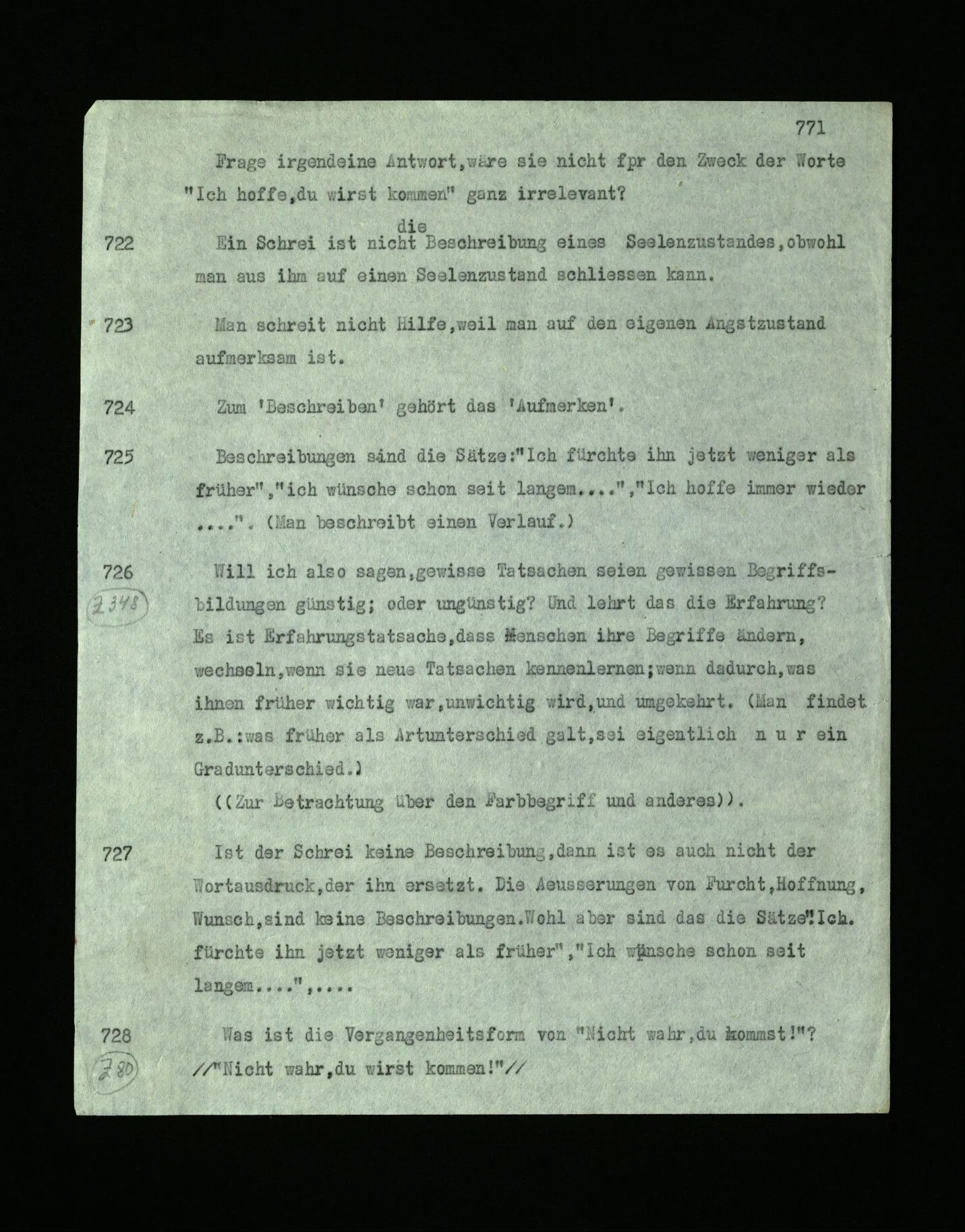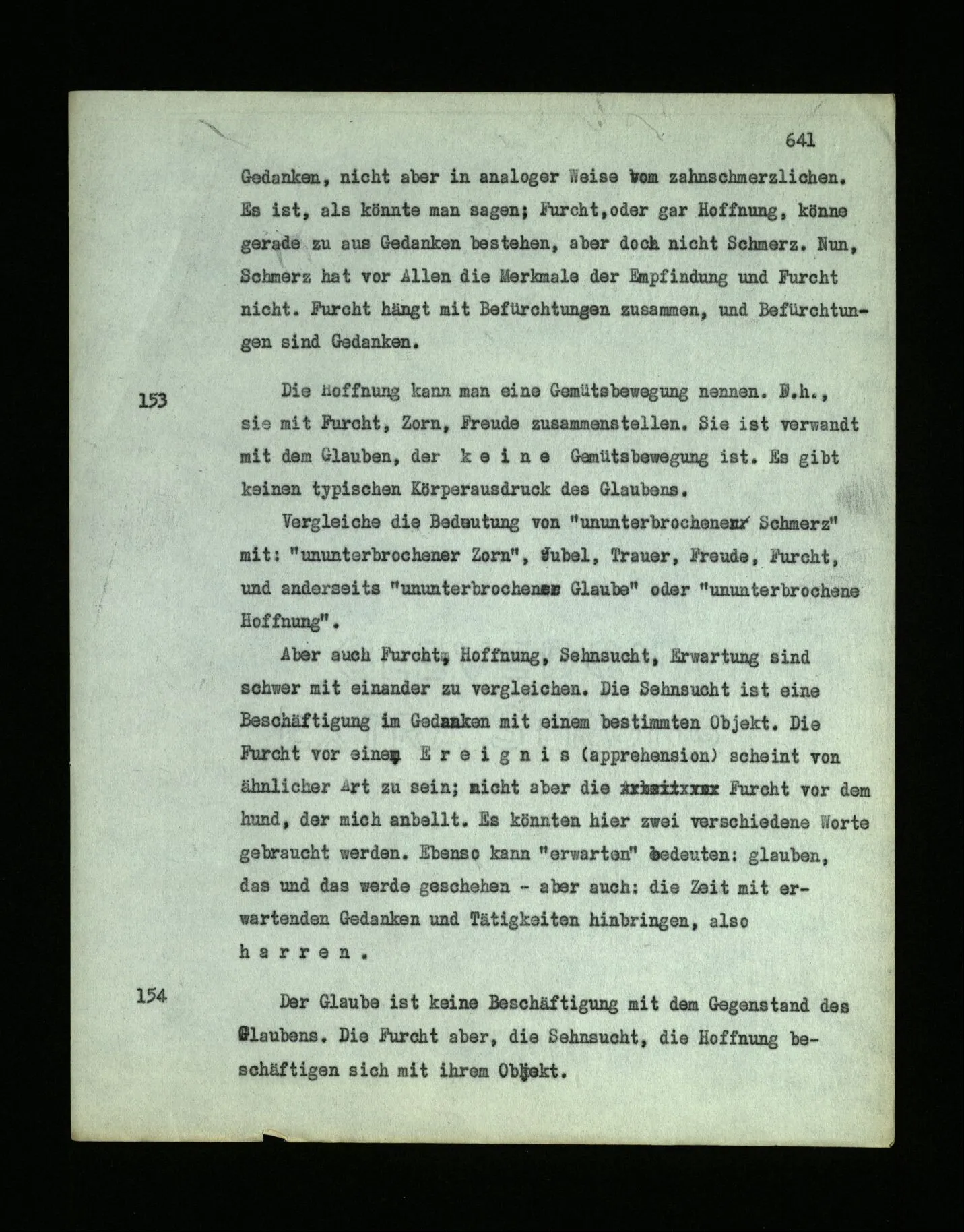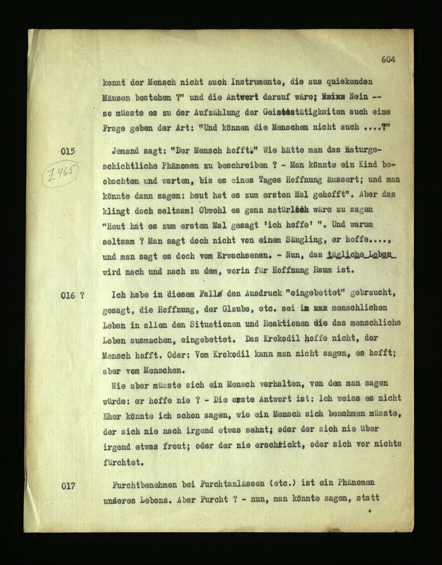 015 Jemand sagt: “Der Mensch hofft.” Wie hätte man das naturgeschichtliche Phänomen zu beschreiben? – Man könnte ein Kind beobachten und warten, bis es eines Tages Hoffnung äußert; und man könnte dann sagen: “heut hat es zum ersten Mal gehofft”. Aber das klingt doch seltsam! Obwohl es ganz natürlich wäre zu sagen “Heut hat es zum ersten Mal gesagt ‘ich hoffe’”. Und warum seltsam? Man sagt doch nicht von einem Säugling, er hoffe …, und man sagt es doch vom Erwachsenen. – Nun, das tägliche Leben wird nach und nach zu dem, worin für Hoffnung Raum ist.