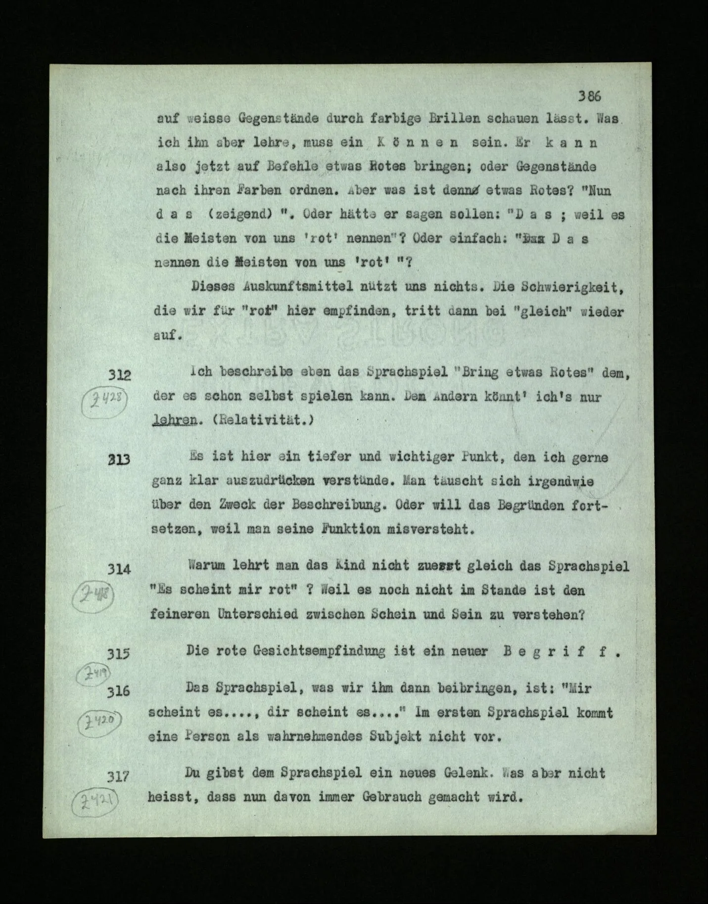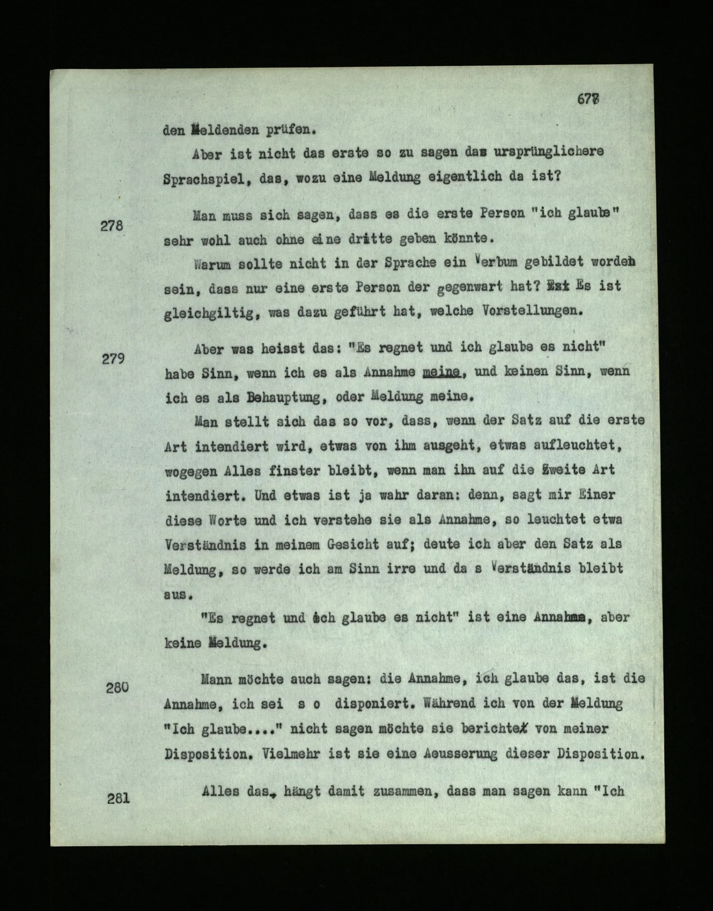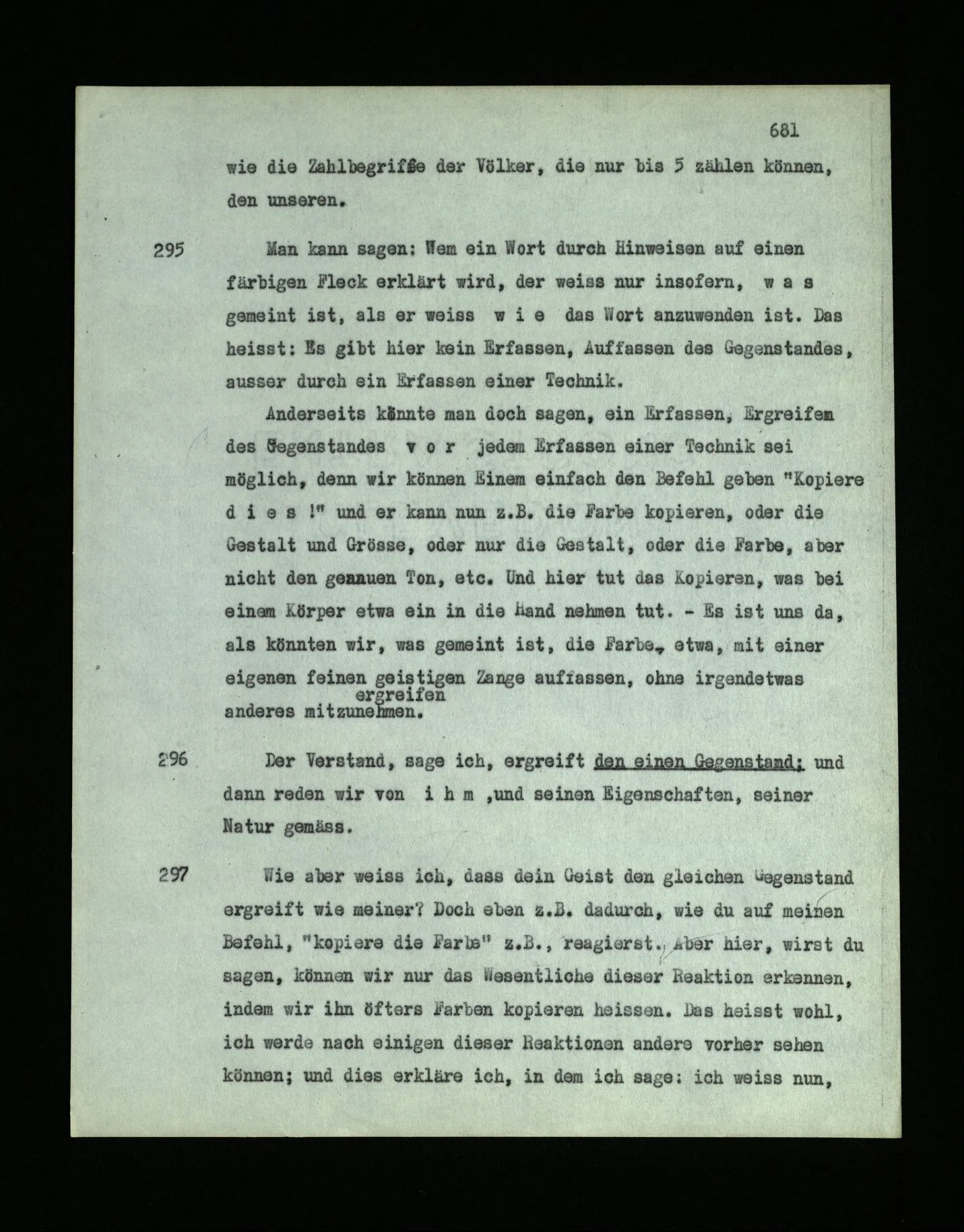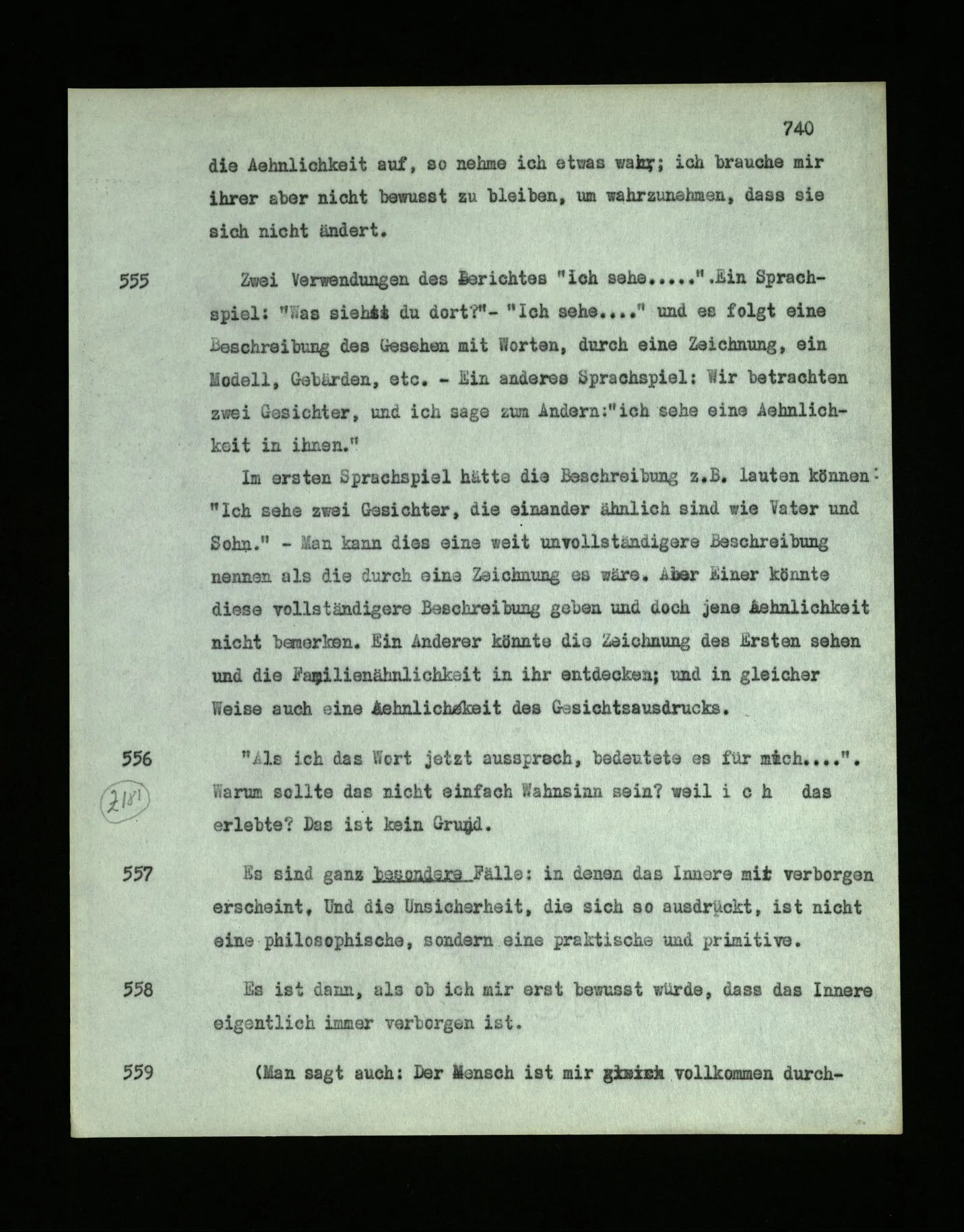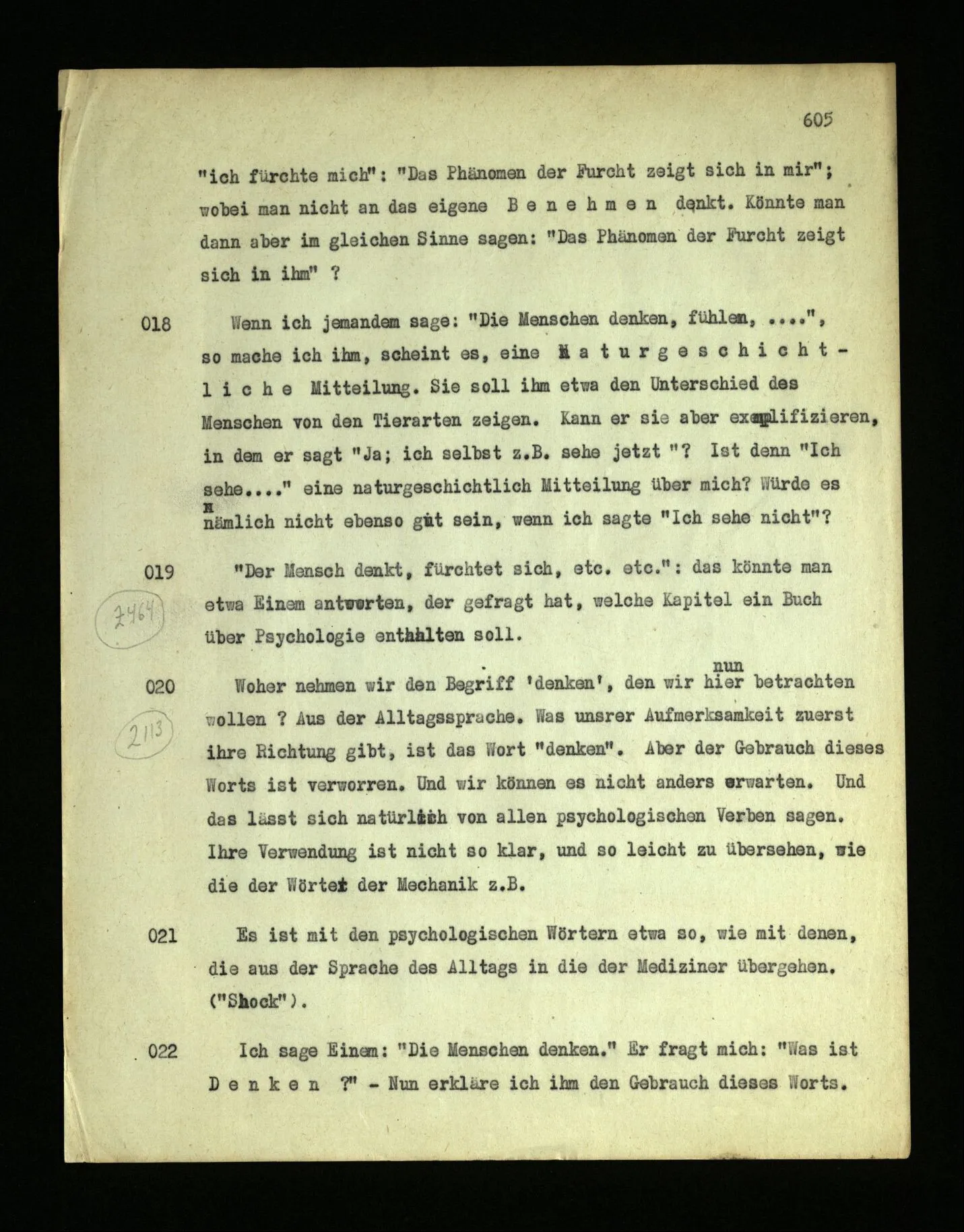 018 Wenn ich jemandem sage: “Die Menschen denken, fühlen, …”, so mache ich ihm, scheint es, eine naturgeschichtliche Mitteilung. Sie soll ihm etwa den Unterschied des Menschen von den Tierarten zeigen. Kann er sie aber exemplifizieren, in dem er sagt “Ja; ich selbst z.B. sehe jetzt”? Ist denn “Ich sehe …” eine naturgeschichtliche Mitteilung über mich? Würde es nämlich nicht ebenso gut sein, wenn ich sagte “Ich sehe nicht”?