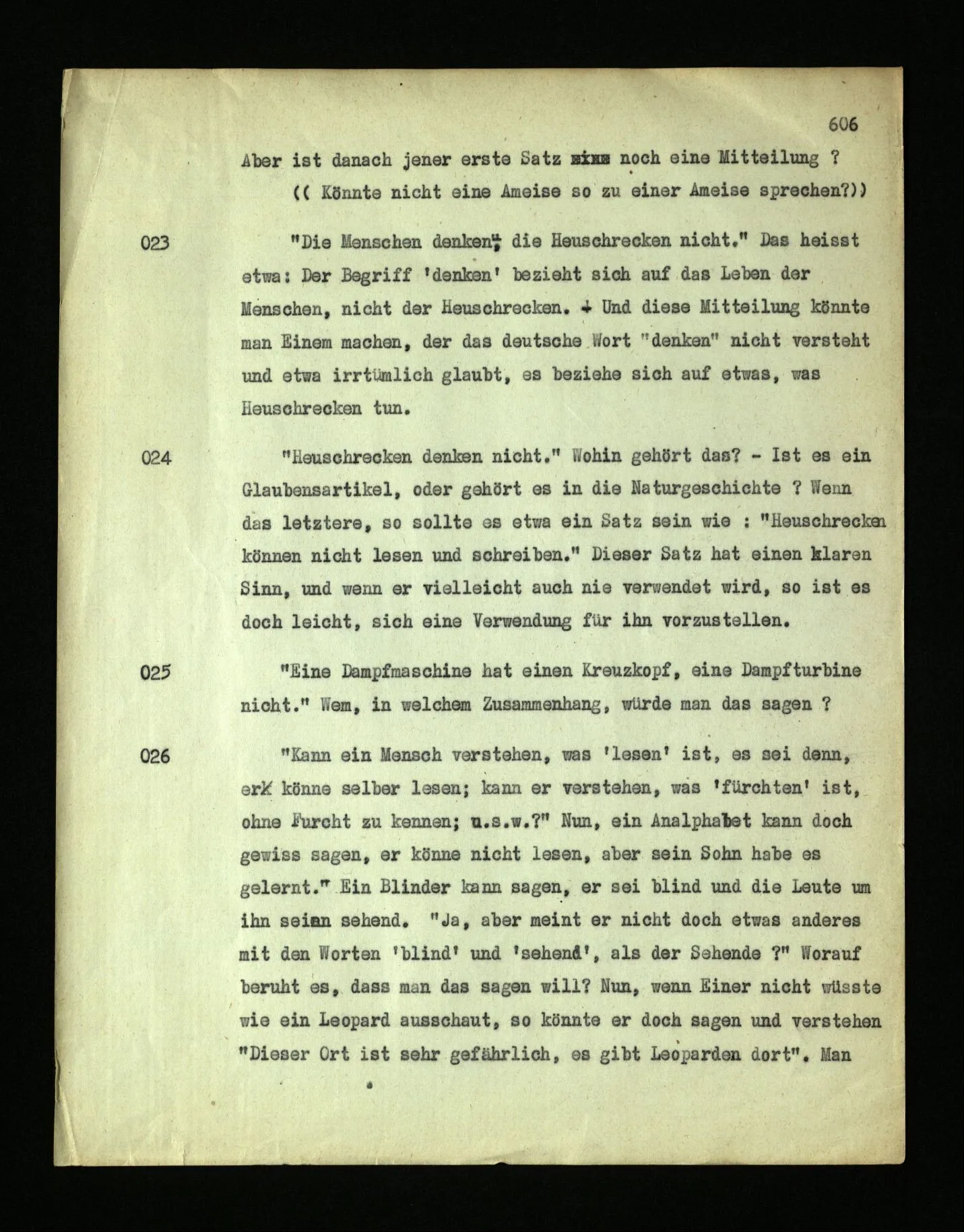 024 “Heuschrecken denken nicht.” Wohin gehört das? – Ist es ein Glaubensartikel, oder gehört es in die Naturgeschichte? Wenn das letztere, so sollte es etwa ein Satz sein wie: “Heuschrecken können nicht lesen und schreiben.” Dieser Satz hat einen klaren Sinn, und wenn er vielleicht auch nie verwendet wird, so ist es doch leicht, sich eine Verwendung für ihn vorzustellen.