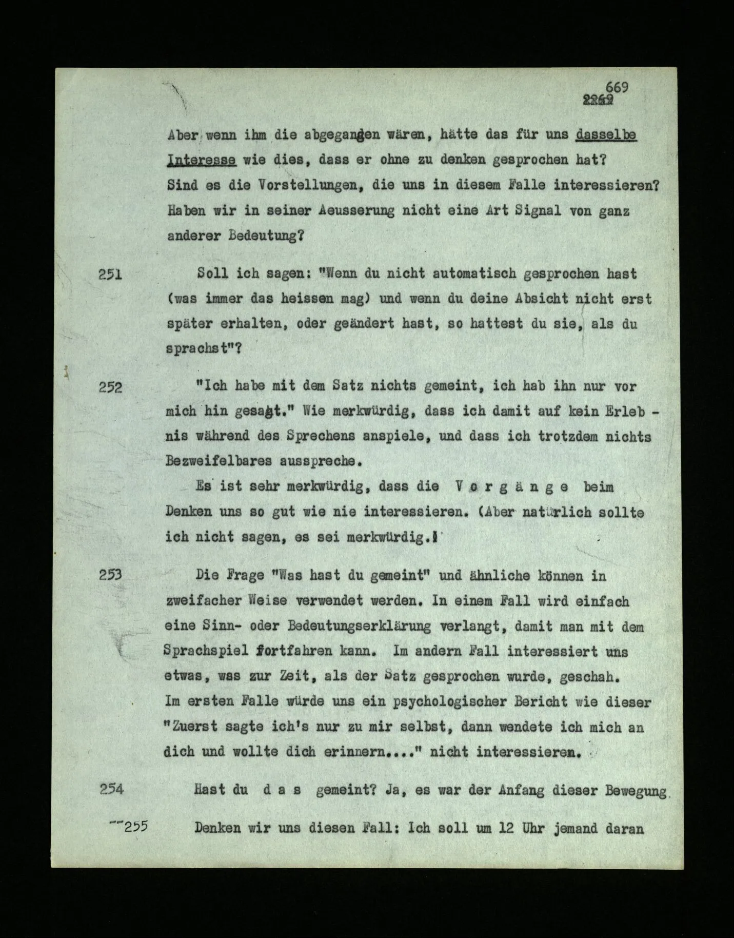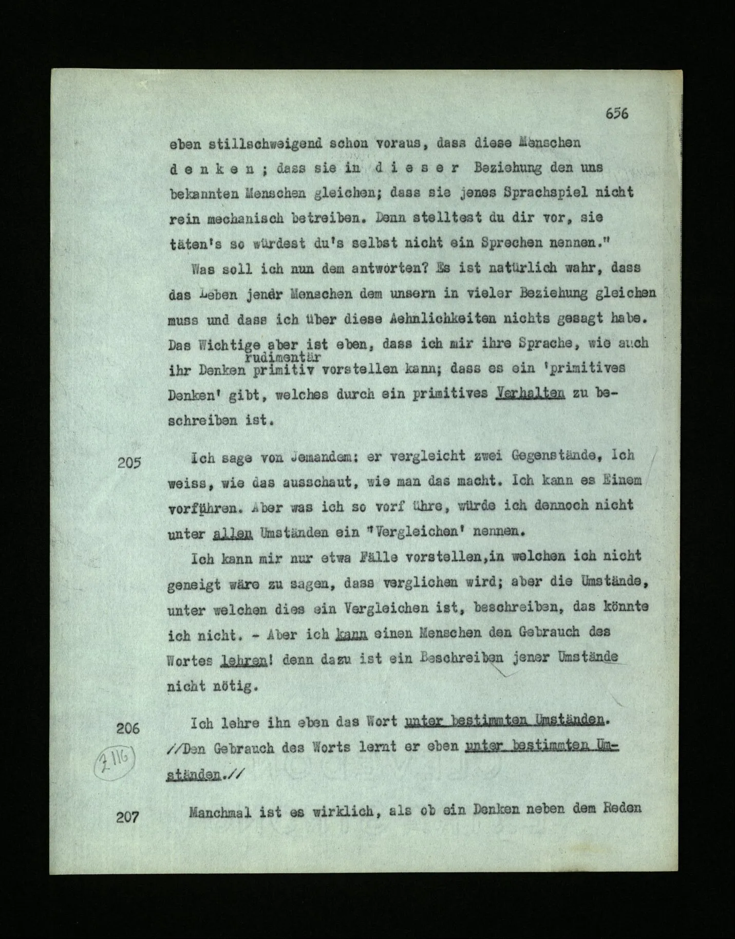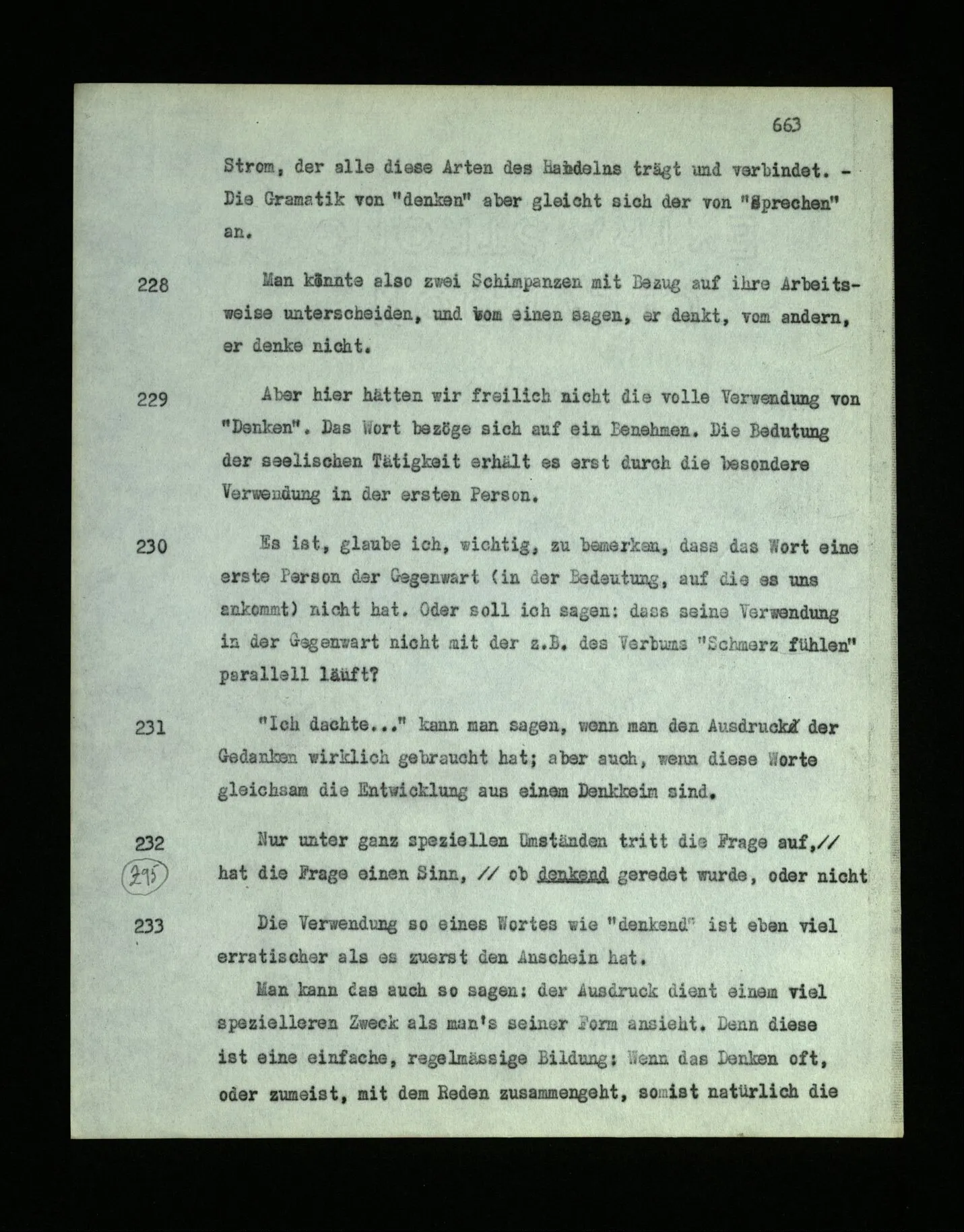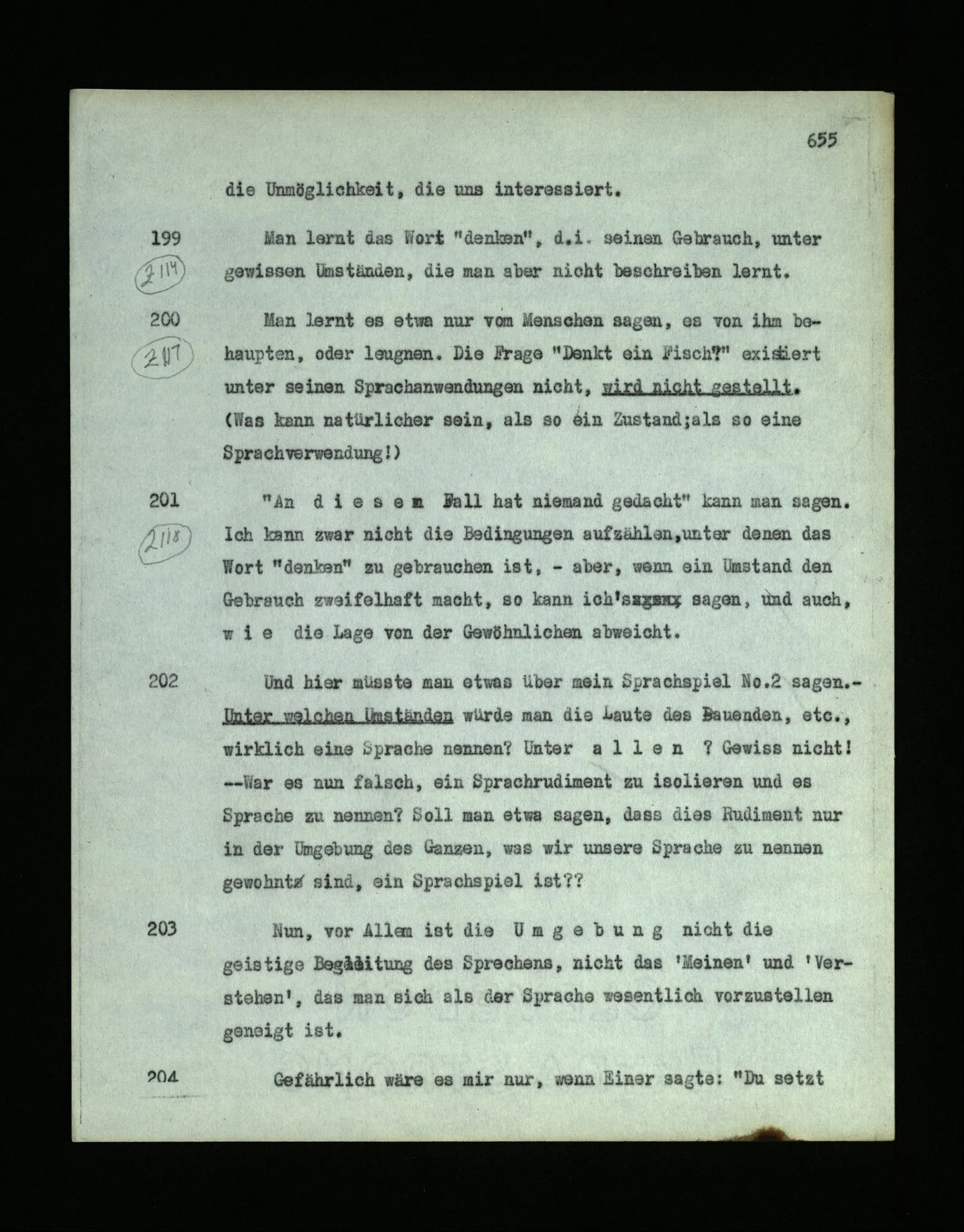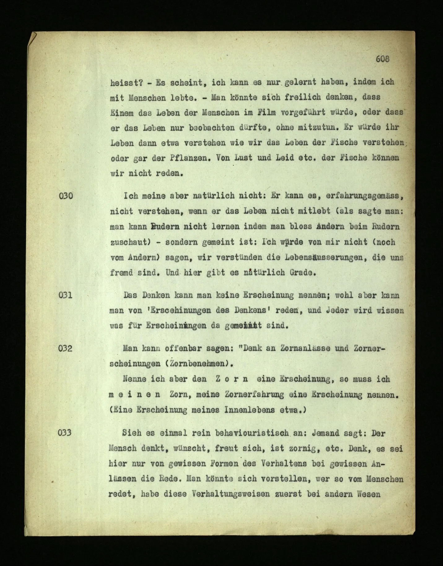 029 “Die Menschen denken manchmal.” Wie habe ich gelernt, was “denken” heißt? – Es scheint, ich kann nur gelernt haben, indem ich mit Menschen lebte. – Man könnte sich freilich denken, daß Einem das Leben der Menschen im Film vorgeführt würde, oder daß er das Leben nur beobachten dürfte, ohne mitzutun. Er würde ihr Leben dann etwa verstehen wie wir das Leben der Fische verstehen oder gar der Pflanzen. Von Lust und Leid etc. der Fische können wir nicht reden.