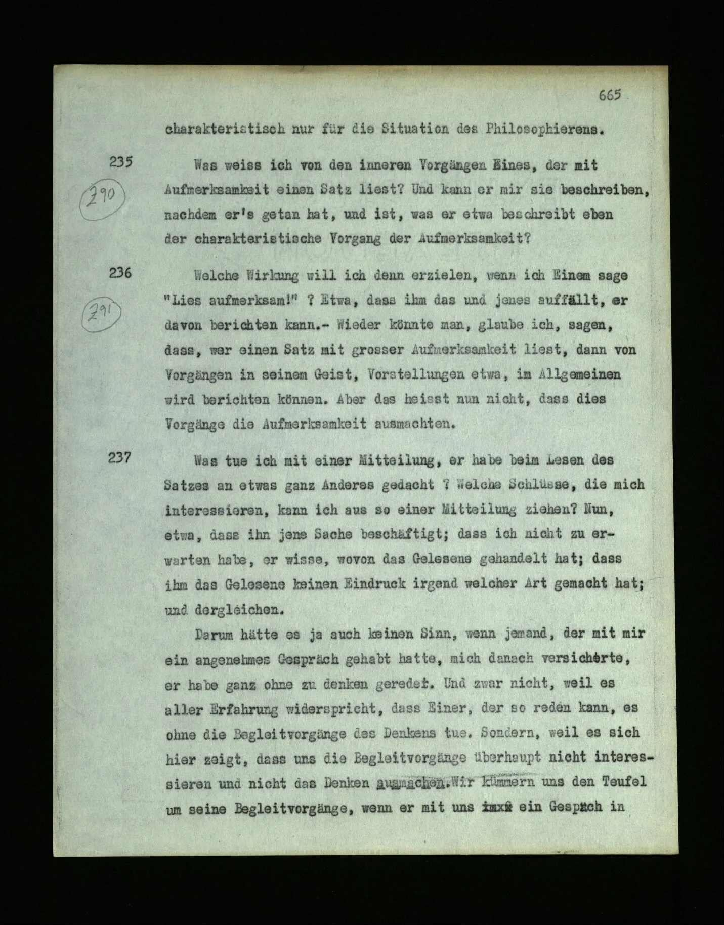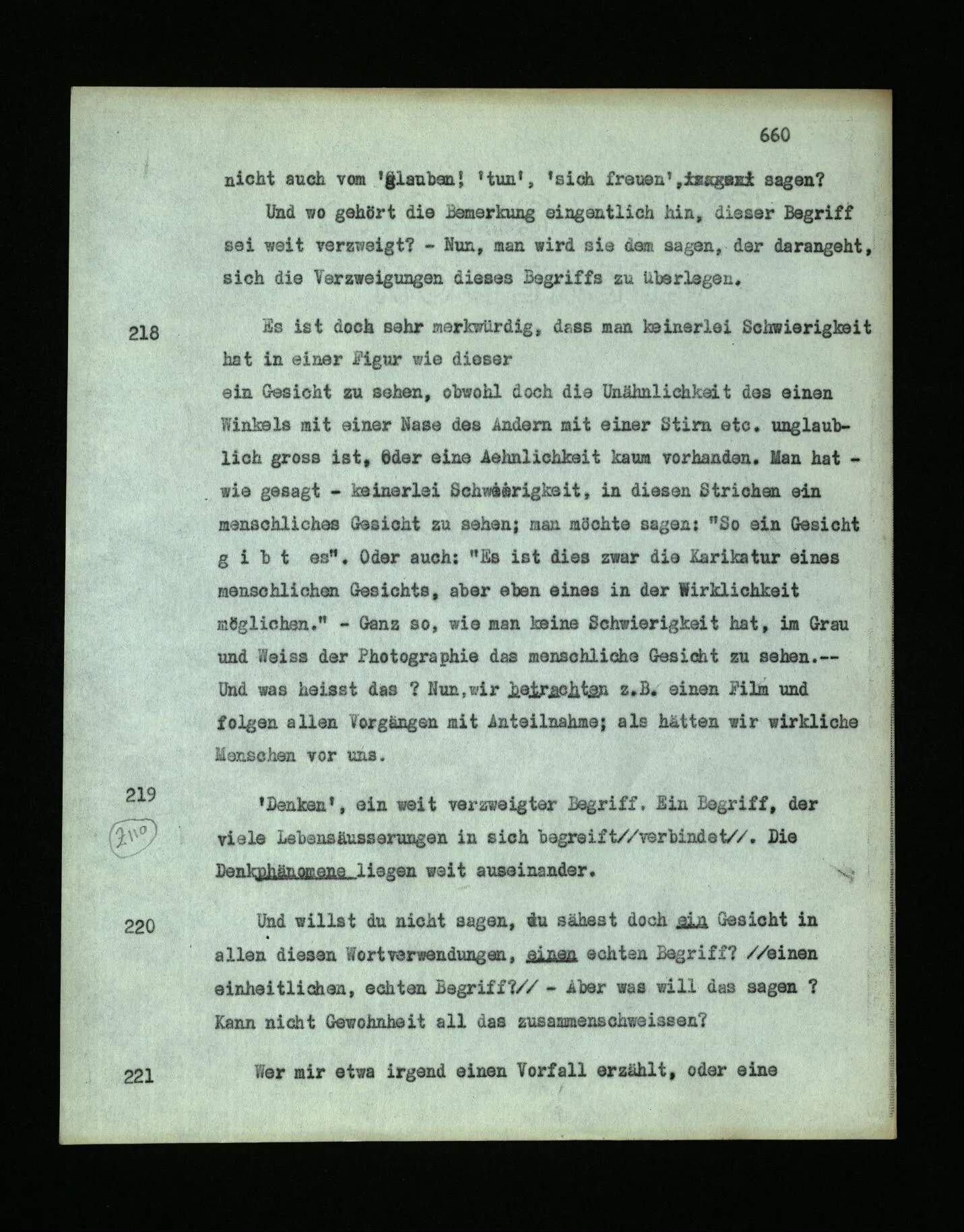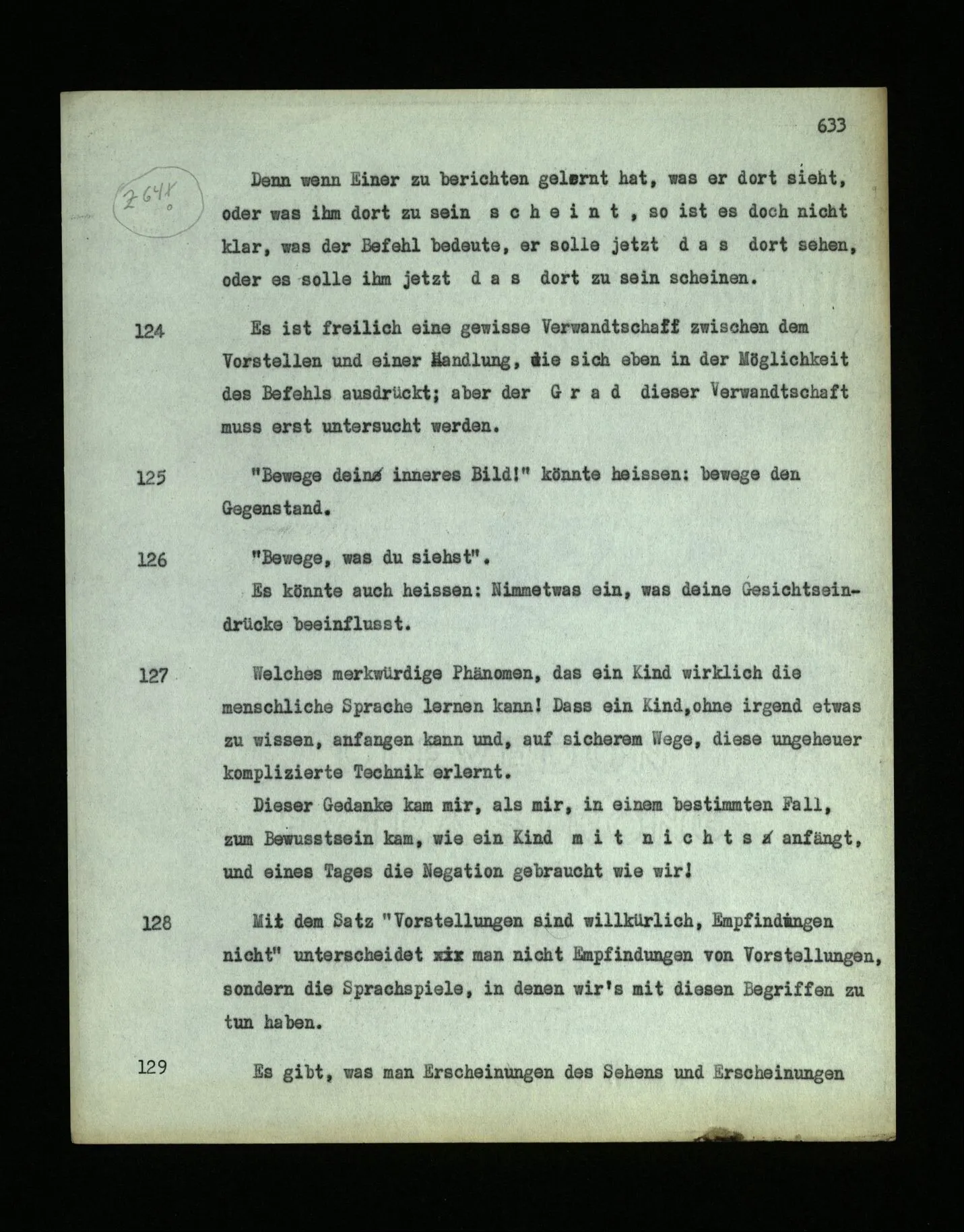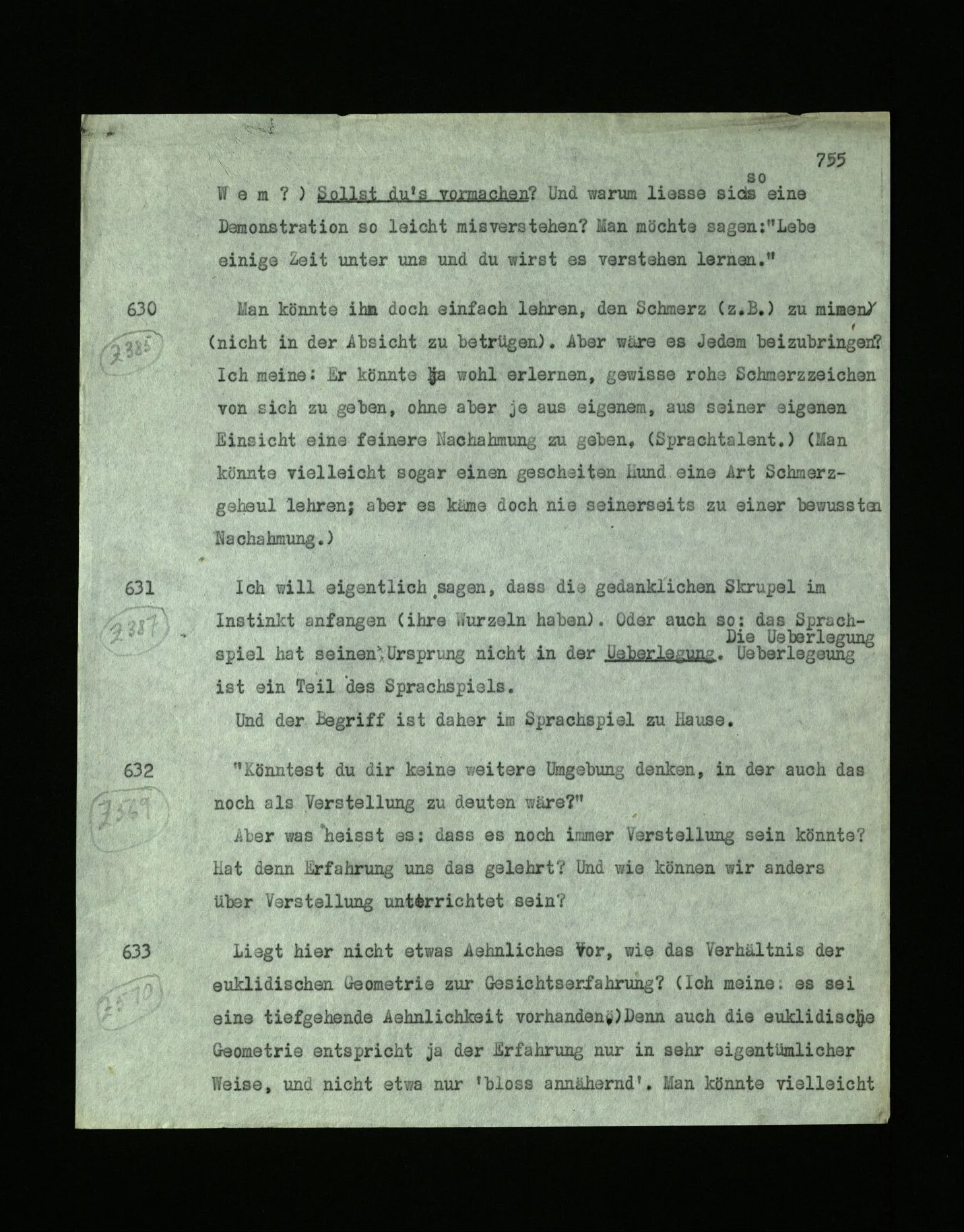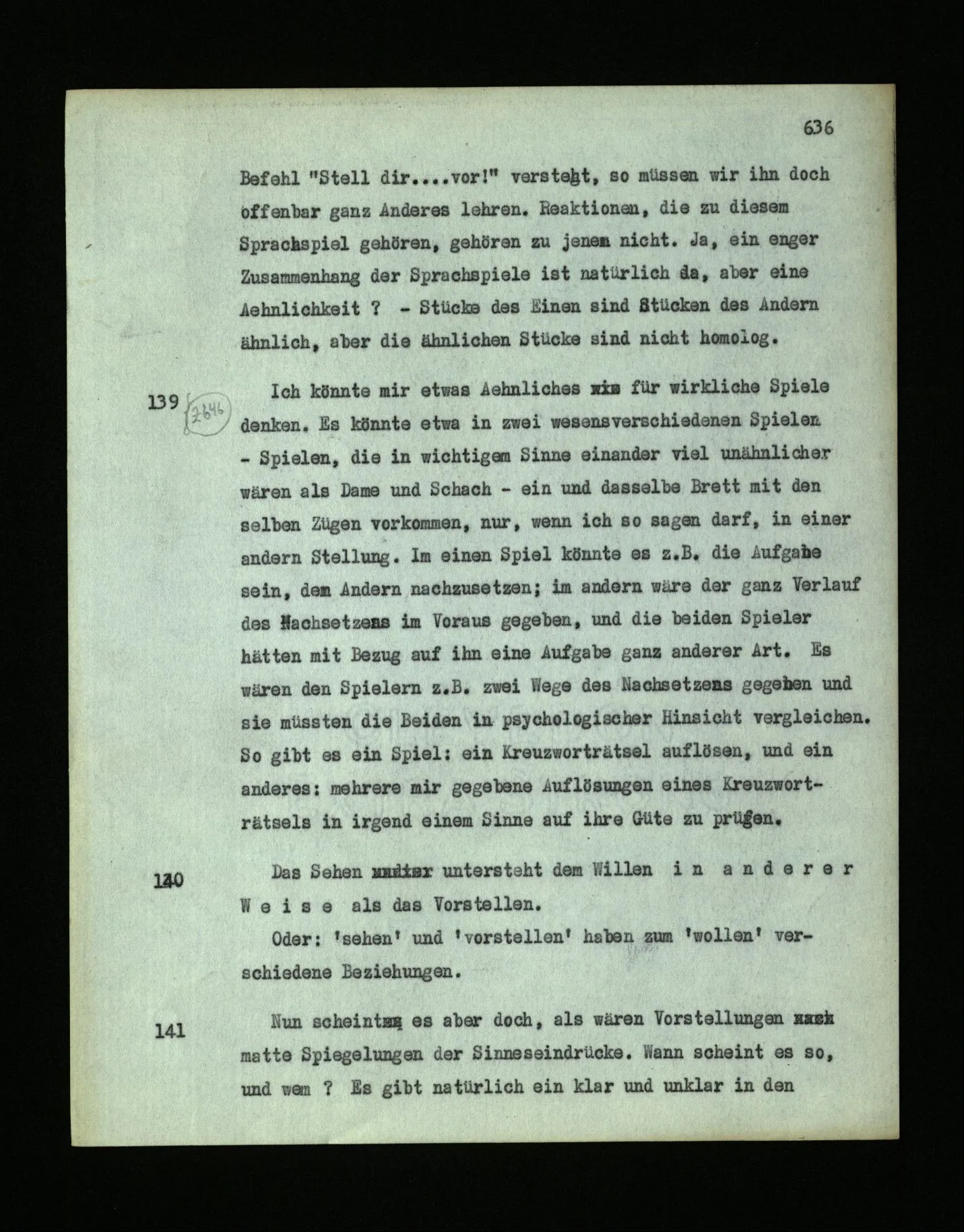 029 “Die Menschen denken manchmal.” Wie habe ich gelernt, was “denken” heißt? – Es scheint, ich kann nur gelernt haben, indem ich mit Menschen lebte. – Man könnte sich freilich denken, daß Einem das Leben der Menschen im Film vorgeführt würde, oder daß er das Leben nur beobachten dürfte, ohne mitzutun. Er würde ihr Leben dann etwa verstehen wie wir das Leben der Fische verstehen oder gar der Pflanzen. Von Lust und Leid etc. der Fische können wir nicht reden.