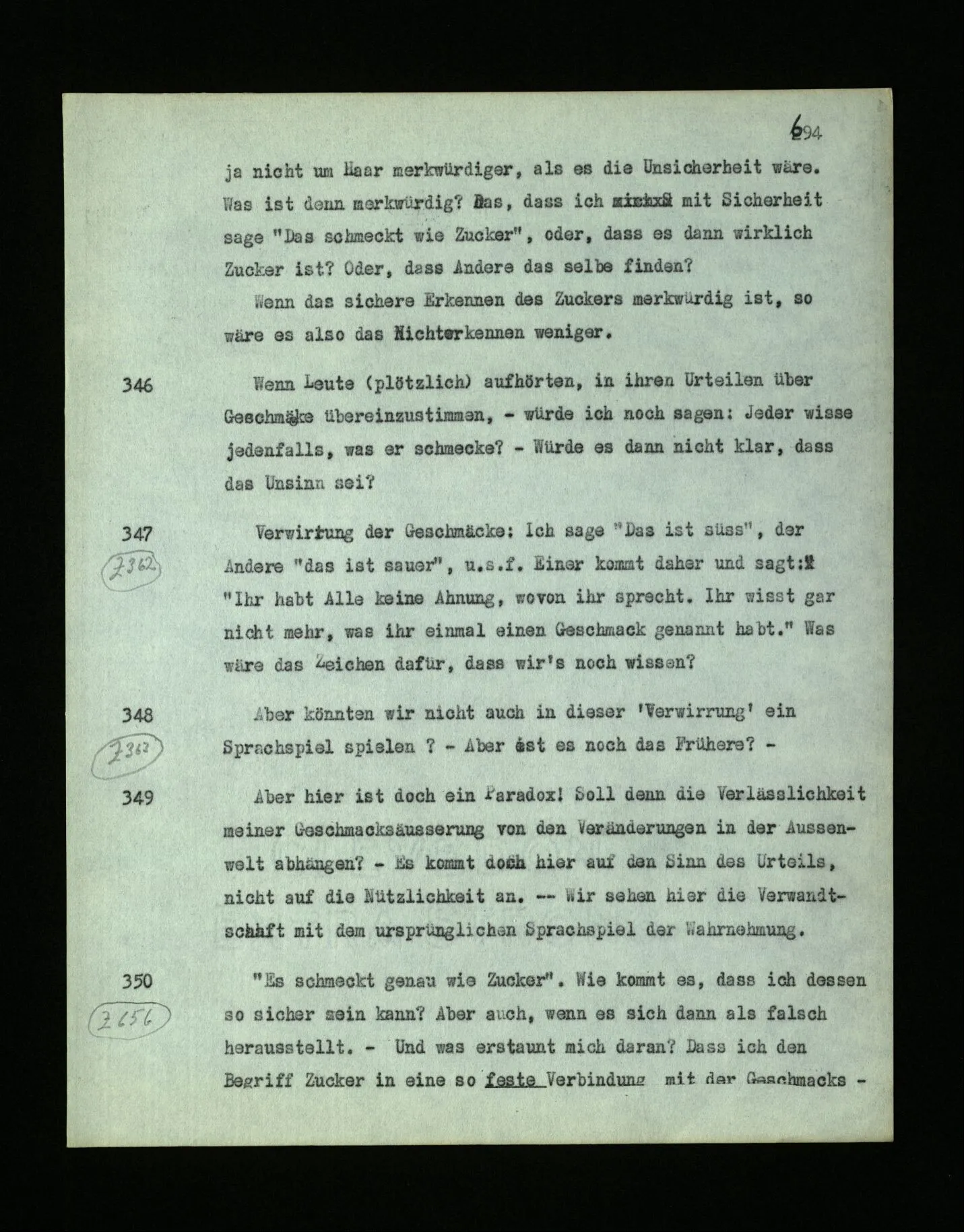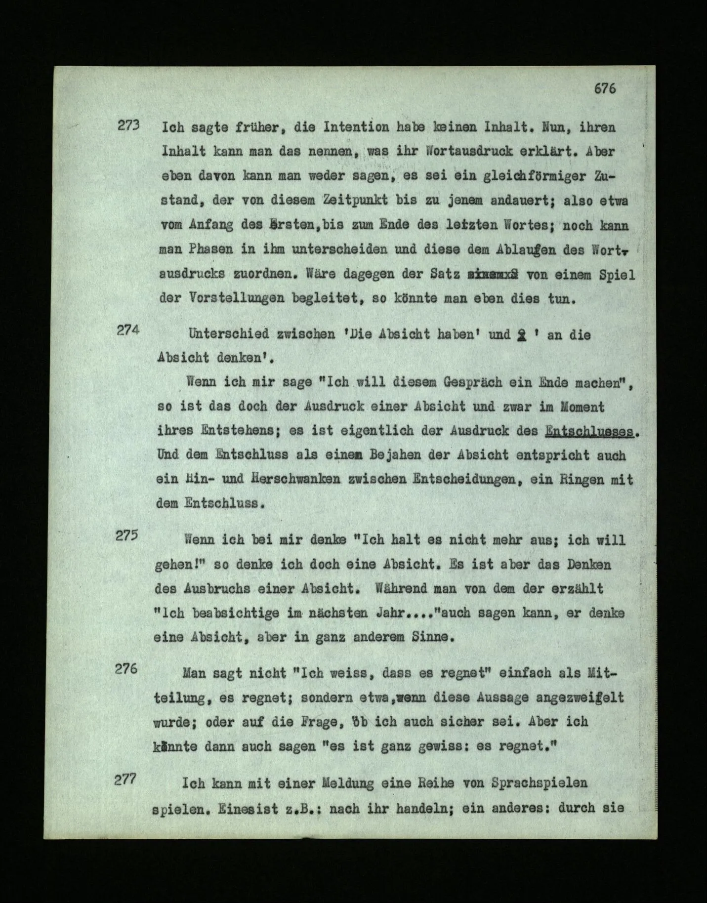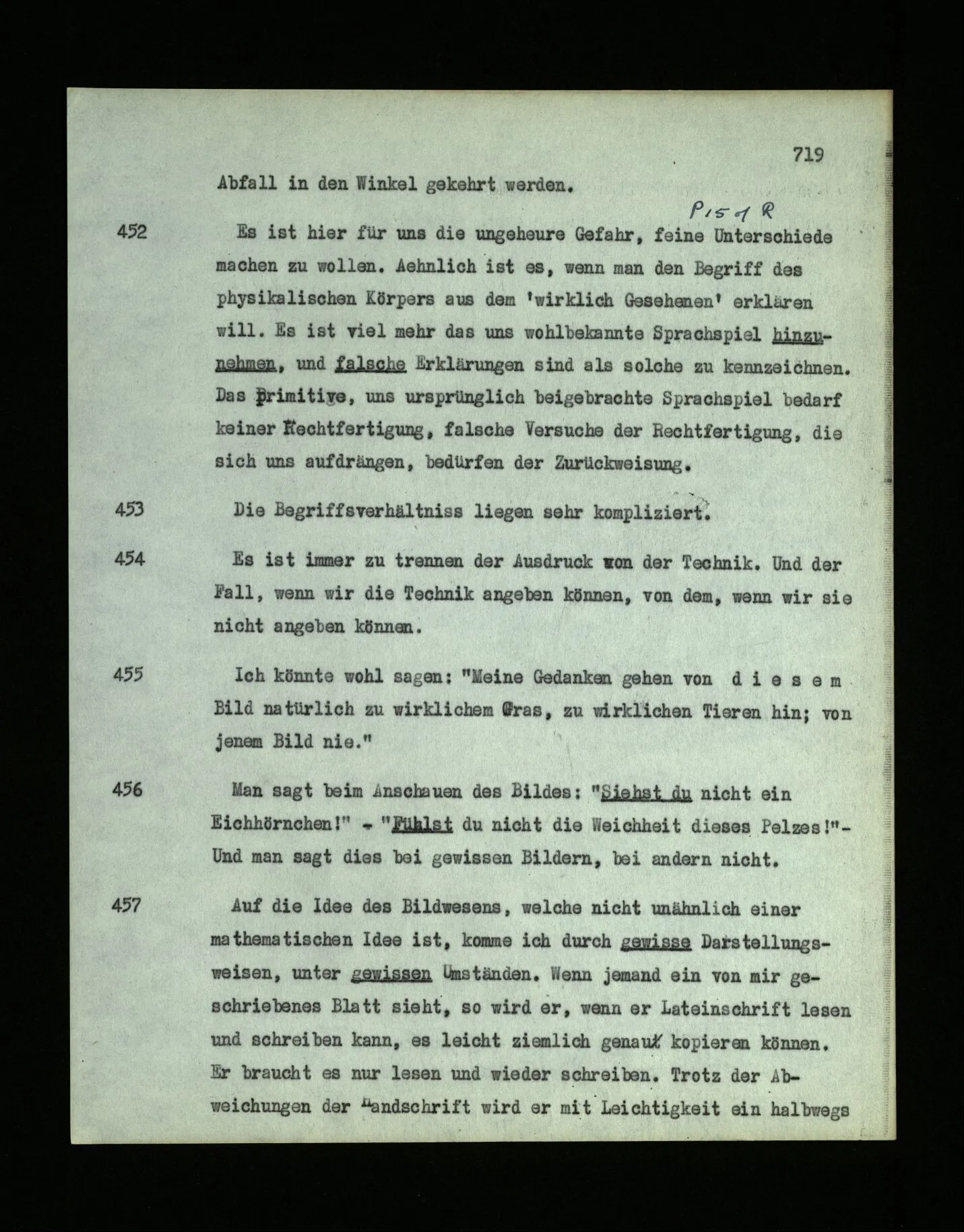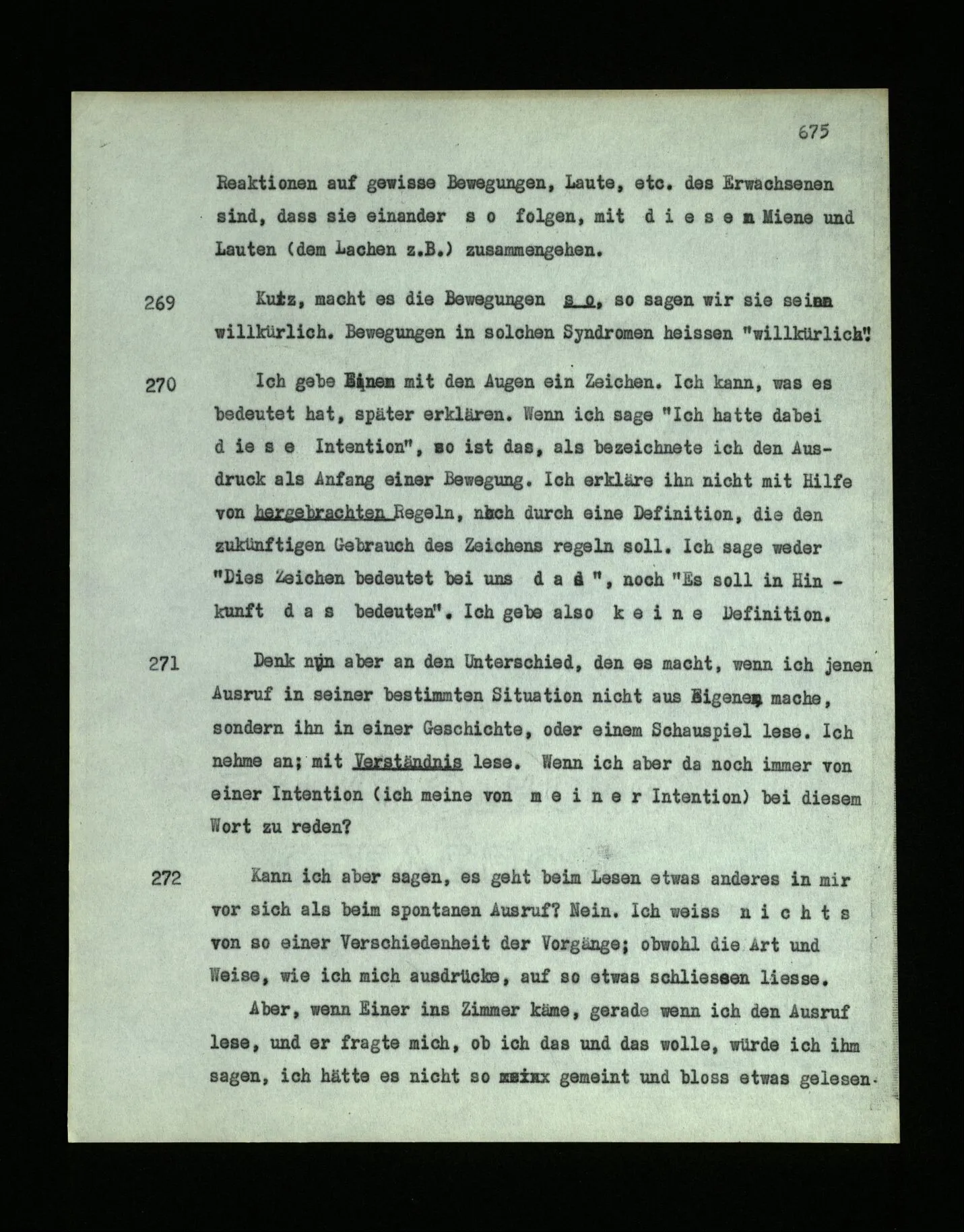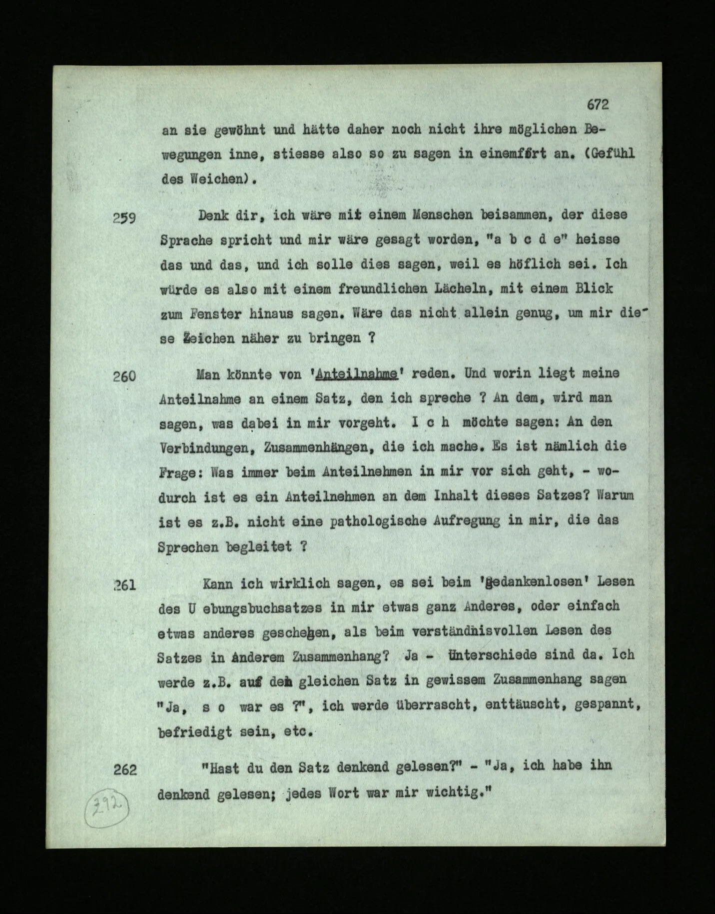 029 “Die Menschen denken manchmal.” Wie habe ich gelernt, was “denken” heißt? – Es scheint, ich kann nur gelernt haben, indem ich mit Menschen lebte. – Man könnte sich freilich denken, daß Einem das Leben der Menschen im Film vorgeführt würde, oder daß er das Leben nur beobachten dürfte, ohne mitzutun. Er würde ihr Leben dann etwa verstehen wie wir das Leben der Fische verstehen oder gar der Pflanzen. Von Lust und Leid etc. der Fische können wir nicht reden.