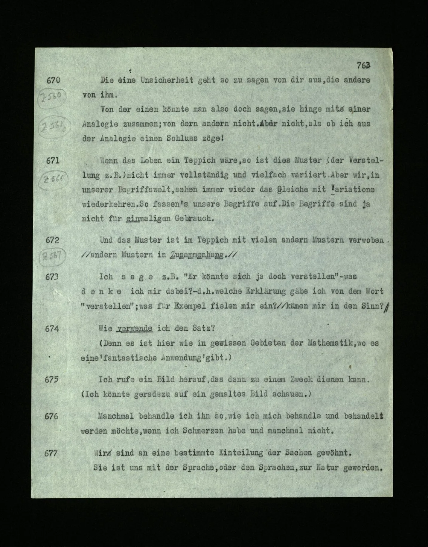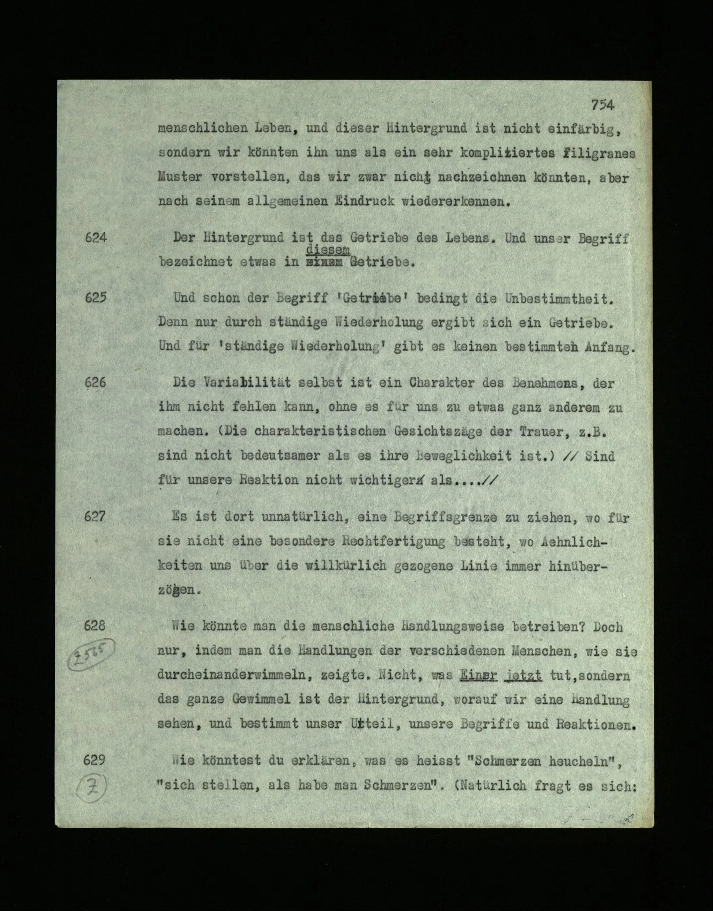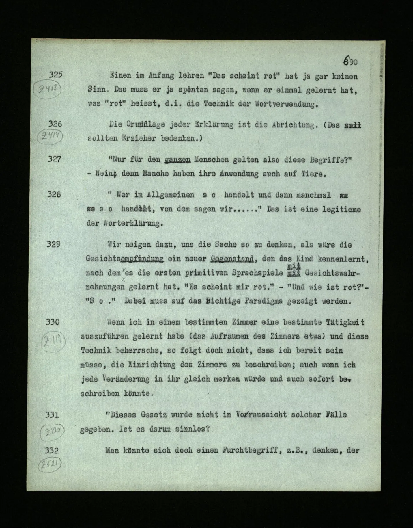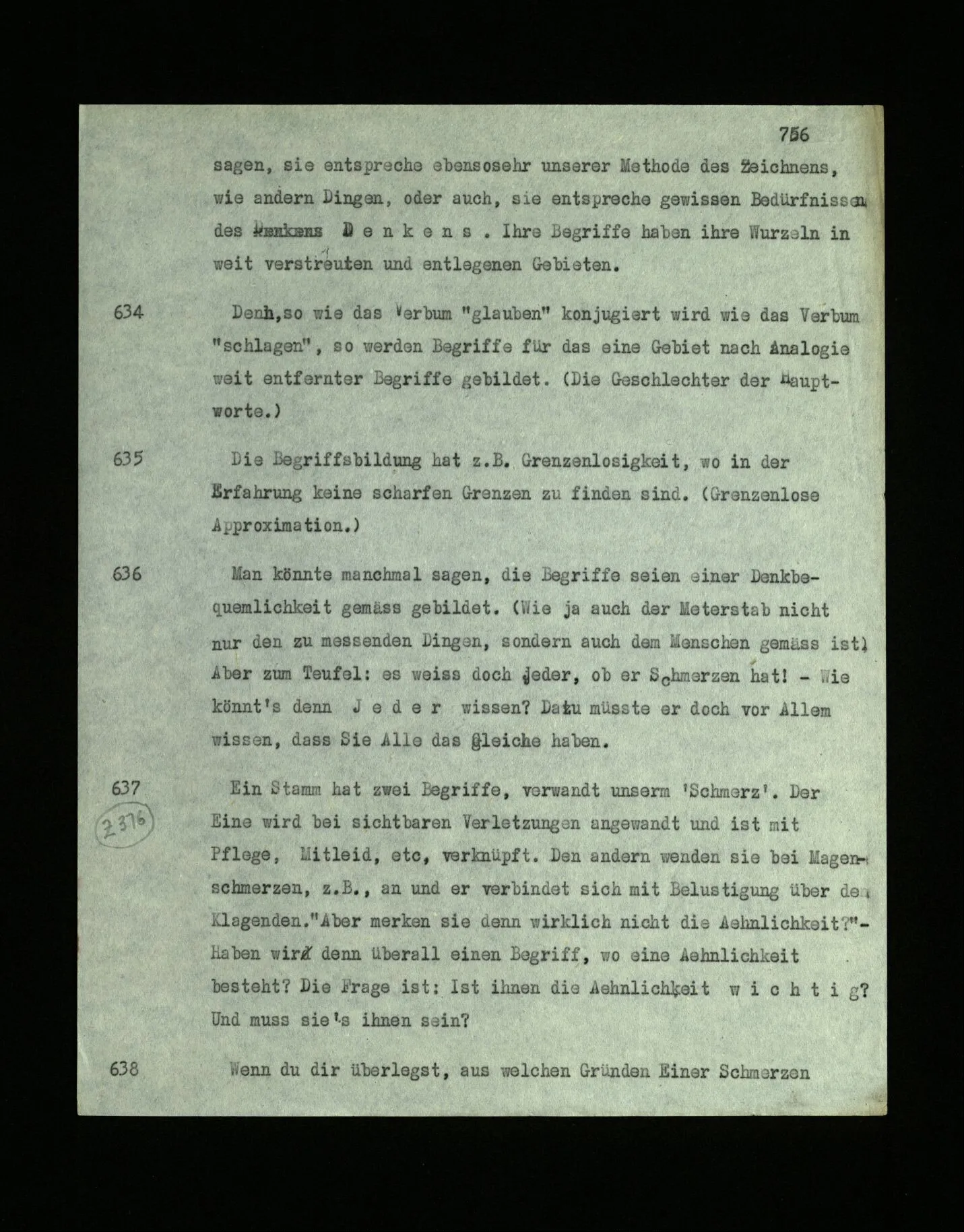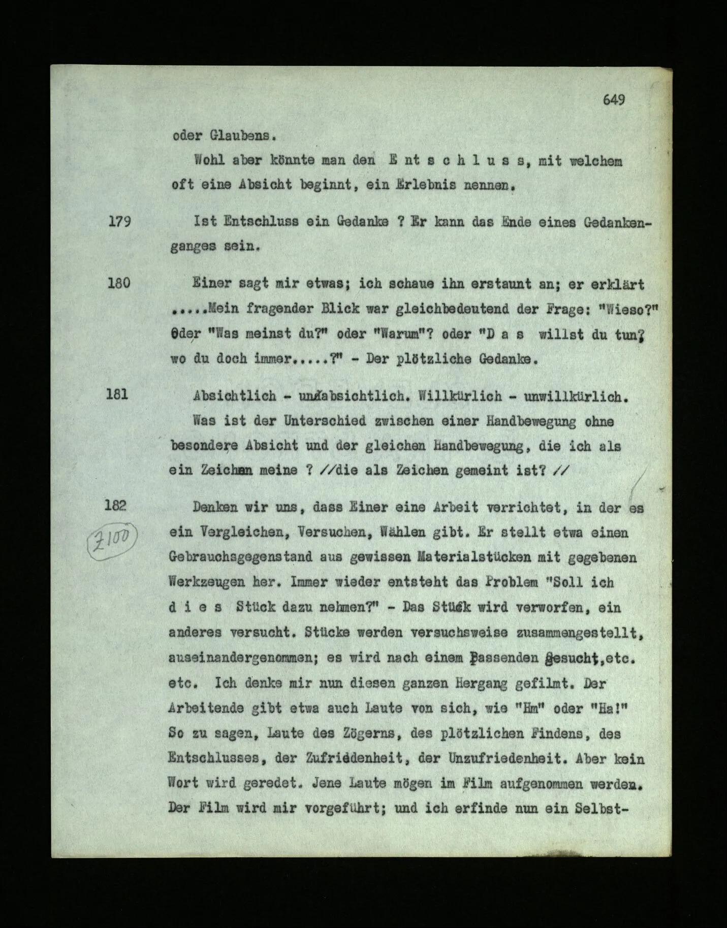 029 “Die Menschen denken manchmal.” Wie habe ich gelernt, was “denken” heißt? – Es scheint, ich kann nur gelernt haben, indem ich mit Menschen lebte. – Man könnte sich freilich denken, daß Einem das Leben der Menschen im Film vorgeführt würde, oder daß er das Leben nur beobachten dürfte, ohne mitzutun. Er würde ihr Leben dann etwa verstehen wie wir das Leben der Fische verstehen oder gar der Pflanzen. Von Lust und Leid etc. der Fische können wir nicht reden.
