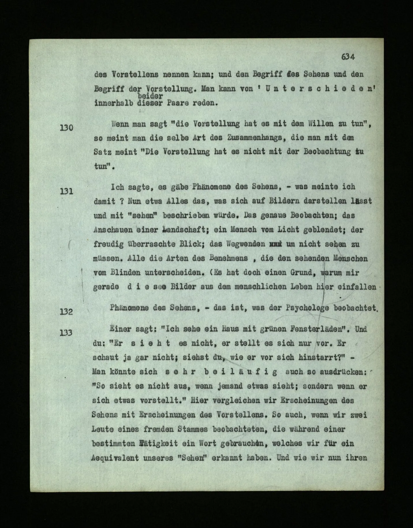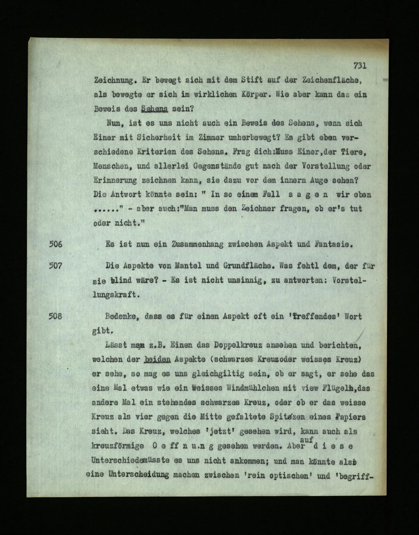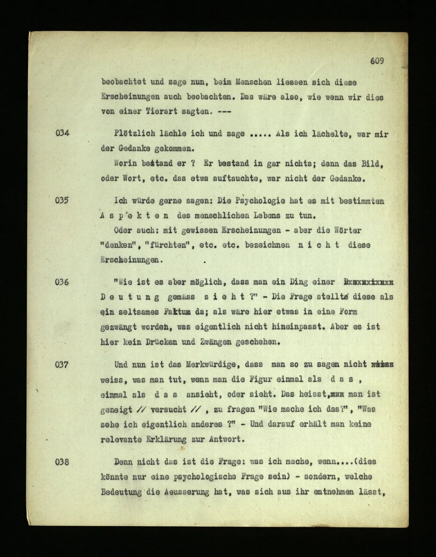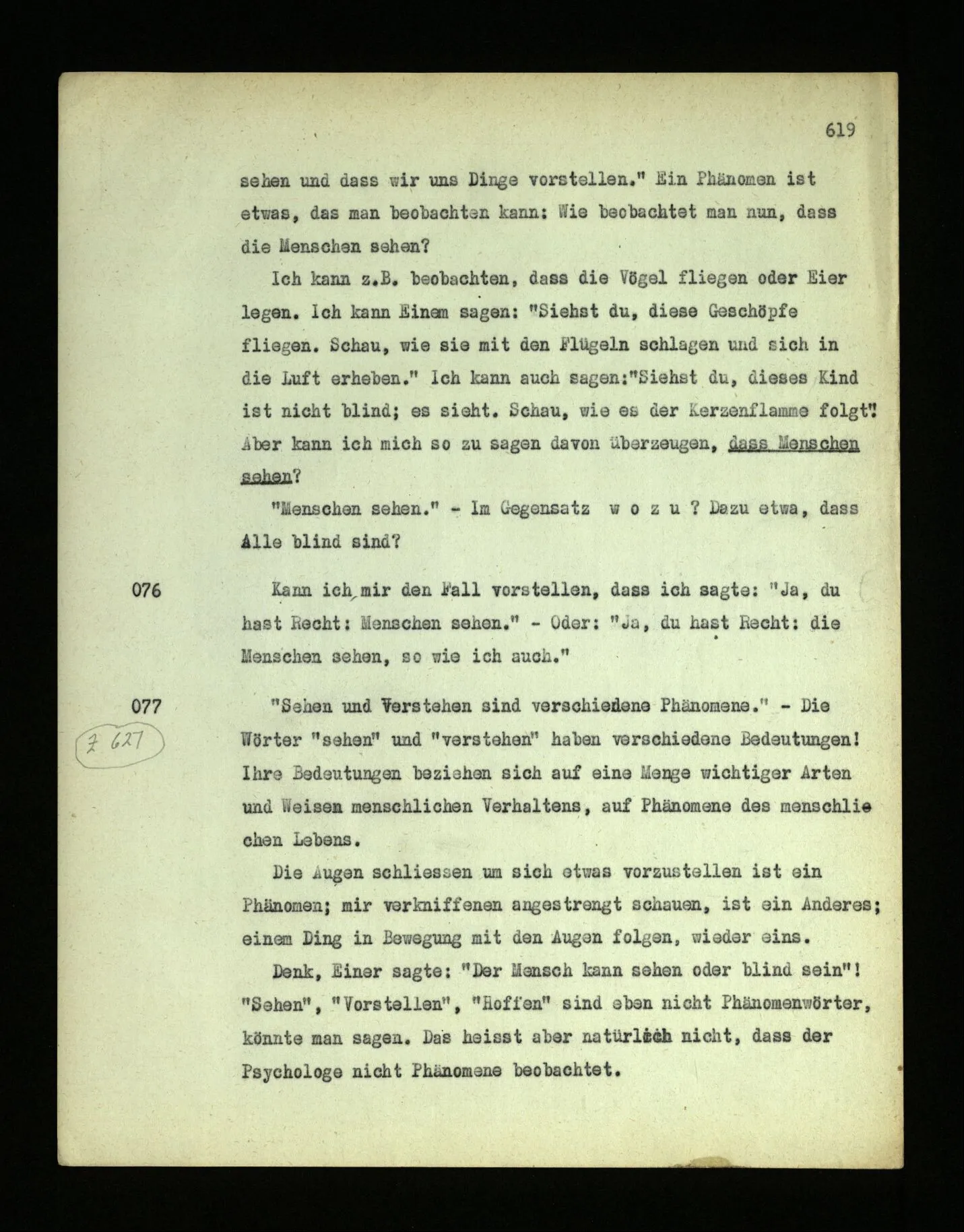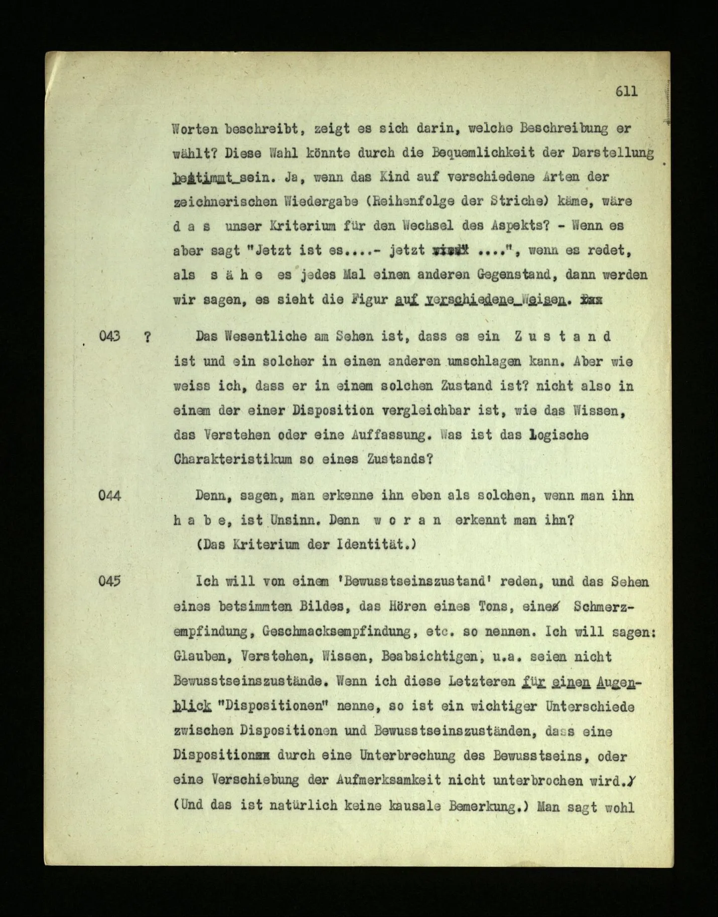 043 Das Wesentliche am Sehen ist, daß es ein Zustand ist und ein solcher in einen anderen umschlagen kann. Aber wie weiß ich, daß er in einem solchen Zustand ist? nicht also in einem der einer Disposition vergleichbar ist, wie das Wissen, das Verstehen oder eine Auffassung. Was ist das logische Charakteristikum so eines Zustands?