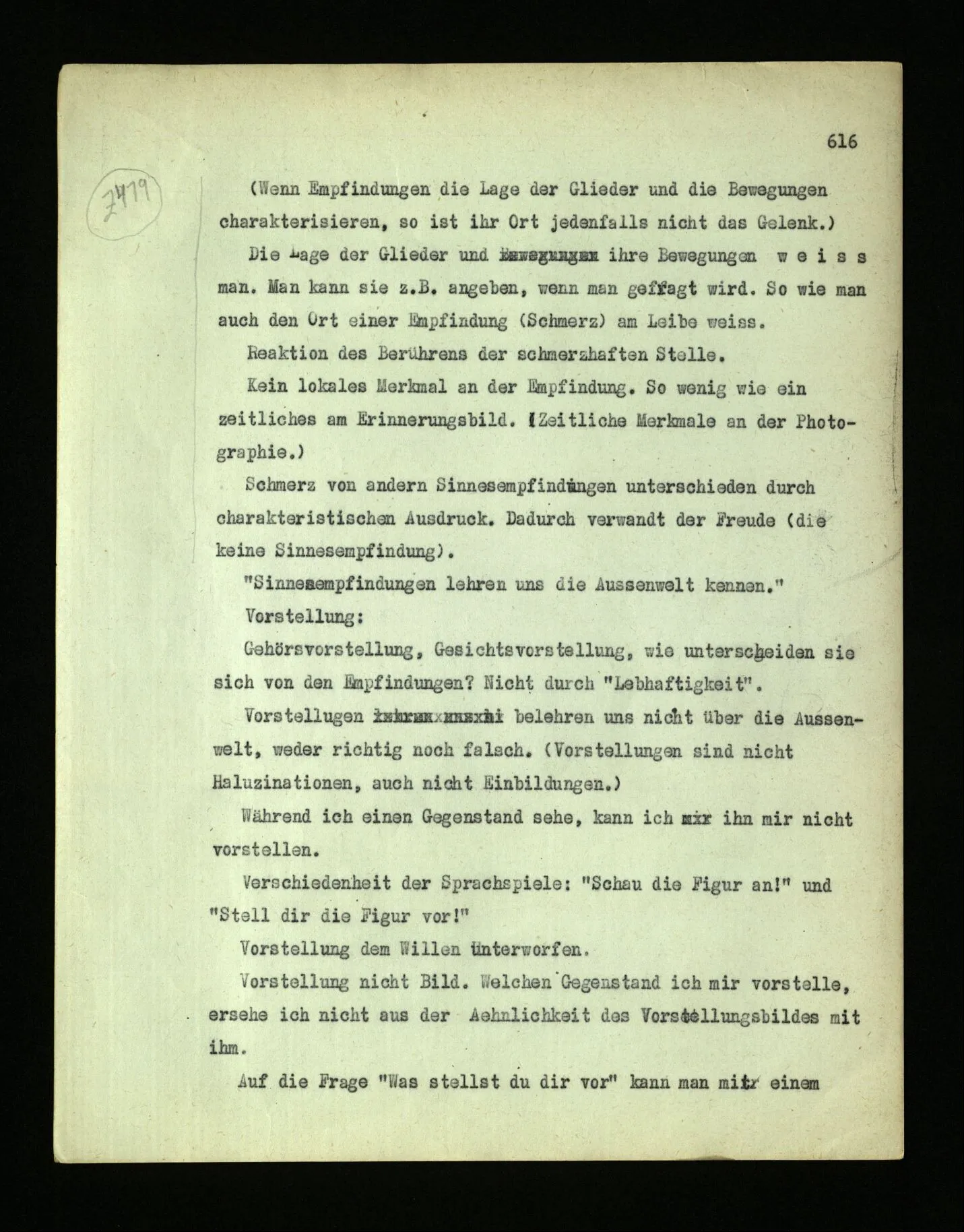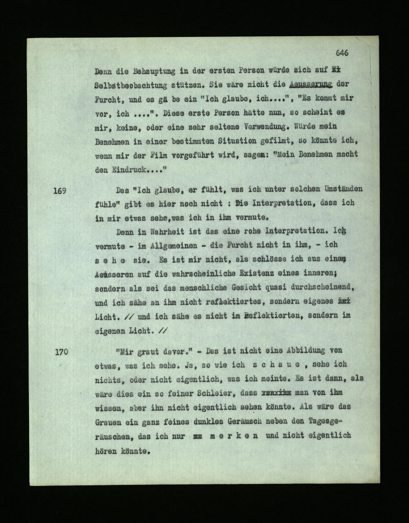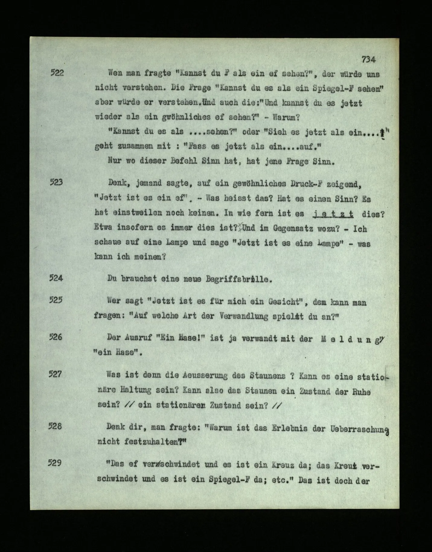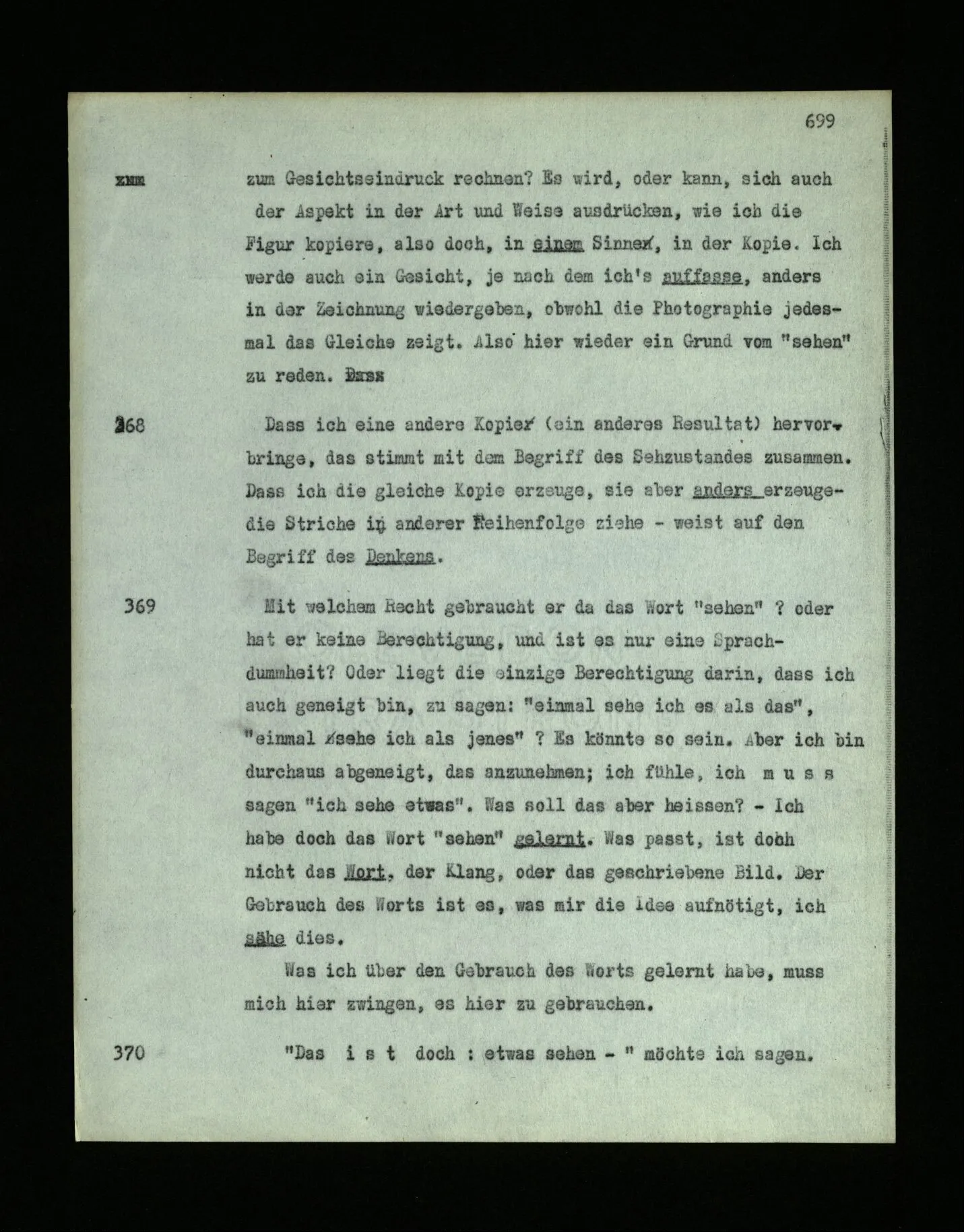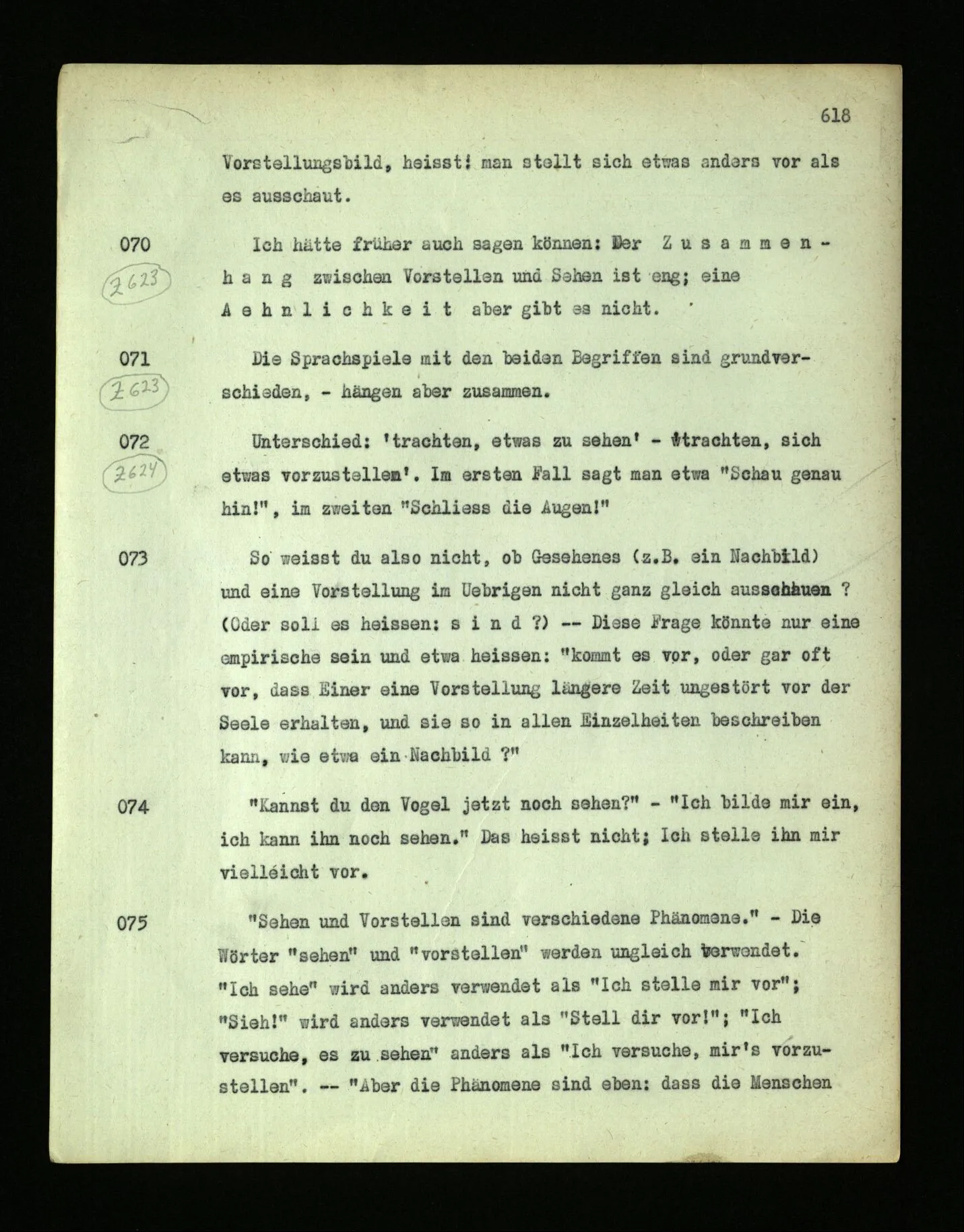 043 Das Wesentliche am Sehen ist, daß es ein Zustand ist und ein solcher in einen anderen umschlagen kann. Aber wie weiß ich, daß er in einem solchen Zustand ist? nicht also in einem der einer Disposition vergleichbar ist, wie das Wissen, das Verstehen oder eine Auffassung. Was ist das logische Charakteristikum so eines Zustands?