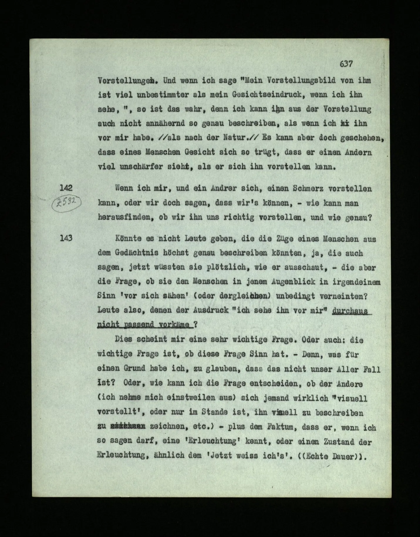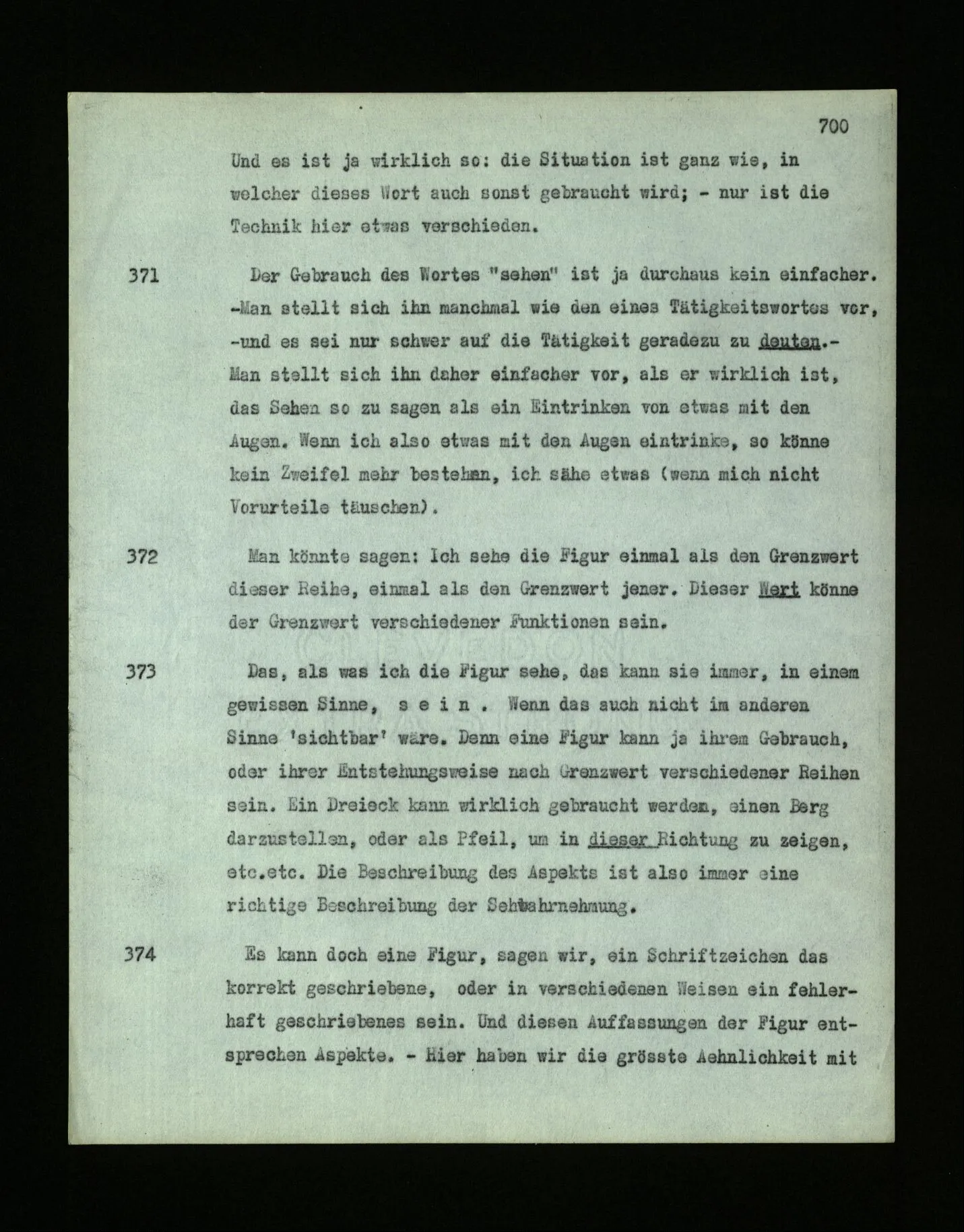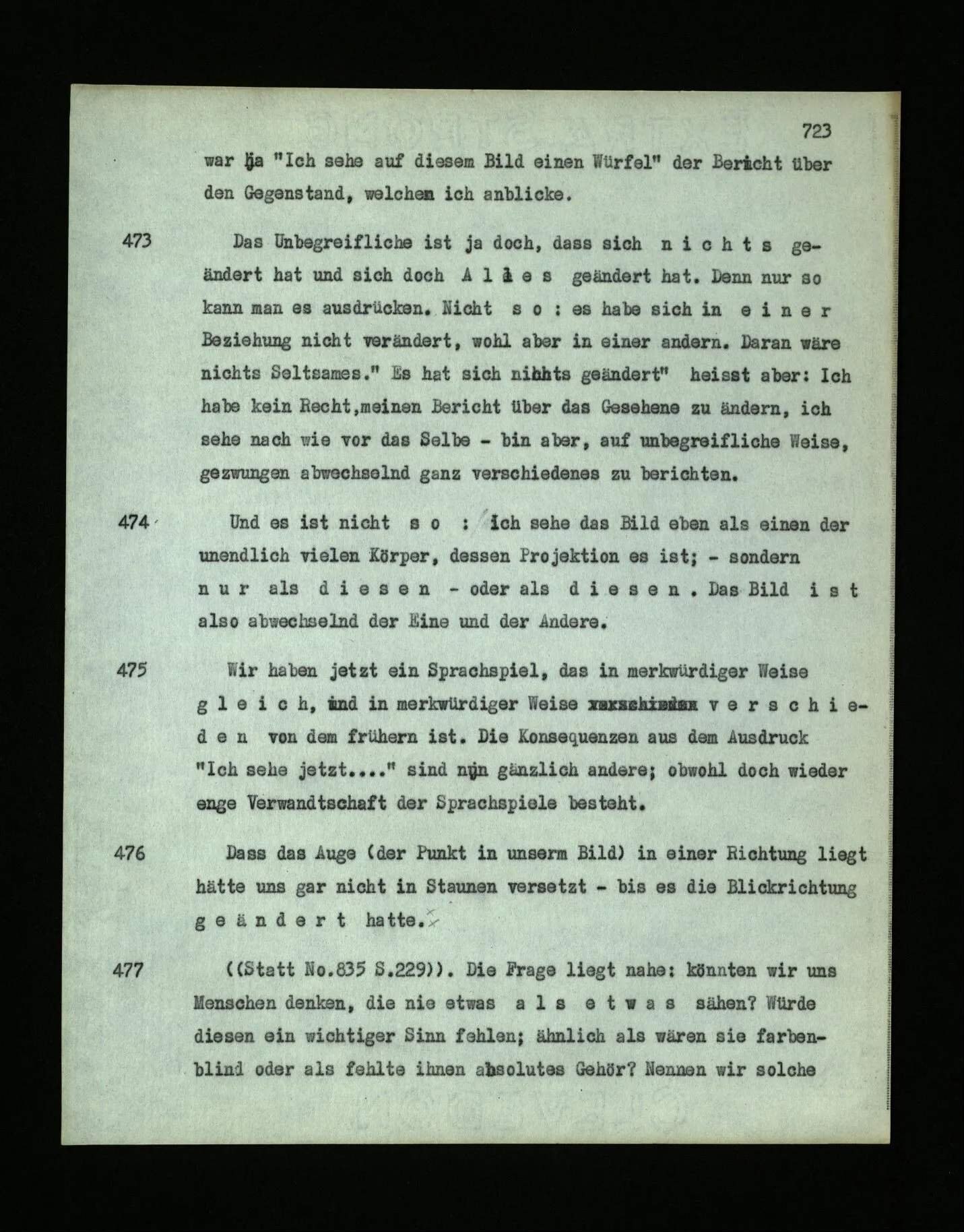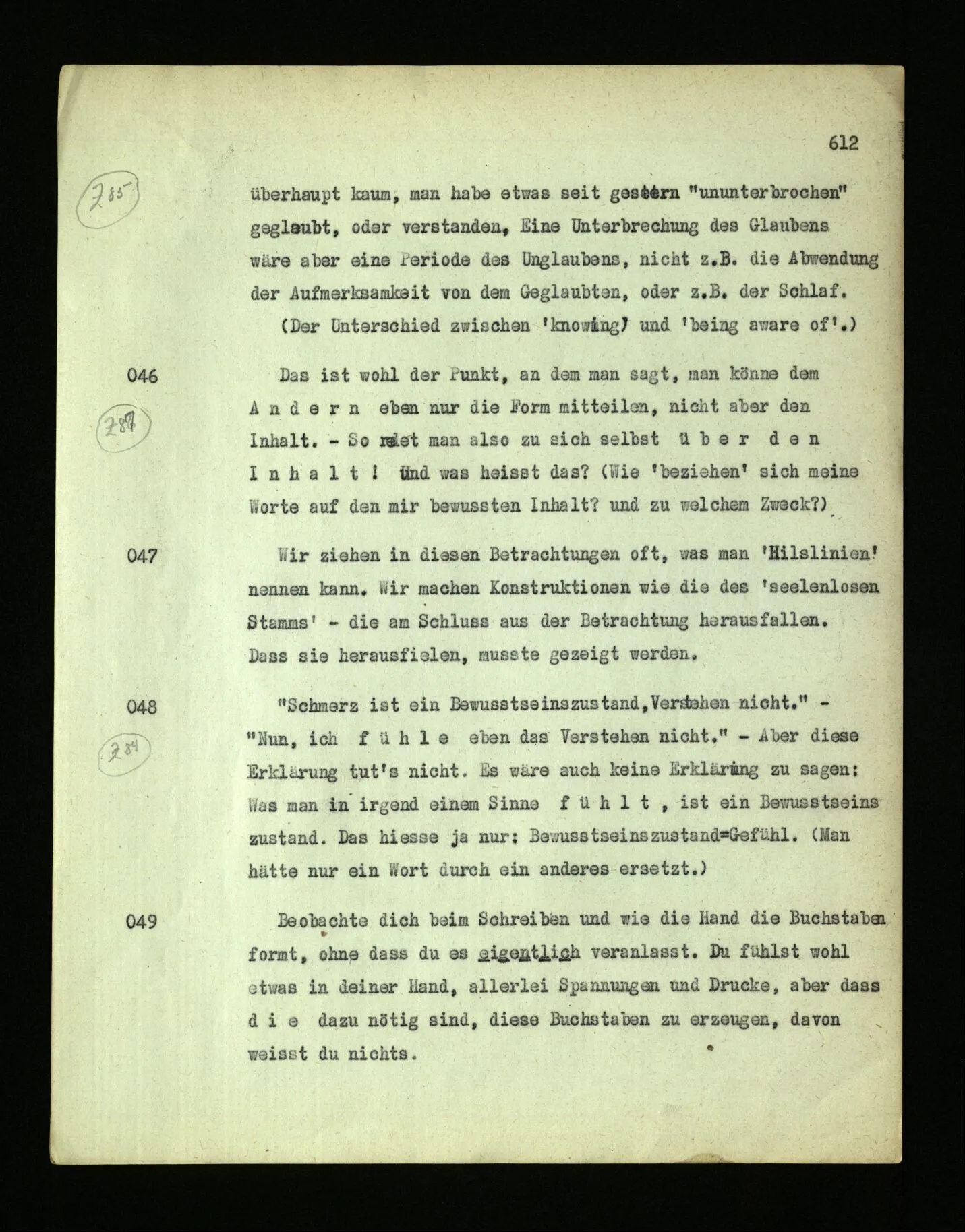 043 Das Wesentliche am Sehen ist, daß es ein Zustand ist und ein solcher in einen anderen umschlagen kann. Aber wie weiß ich, daß er in einem solchen Zustand ist? nicht also in einem der einer Disposition vergleichbar ist, wie das Wissen, das Verstehen oder eine Auffassung. Was ist das logische Charakteristikum so eines Zustands?