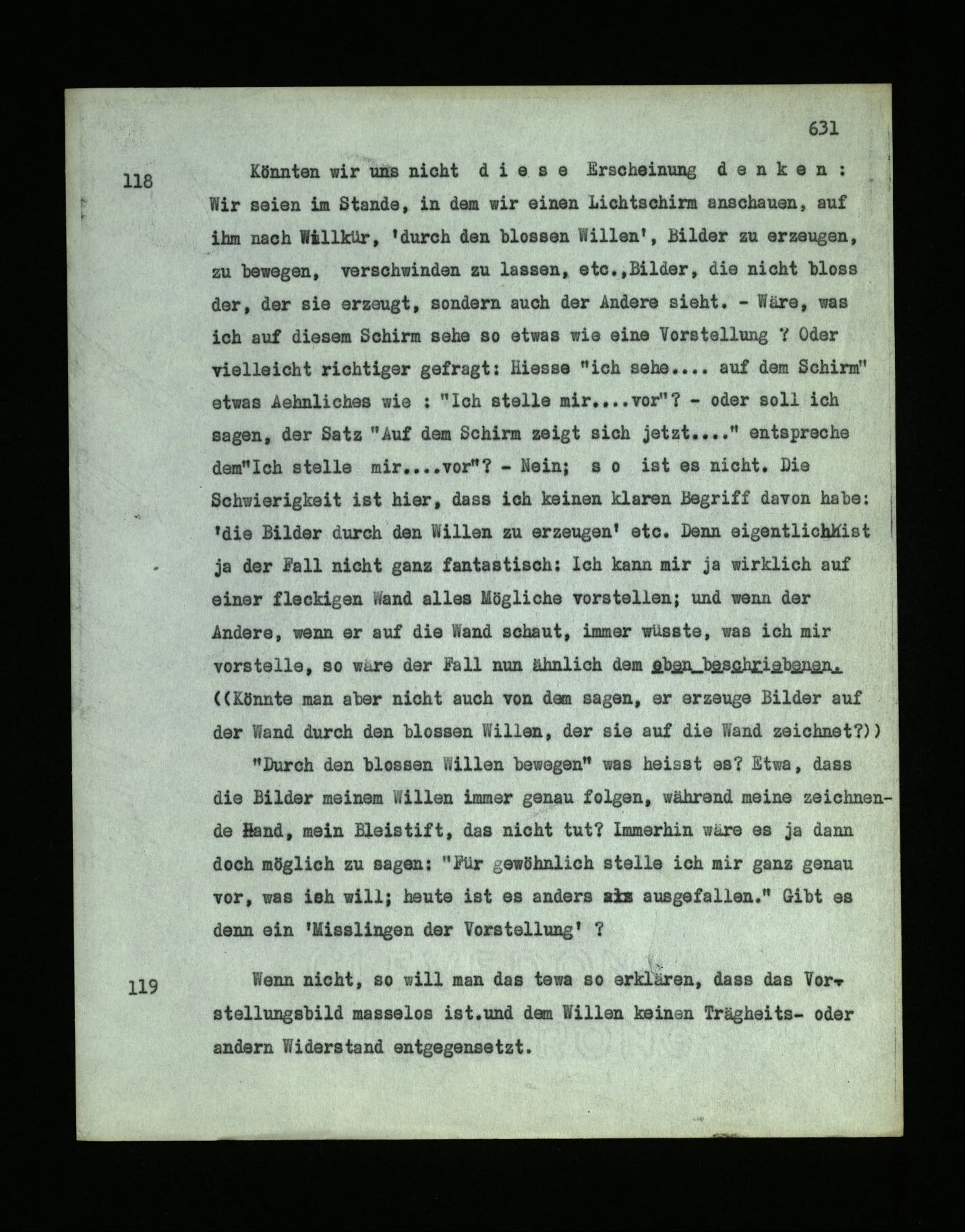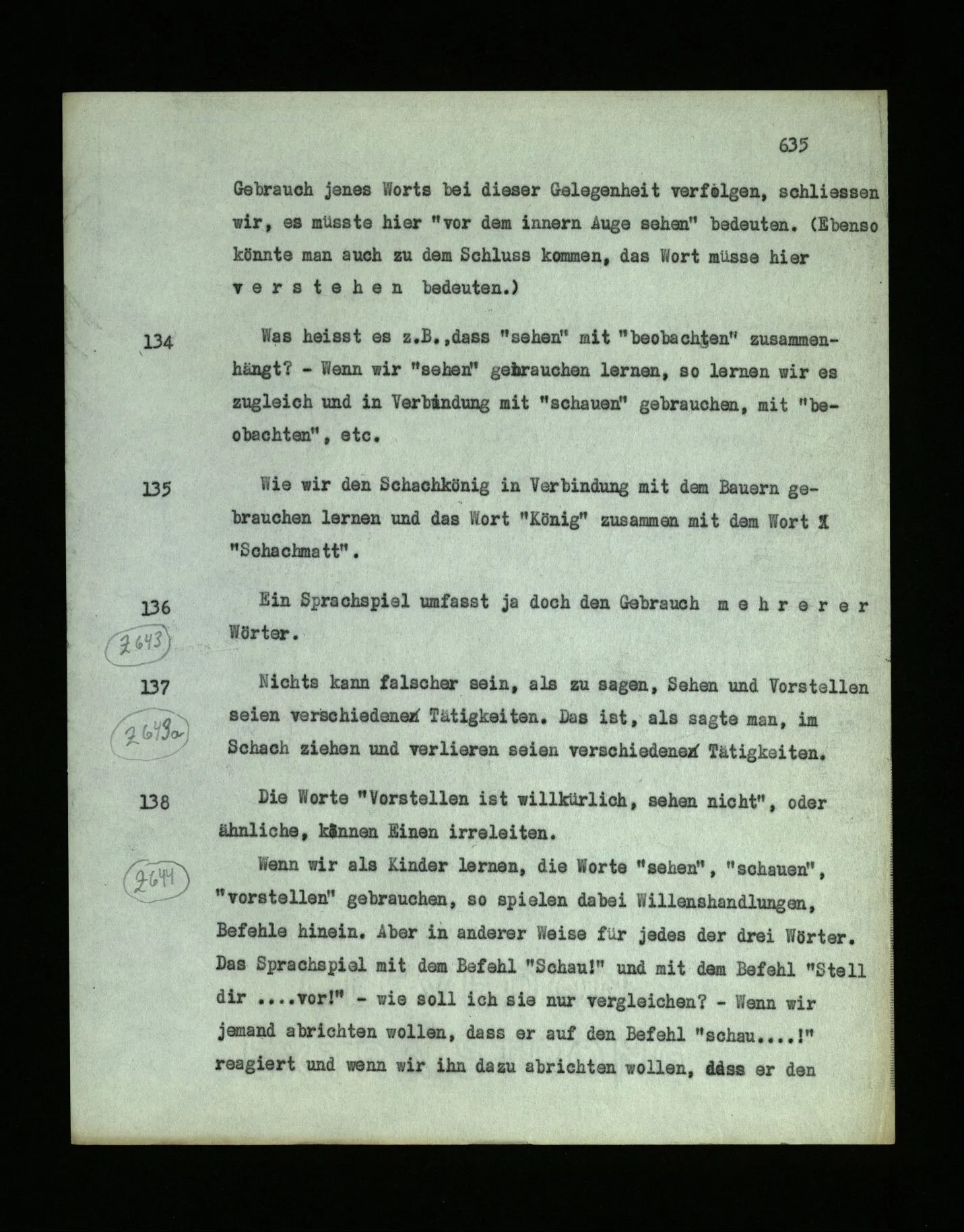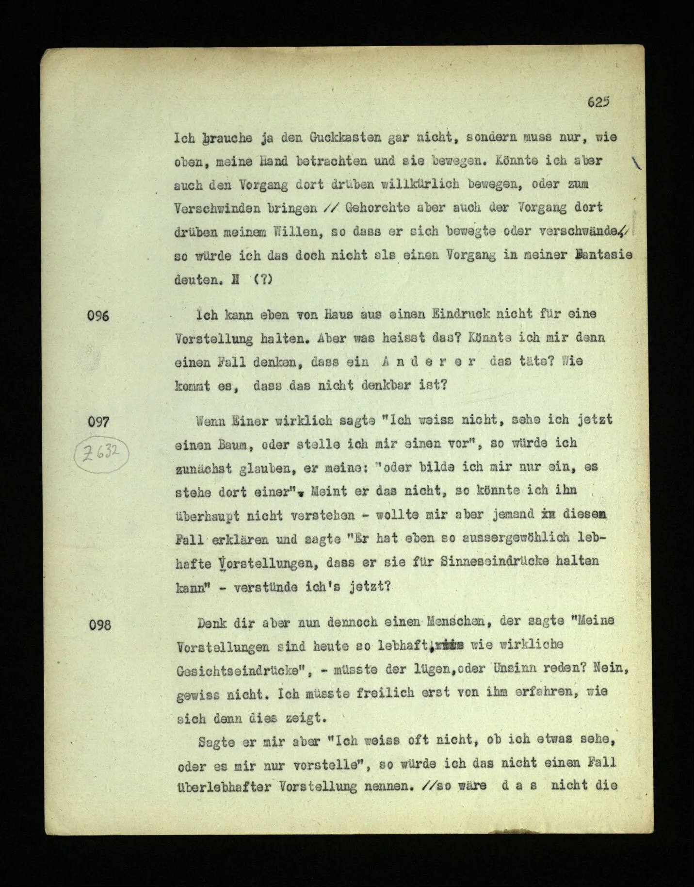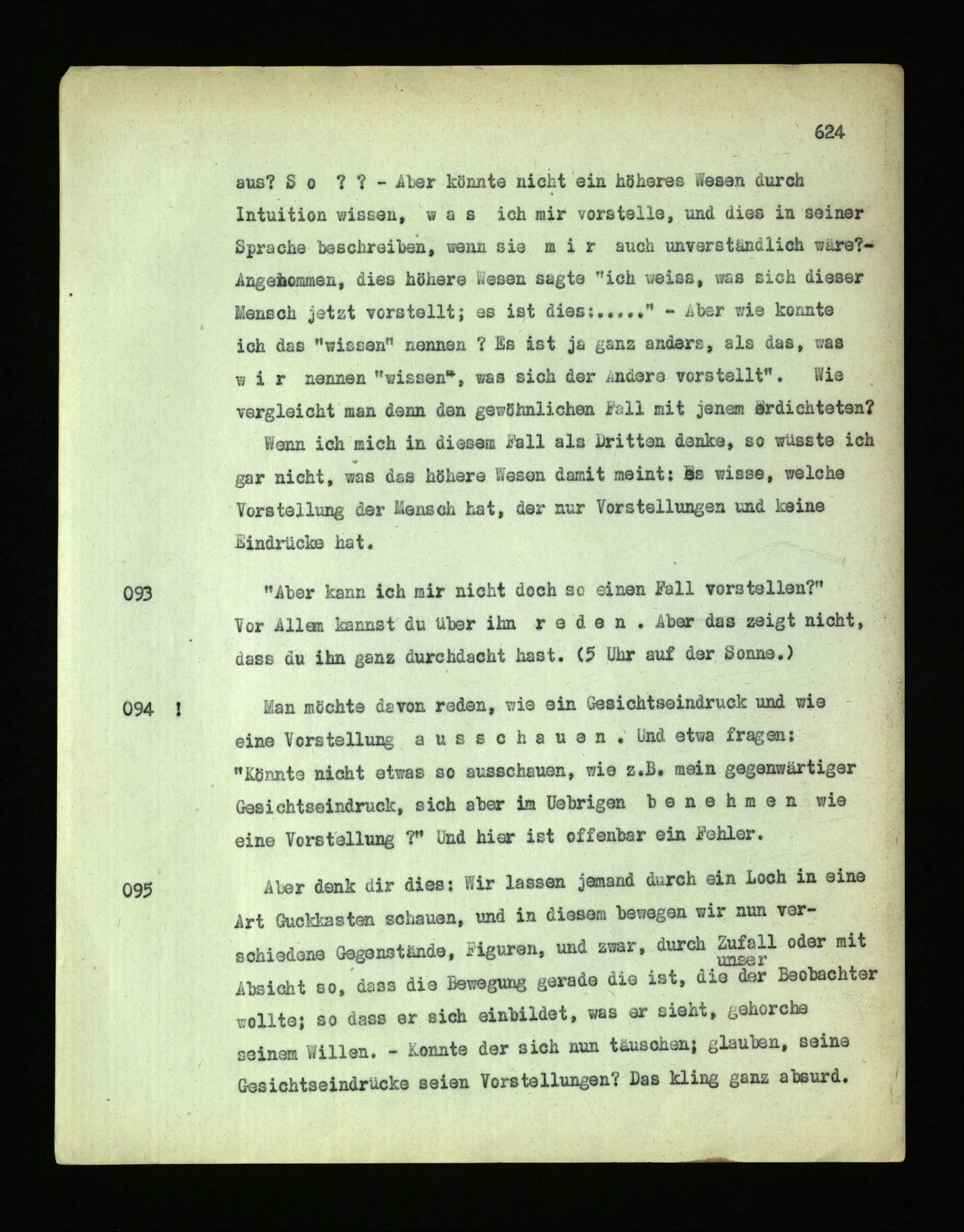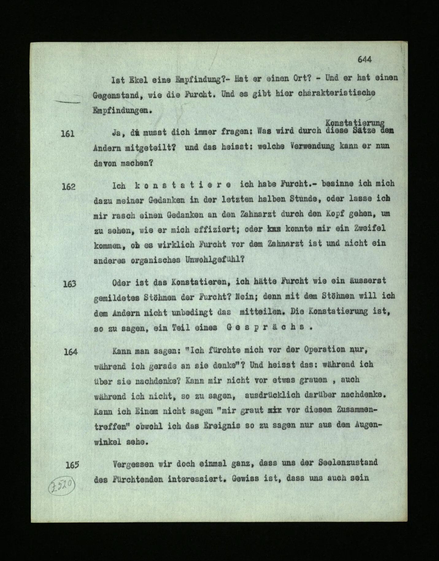 043 Das Wesentliche am Sehen ist, daß es ein Zustand ist und ein solcher in einen anderen umschlagen kann. Aber wie weiß ich, daß er in einem solchen Zustand ist? nicht also in einem der einer Disposition vergleichbar ist, wie das Wissen, das Verstehen oder eine Auffassung. Was ist das logische Charakteristikum so eines Zustands?