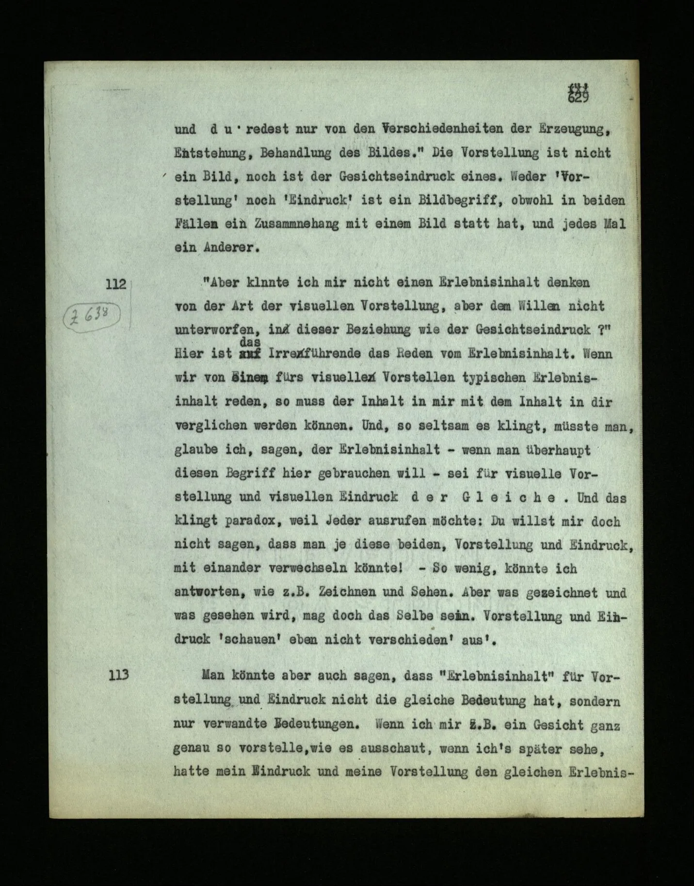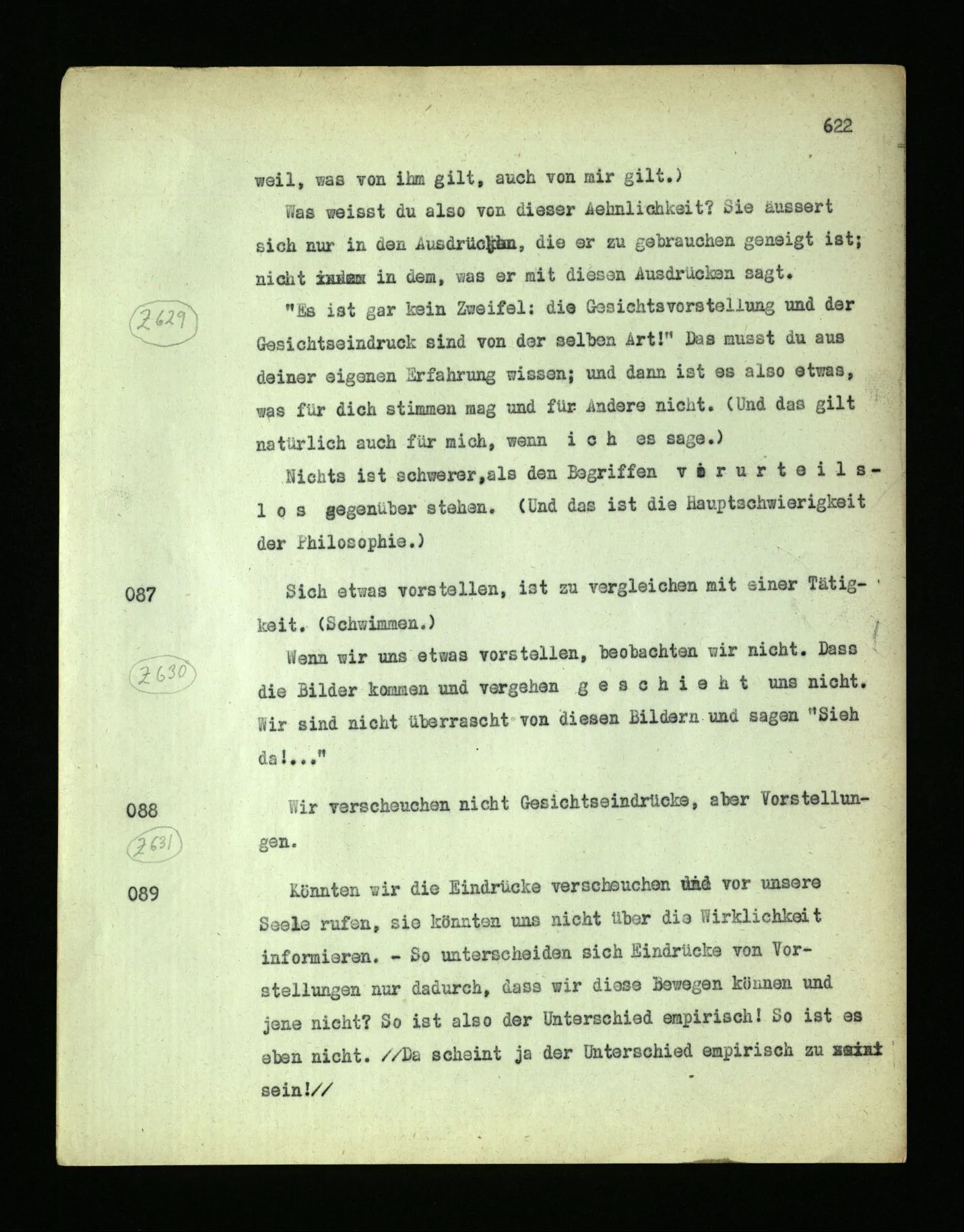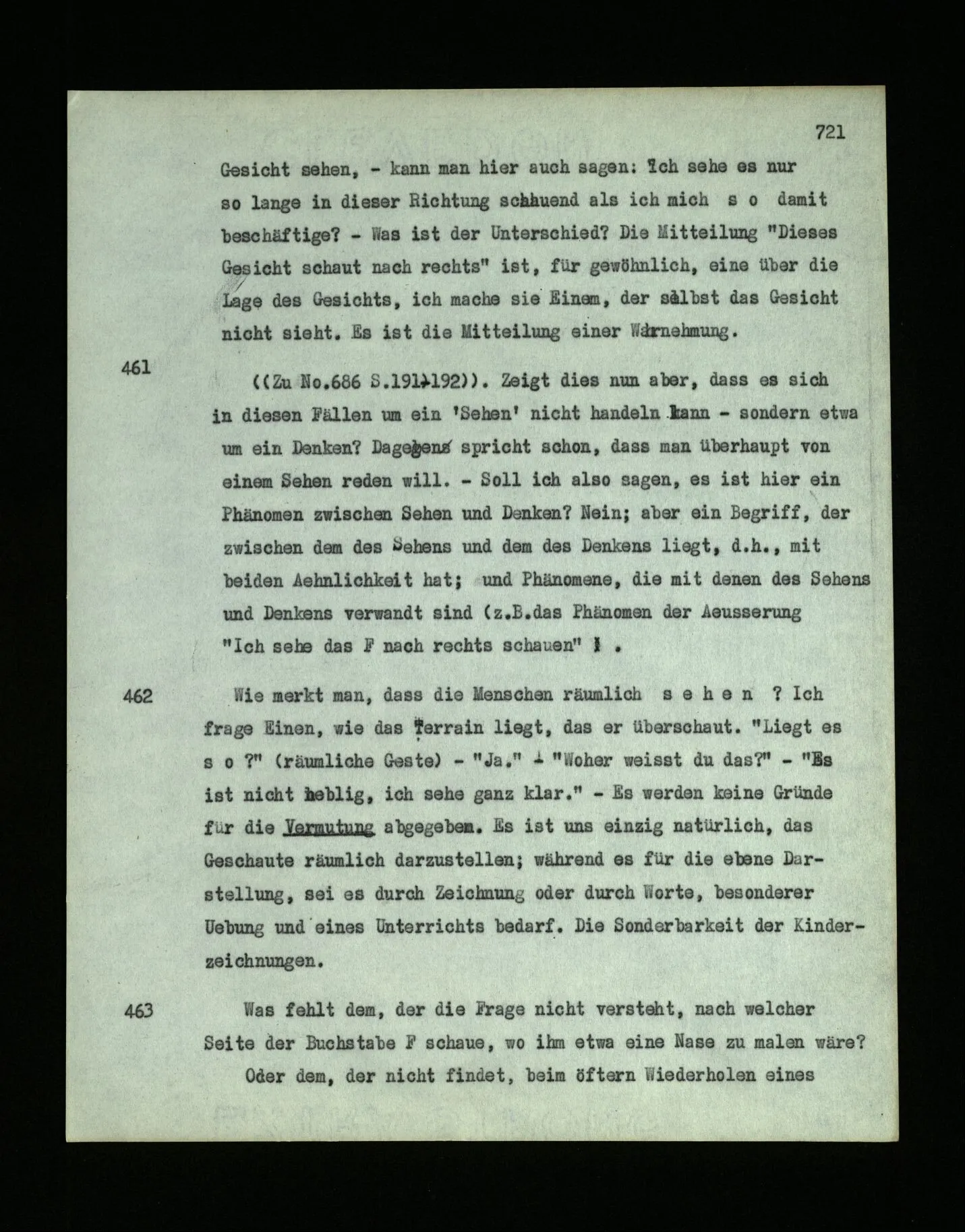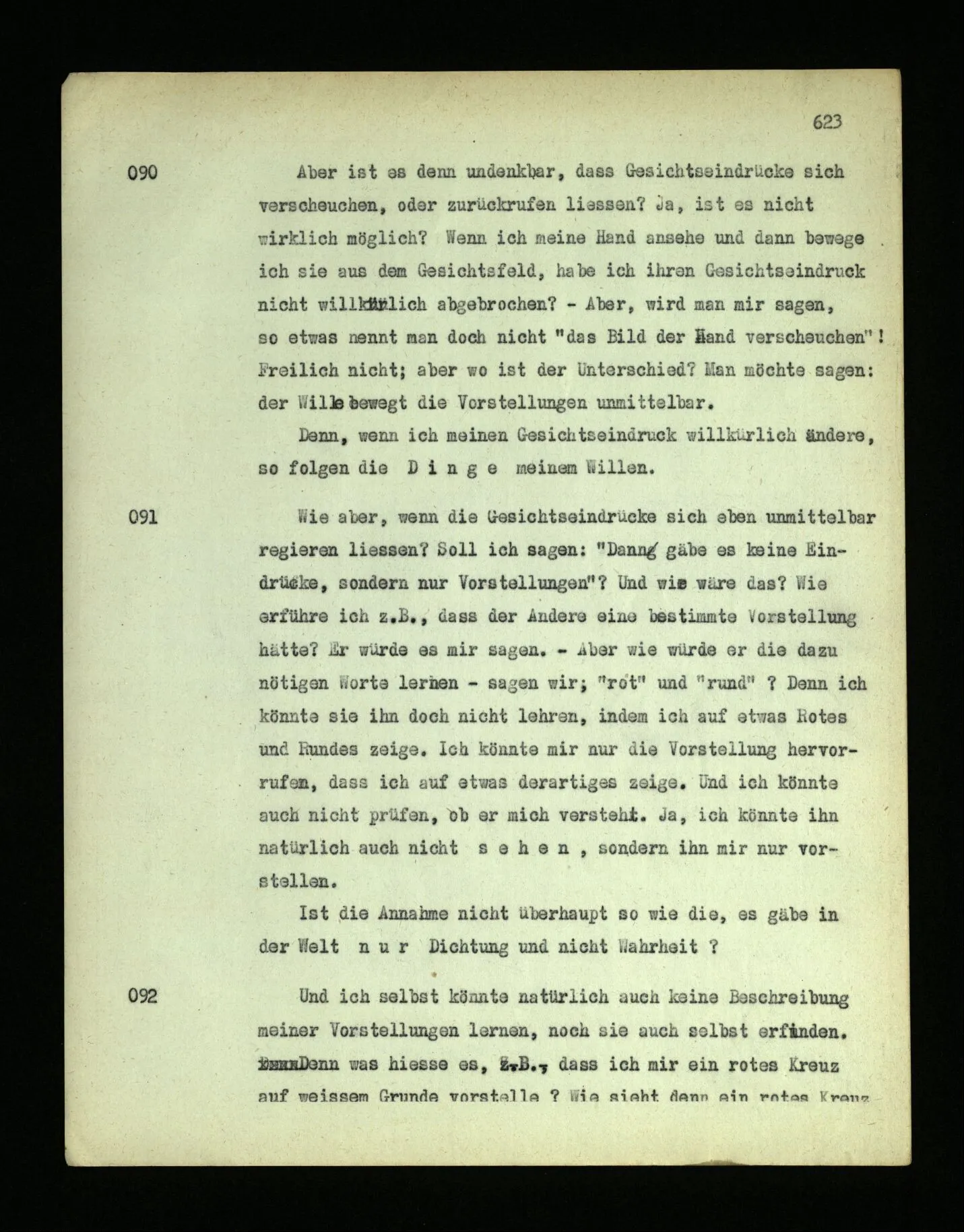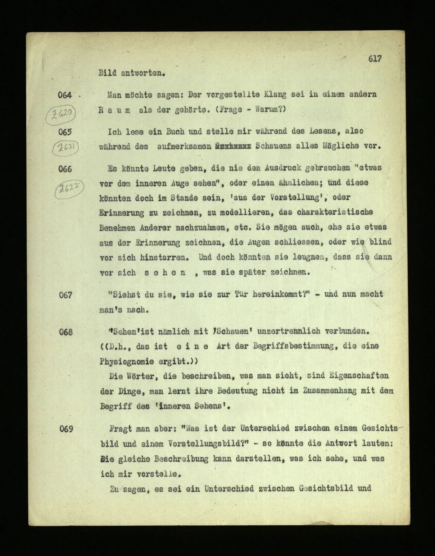043 Das Wesentliche am Sehen ist, daß es ein Zustand ist und ein solcher in einen anderen umschlagen kann. Aber wie weiß ich, daß er in einem solchen Zustand ist? nicht also in einem der einer Disposition vergleichbar ist, wie das Wissen, das Verstehen oder eine Auffassung. Was ist das logische Charakteristikum so eines Zustands?