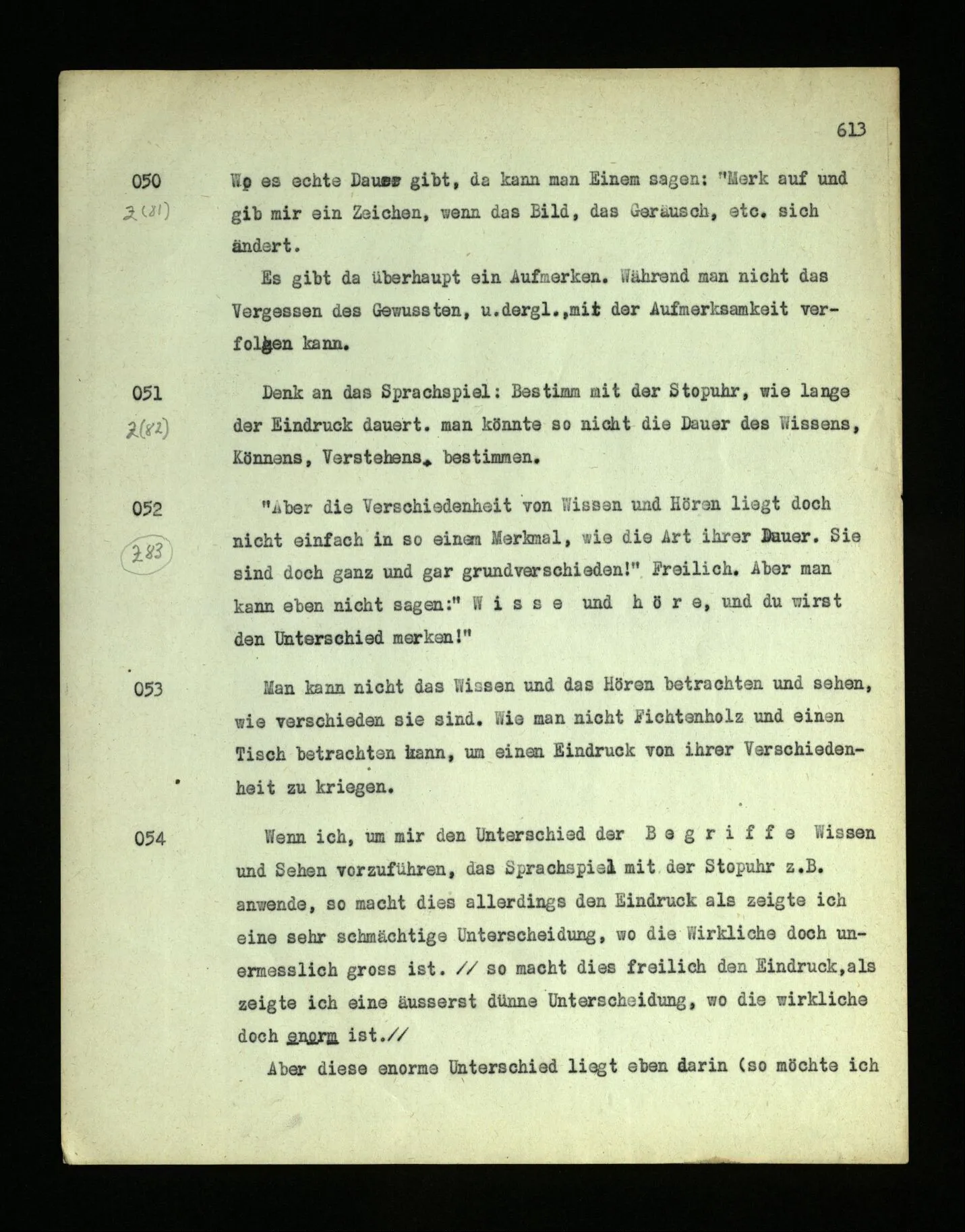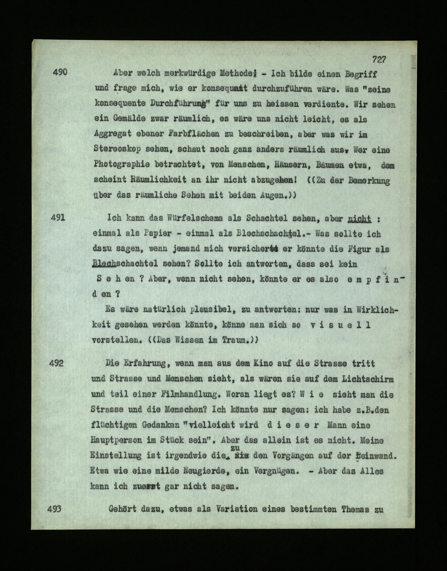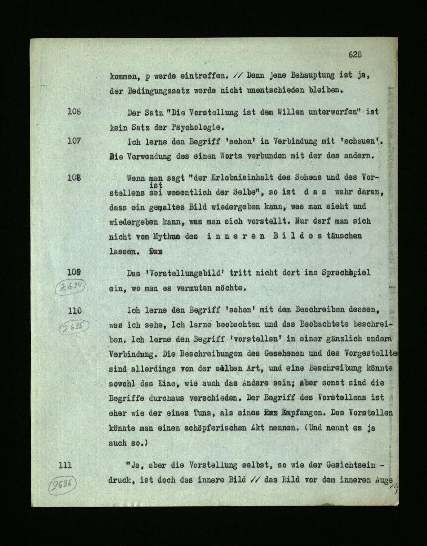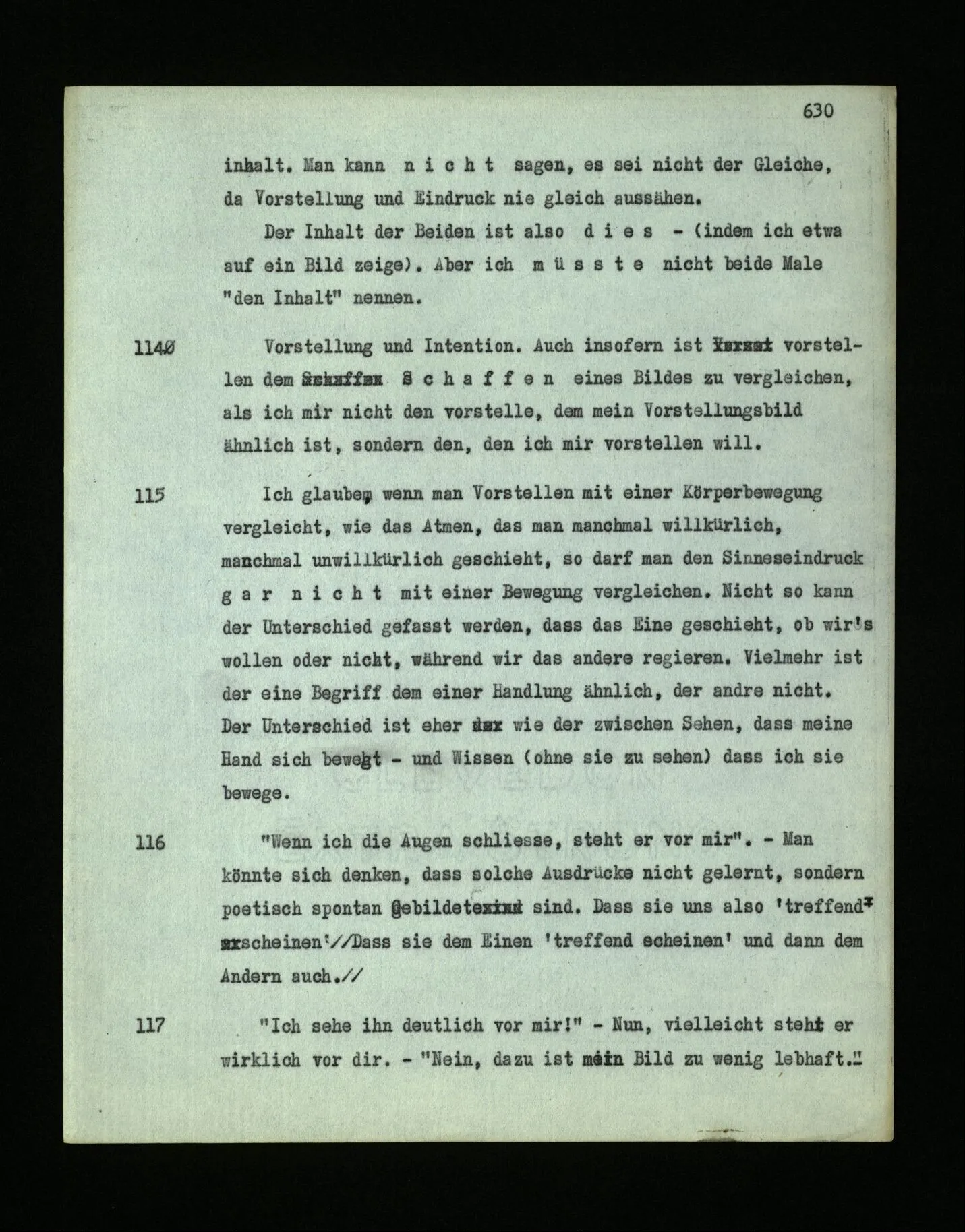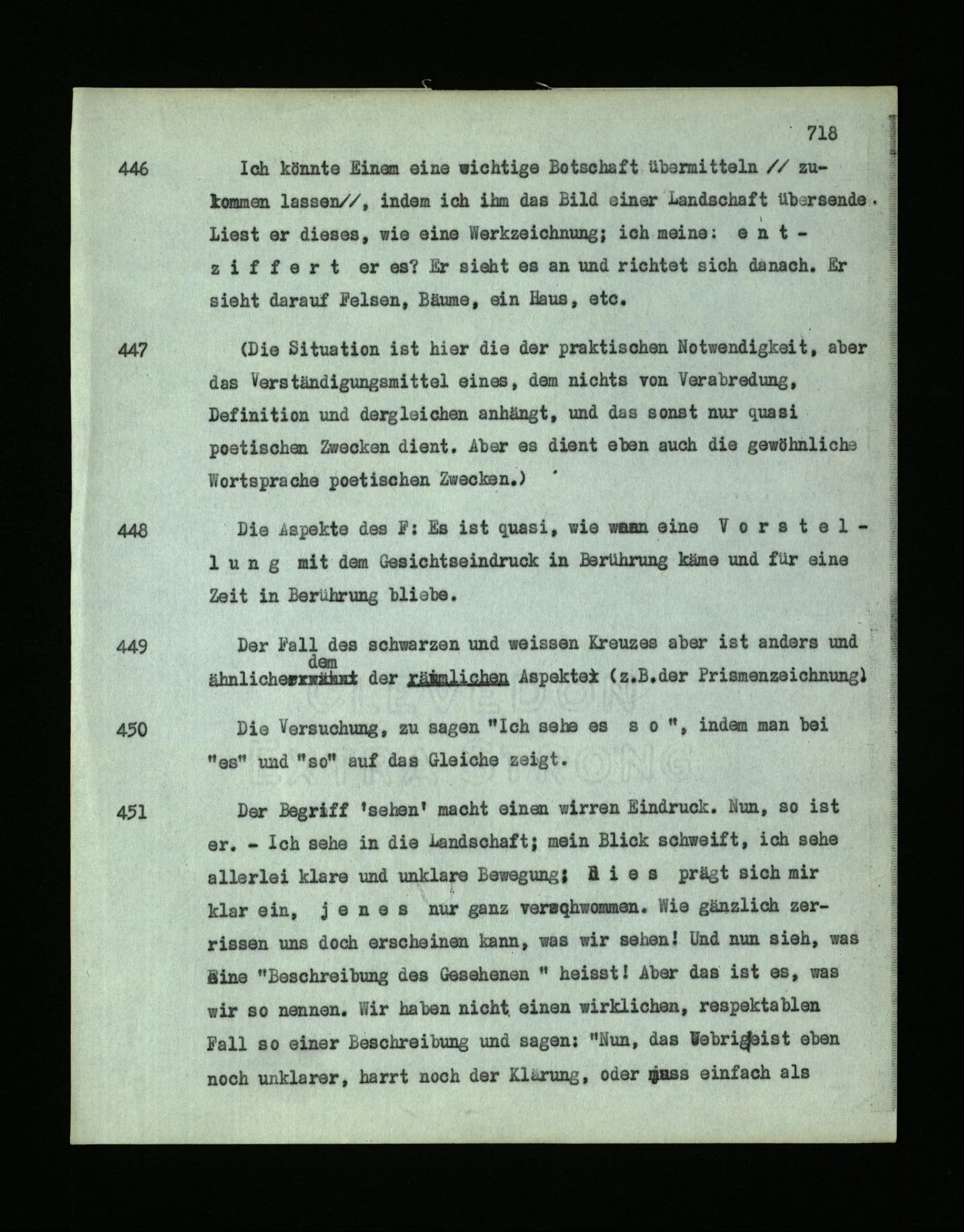 043 Das Wesentliche am Sehen ist, daß es ein Zustand ist und ein solcher in einen anderen umschlagen kann. Aber wie weiß ich, daß er in einem solchen Zustand ist? nicht also in einem der einer Disposition vergleichbar ist, wie das Wissen, das Verstehen oder eine Auffassung. Was ist das logische Charakteristikum so eines Zustands?