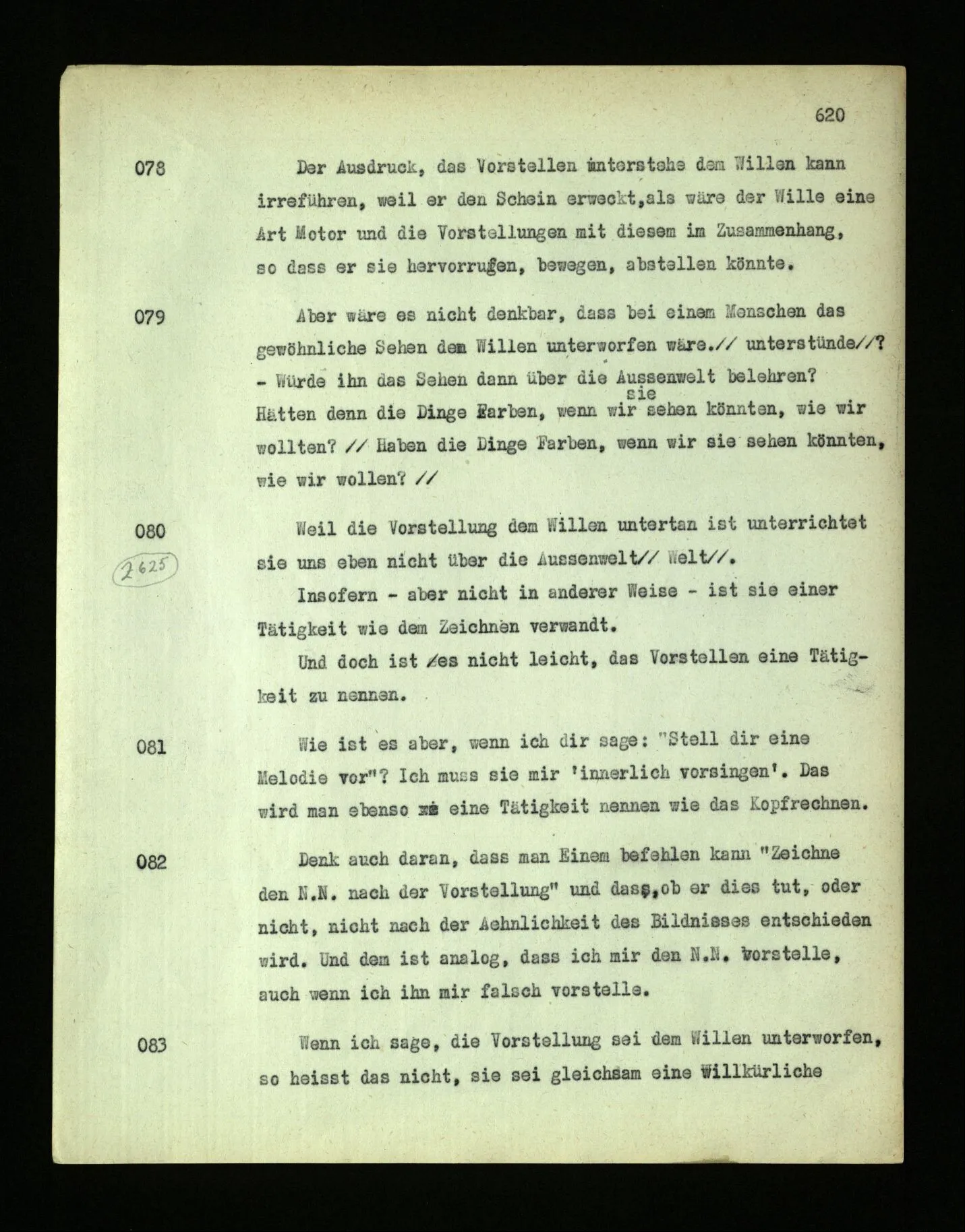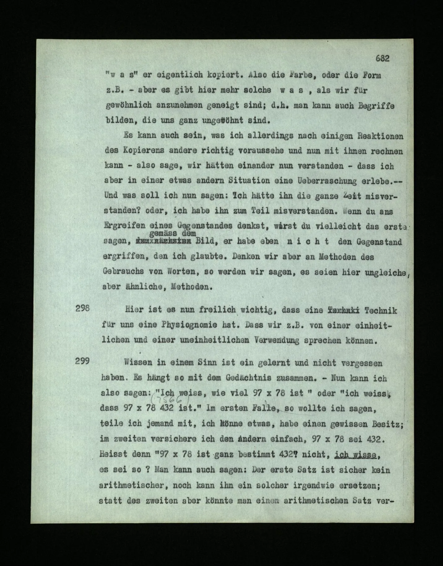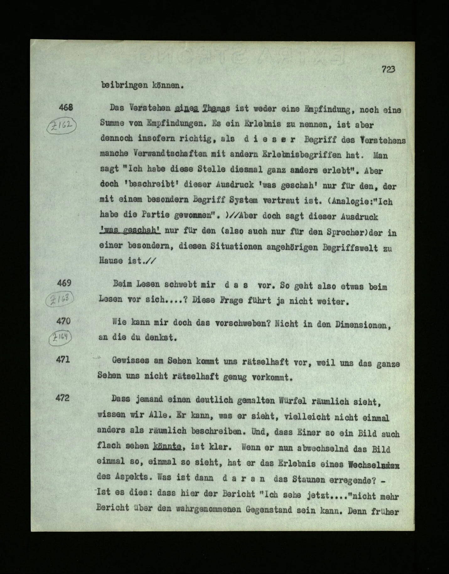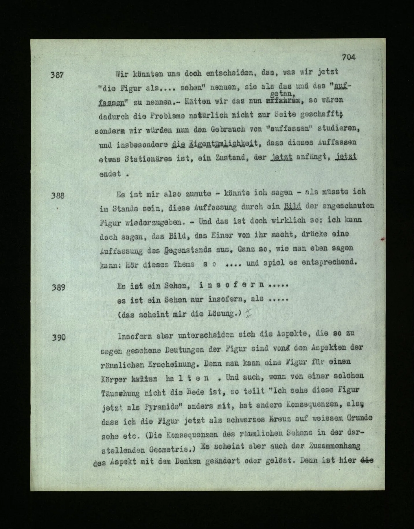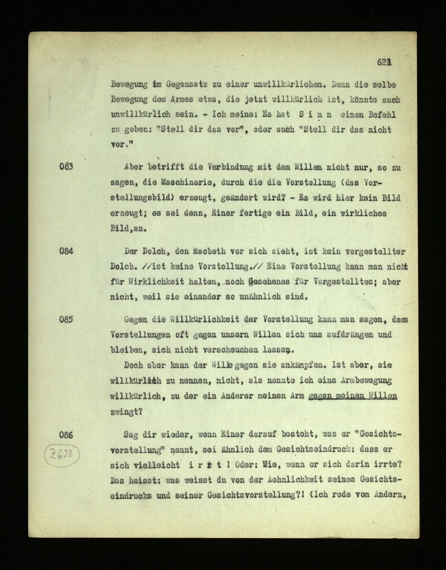 043 Das Wesentliche am Sehen ist, daß es ein Zustand ist und ein solcher in einen anderen umschlagen kann. Aber wie weiß ich, daß er in einem solchen Zustand ist? nicht also in einem der einer Disposition vergleichbar ist, wie das Wissen, das Verstehen oder eine Auffassung. Was ist das logische Charakteristikum so eines Zustands?