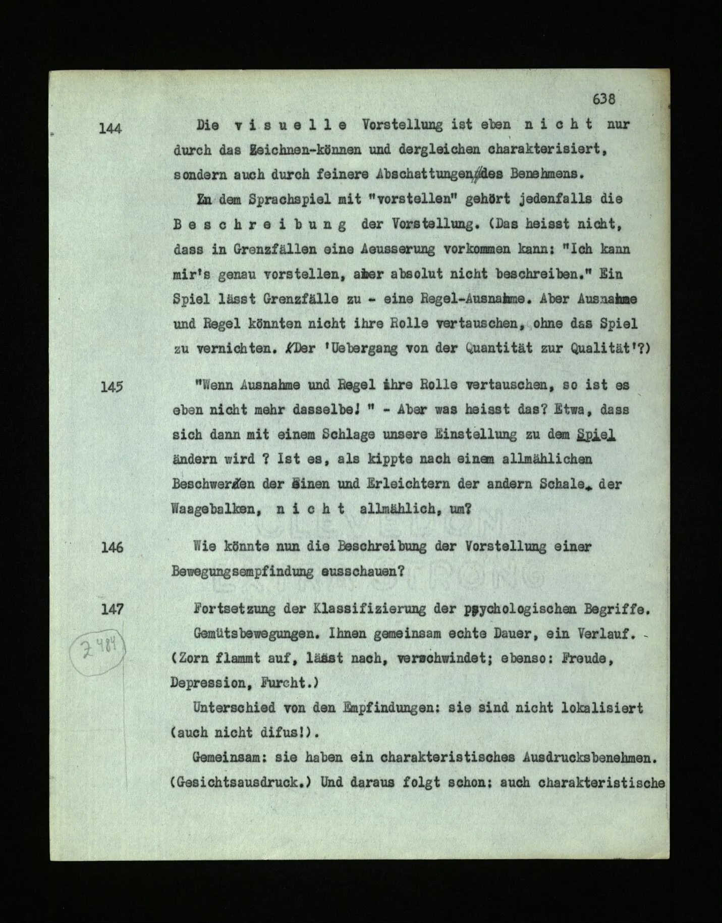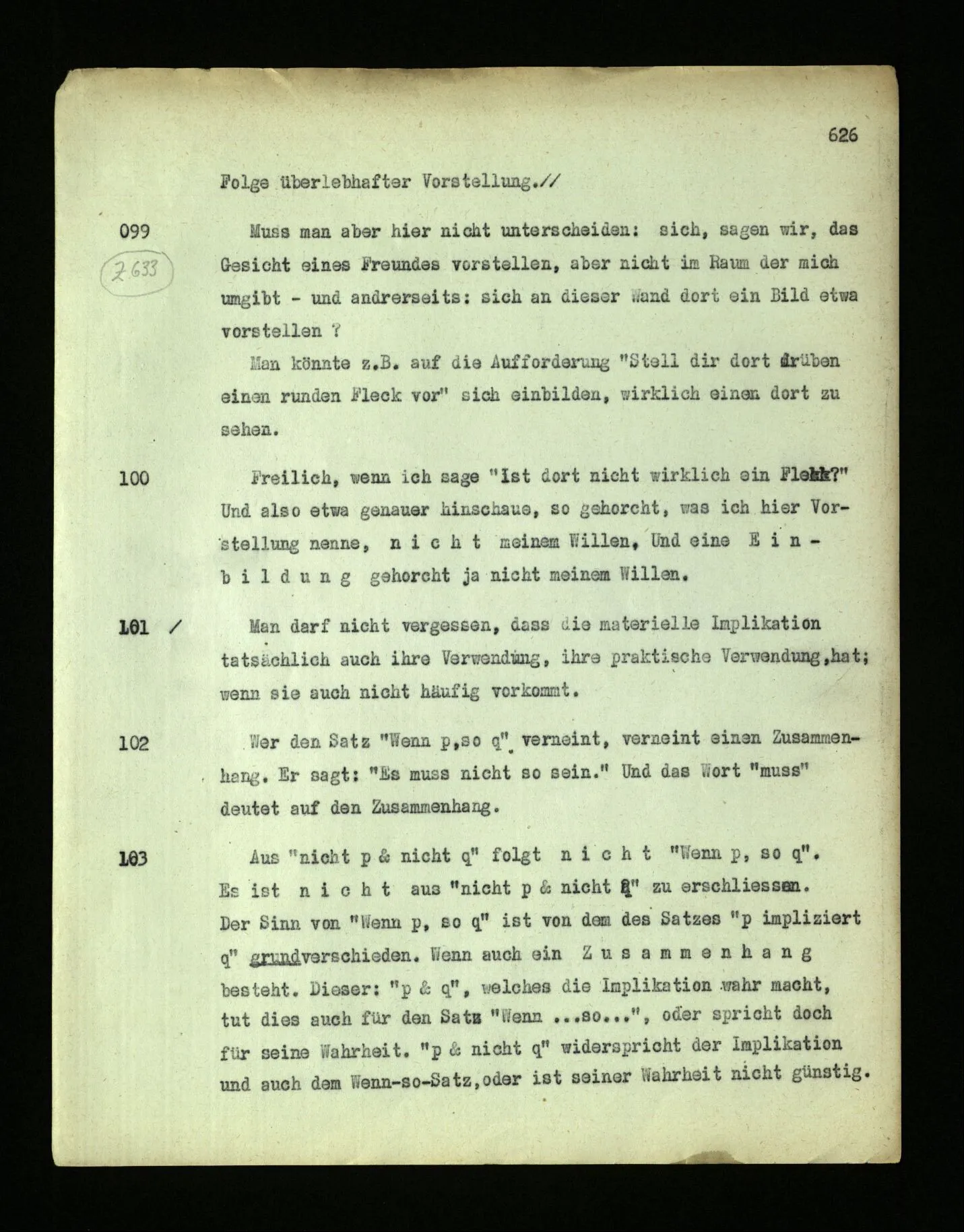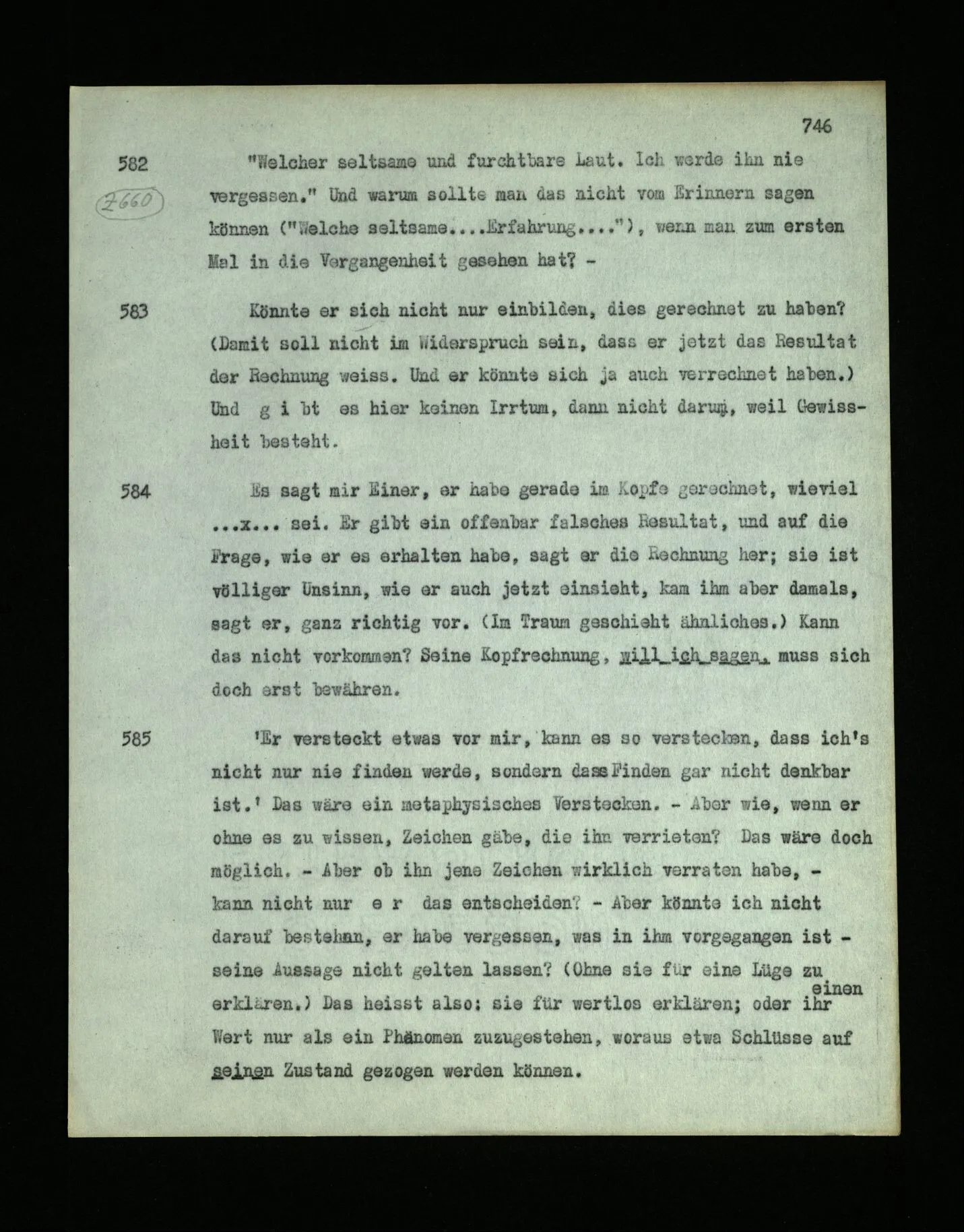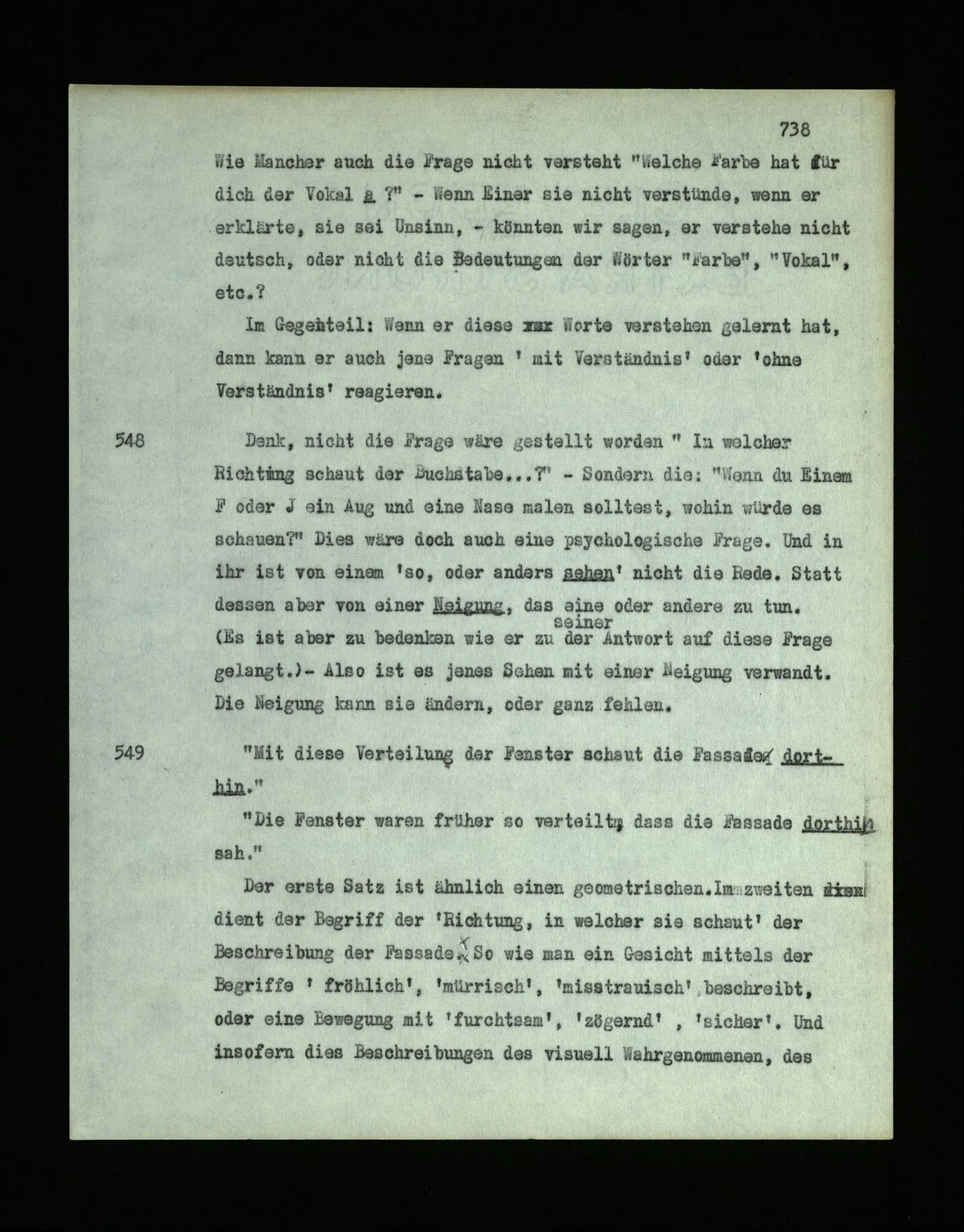 043 Das Wesentliche am Sehen ist, daß es ein Zustand ist und ein solcher in einen anderen umschlagen kann. Aber wie weiß ich, daß er in einem solchen Zustand ist? nicht also in einem der einer Disposition vergleichbar ist, wie das Wissen, das Verstehen oder eine Auffassung. Was ist das logische Charakteristikum so eines Zustands?
