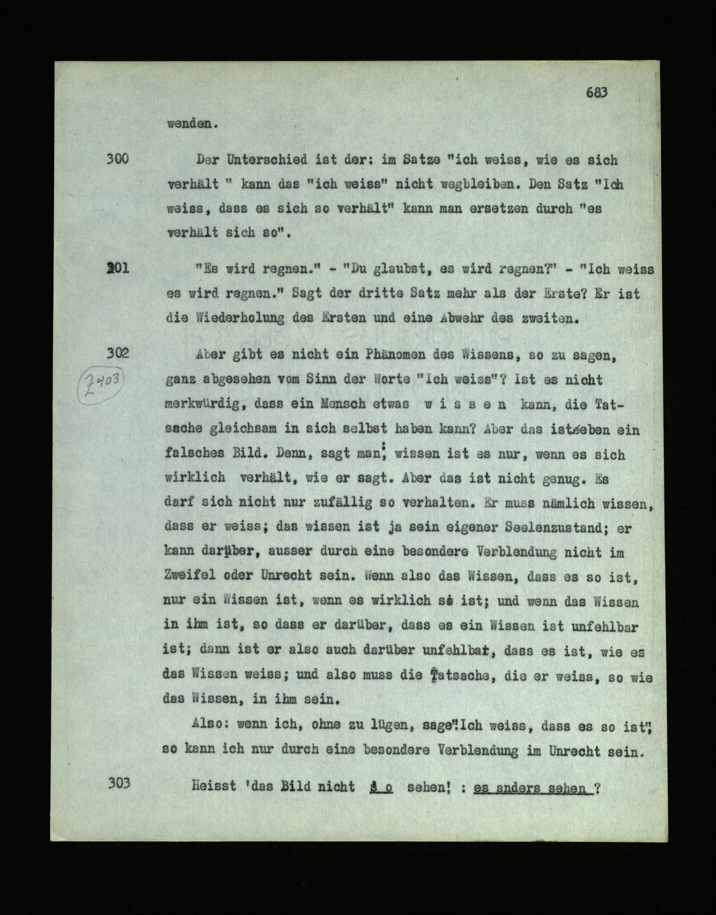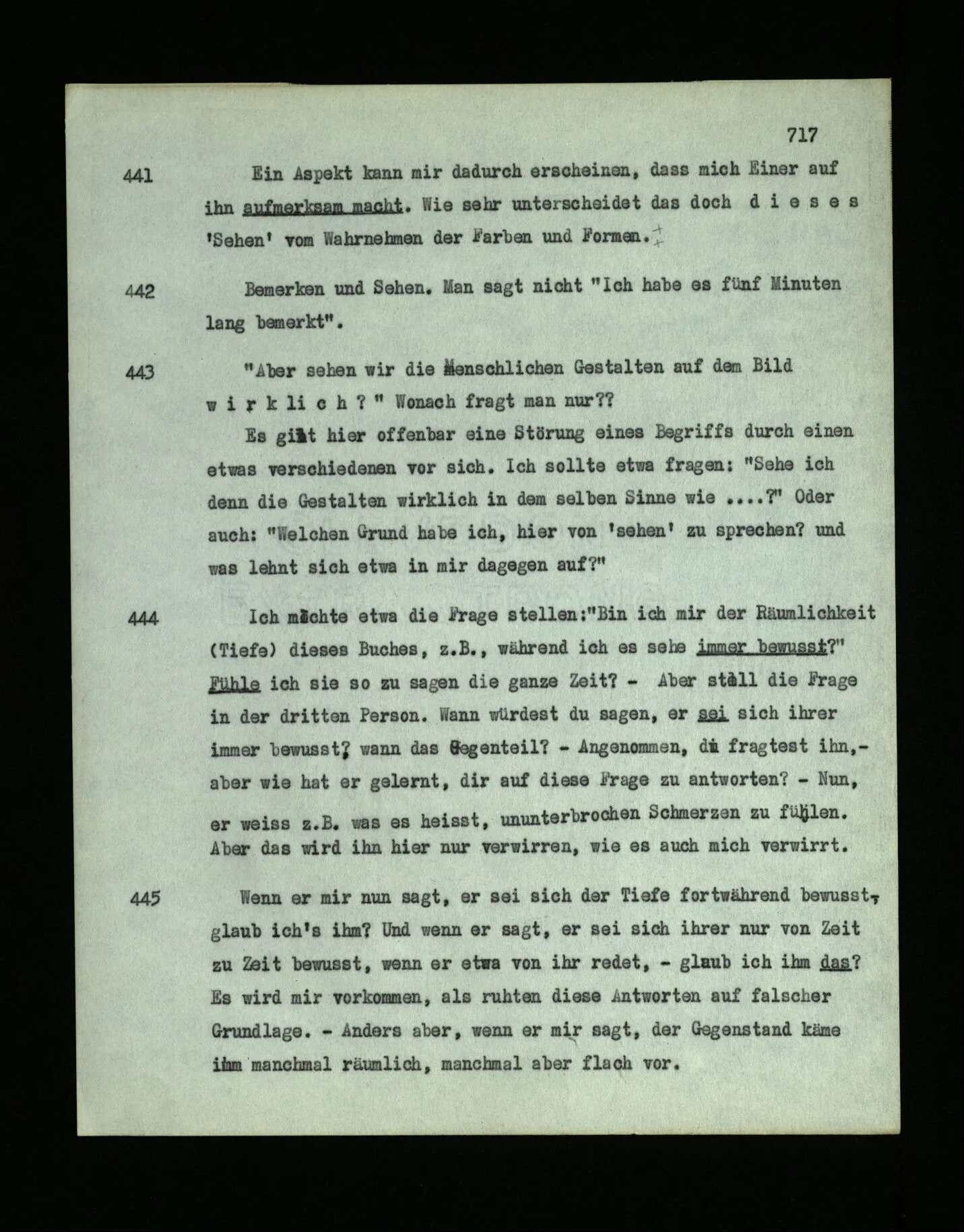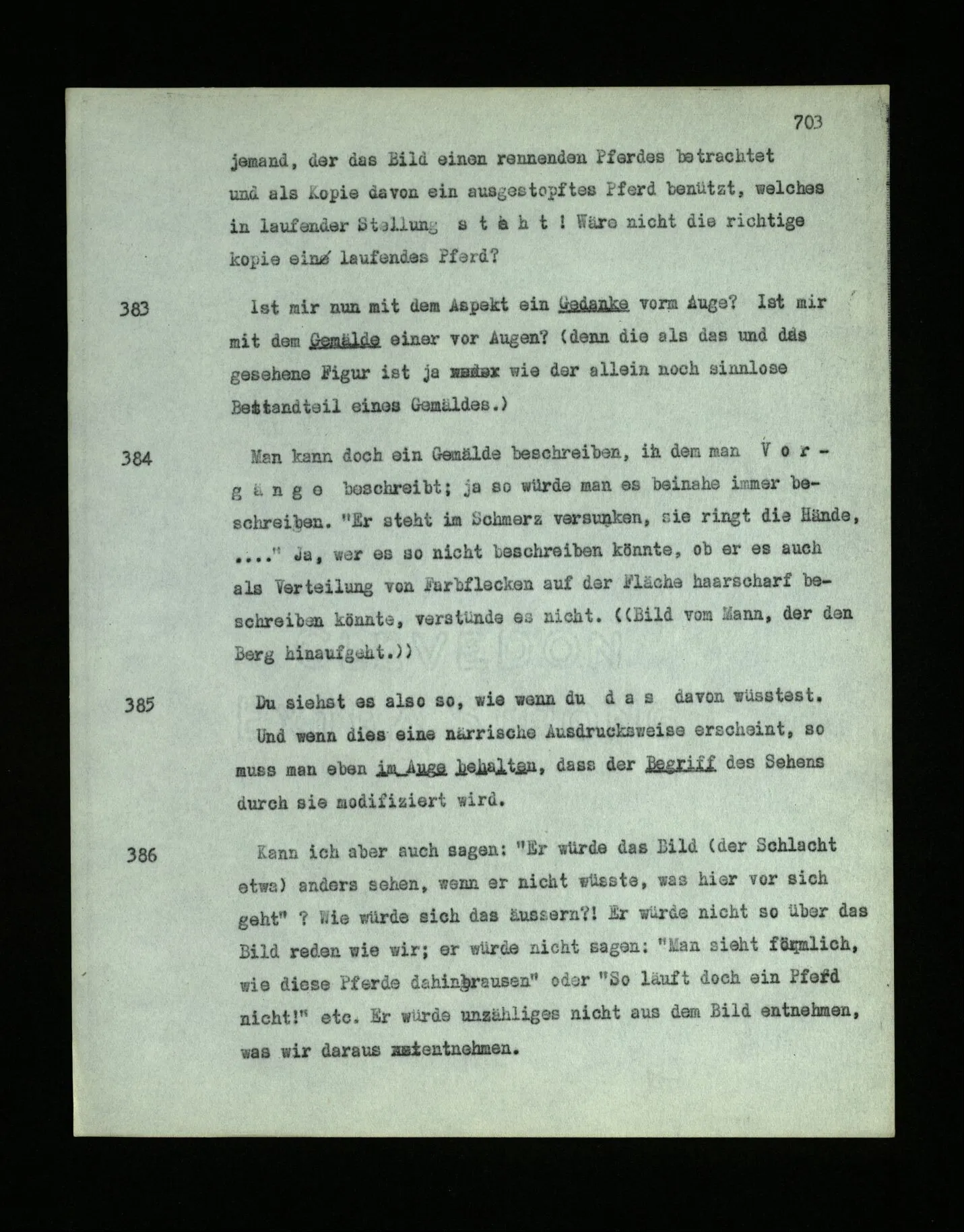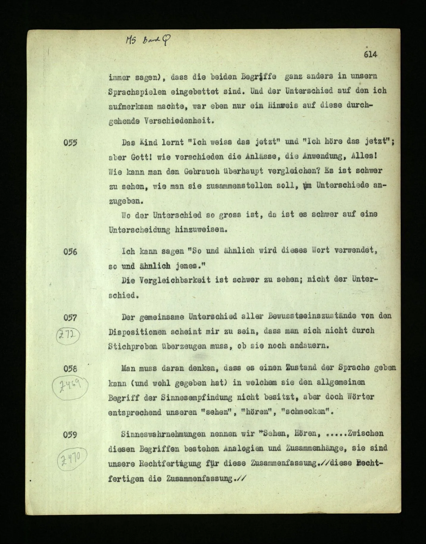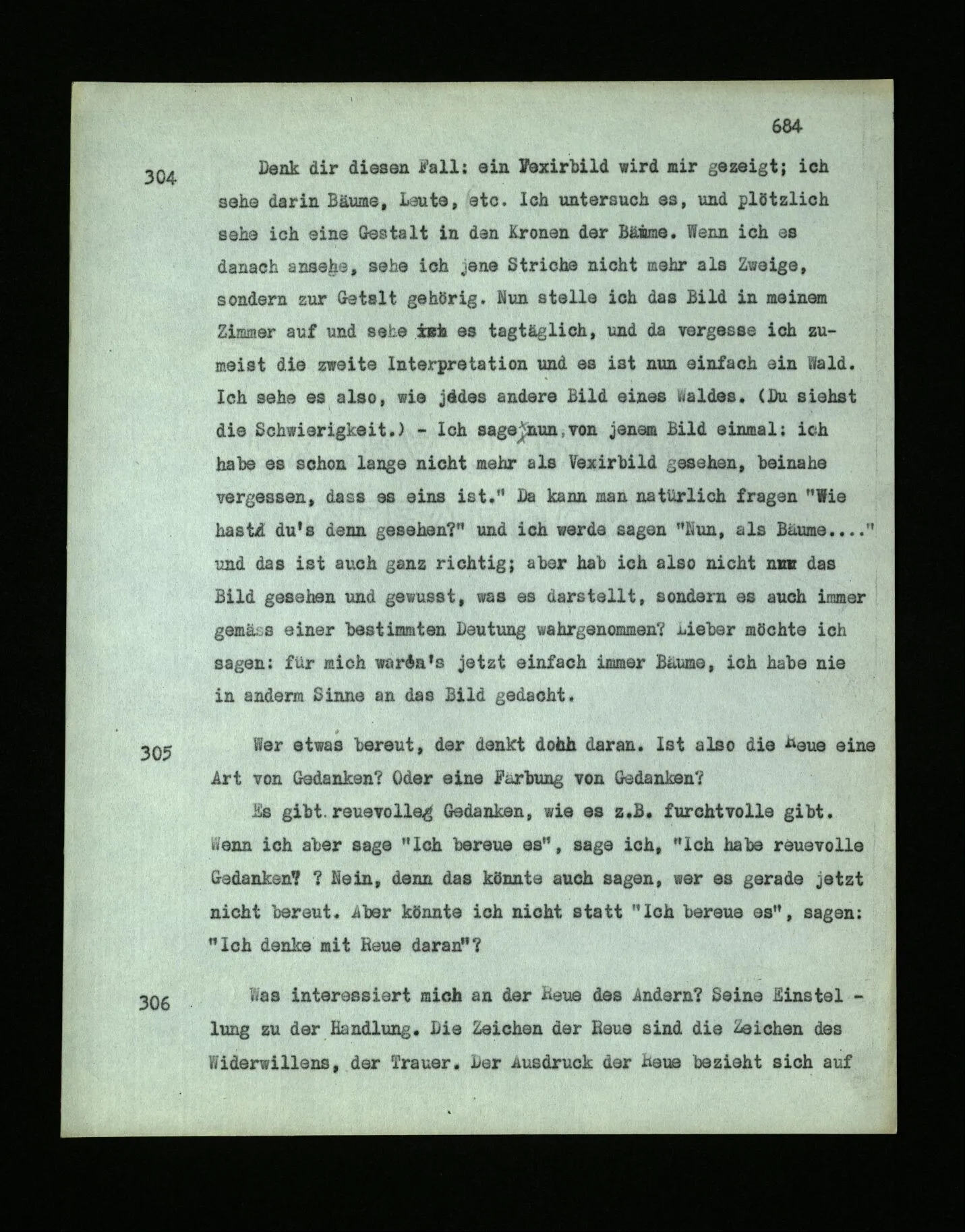 043 Das Wesentliche am Sehen ist, daß es ein Zustand ist und ein solcher in einen anderen umschlagen kann. Aber wie weiß ich, daß er in einem solchen Zustand ist? nicht also in einem der einer Disposition vergleichbar ist, wie das Wissen, das Verstehen oder eine Auffassung. Was ist das logische Charakteristikum so eines Zustands?
