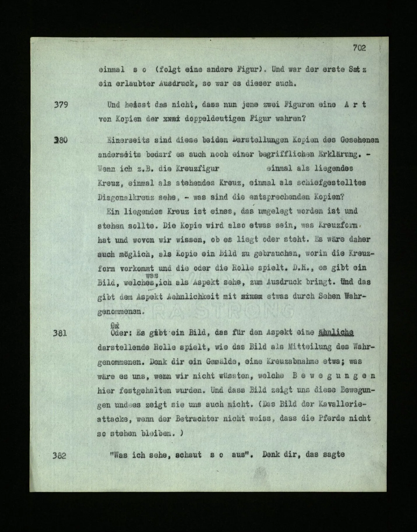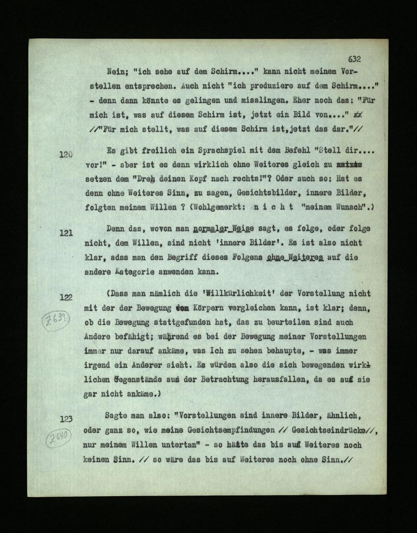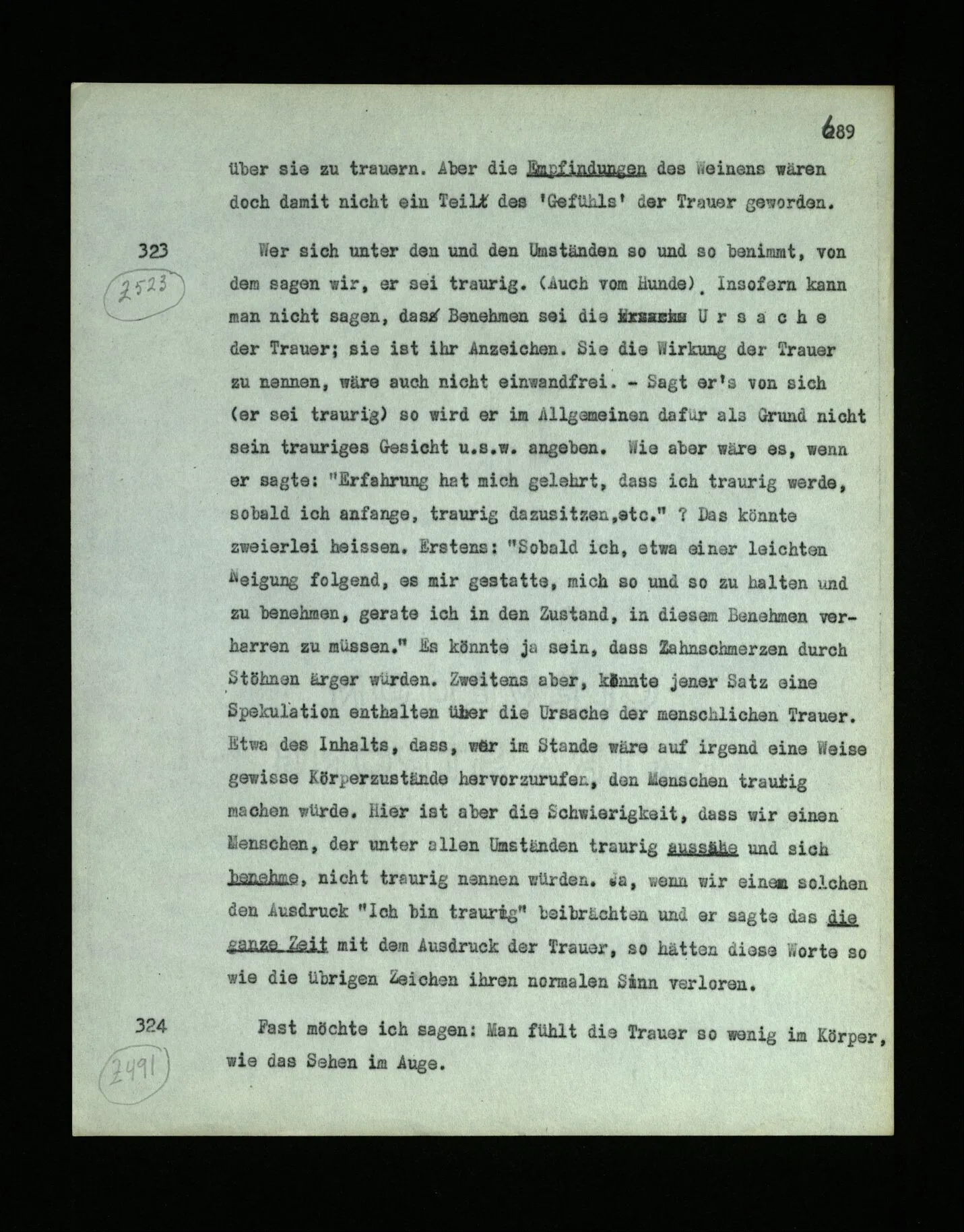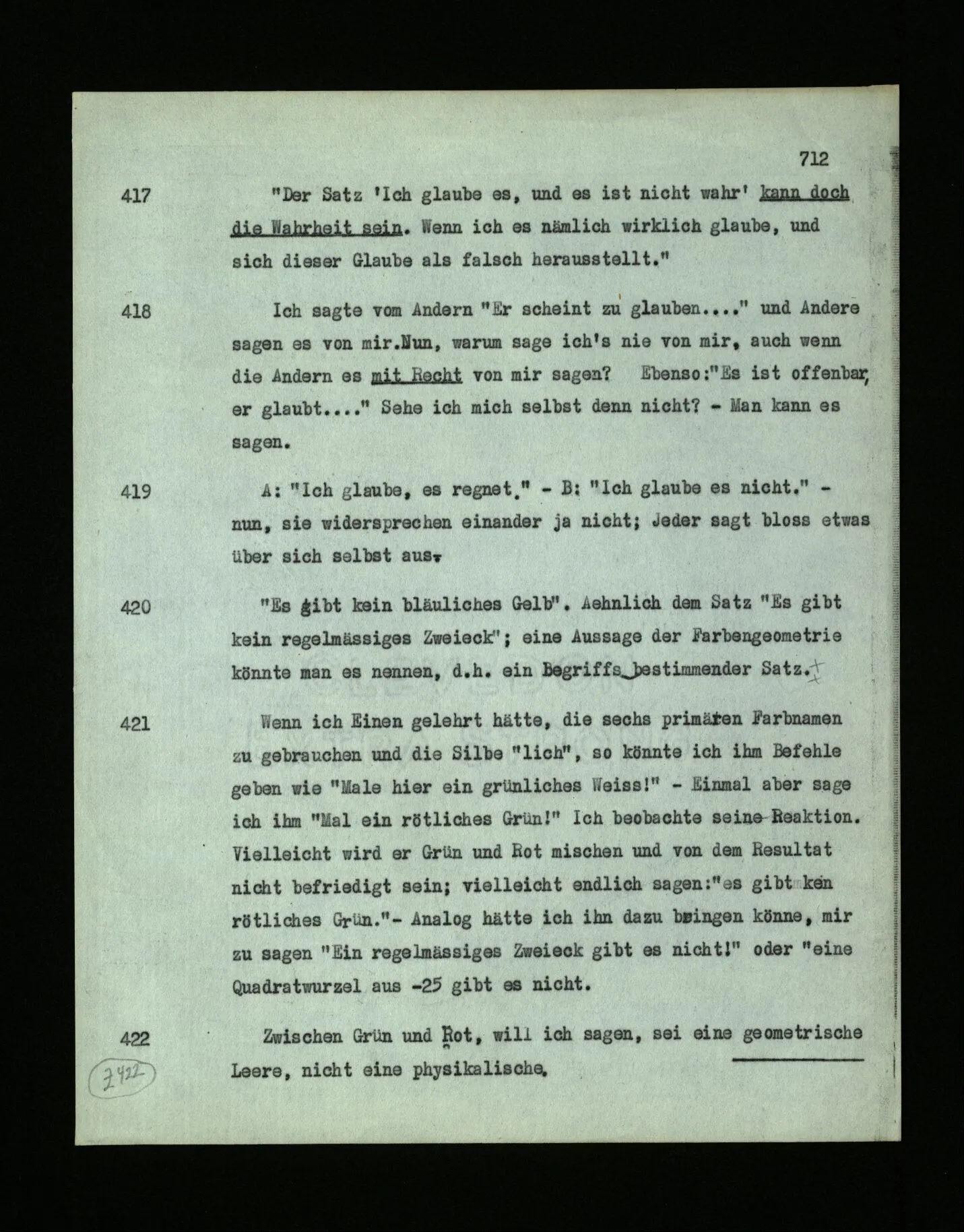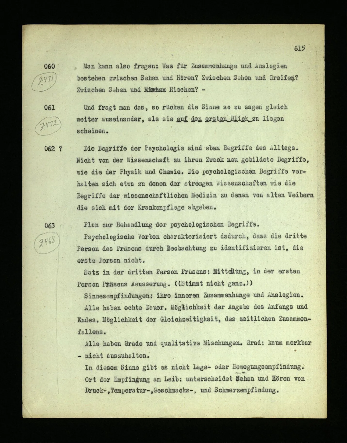 043 Das Wesentliche am Sehen ist, daß es ein Zustand ist und ein solcher in einen anderen umschlagen kann. Aber wie weiß ich, daß er in einem solchen Zustand ist? nicht also in einem der einer Disposition vergleichbar ist, wie das Wissen, das Verstehen oder eine Auffassung. Was ist das logische Charakteristikum so eines Zustands?