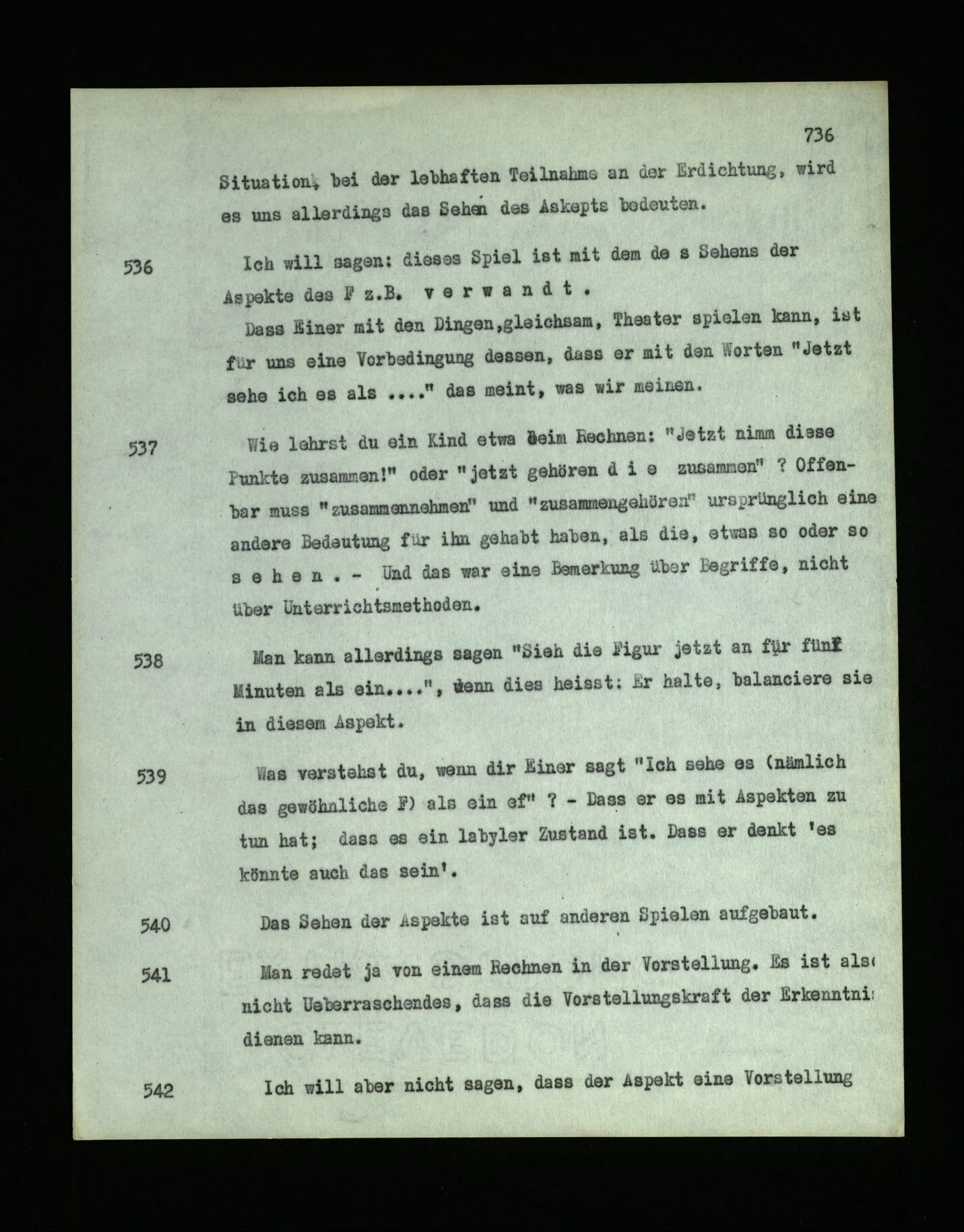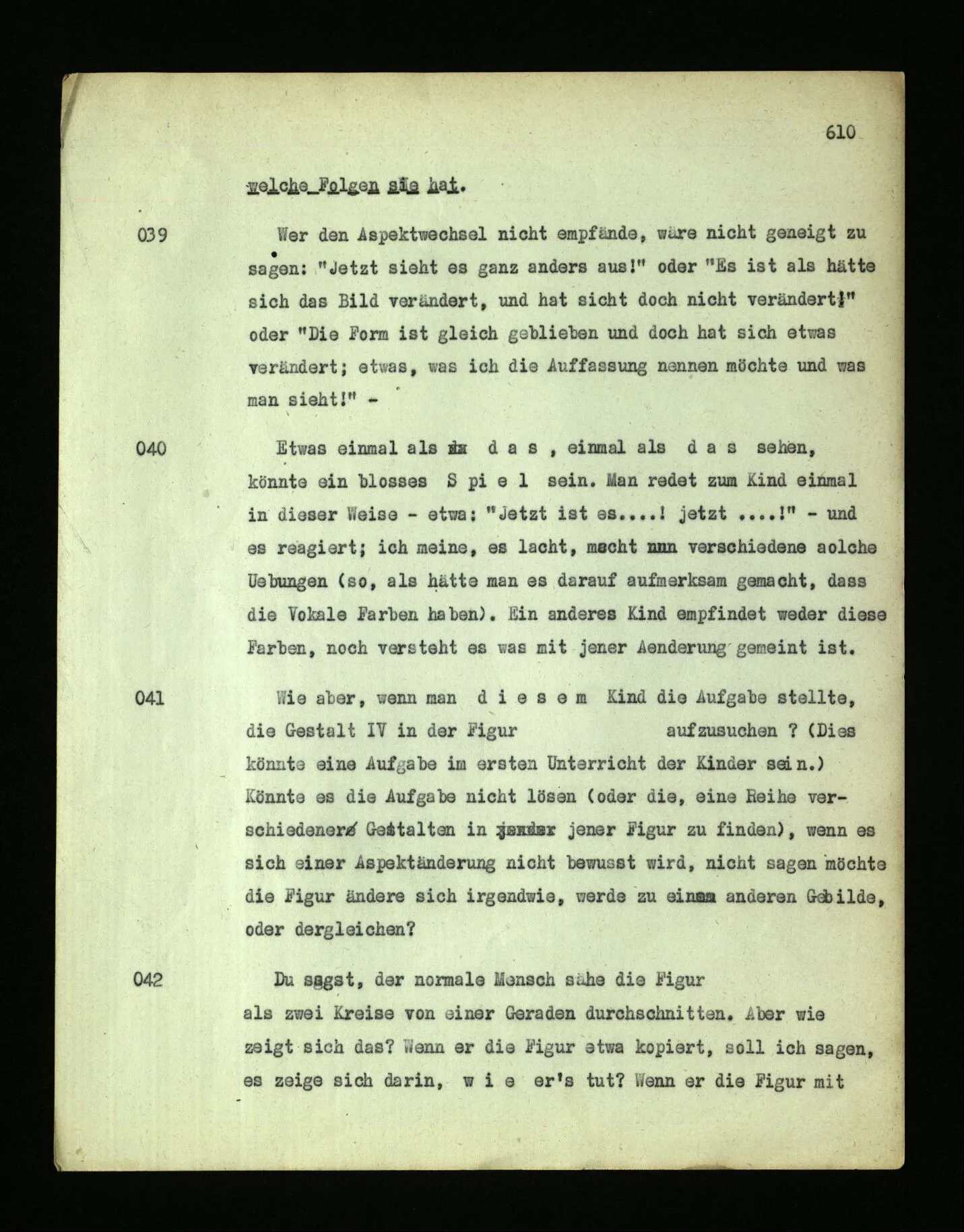 040 Etwas einmal als das, einmal als das sehen, könnte ein bloßes Spiel sein. Man redet zum Kind einmal in dieser Weise – etwa: “Jetzt ist es …! jetzt …!” – und es reagiert; ich meine, es lacht, macht nun verschiedene solche Übungen (so, als hätte man es darauf aufmerksam gemacht, daß die Vokale Farben haben). Ein anderes Kind empfindet weder diese Farben, noch versteht es was mit jener Änderung gemeint ist.