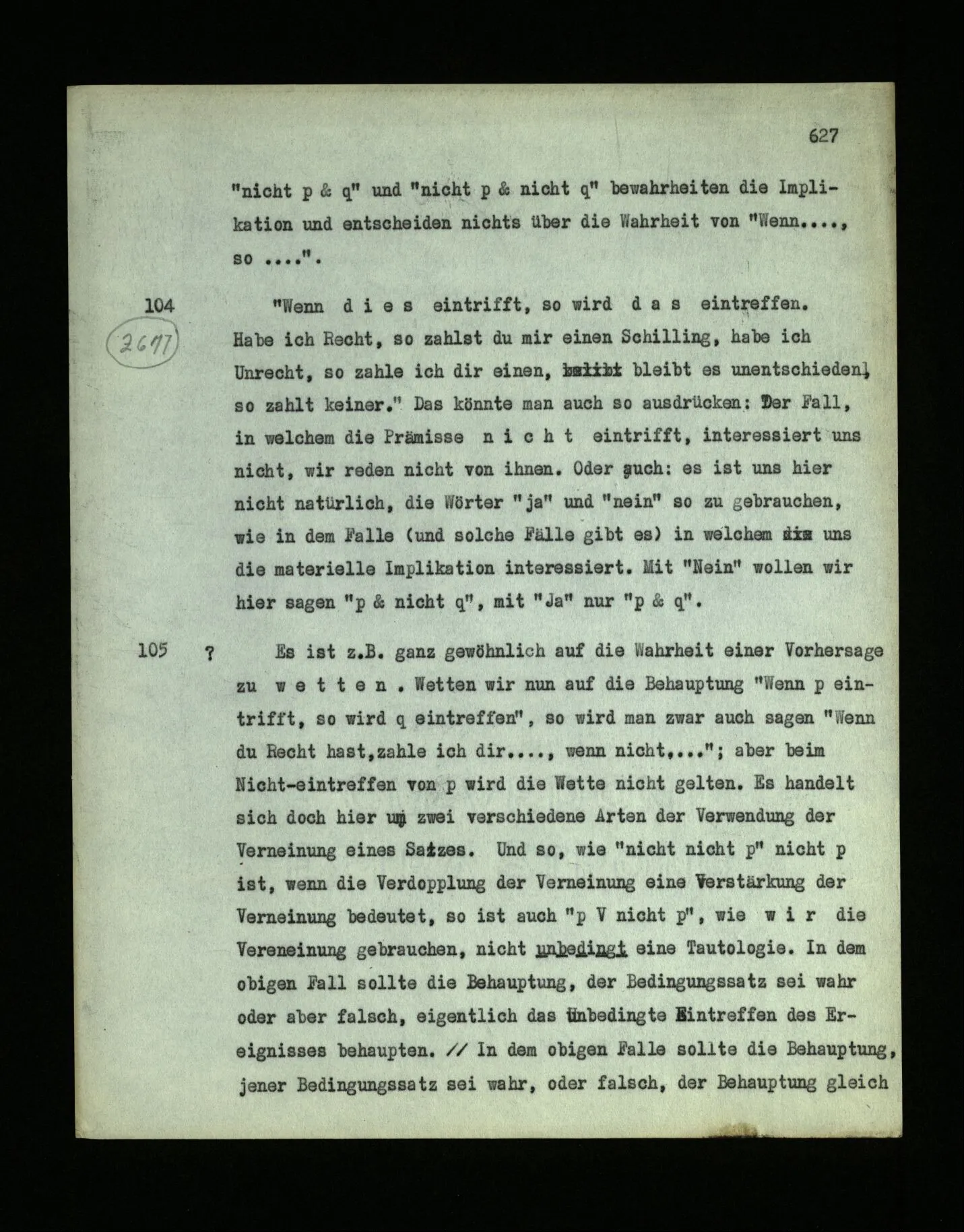731 Den Satz “Wenn p eintrifft, so trifft q ein”. Will ich “S” nennen. – “S oder nicht –S” ist eine Tautologie: aber ist es auch der Satz vom ausgeschlossenen Dritten? – Oder auch so: Wenn ich sagen will, daß die Vorhersage “S”” richtig, falsch, oder unentschieden sein kann, wird das durch den Satz ausgedrückt “nicht (S oder nicht – S)”?