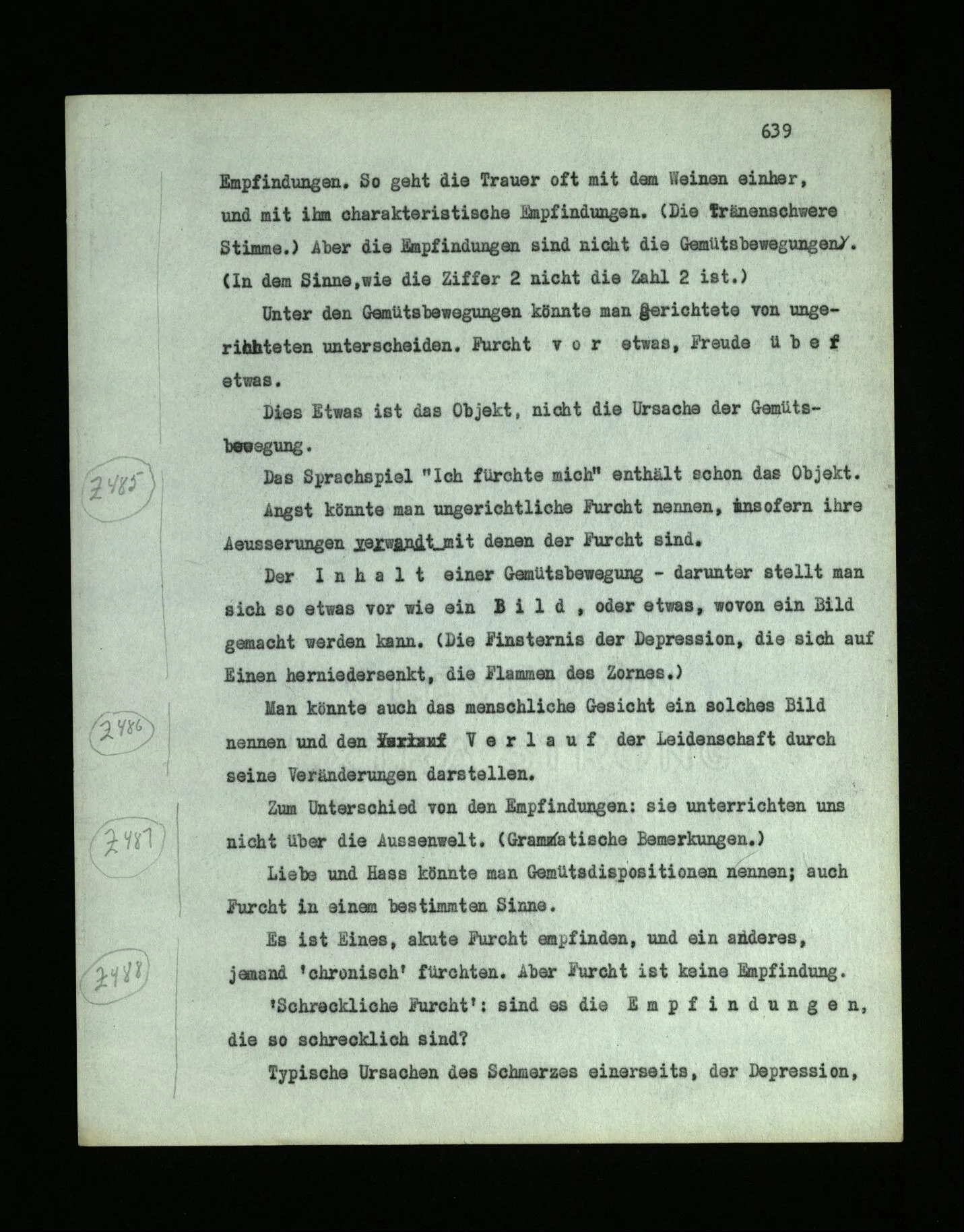 027 Die Frage ist: Was für Sprachspiele kann, der die Furcht nicht kennt, eo ipso, nicht spielen? Man könnte da z.B. sagen: er würde einer Tragödie ohne Verständnis zuschauen. Und man könnte das so erklären: Wenn ich den Andern in einer furchtbaren Lage sehe, auch wenn ich selbst gar nichts zu fürchten habe, so kann ich schaudern, aus Mitgefühl schaudern. Wer aber die Furcht nicht kennte, täte das nicht. Wir fürchten uns mit ihm, auch wenn wir nichts zu fürchten haben; und das ist es, was jener nicht kann. Wie ich mein Gesicht schmerzlich verziehe, wenn man dem Andern Schmerz zufügt.