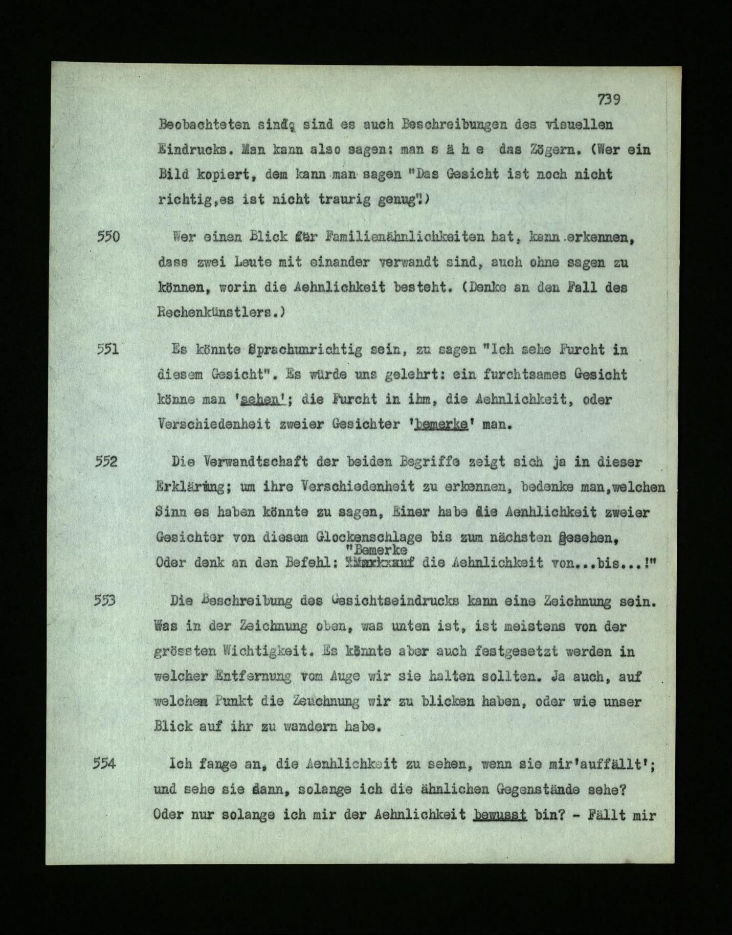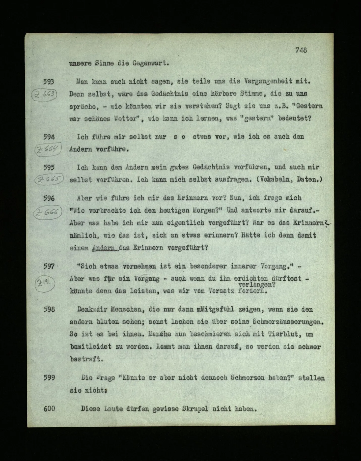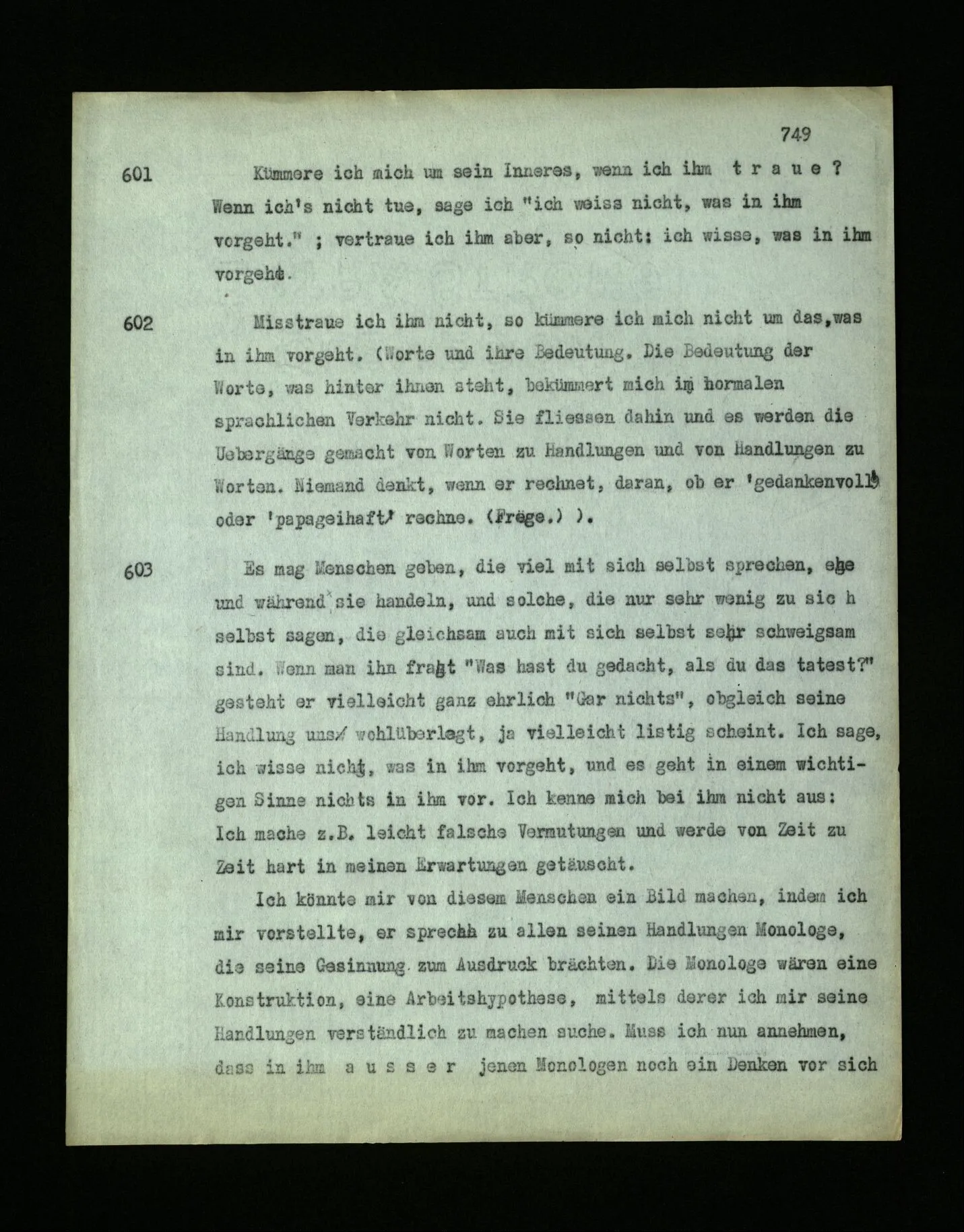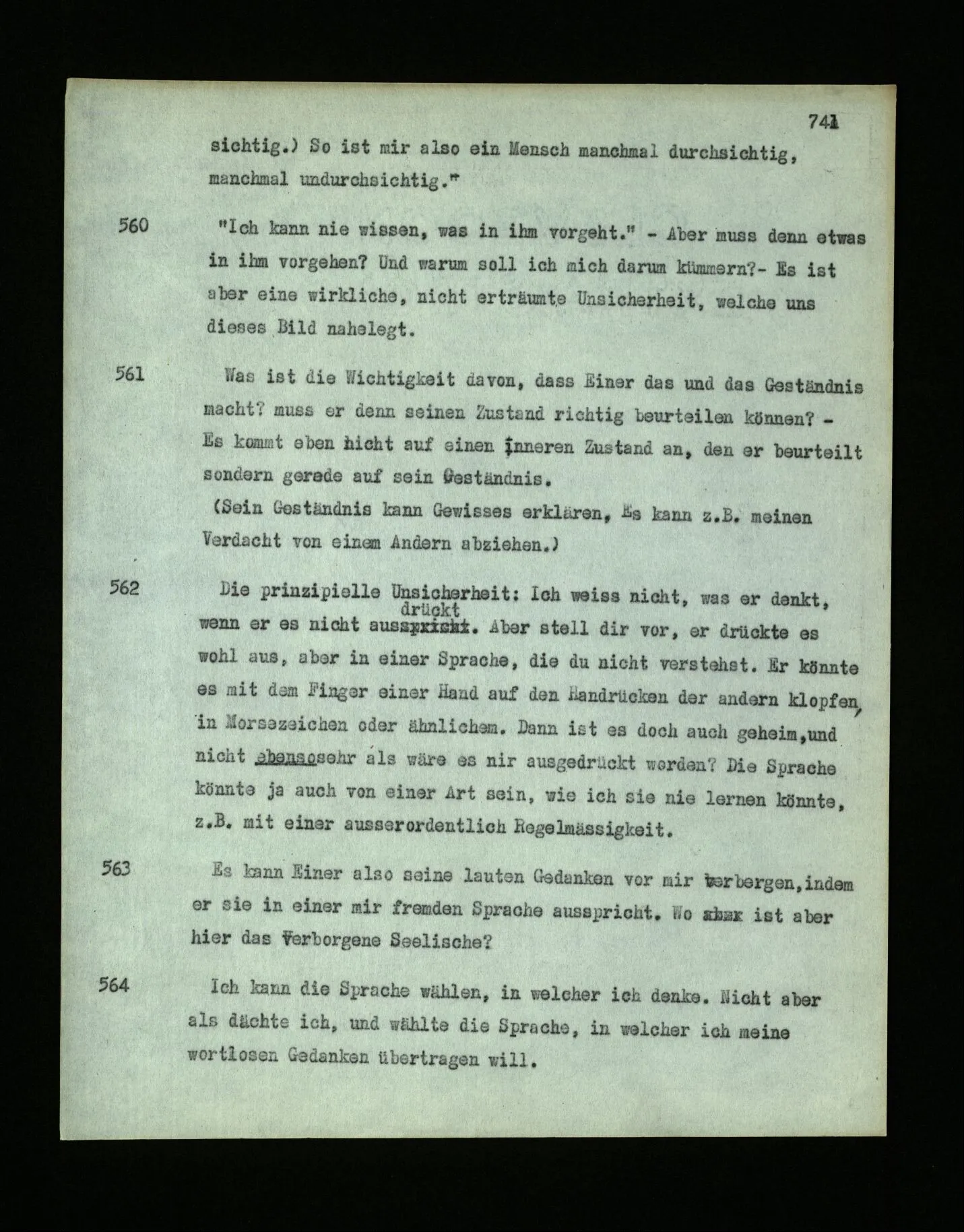 713 Es ist für unsere Betrachtung wichtig, daß es Menschen gibt von denen jemand fühlt, er werde nie wissen, was in ihnen vorgeht. Er werde sie nie verstehen.