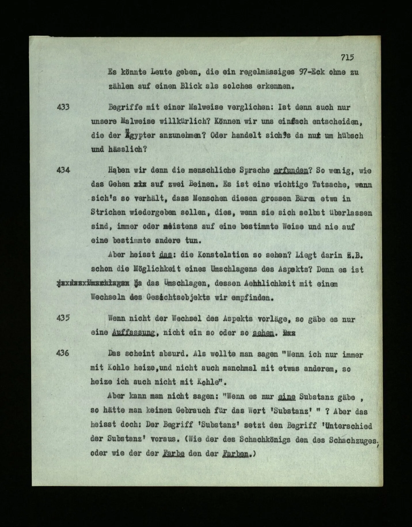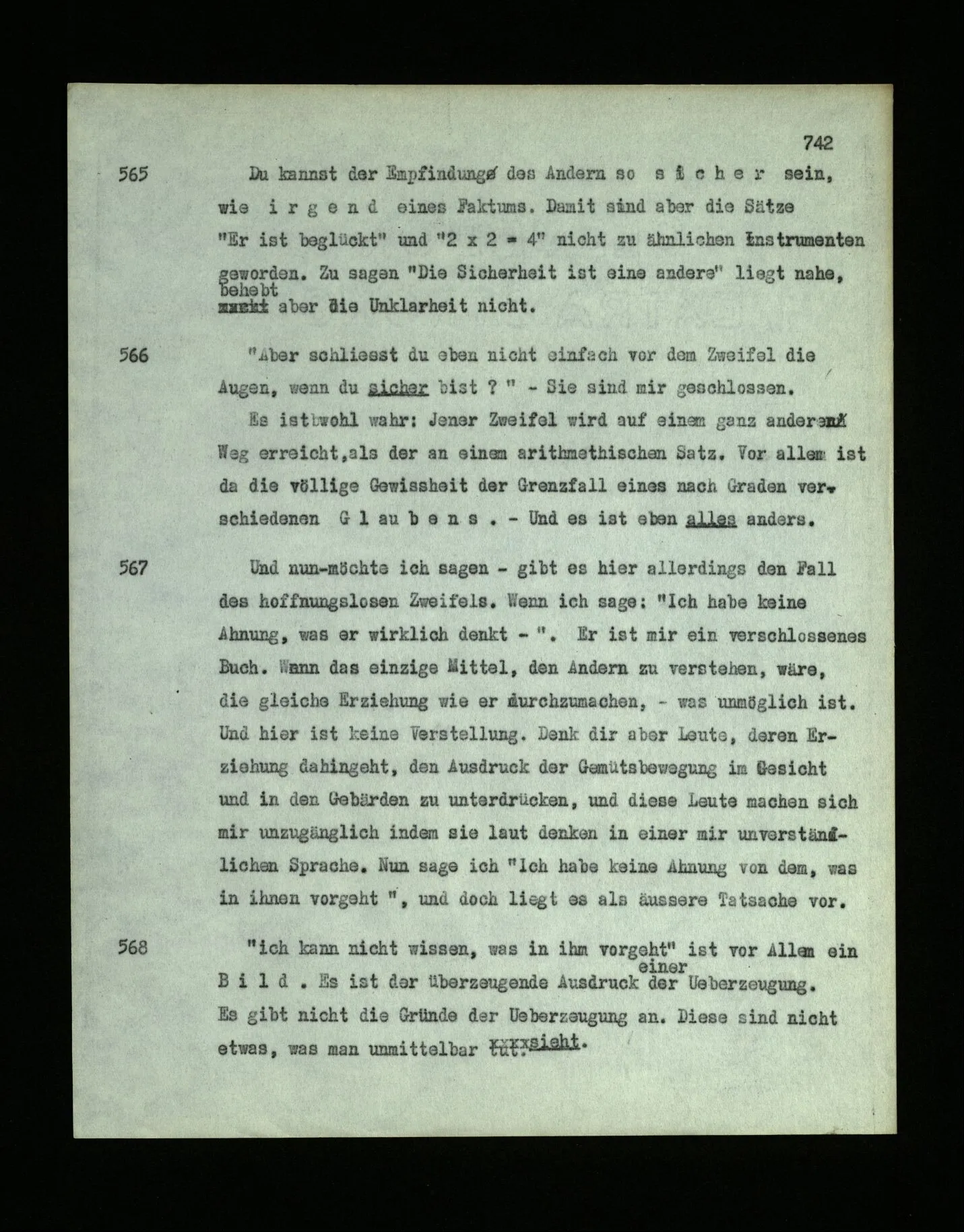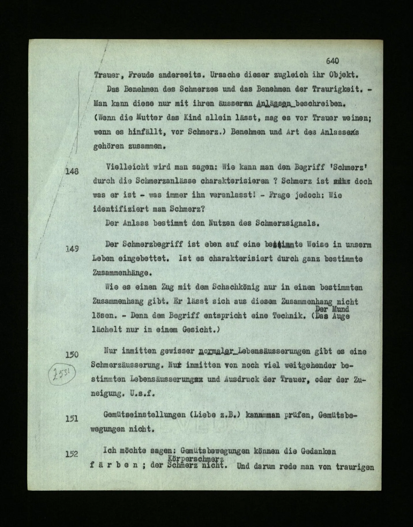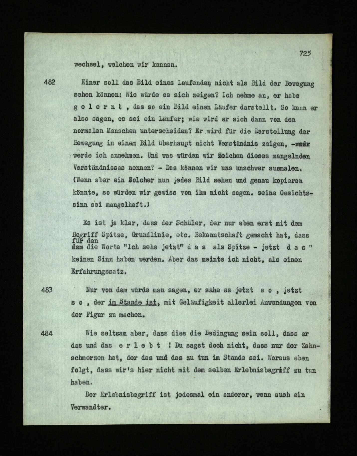 713 Es ist für unsere Betrachtung wichtig, daß es Menschen gibt von denen jemand fühlt, er werde nie wissen, was in ihnen vorgeht. Er werde sie nie verstehen.