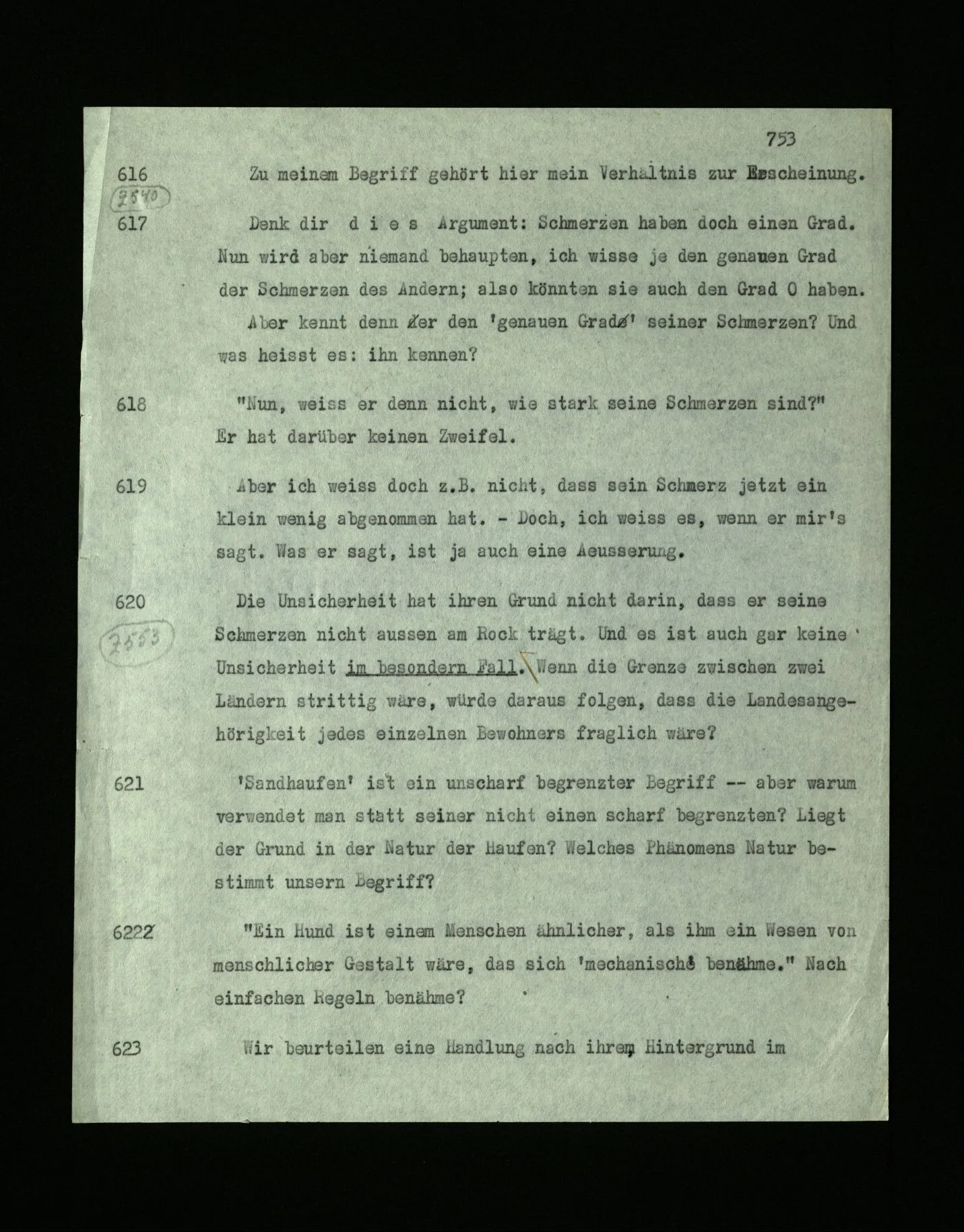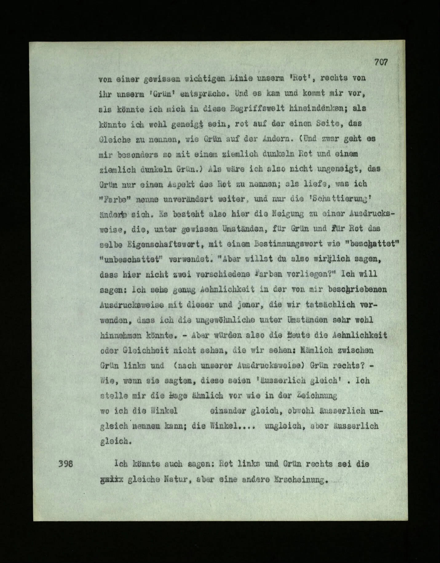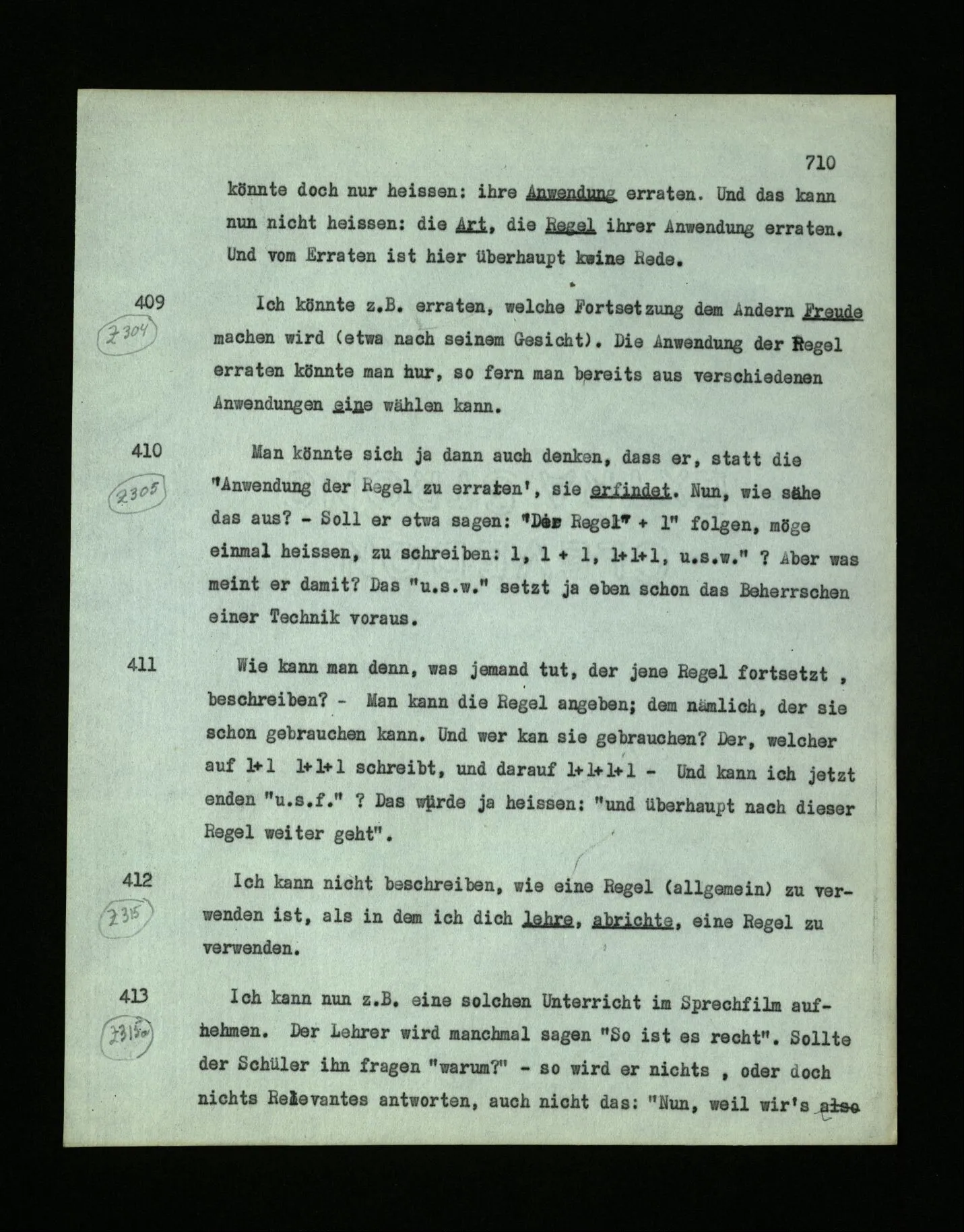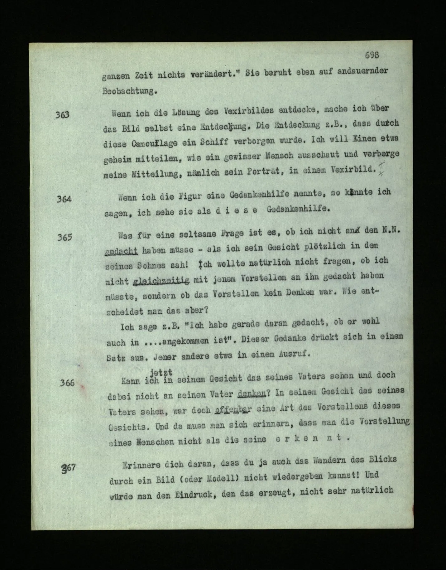 713 Es ist für unsere Betrachtung wichtig, daß es Menschen gibt von denen jemand fühlt, er werde nie wissen, was in ihnen vorgeht. Er werde sie nie verstehen.